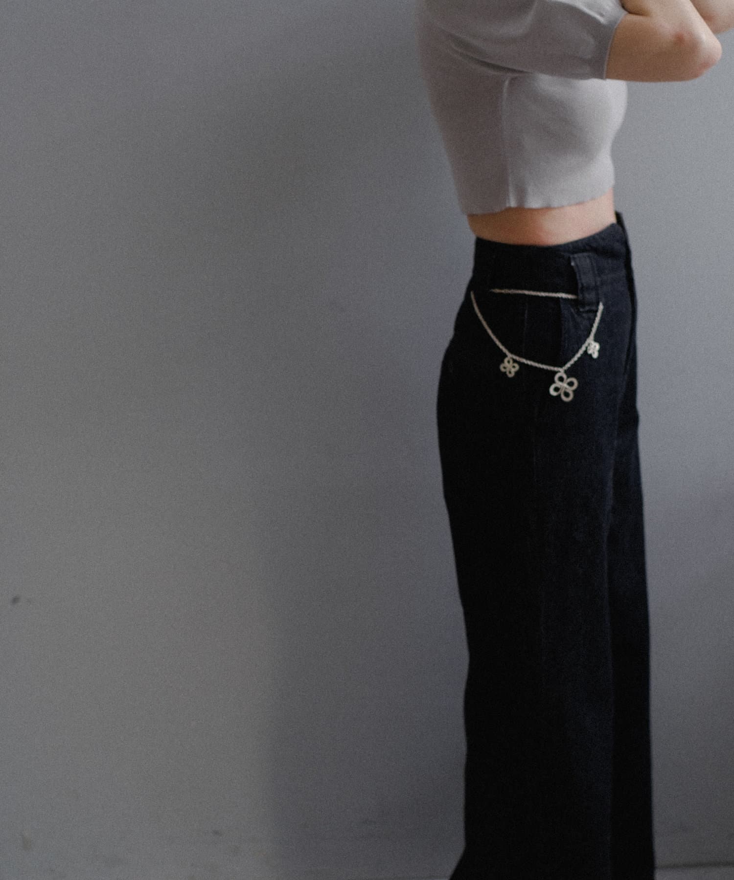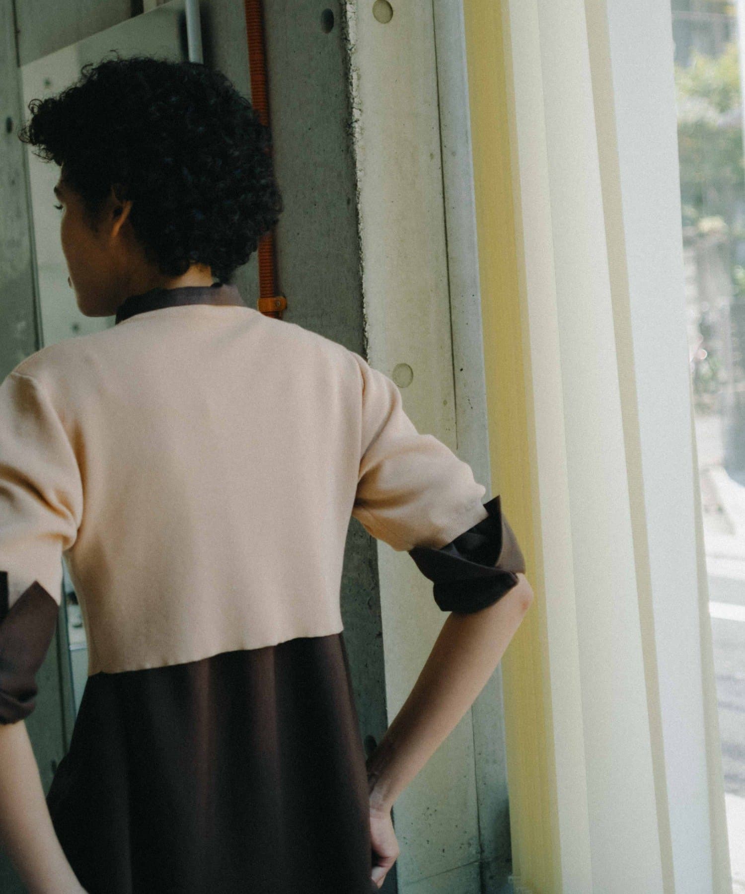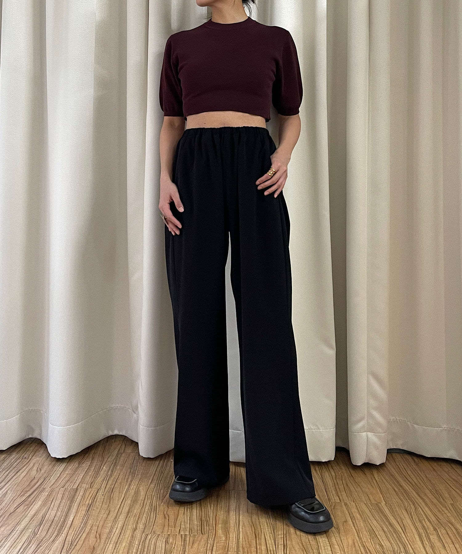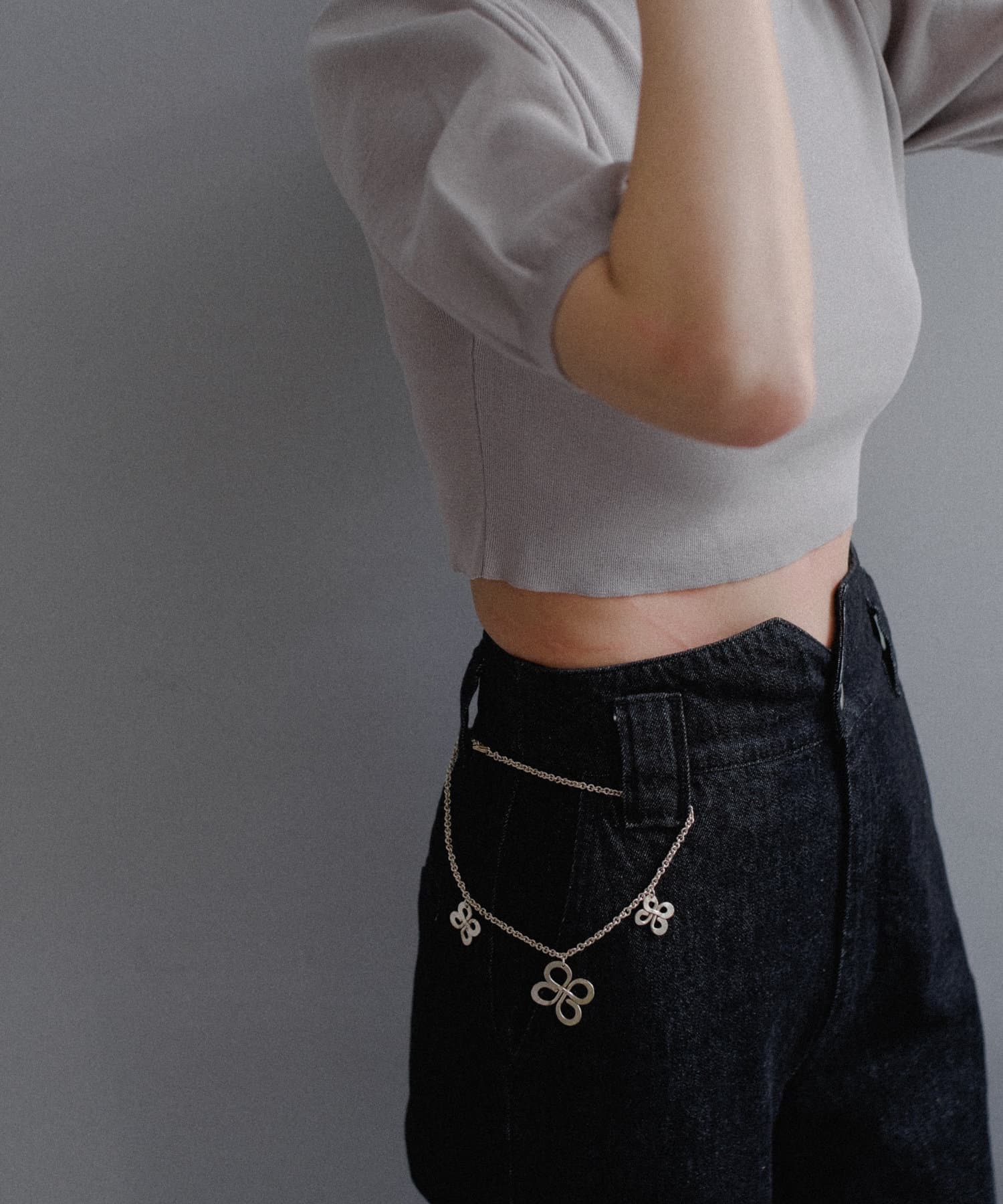 着丈はかなり短めな37cm設定。ハイウエストデニムや股上がしっかりと深めのボトムスとあわせて、ウエスト上部をちらりと見せて使うのがカッコいい。個人的には、シアーインナーやシャツを中に重ねて着て、ビスチェのような役割でレイヤードスタイルを楽しむのもお勧めです。