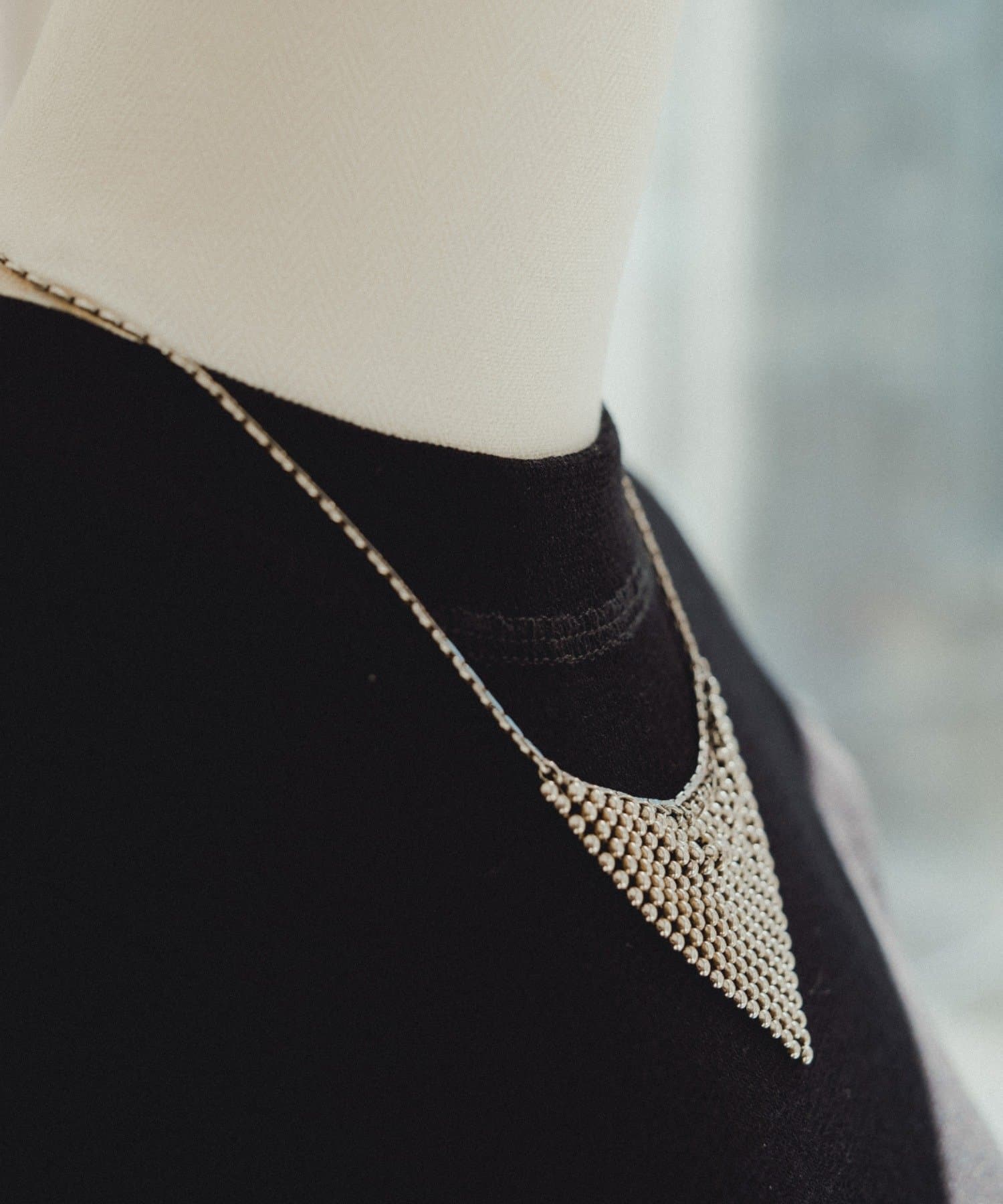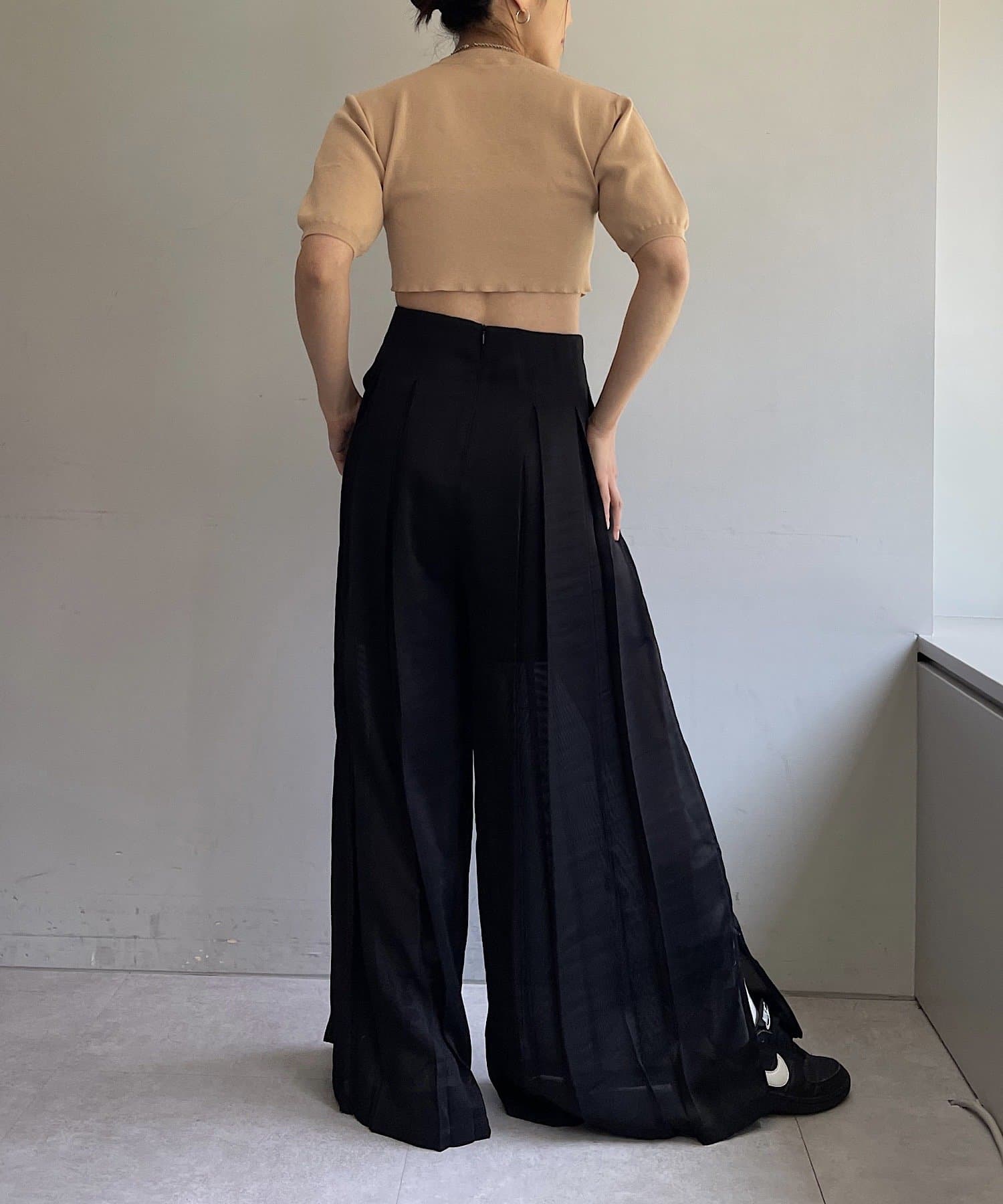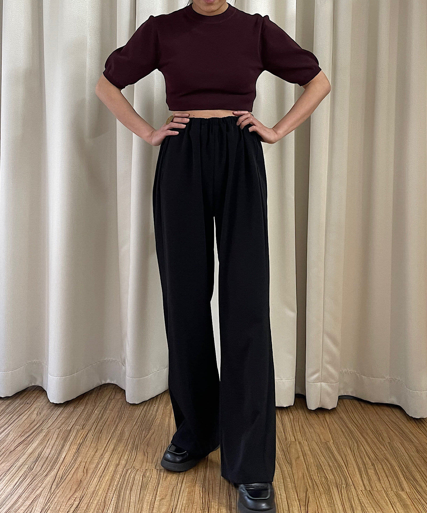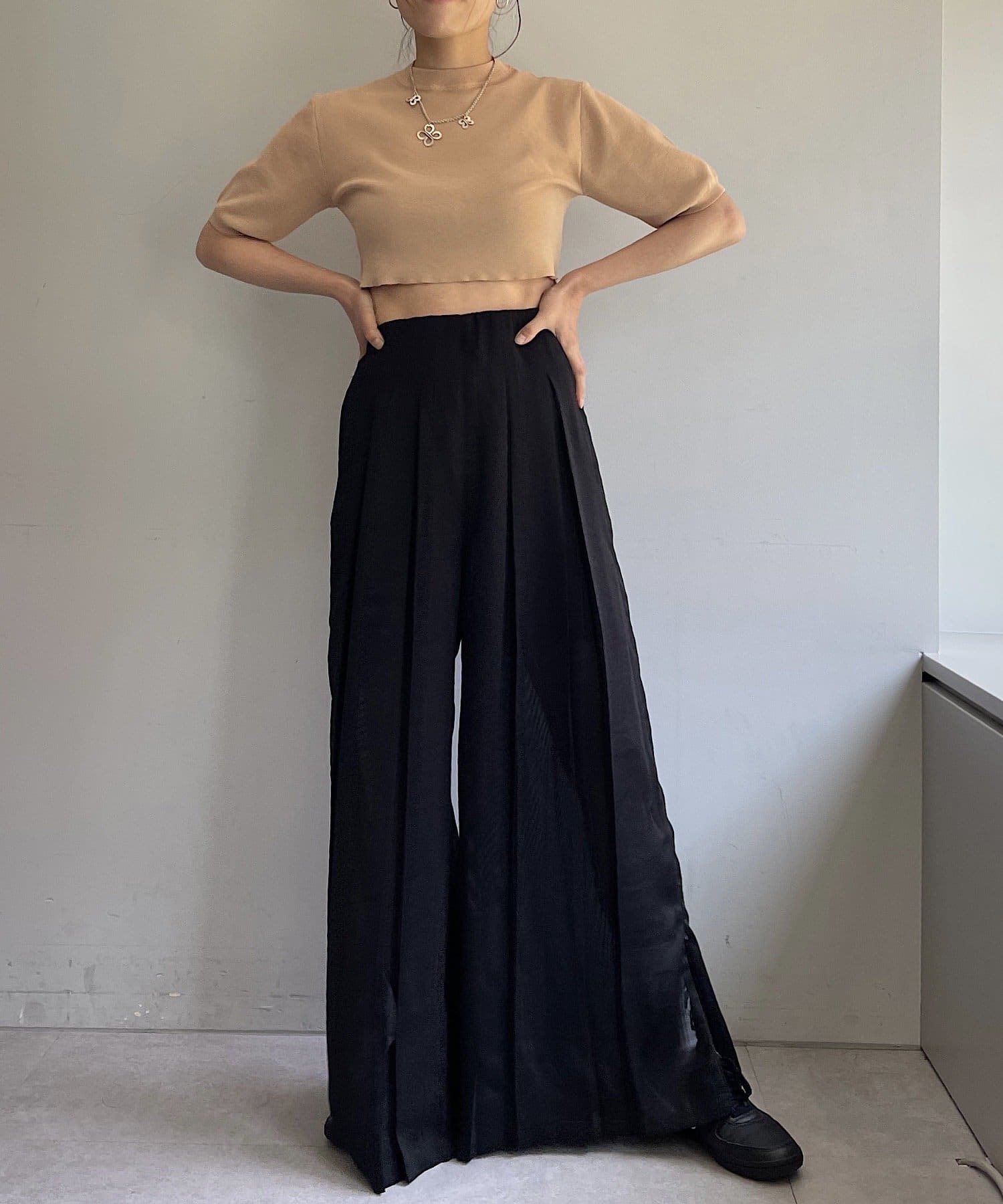 着丈はかなり短めな37cm設定。ハイウエストデニムや股上がしっかりと深めのボトムスとあわせて、ウエスト上部をちらりと見せて使うのがカッコいい。個人的には、シアーインナーやシャツを中に重ねて着て、ビスチェのような役割でレイヤードスタイルを楽しむのもお勧めです。