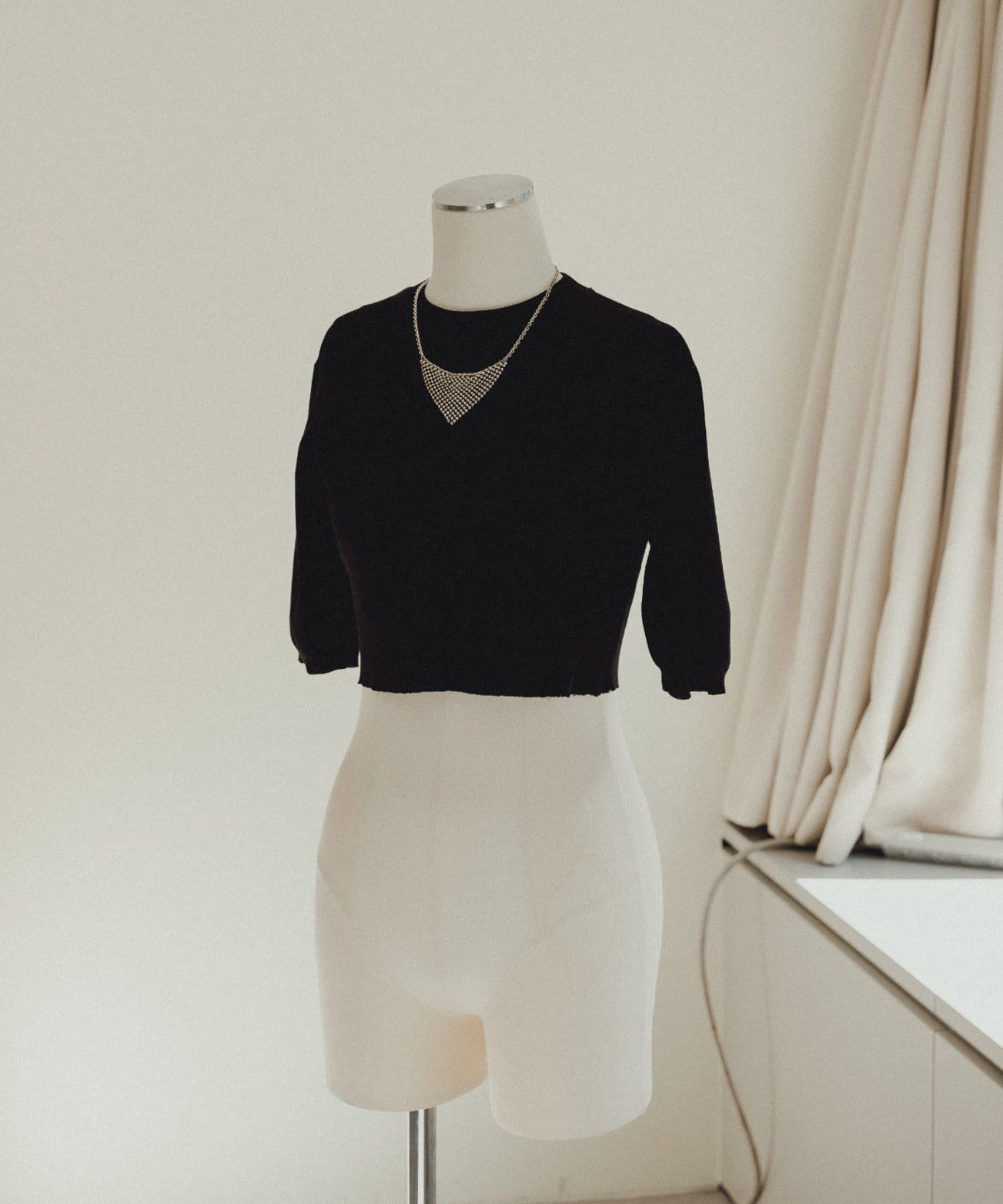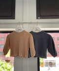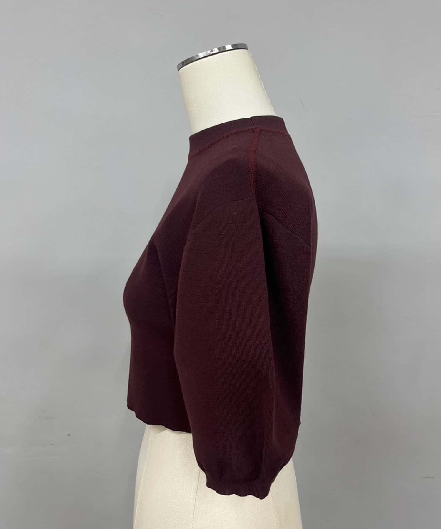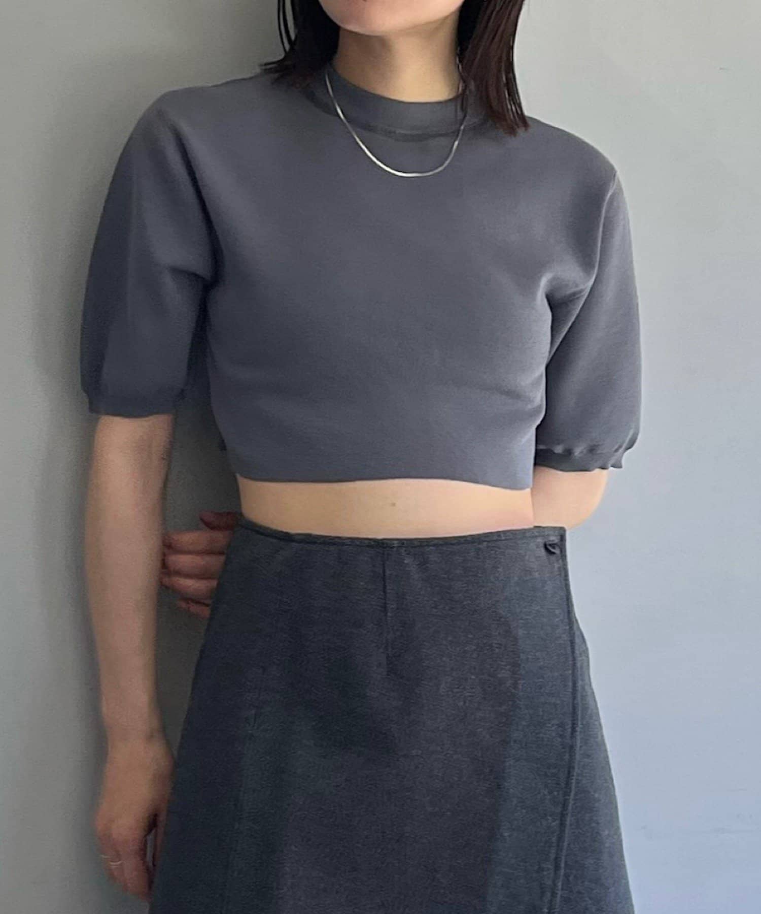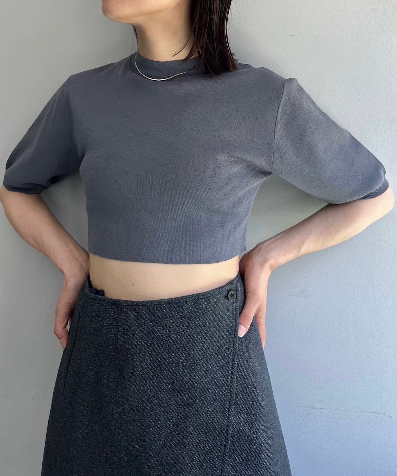 コンパクトなサイジングのクロップドのTシャツをハイゲージニットで作りました。強撚のコットン・ナイロン糸を編み上げたシャリっとした風合いが涼しげな夏用サマーニットです。毛羽が少なく細い糸をぎゅっと目を詰めて編み上げているので型崩れしにくく、長年着てもヨレたりすぐにくたびれたりしにくいのも、嬉しいポイントです。カットソーのTシャツよりも、綺麗な印象で着用いただけます。