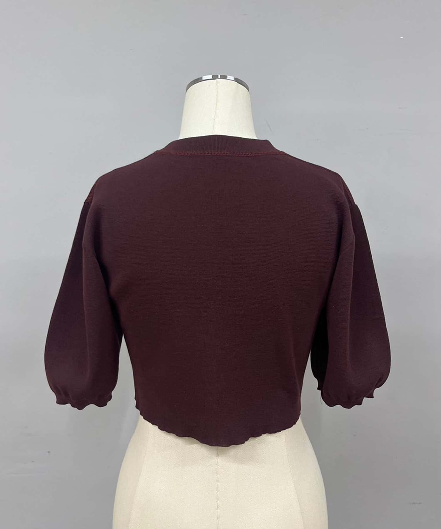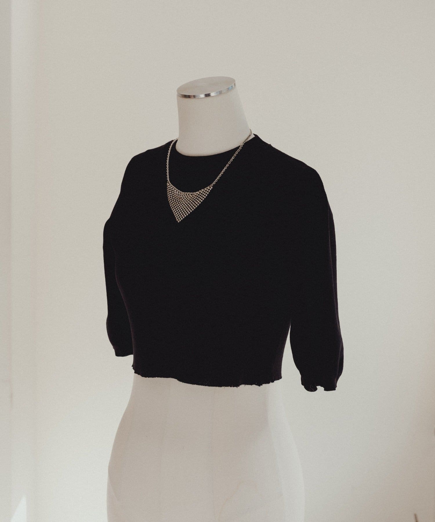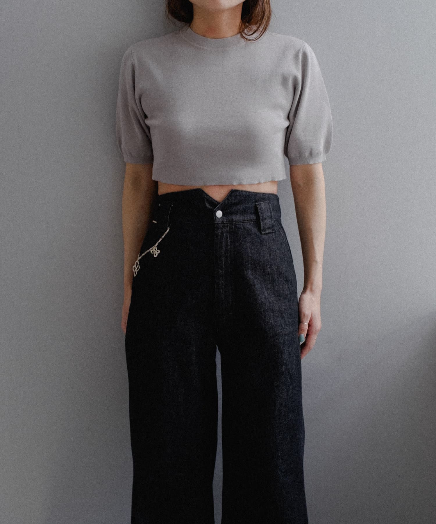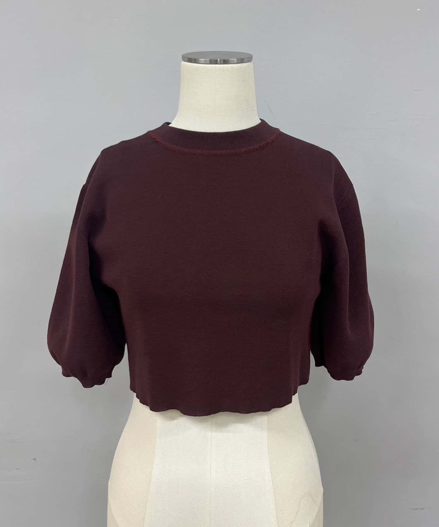 コンパクトなサイジングのクロップドのTシャツをハイゲージニットで作りました。強撚のコットン・ナイロン糸を編み上げたシャリっとした風合いが涼しげな夏用サマーニットです。毛羽が少なく細い糸をぎゅっと目を詰めて編み上げているので型崩れしにくく、長年着てもヨレたりすぐにくたびれたりしにくいのも、嬉しいポイントです。カットソーのTシャツよりも、綺麗な印象で着用いただけます。