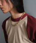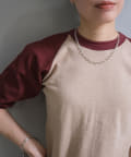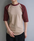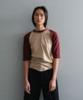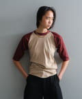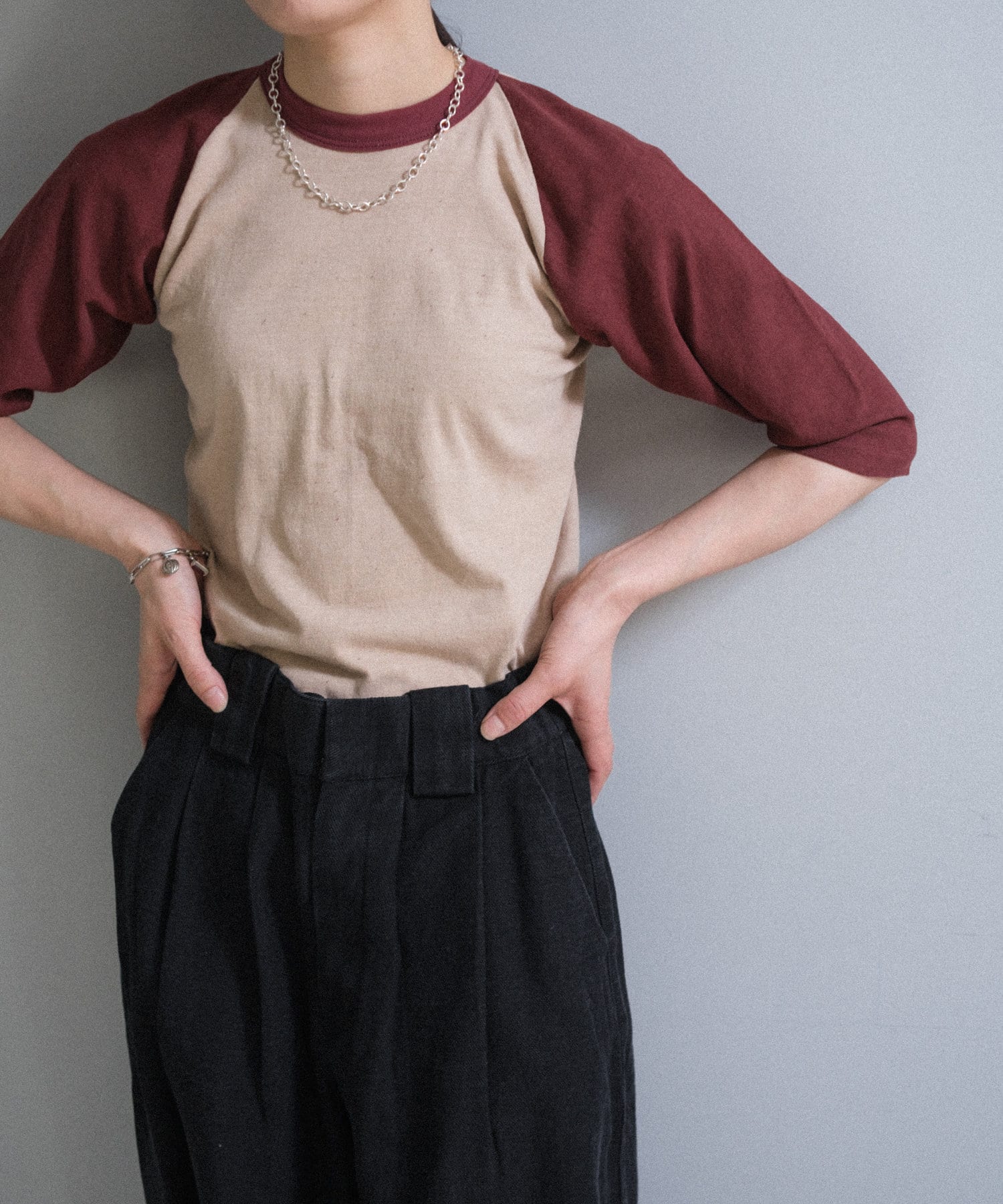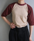 コンパクトなサイジングがなんとも新鮮なこのTシャツは、デットストックのYOUTH用のXLサイズ。細くて長い身幅と、4.5分くらいまである袖の長さが特徴的です。実は、もともとボディカラーは真っ白で、長い年月眠っていた間に、ところどころその白ボディに日に焼けた跡がついてしまっていました。思い切ってその「日焼け色」のベージュに合わせてオーバーダイ(染色)したところ、袖のワインレッドと抜群に相性が良いグッドカラーにまとまり、ここにしかない特別な一着に生まれ変わりました。