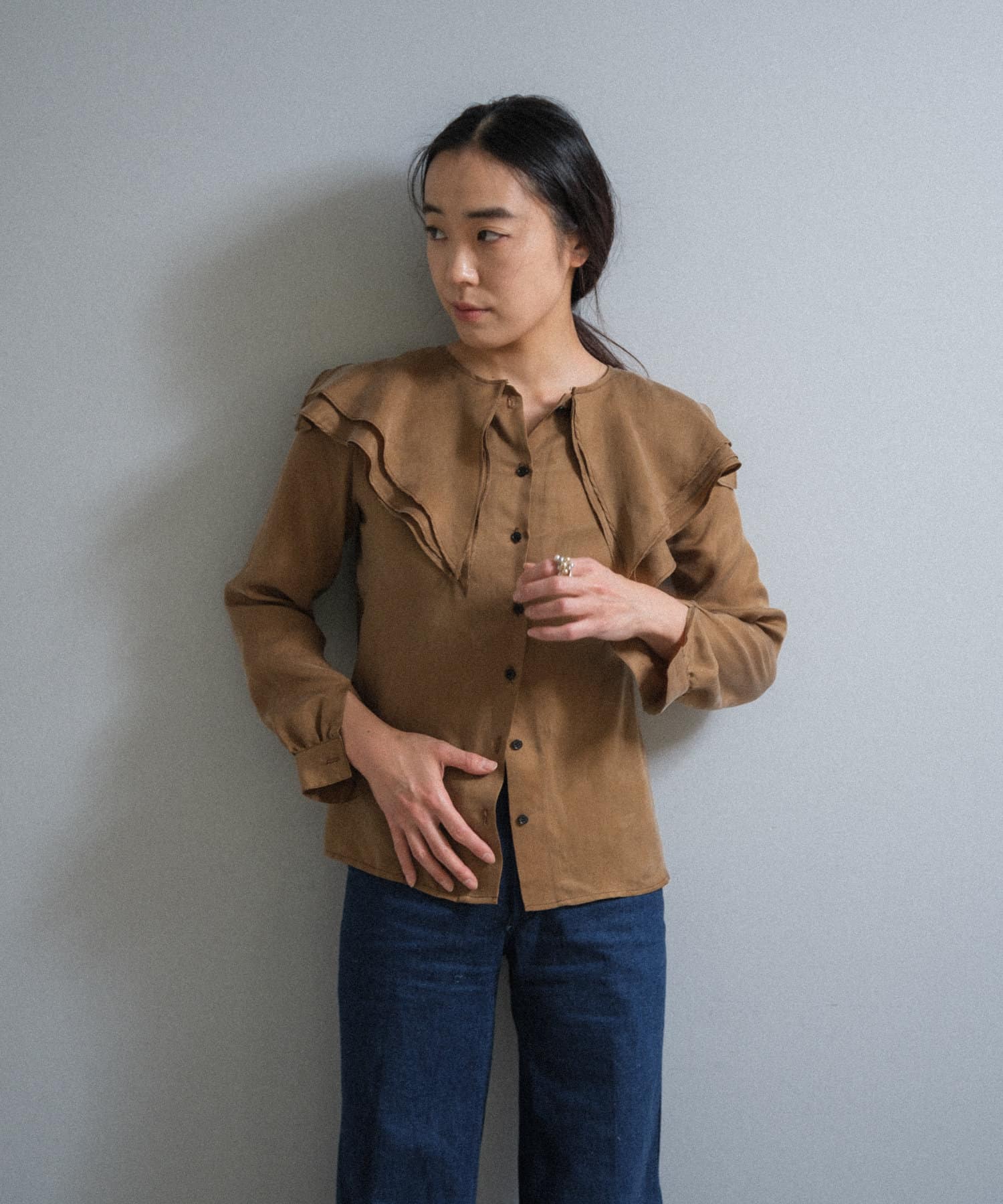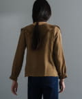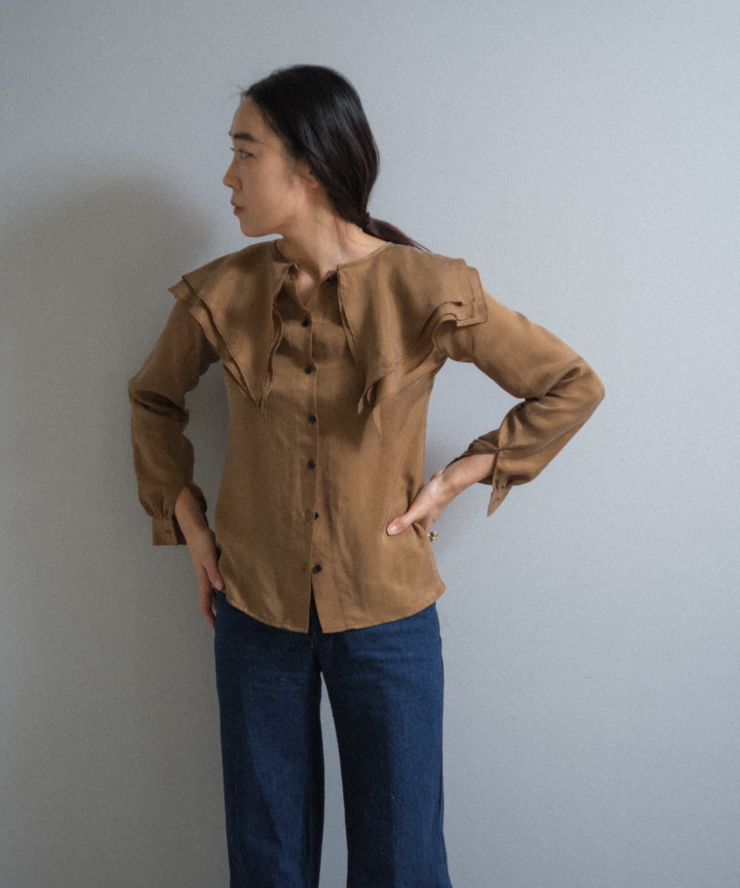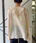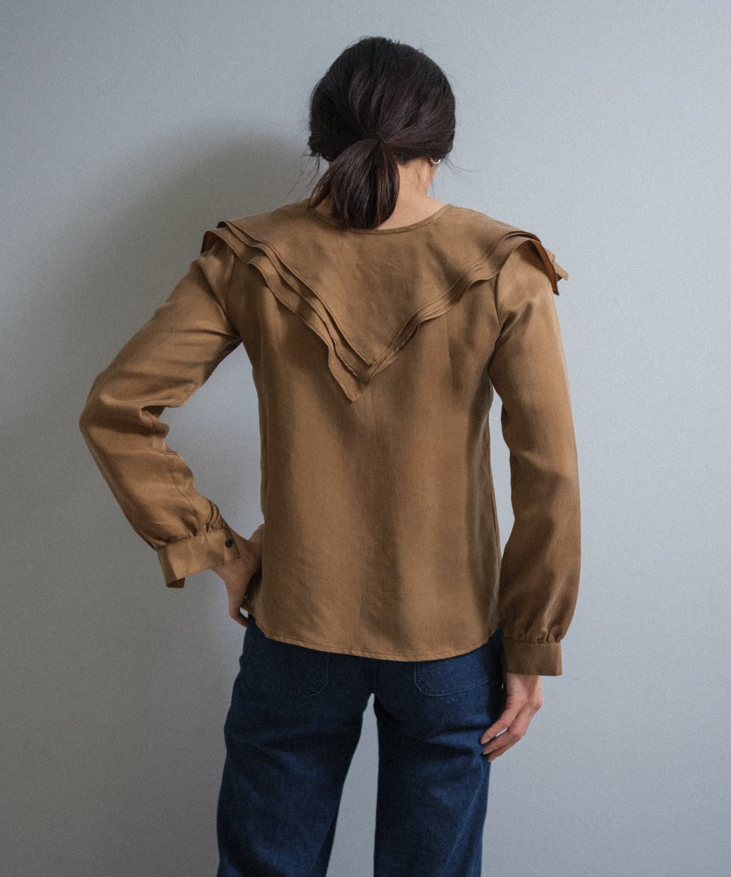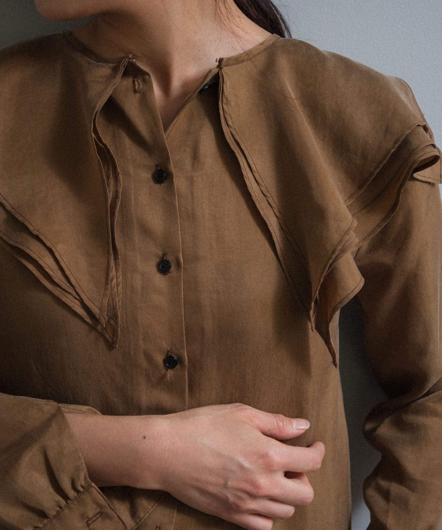 襟ぐりにぐるりと付けられた大きな襟は、3枚生地が重なっているので、ひらひらとした動きが出て顔回りが一気に華やかになります。1枚着はもちろん、ジャケットから襟を出して着用するのも定番ながらお勧めです。使用した生地は、フィブリル加工(生地の表面の繊細な繊維に毛羽立ちを施す特殊加工)がなされたキュプラのツイル生地。シルクのような柔らかさと滑らかな肌触りを再現するのに最適な美しいファブリックで、年月を経た衣服のような、味わい深い独特の表情感が出るのも特徴です。