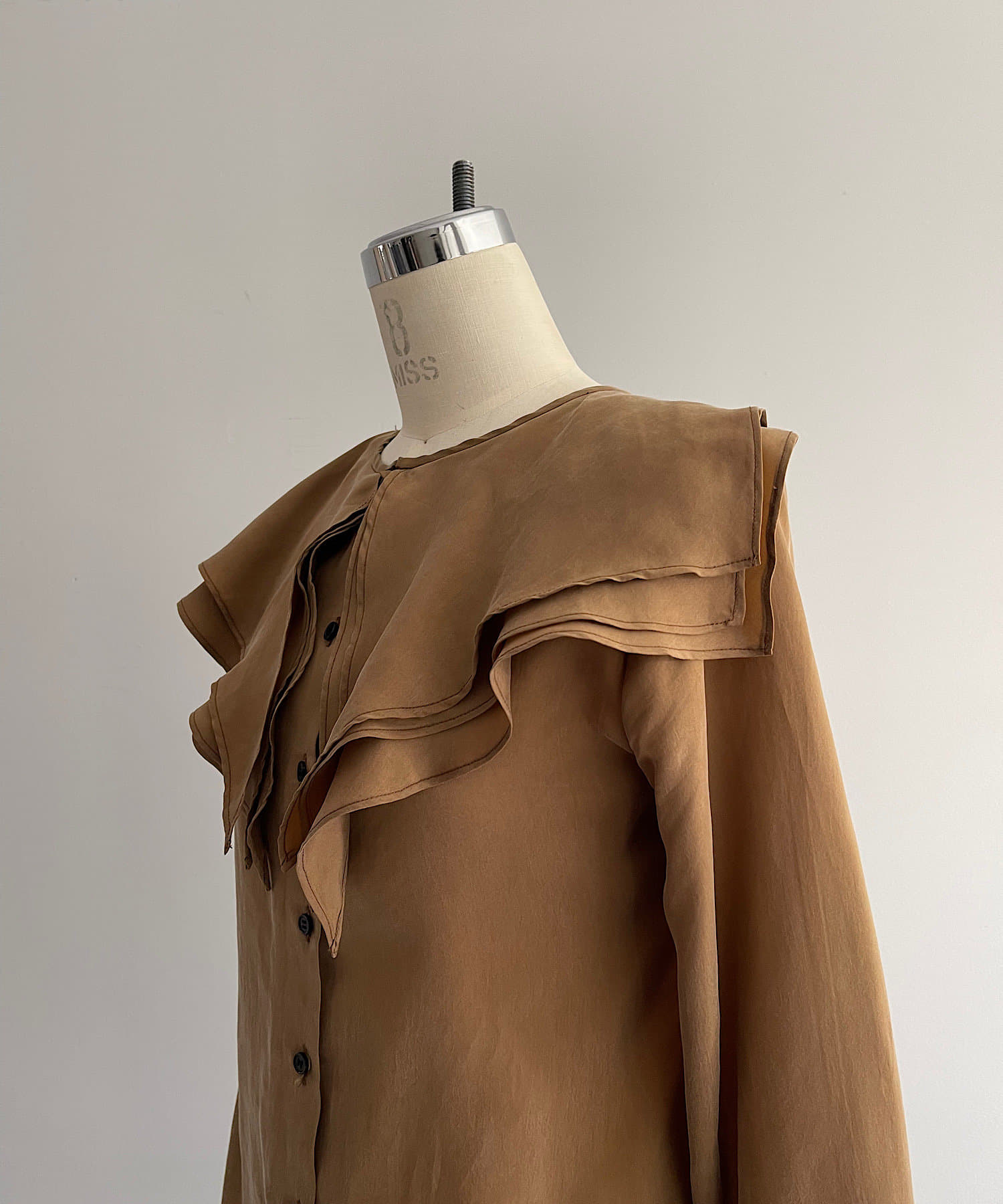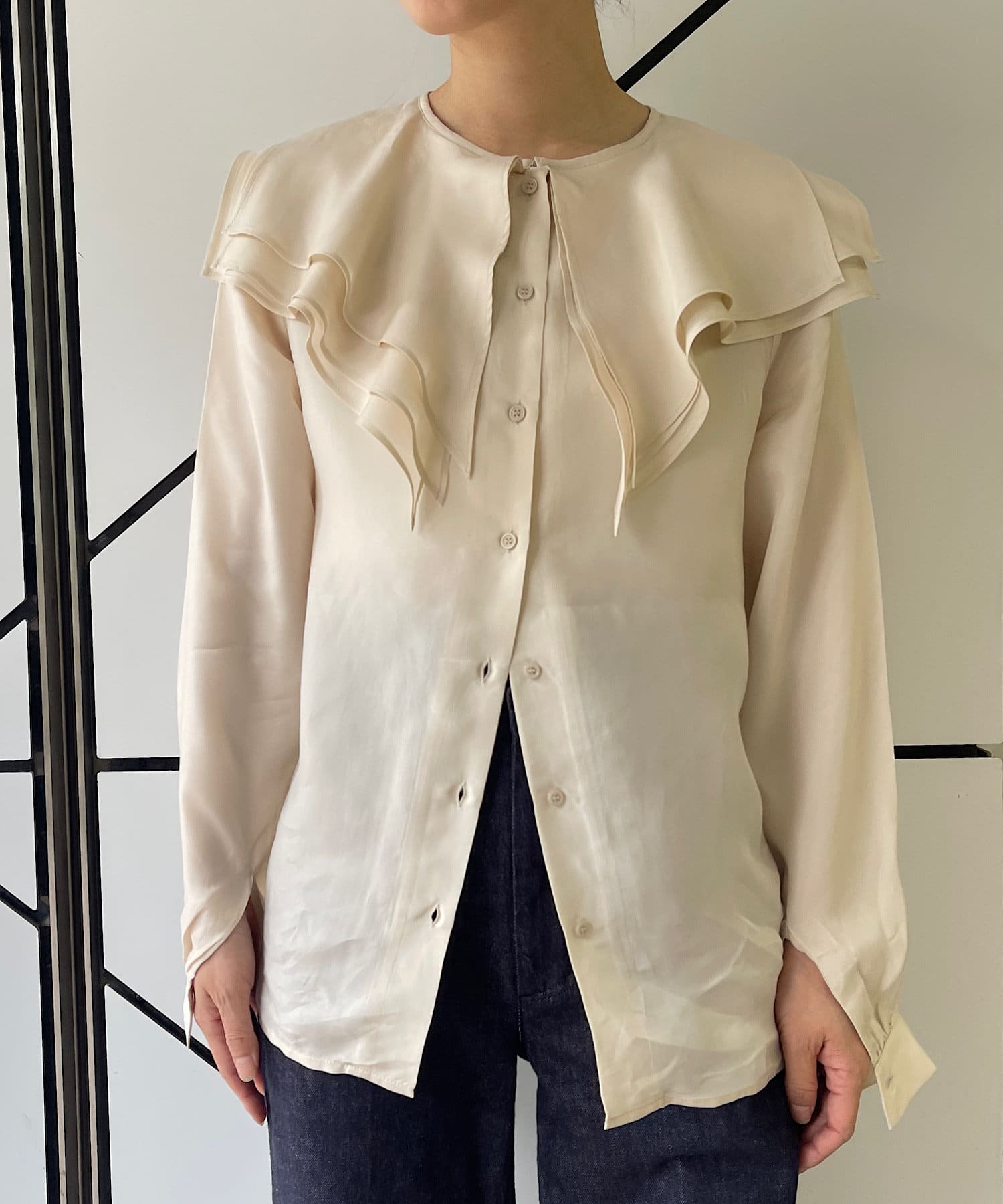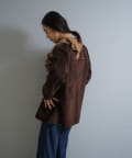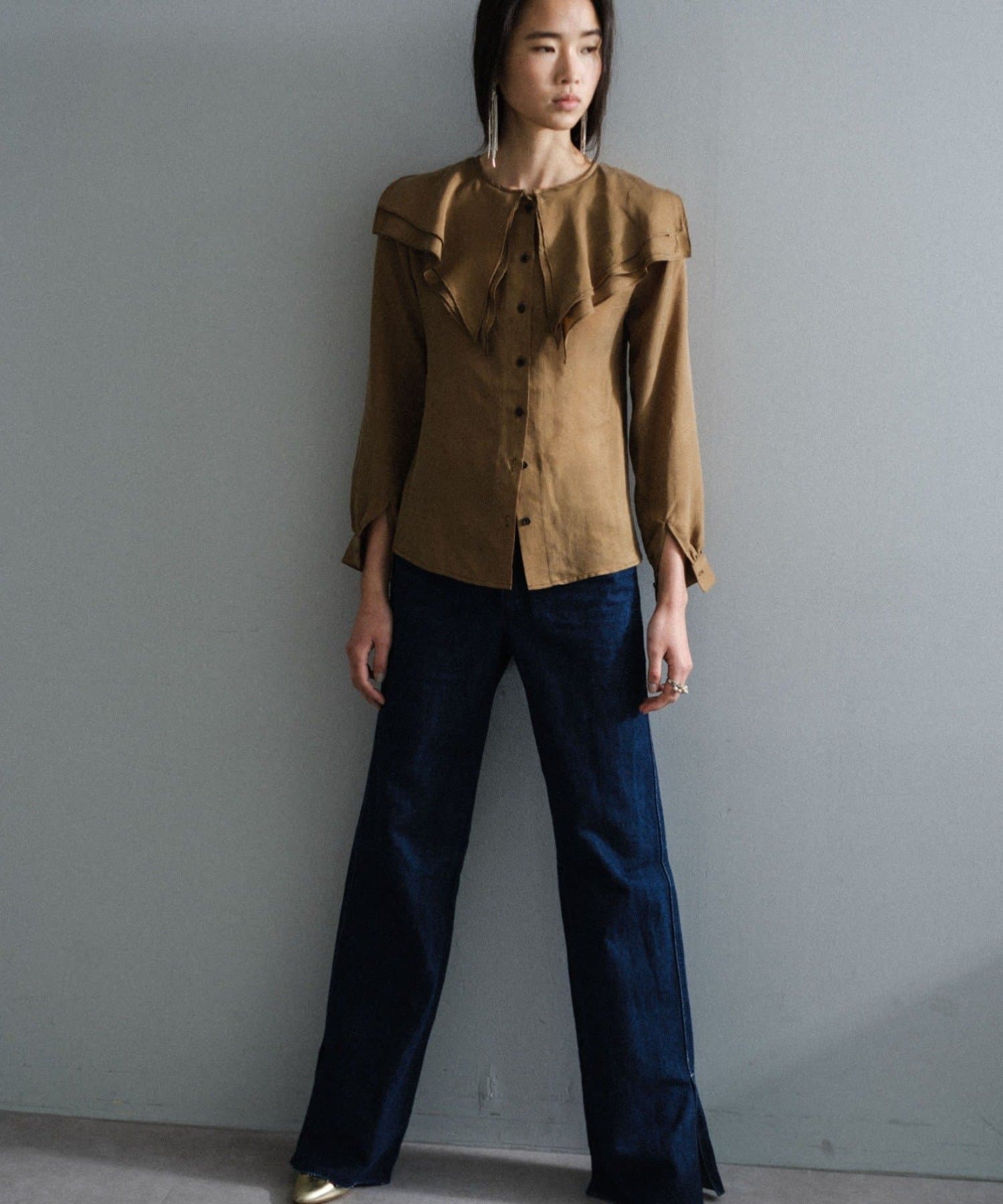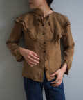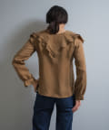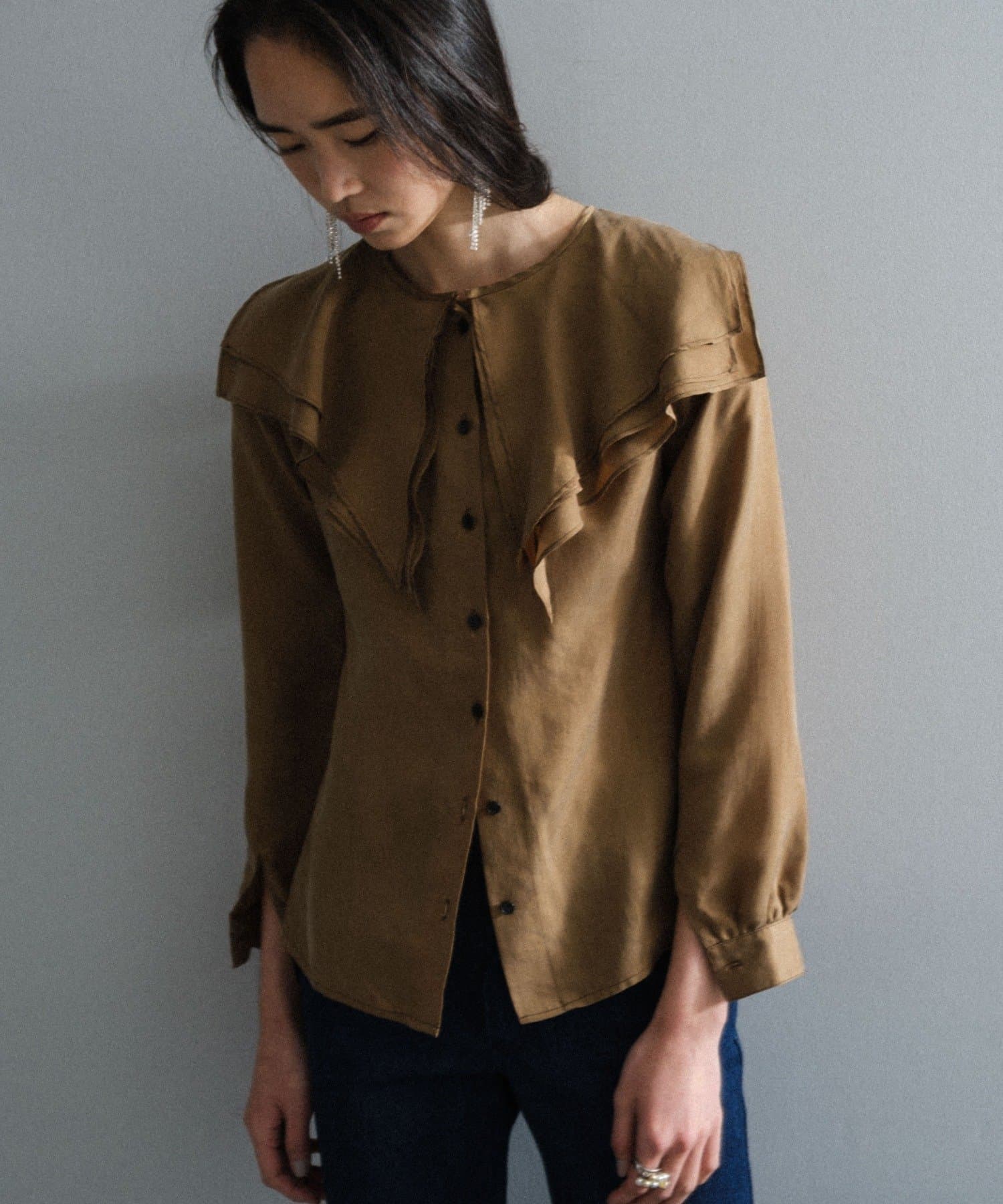 襟ぐりにぐるりと付けられた大きな襟は、3枚生地が重なっているので、ひらひらとした動きが出て顔回りが一気に華やかになります。1枚着はもちろん、ジャケットから襟を出して着用するのも定番ながらお勧めです。使用した生地は、フィブリル加工(生地の表面の繊細な繊維に毛羽立ちを施す特殊加工)がなされたキュプラのツイル生地。シルクのような柔らかさと滑らかな肌触りを再現するのに最適な美しいファブリックで、年月を経た衣服のような、味わい深い独特の表情感が出るのも特徴です。