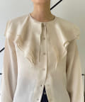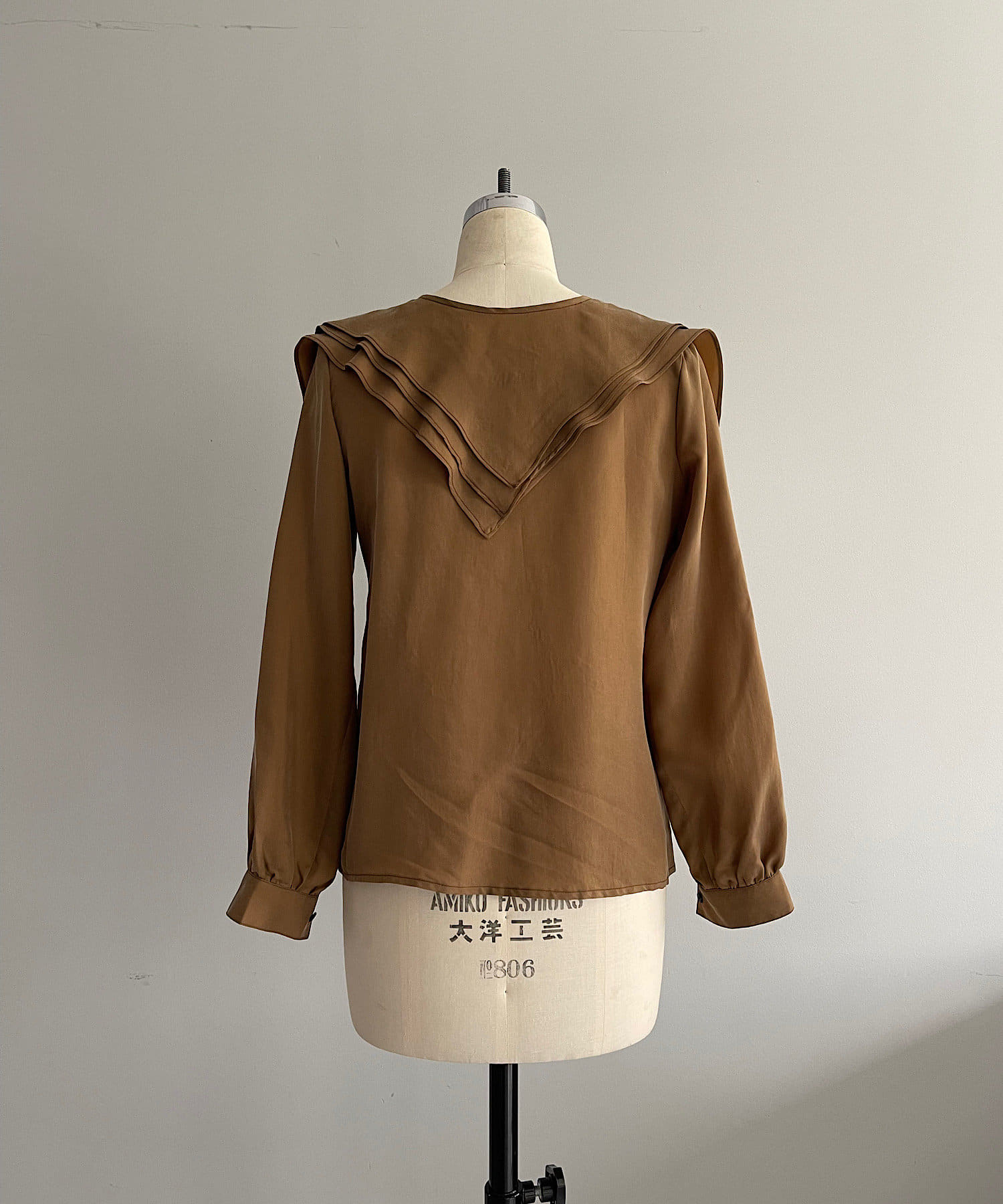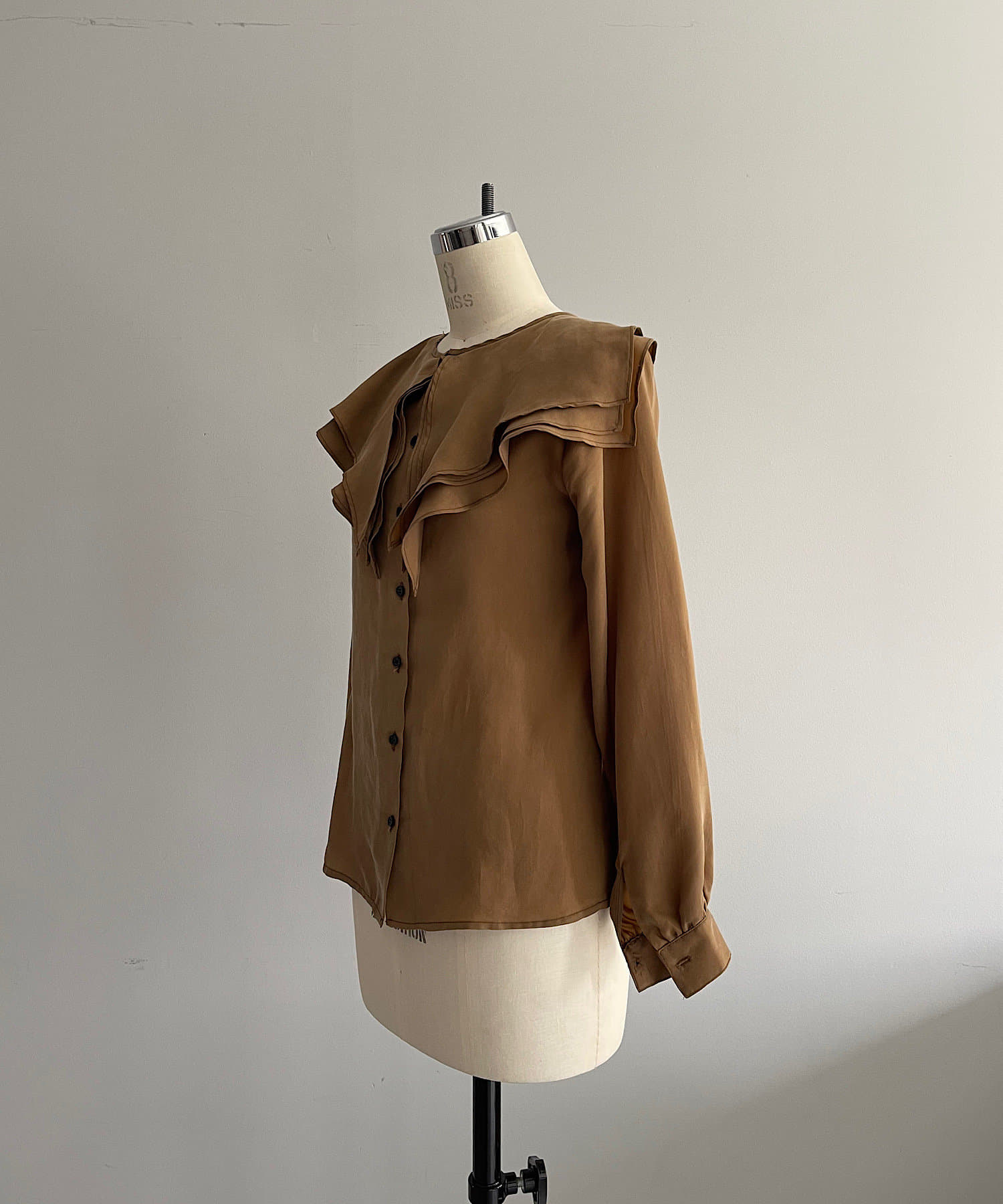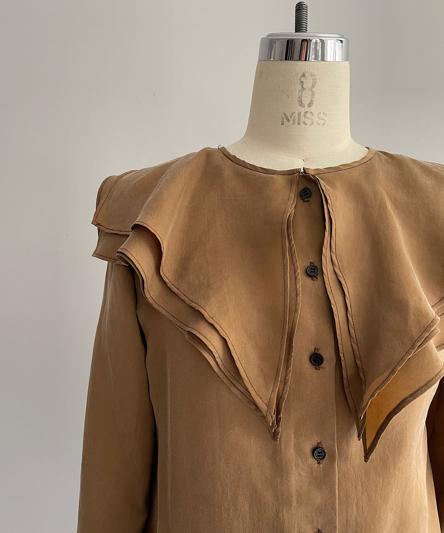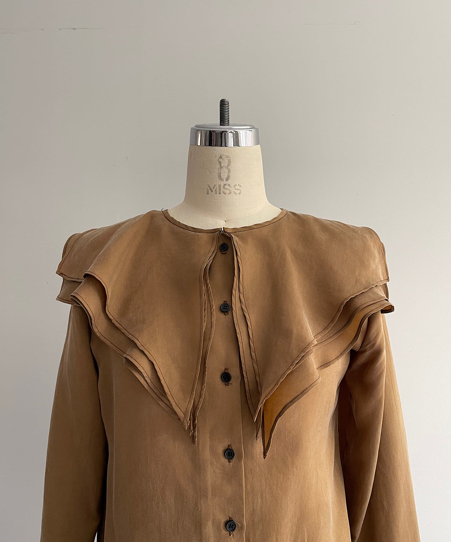 襟ぐりにぐるりと付けられた大きな襟は、3枚生地が重なっているので、ひらひらとした動きが出て顔回りが一気に華やかになります。1枚着はもちろん、ジャケットから襟を出して着用するのも定番ながらお勧めです。使用した生地は、フィブリル加工(生地の表面の繊細な繊維に毛羽立ちを施す特殊加工)がなされたキュプラのツイル生地。シルクのような柔らかさと滑らかな肌触りを再現するのに最適な美しいファブリックで、年月を経た衣服のような、味わい深い独特の表情感が出るのも特徴です。