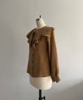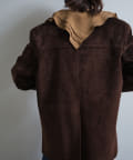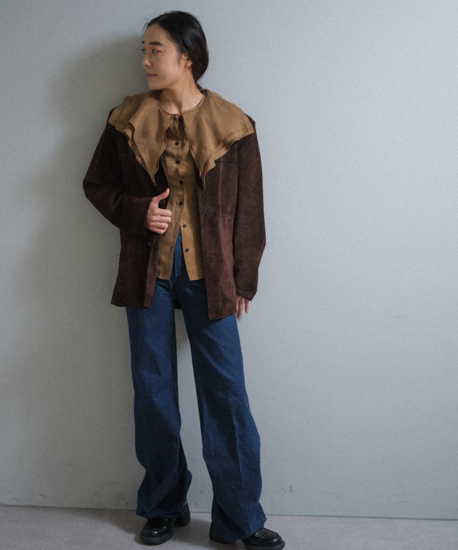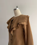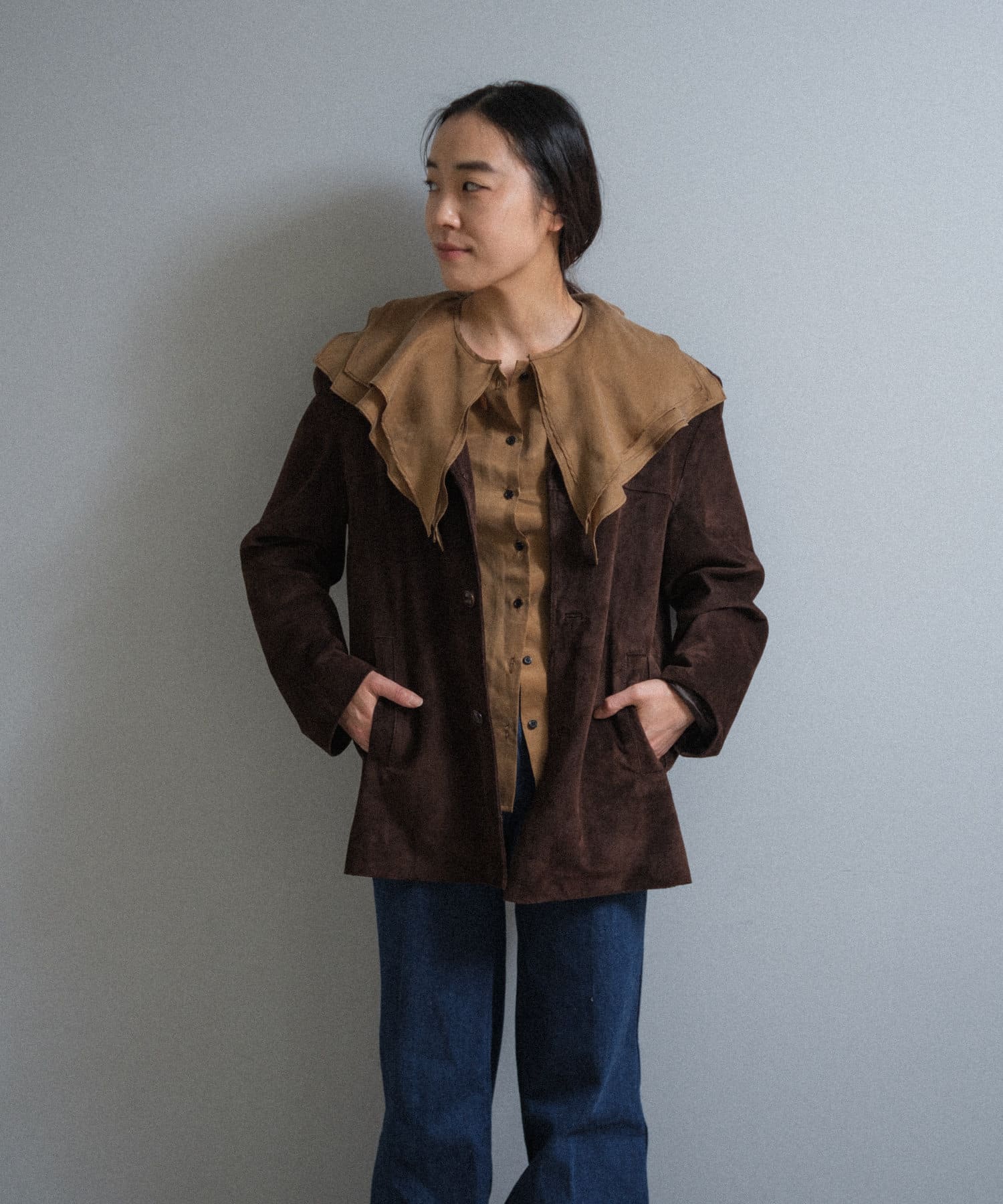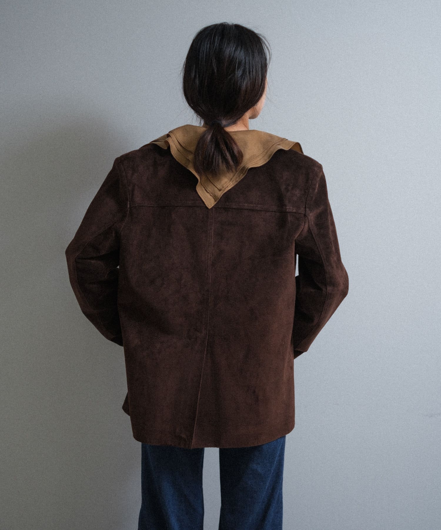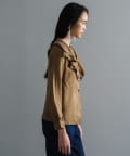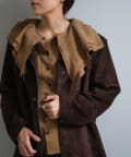 また、この手の大きな襟のデザインには珍しくコンパクトなサイジングに設定しているのもポイントです。ジャケットの中に着てもかさばらず、着ぶくれしにくいようスッキリとしたサイズ感に設定しています。襟に隠れるようにごく薄手の肩パットが入っており、さりげなく肩まわりのシルエットをキレイに補正してくれます。