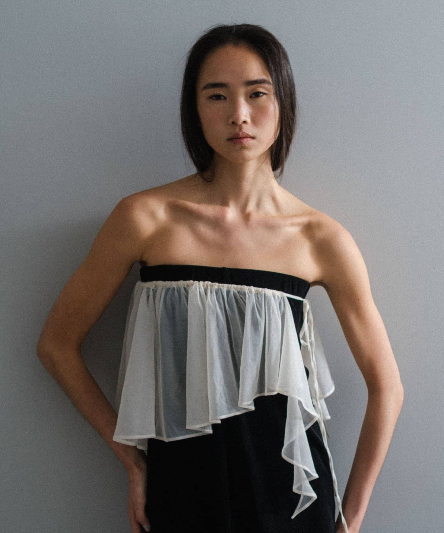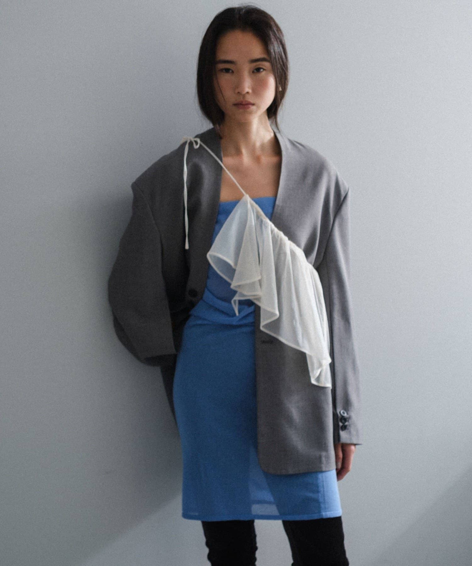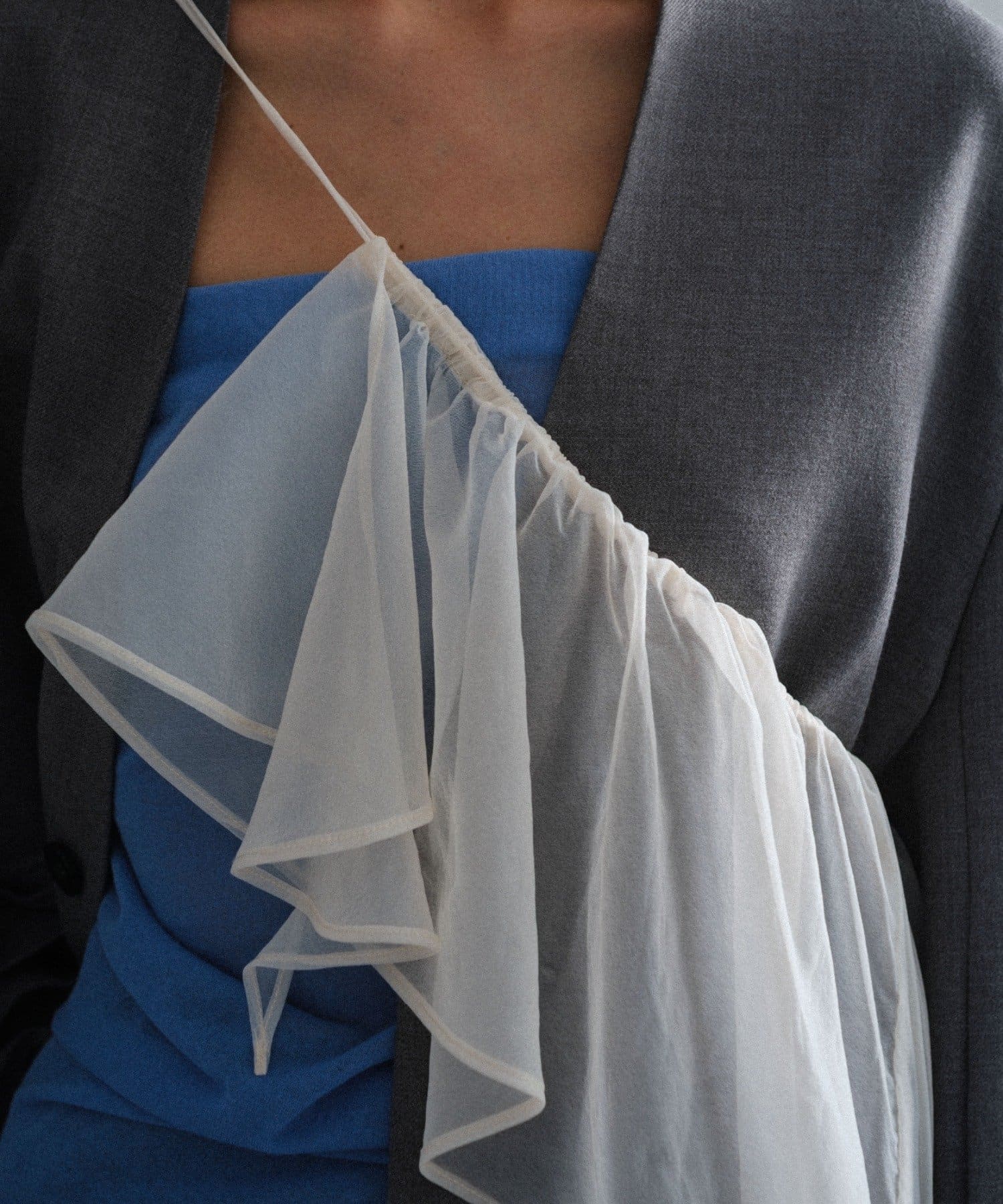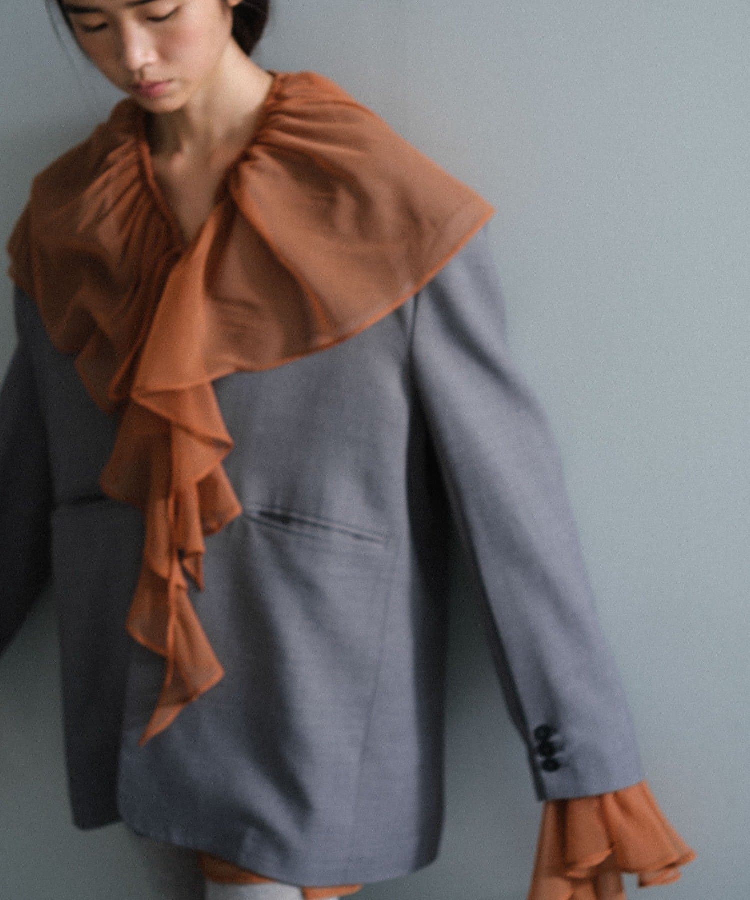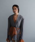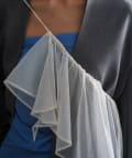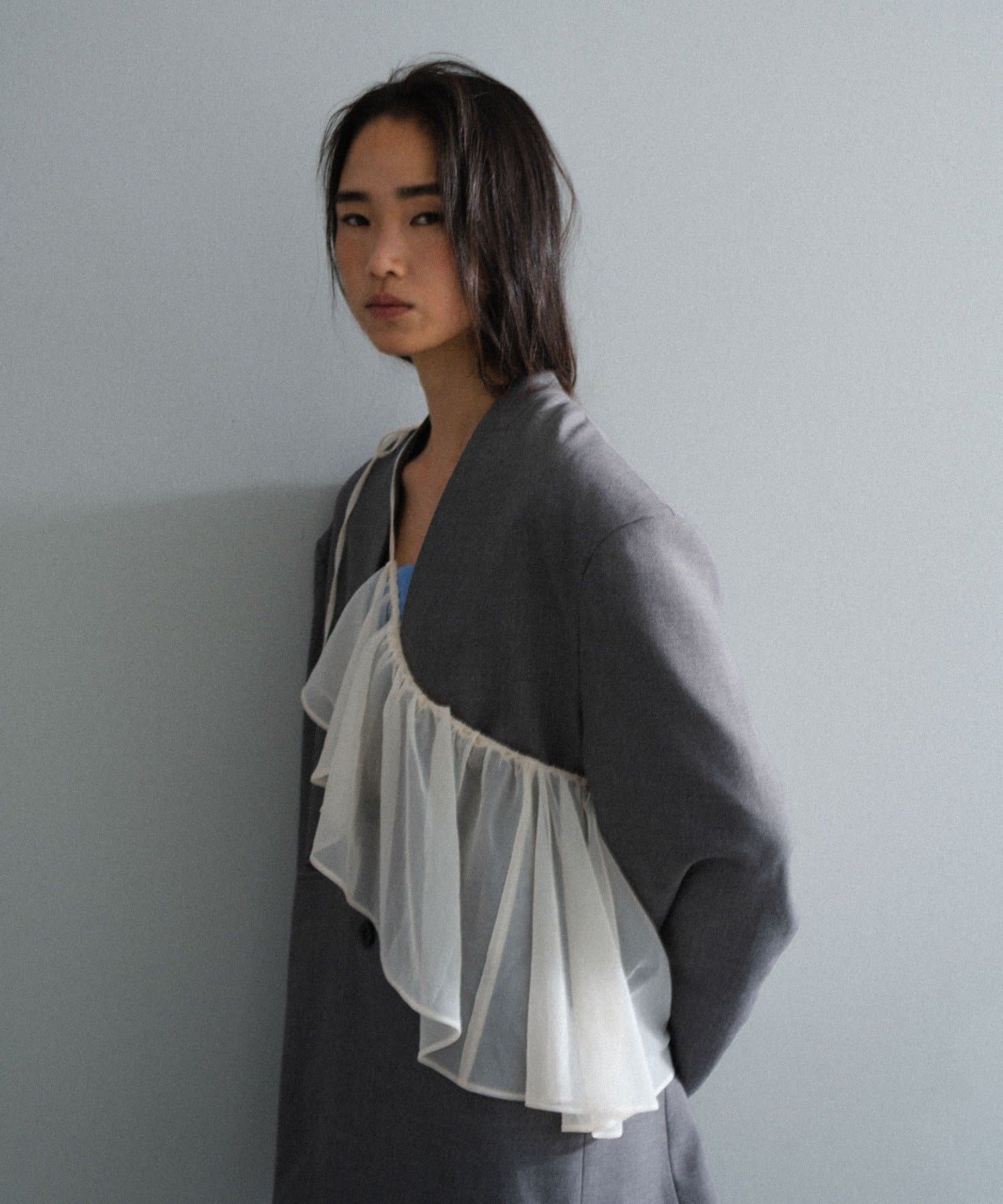 滑らかに落ちる生地の特性を活かして作ったカスケードフリルの付け襟は、首元はもちろん、腰回りやベアトップの胸回りにもワンポイントとして使えるマルチプレーヤー。紐でギャザー分量を調整して、好きな位置で巻いていただけます。ジャンプスーツやジャケットの上に斜め掛けにすると、シンプルなスタイリングが一気に華やかになり、オケージョンシーン等にもマルチに活躍しそうです。袖はアシンメトリーな形状のフレアーデザインになっており、真下でなく斜めに生地がひらひらと落ちる仕掛け。子供っぽくなりがちなフリルデザインですが、抜け感がでるように落ちた時のシルエットに拘って、細かくフリルの付き方や傾斜を設定しています。