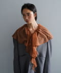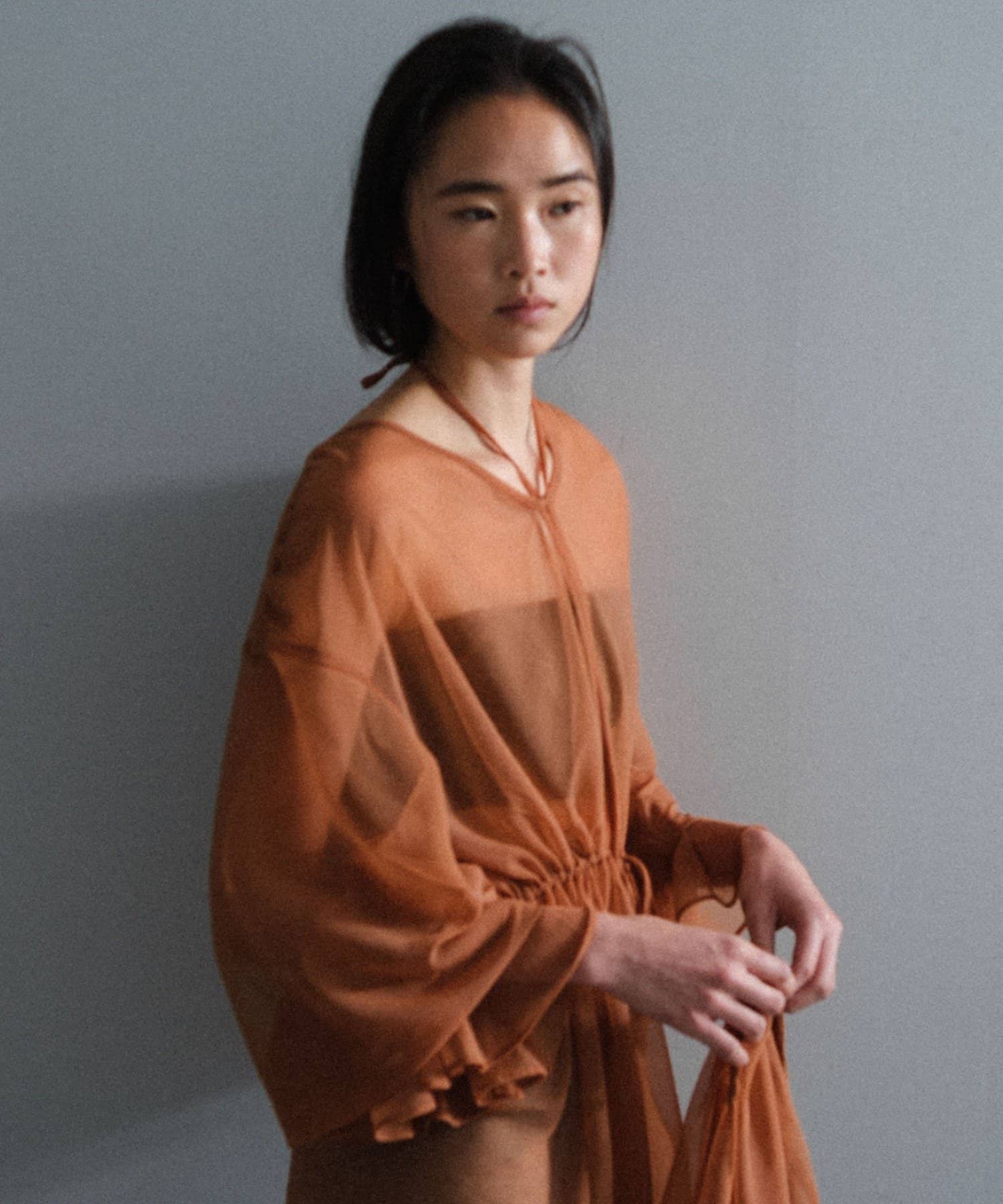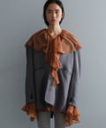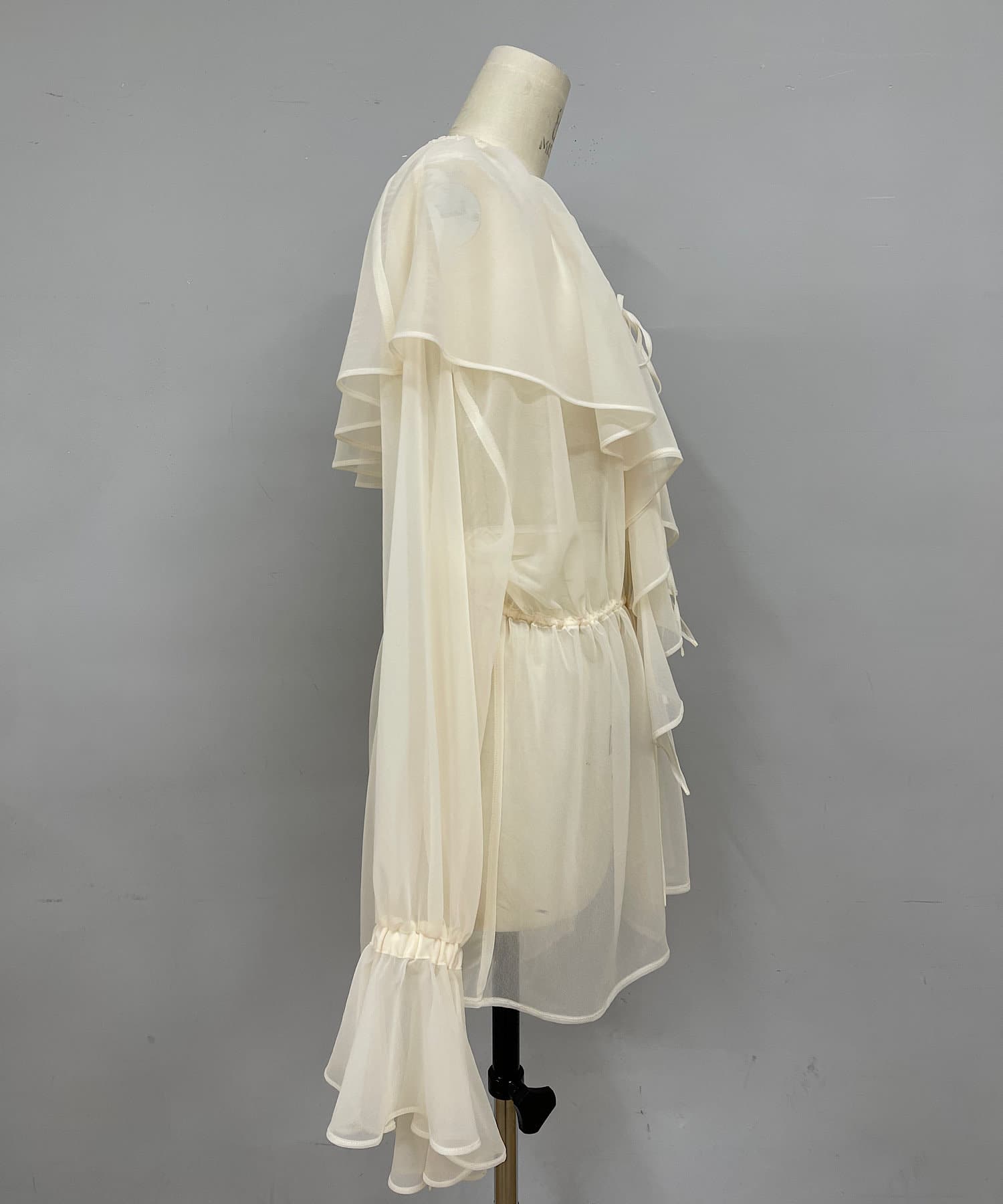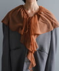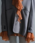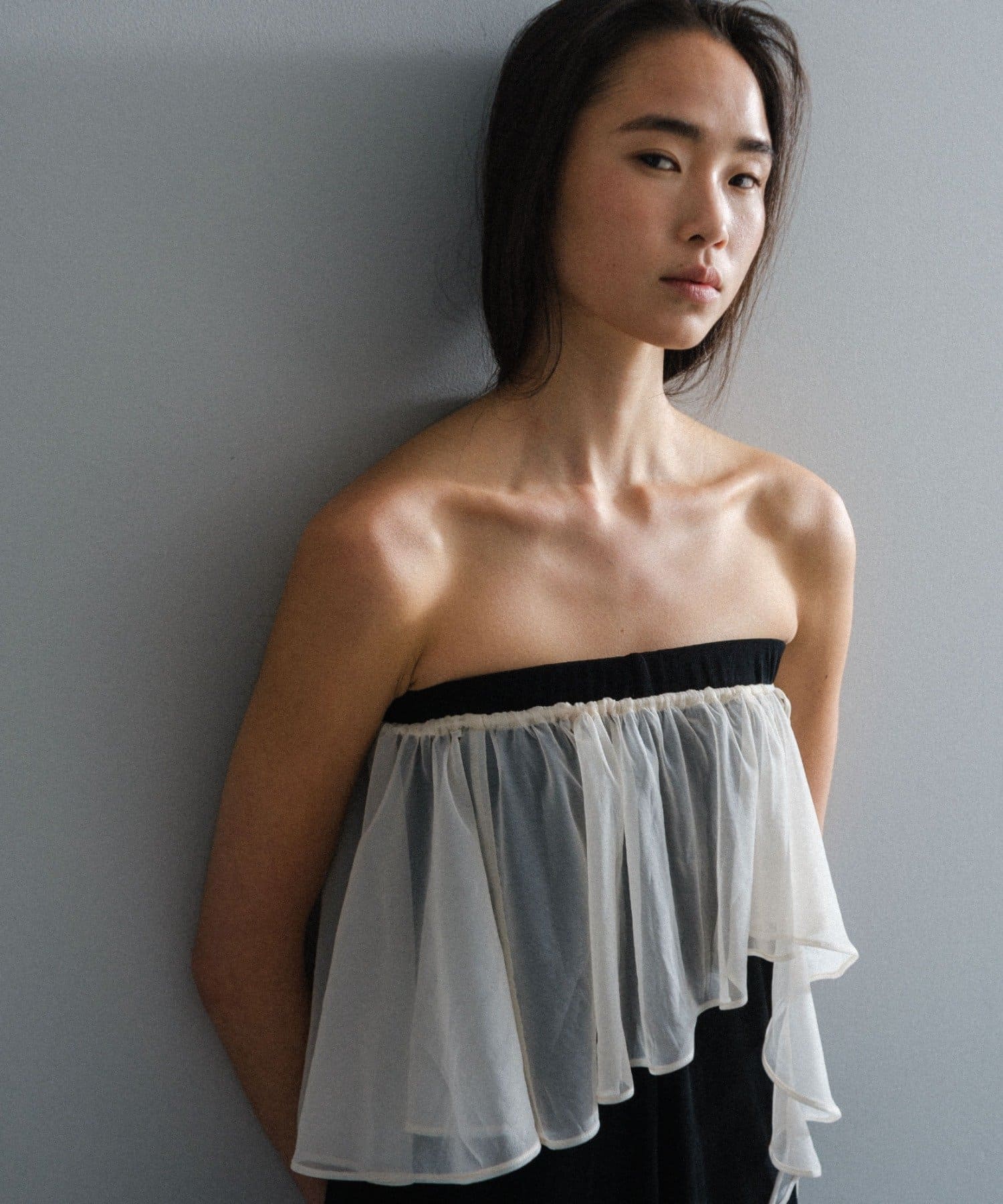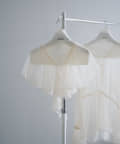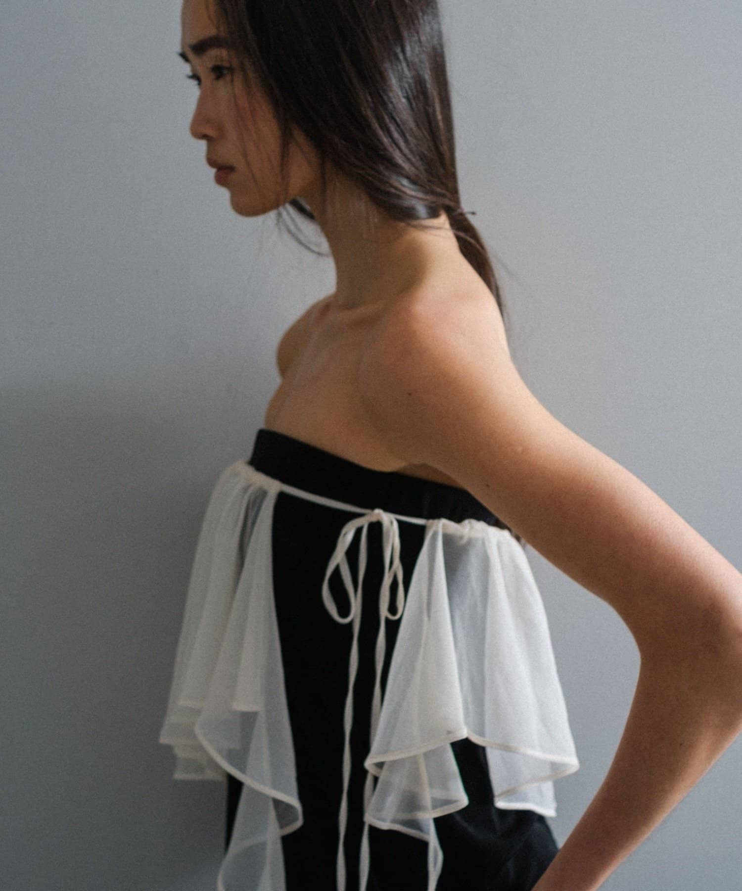 滑らかに落ちる生地の特性を活かして作ったカスケードフリルの付け襟は、首元はもちろん、腰回りやベアトップの胸回りにもワンポイントとして使えるマルチプレーヤー。紐でギャザー分量を調整して、好きな位置で巻いていただけます。ジャンプスーツやジャケットの上に斜め掛けにすると、シンプルなスタイリングが一気に華やかになり、オケージョンシーン等にもマルチに活躍しそうです。袖はアシンメトリーな形状のフレアーデザインになっており、真下でなく斜めに生地がひらひらと落ちる仕掛け。子供っぽくなりがちなフリルデザインですが、抜け感がでるように落ちた時のシルエットに拘って、細かくフリルの付き方や傾斜を設定しています。