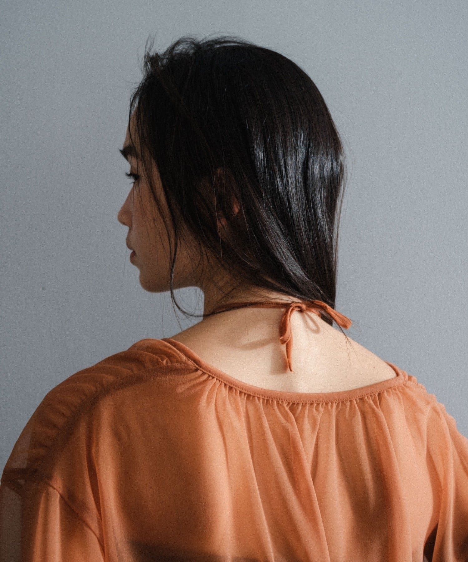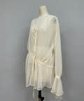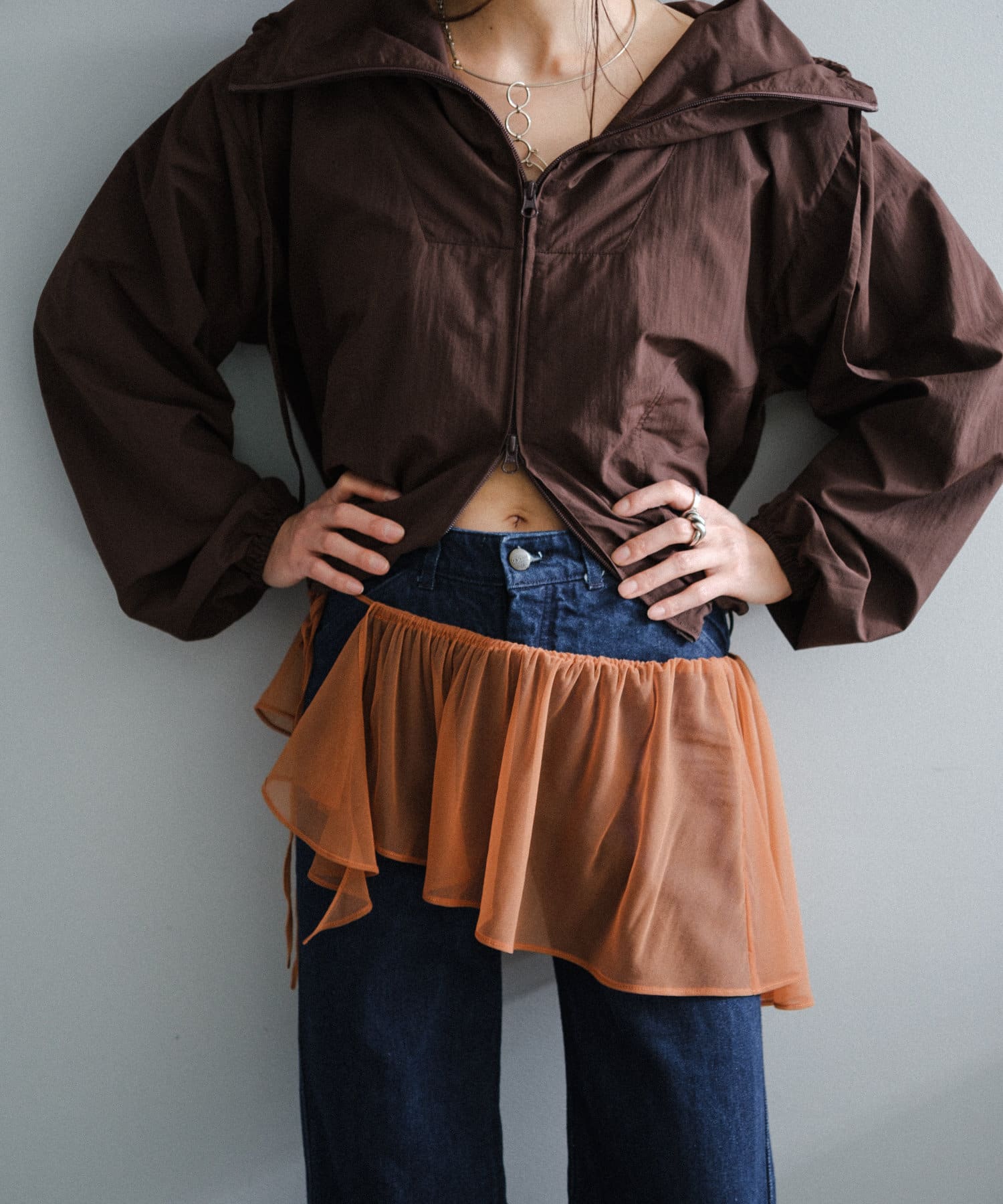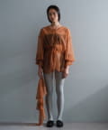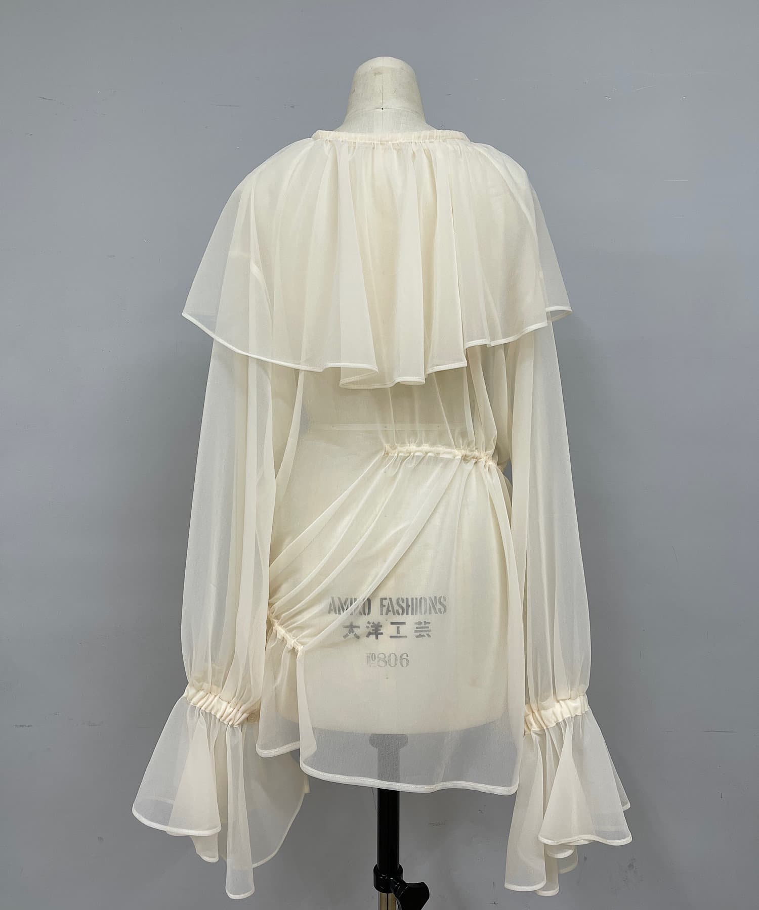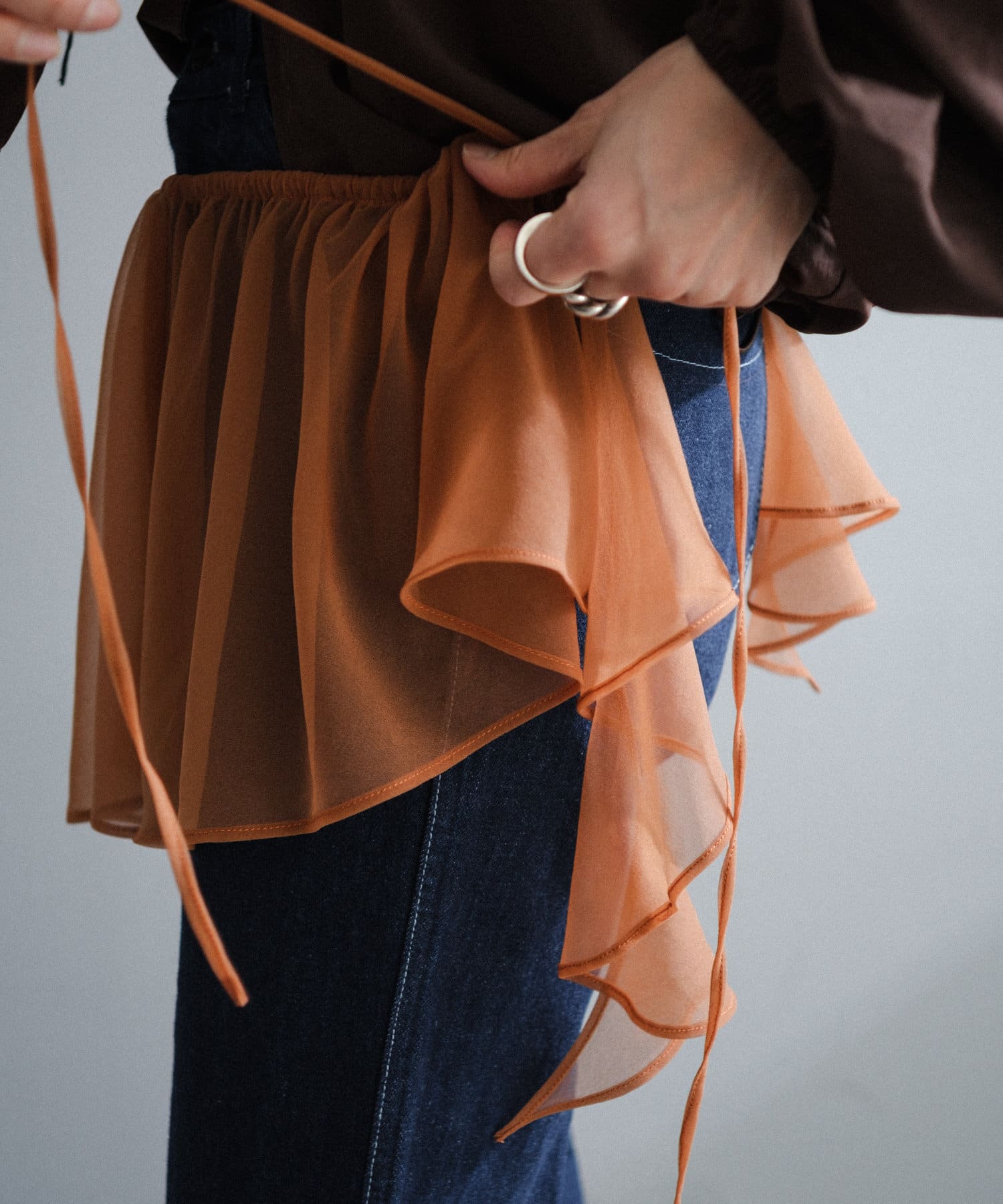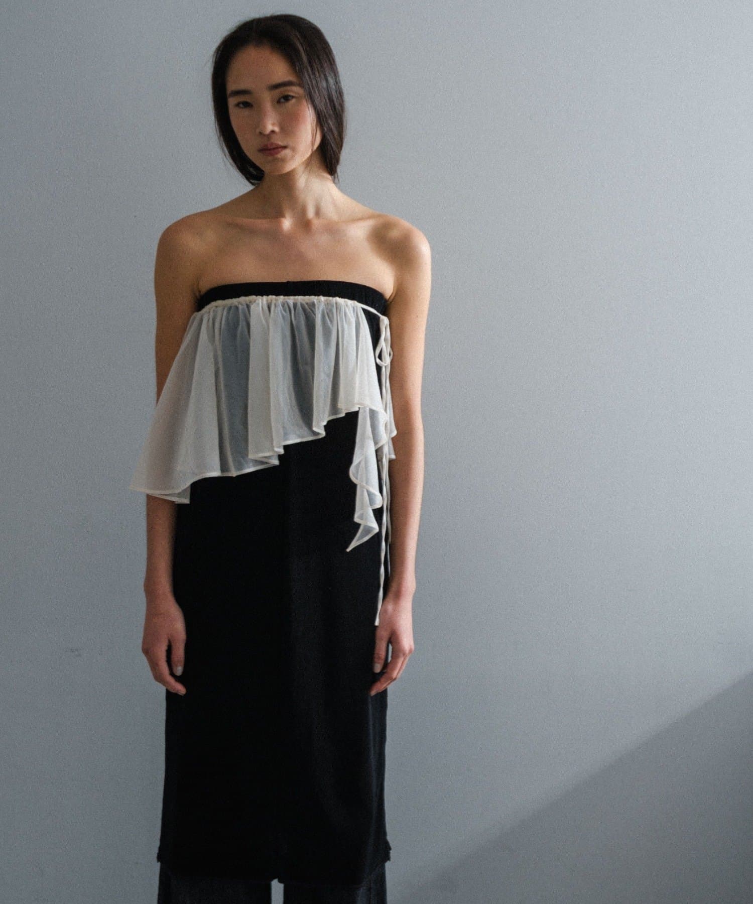 滑らかに落ちる生地の特性を活かして作ったカスケードフリルの付け襟は、首元はもちろん、腰回りやベアトップの胸回りにもワンポイントとして使えるマルチプレーヤー。紐でギャザー分量を調整して、好きな位置で巻いていただけます。ジャンプスーツやジャケットの上に斜め掛けにすると、シンプルなスタイリングが一気に華やかになり、オケージョンシーン等にもマルチに活躍しそうです。袖はアシンメトリーな形状のフレアーデザインになっており、真下でなく斜めに生地がひらひらと落ちる仕掛け。子供っぽくなりがちなフリルデザインですが、抜け感がでるように落ちた時のシルエットに拘って、細かくフリルの付き方や傾斜を設定しています。