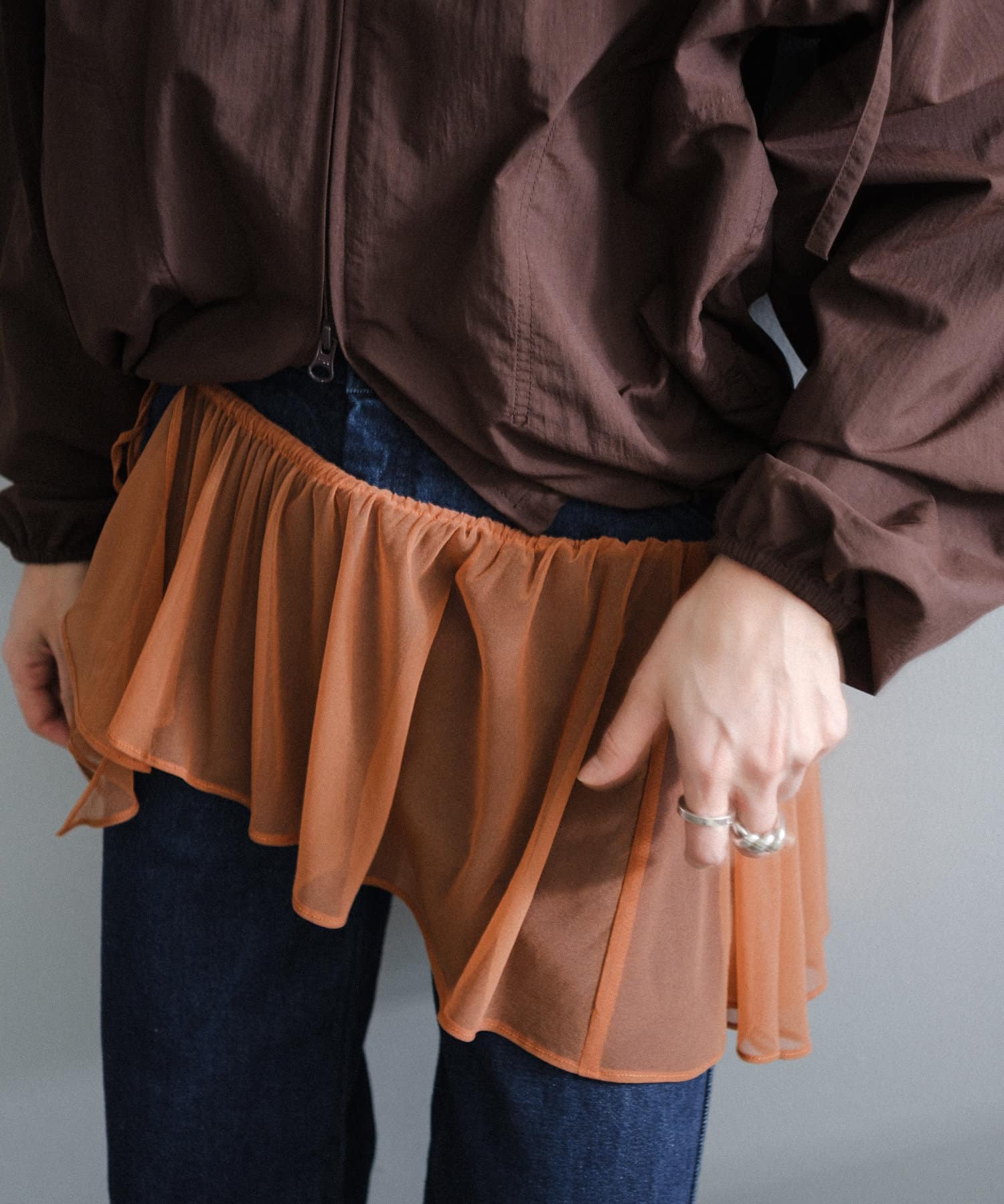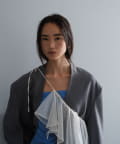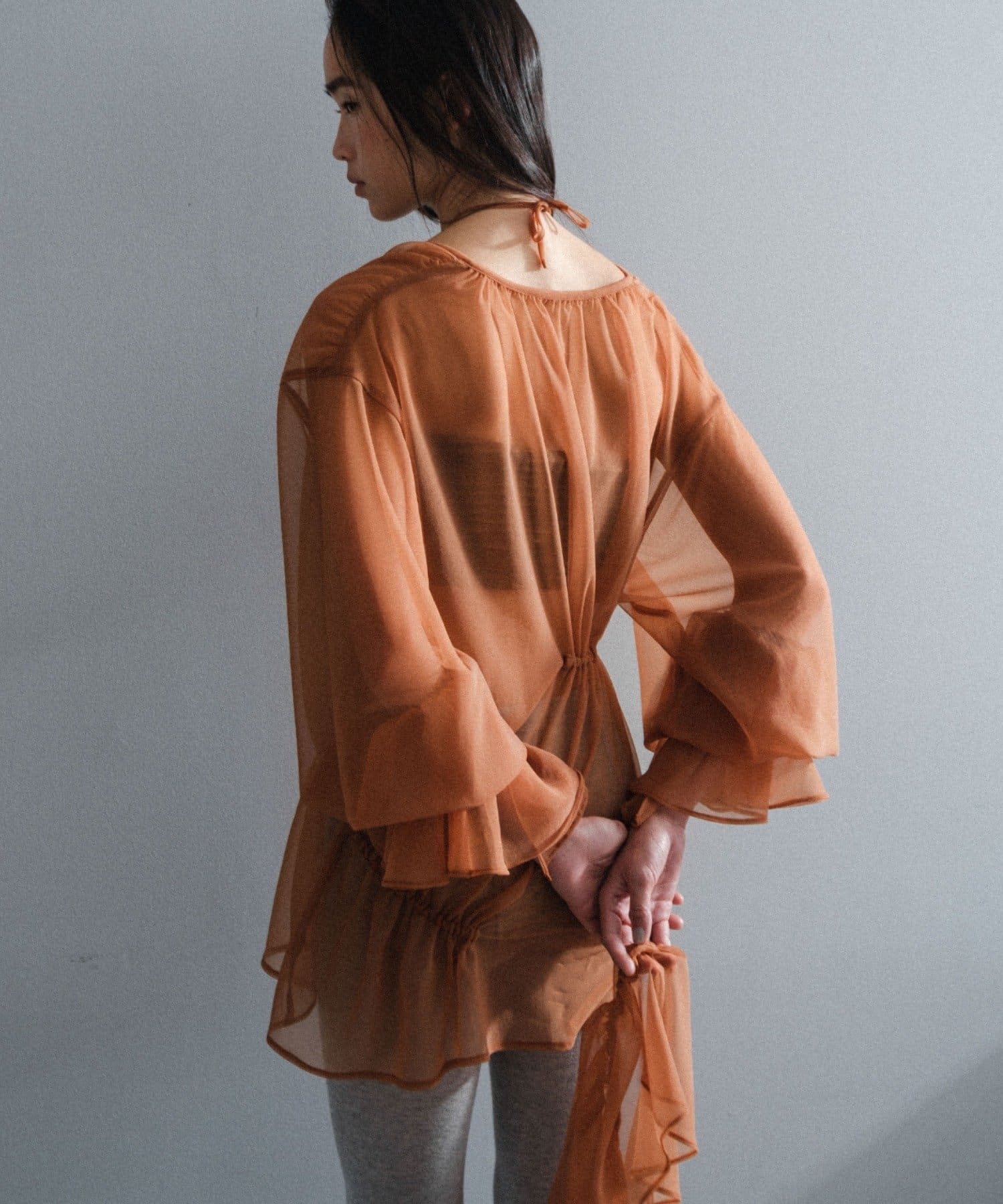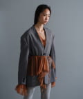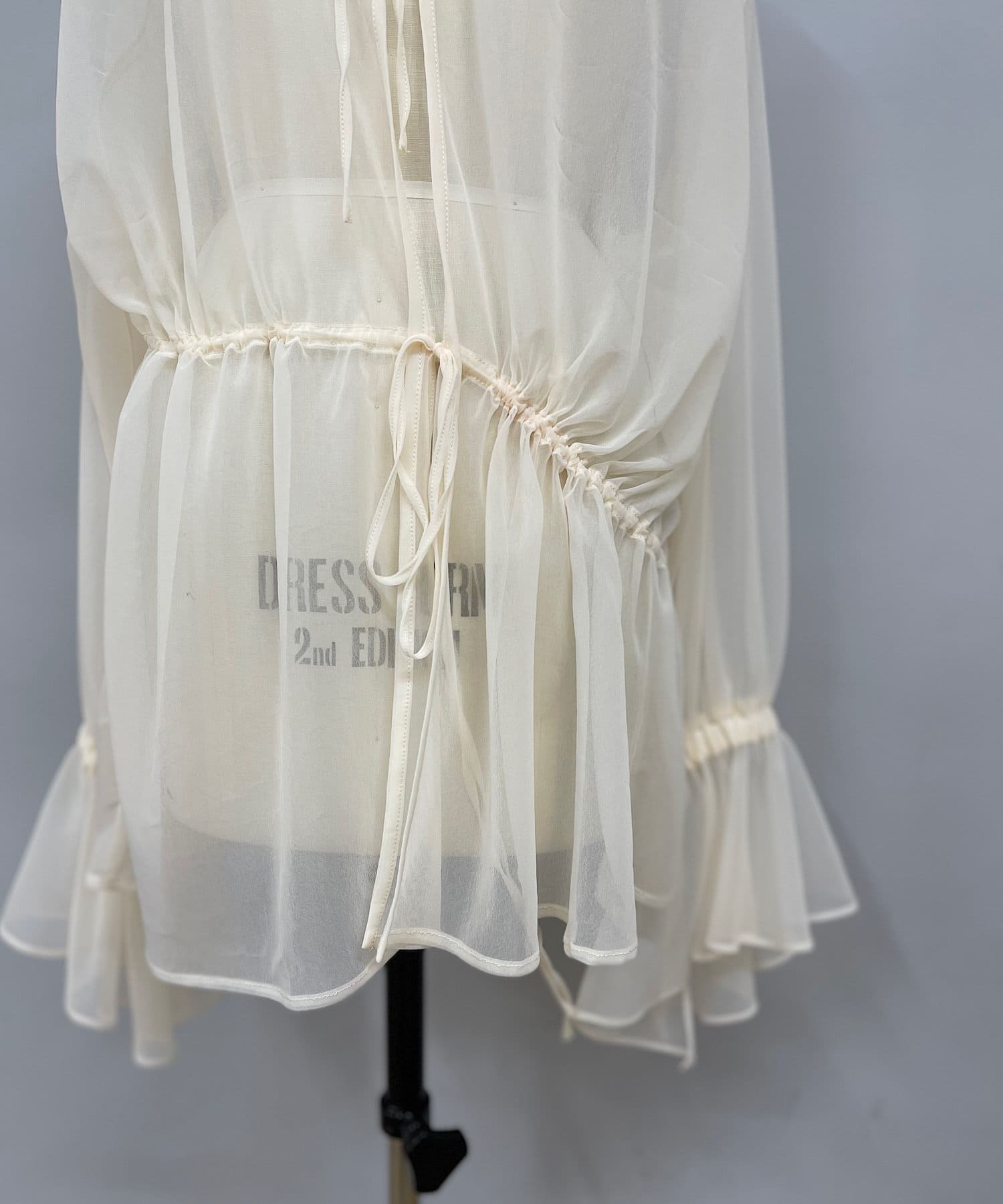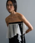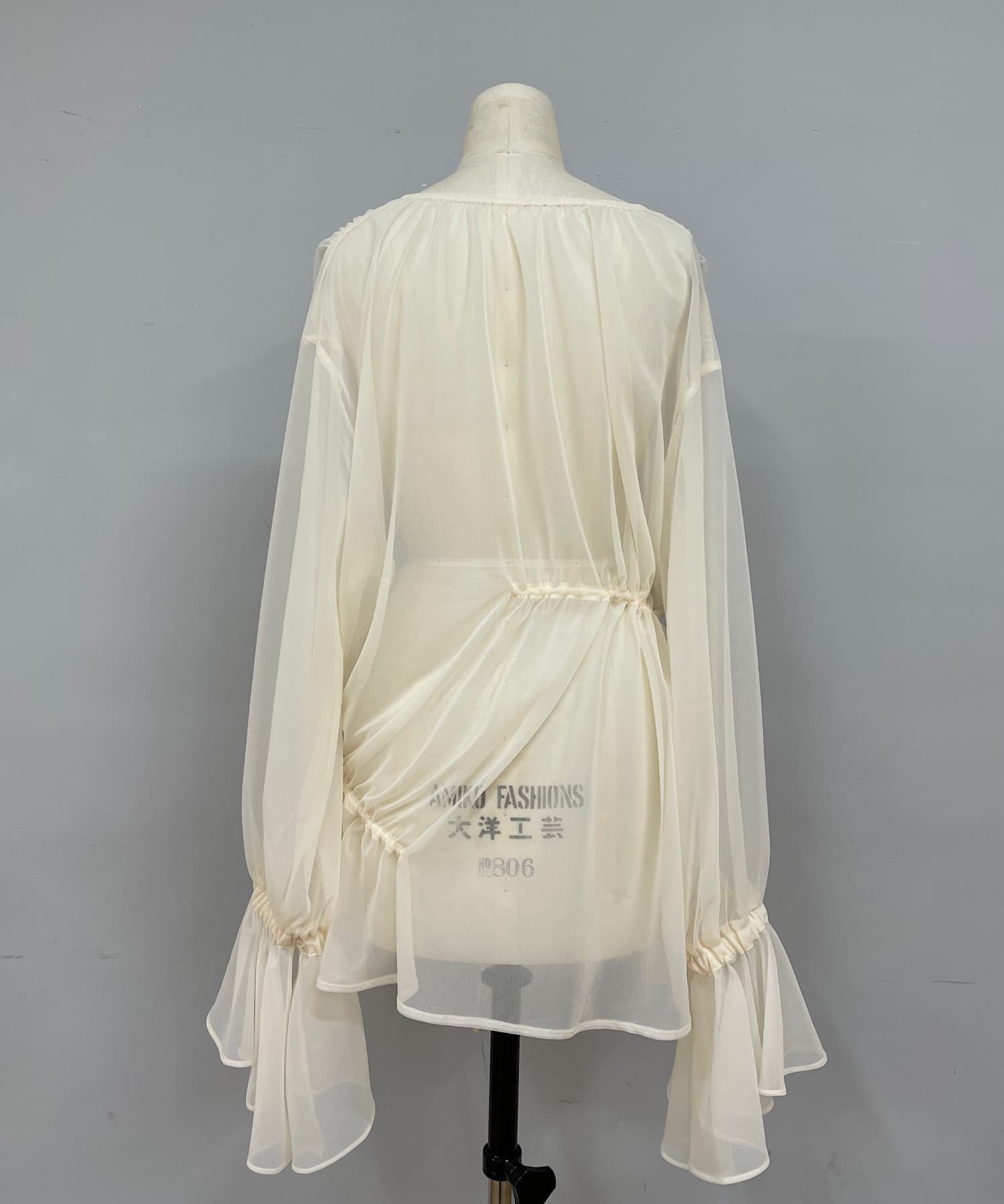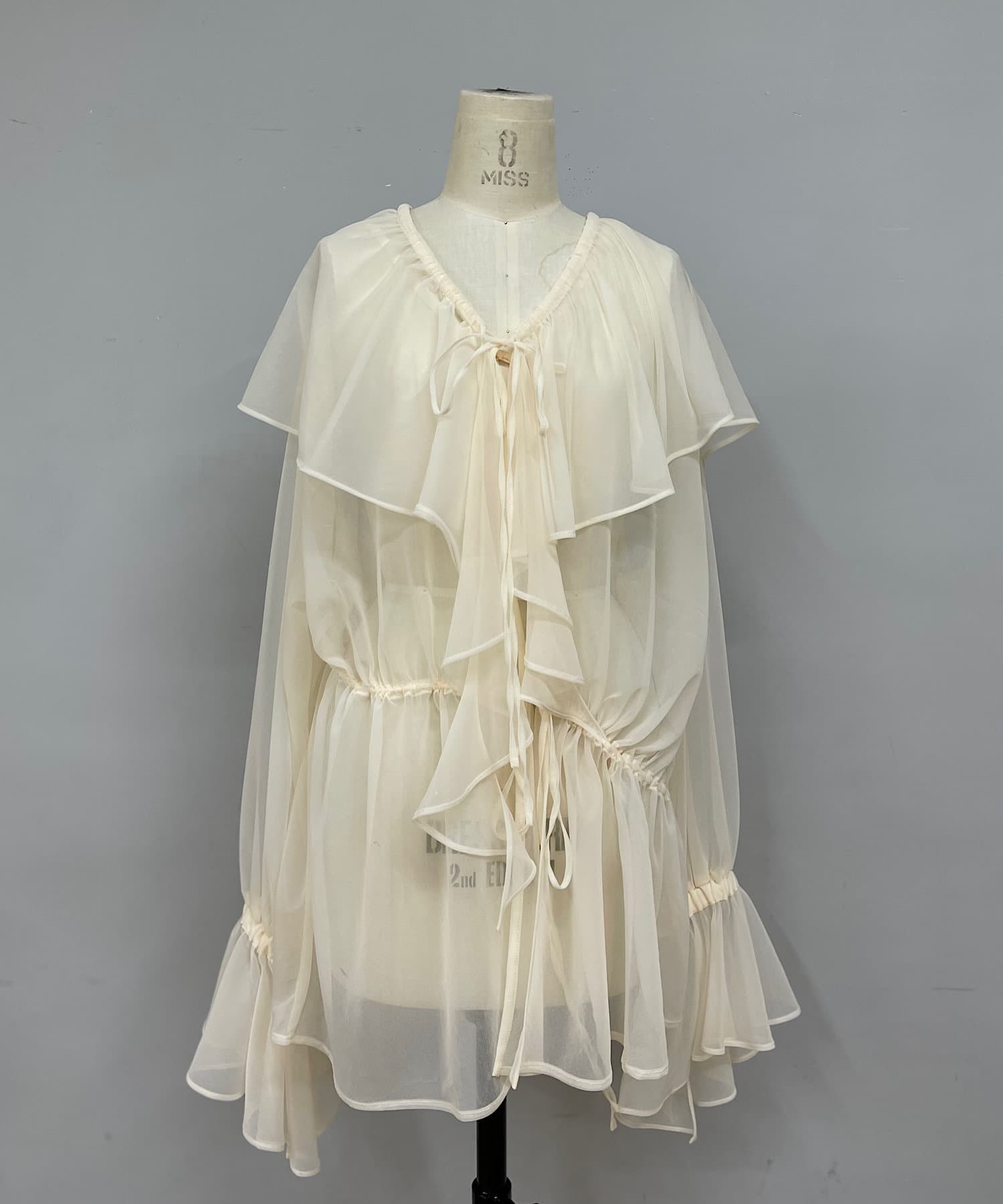 滑らかに落ちる生地の特性を活かして作ったカスケードフリルの付け襟は、首元はもちろん、腰回りやベアトップの胸回りにもワンポイントとして使えるマルチプレーヤー。紐でギャザー分量を調整して、好きな位置で巻いていただけます。ジャンプスーツやジャケットの上に斜め掛けにすると、シンプルなスタイリングが一気に華やかになり、オケージョンシーン等にもマルチに活躍しそうです。袖はアシンメトリーな形状のフレアーデザインになっており、真下でなく斜めに生地がひらひらと落ちる仕掛け。子供っぽくなりがちなフリルデザインですが、抜け感がでるように落ちた時のシルエットに拘って、細かくフリルの付き方や傾斜を設定しています。