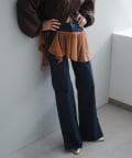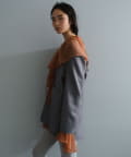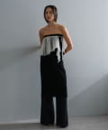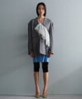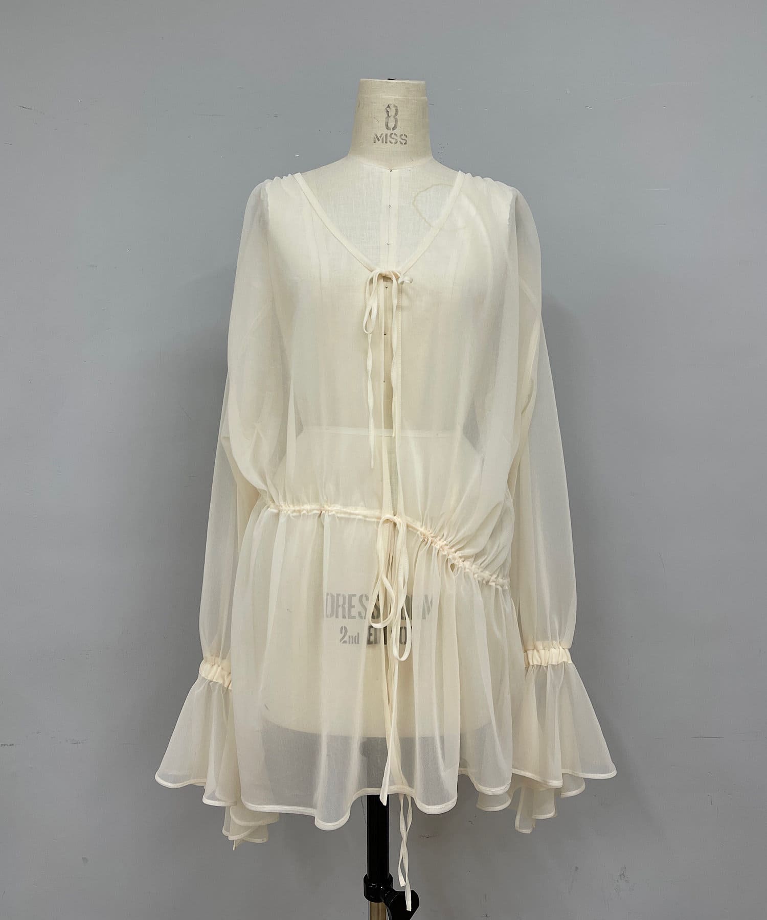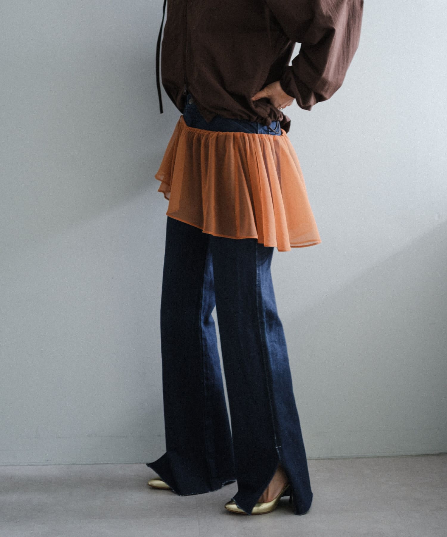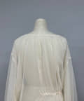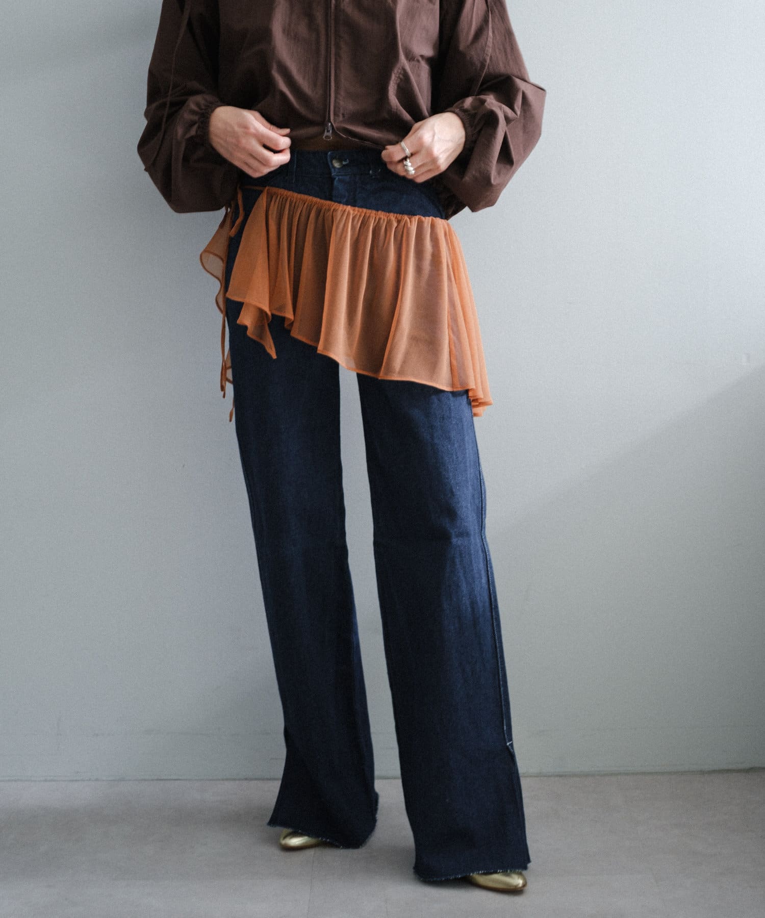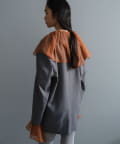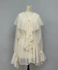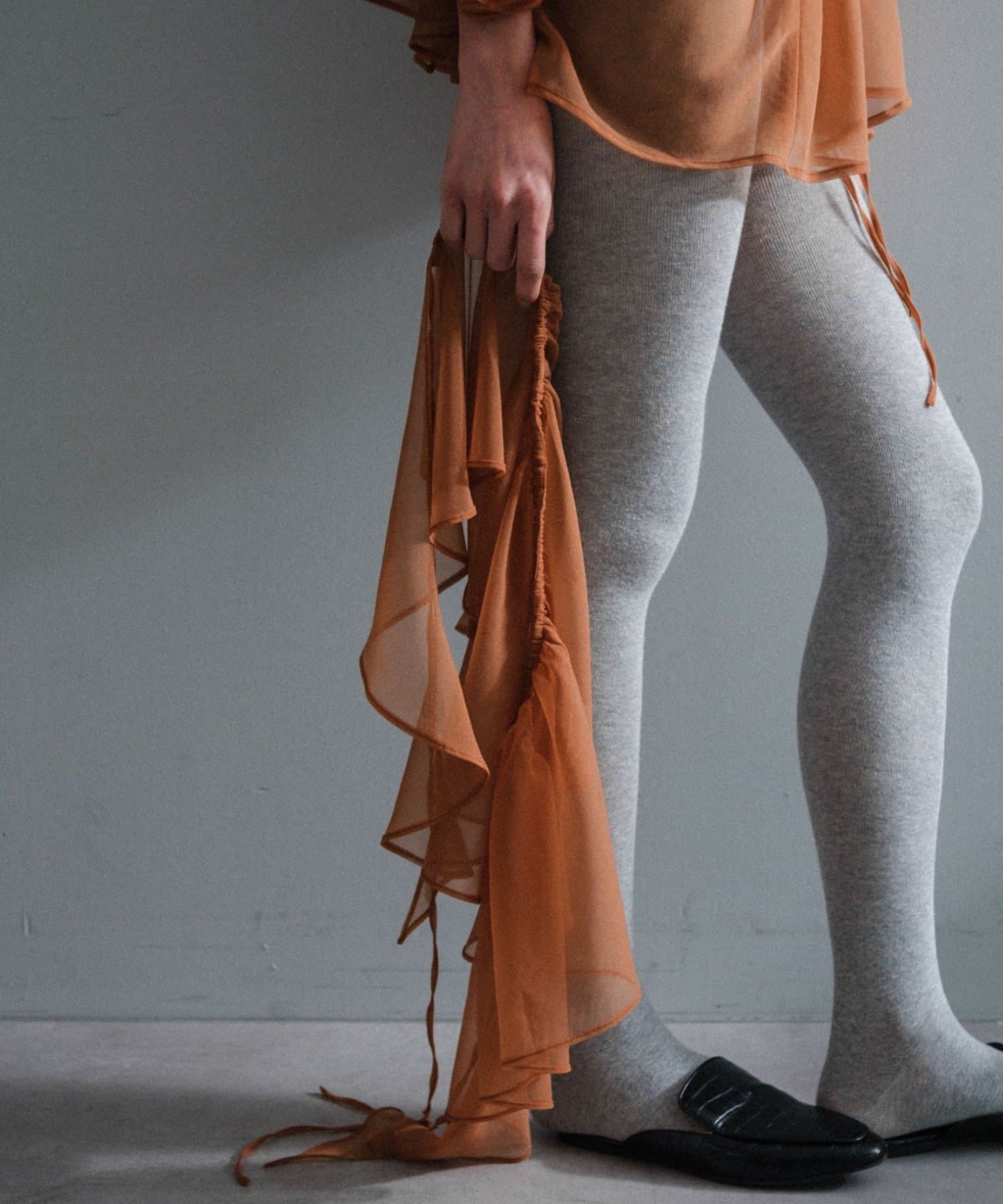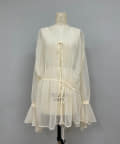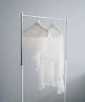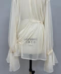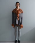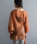 滑らかに落ちる生地の特性を活かして作ったカスケードフリルの付け襟は、首元はもちろん、腰回りやベアトップの胸回りにもワンポイントとして使えるマルチプレーヤー。紐でギャザー分量を調整して、好きな位置で巻いていただけます。ジャンプスーツやジャケットの上に斜め掛けにすると、シンプルなスタイリングが一気に華やかになり、オケージョンシーン等にもマルチに活躍しそうです。袖はアシンメトリーな形状のフレアーデザインになっており、真下でなく斜めに生地がひらひらと落ちる仕掛け。子供っぽくなりがちなフリルデザインですが、抜け感がでるように落ちた時のシルエットに拘って、細かくフリルの付き方や傾斜を設定しています。