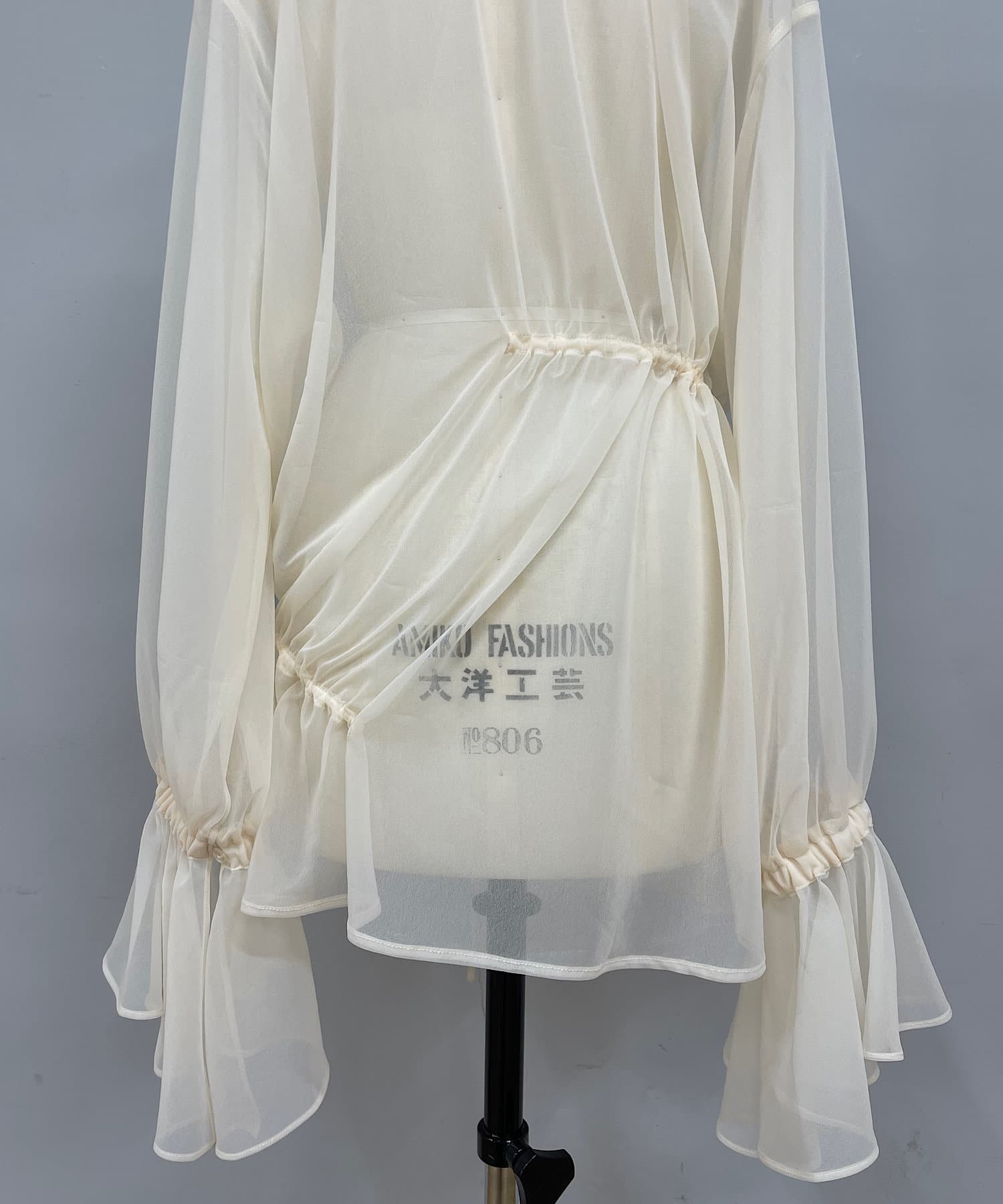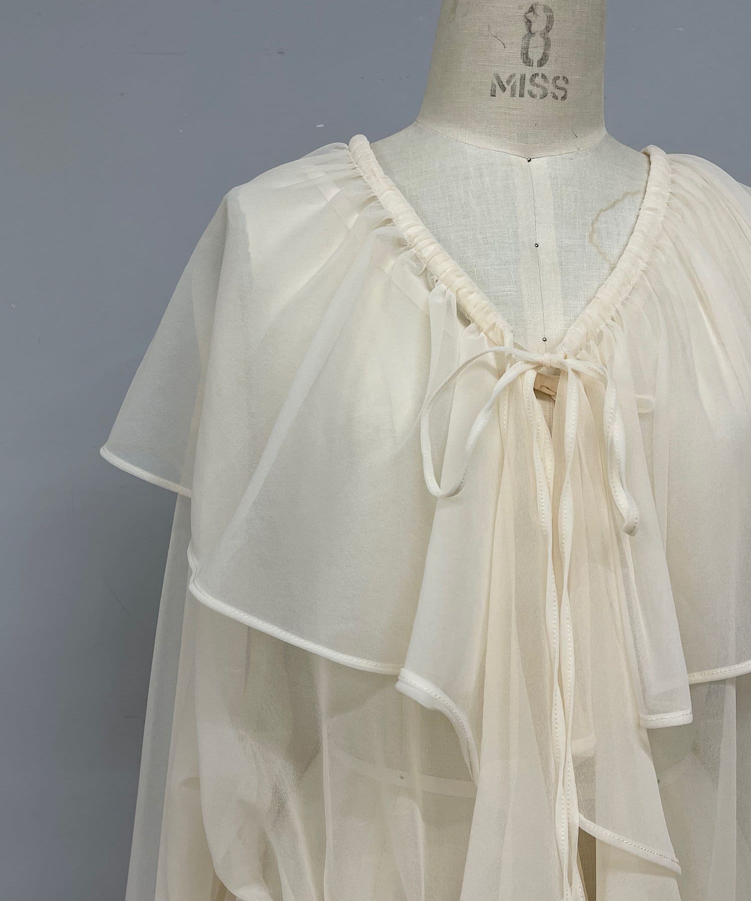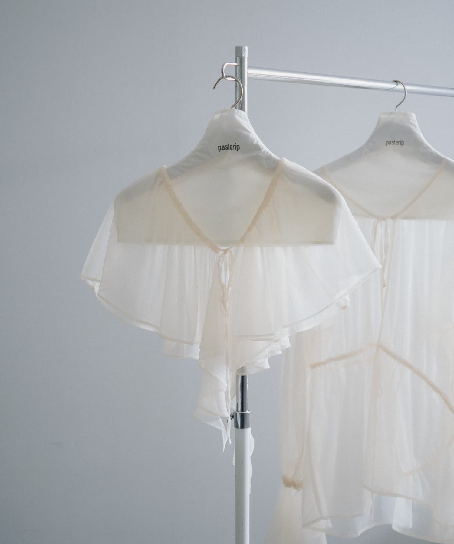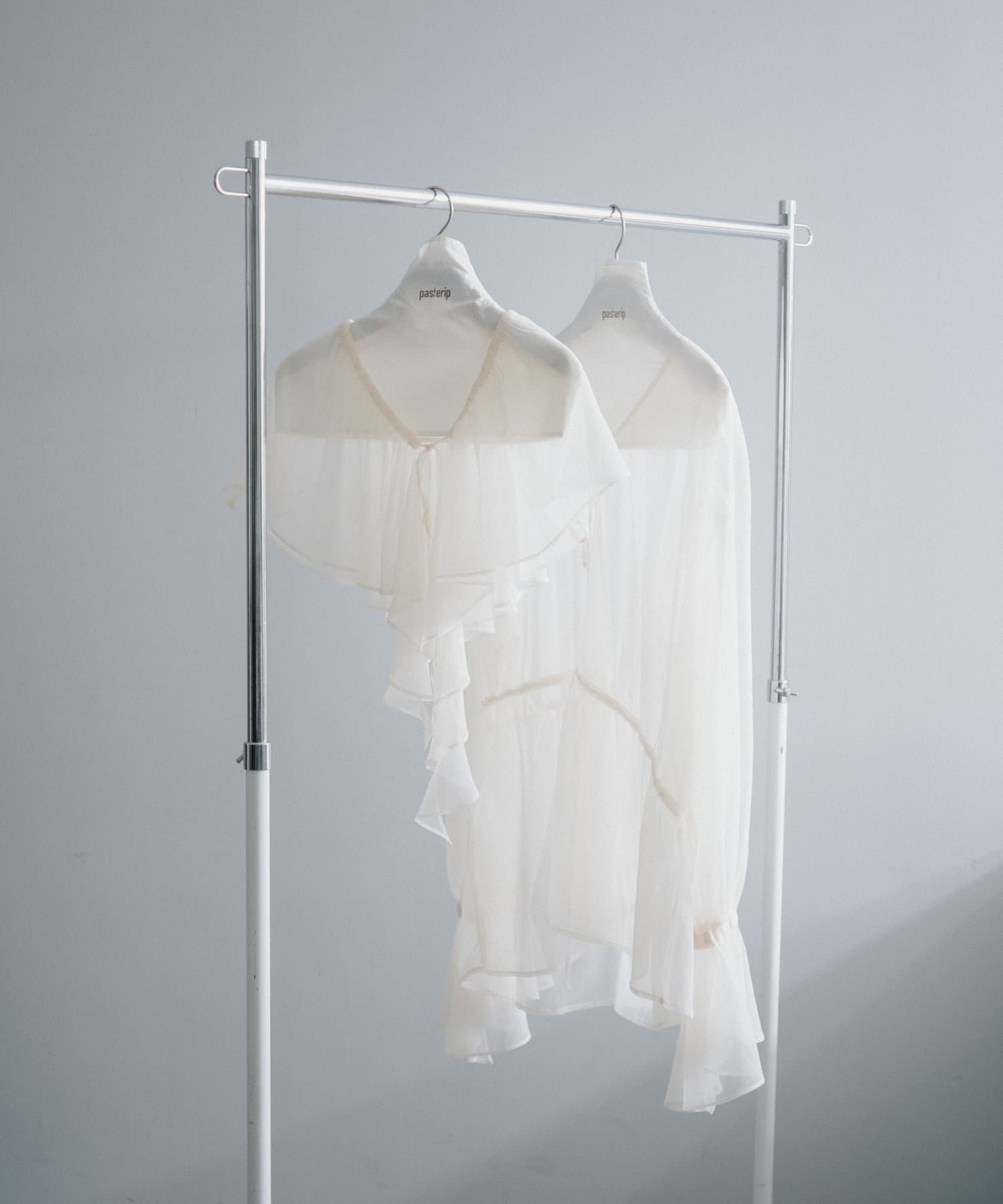 軽やかなシアークロスをふんだんに使って作ったスペシャルなブラウス。着脱可能なフリルの付け襟と、シャーリングギャザーをたっぷりと寄せたデザインブラウスがセットになった、Pasteripの今年一番の贅沢な主役級アイテムです。