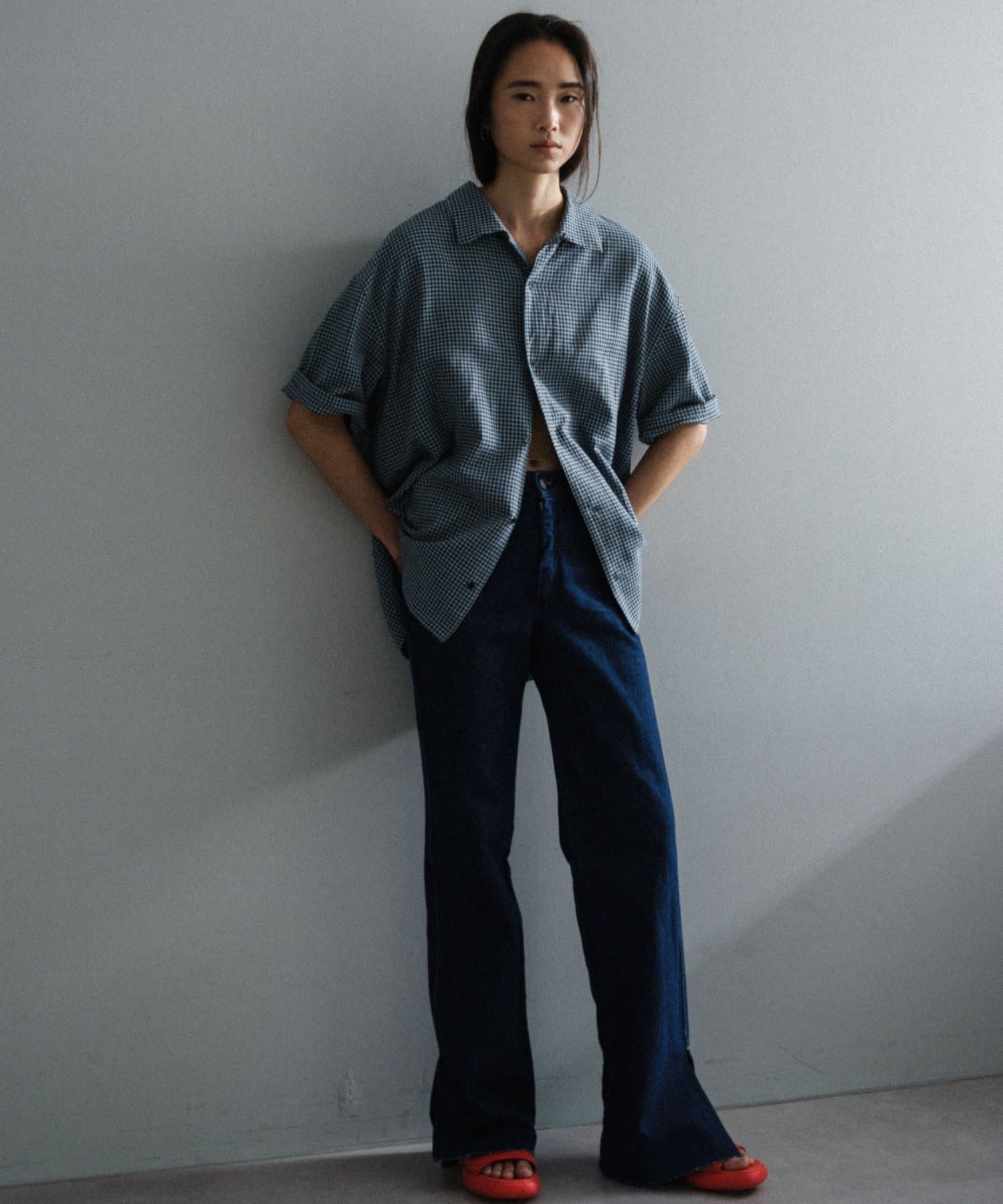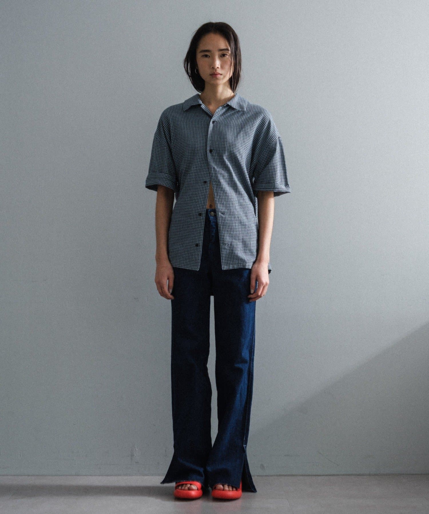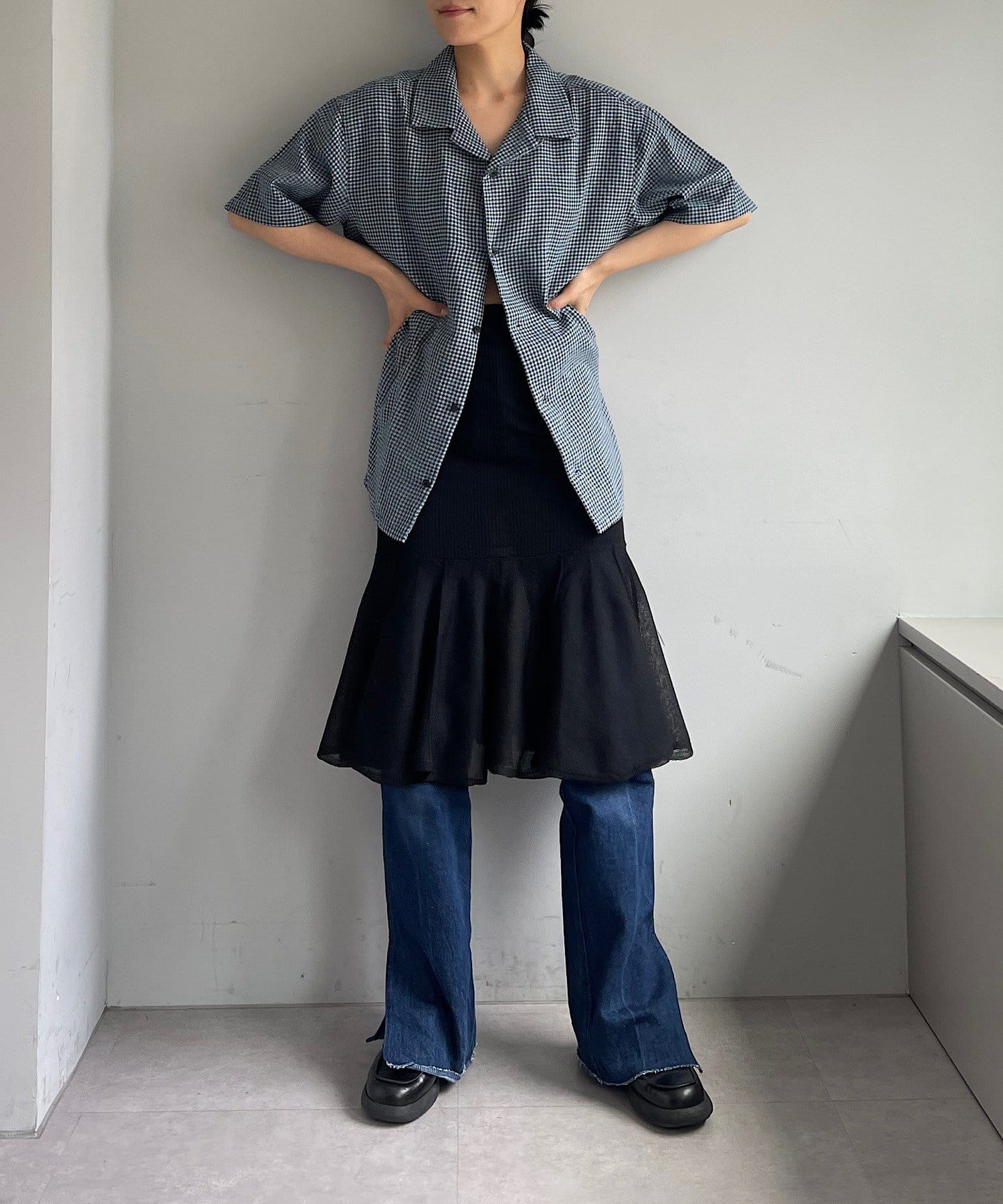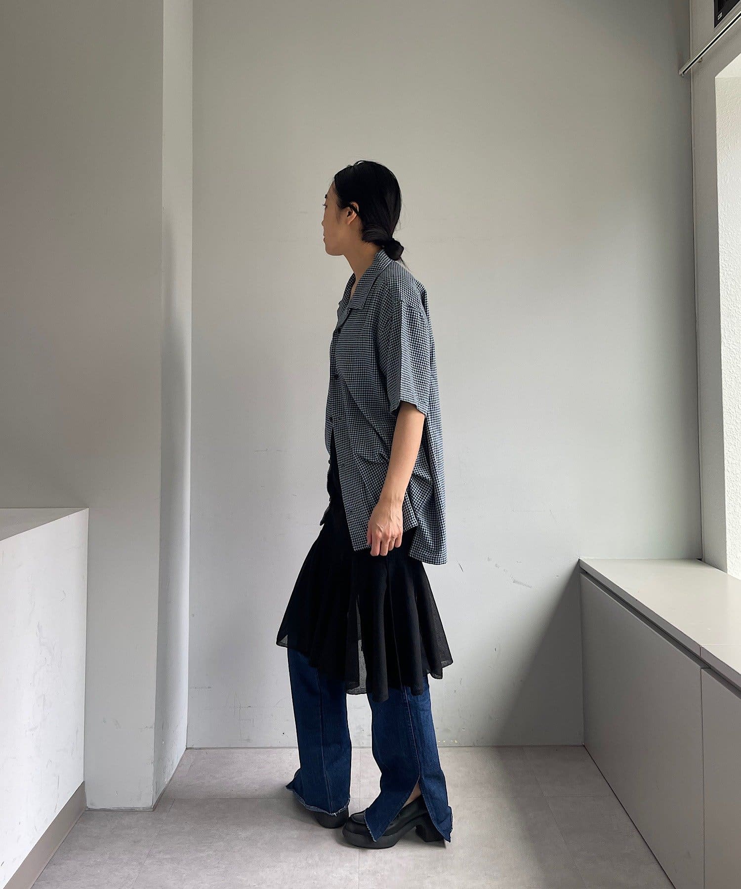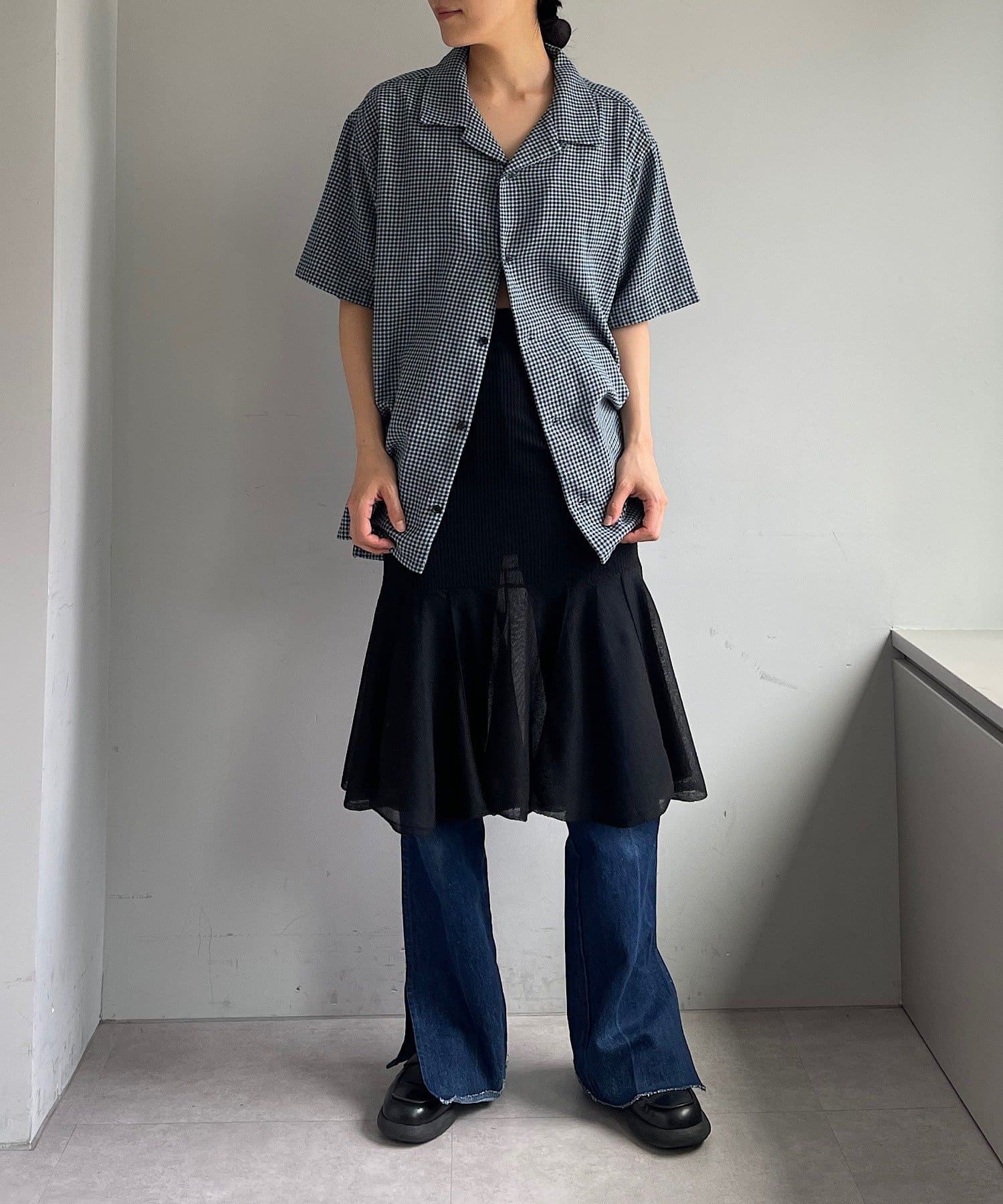 一枚着で着るのも良し、ジャケットの中に着て襟を出したり、夏場は羽織としてラフに着用するのもおすすめです。モードなアイテムとの相性がバランス的には良いので、スラックスやスカートなどとのコーディネートに活躍しそうです。