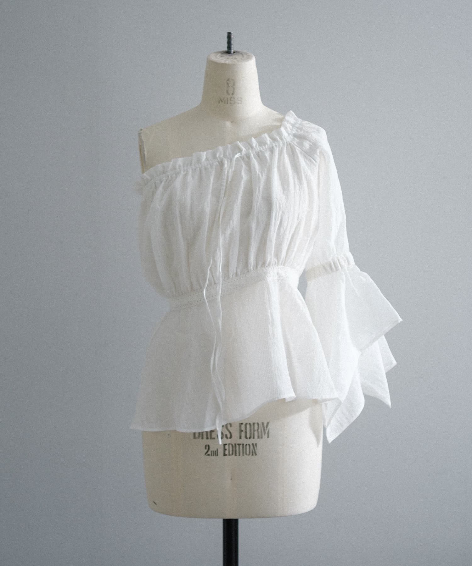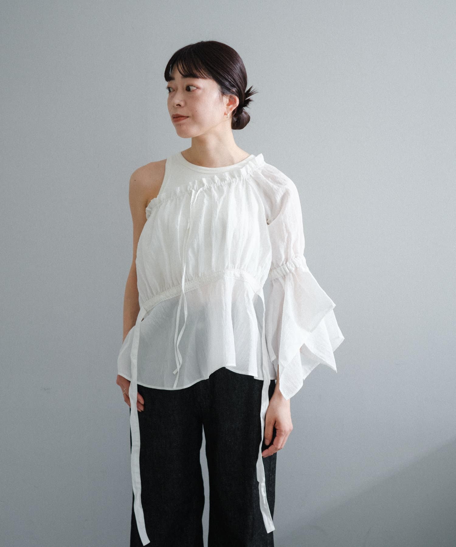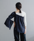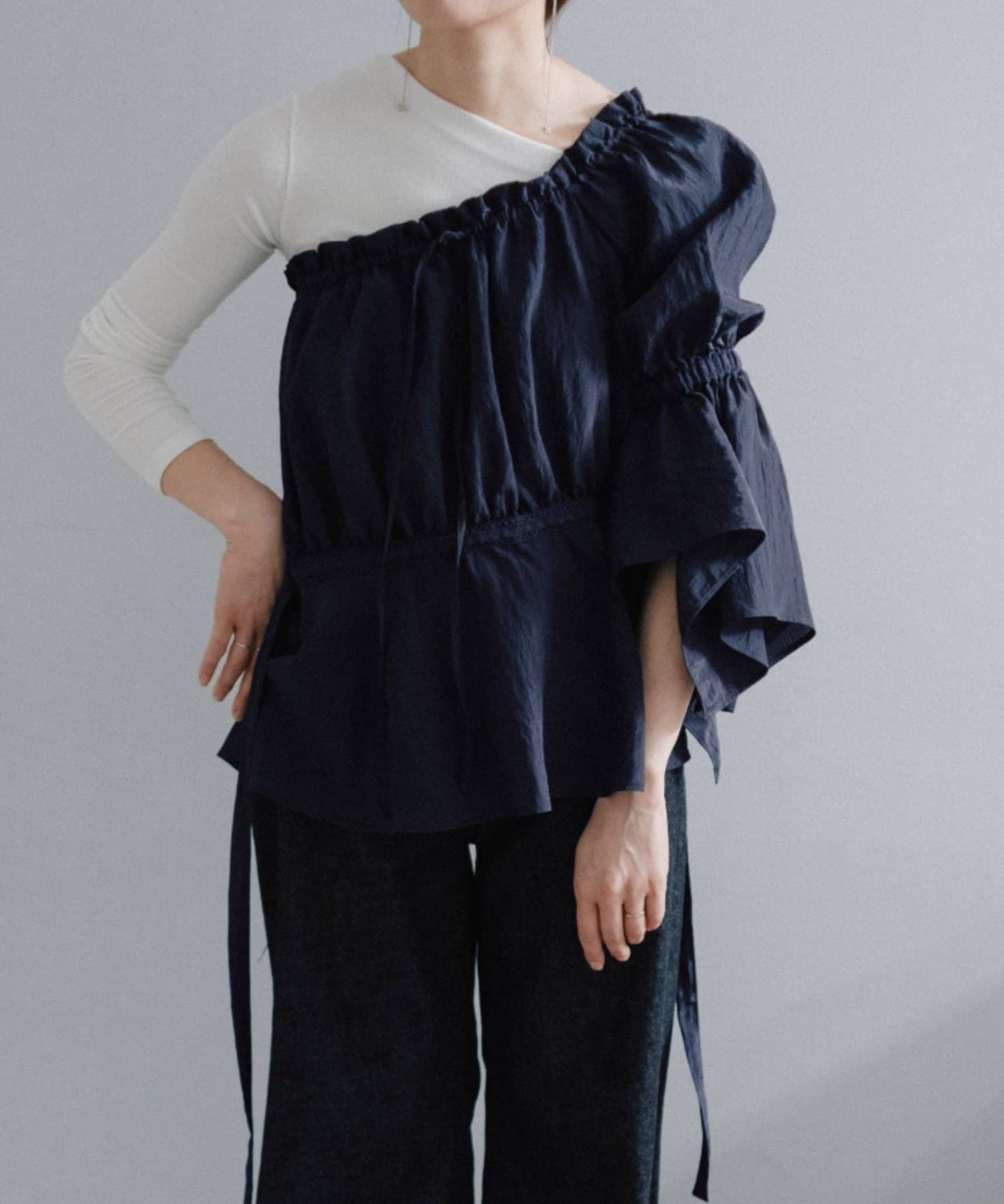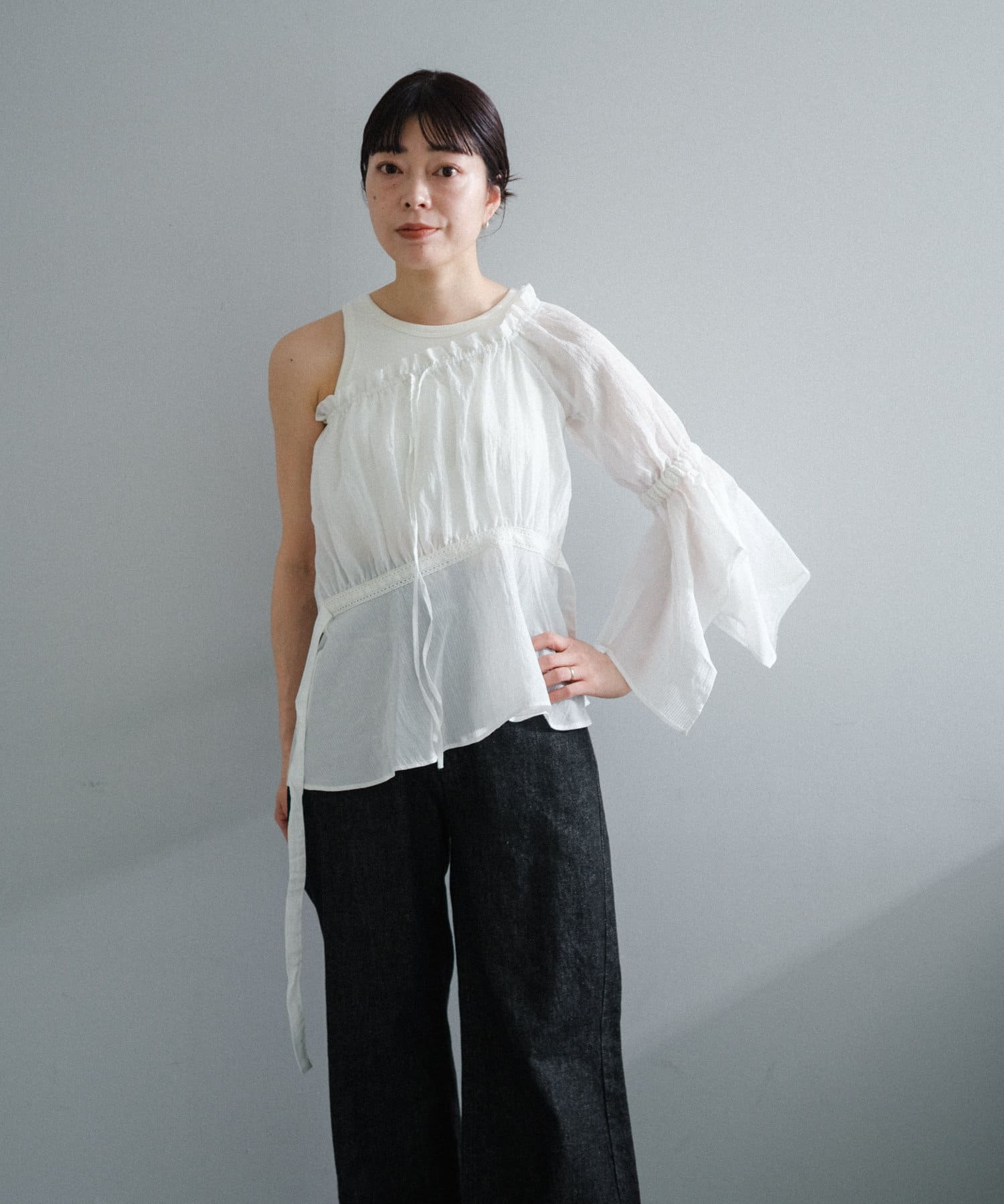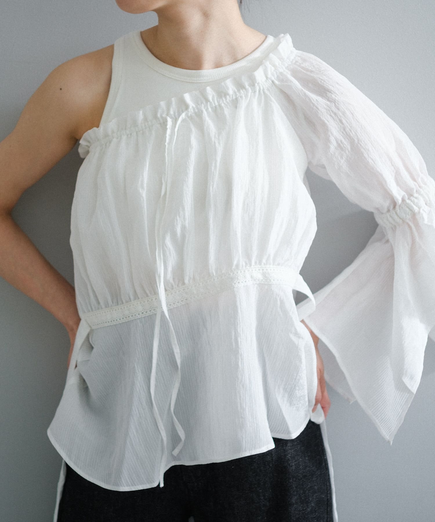 スクエアブラウスの片腕を抜いてワンショルダーに着用した時のデザインをそのまま活かし、裾が斜めに落ちるように設計しています。ウエスト部分と袖にはレーステープをたたき付けており、今年らしくロマンティックなエッセンスをプラスしました。