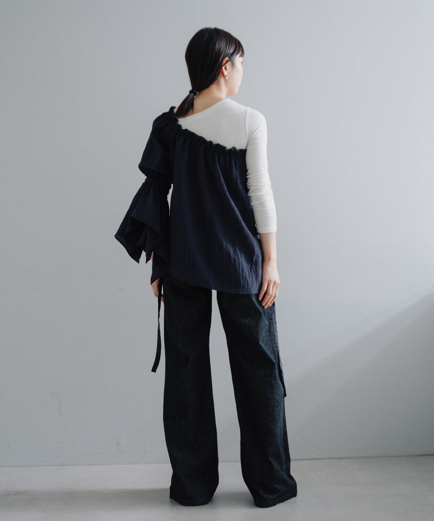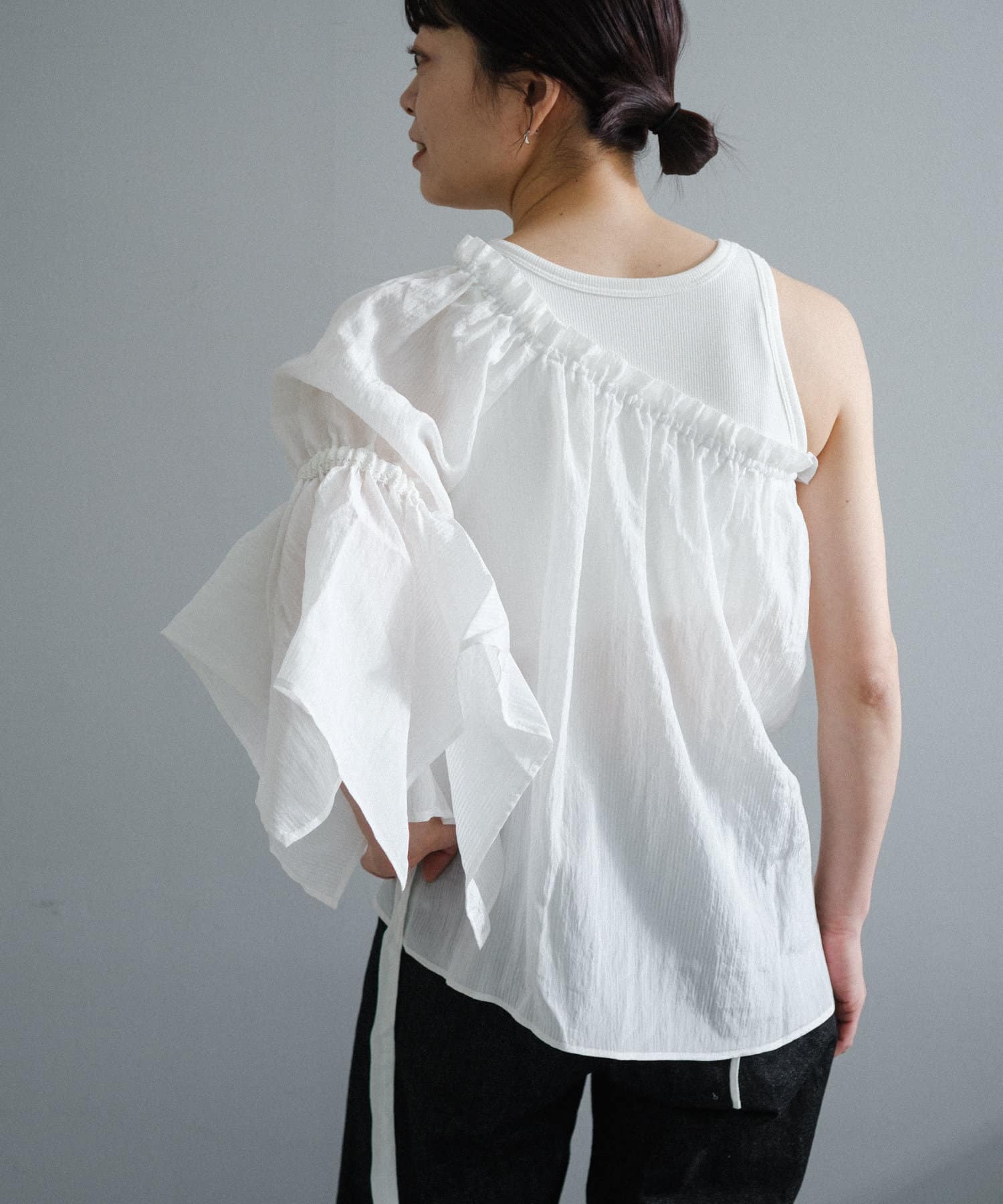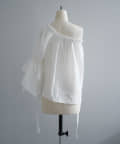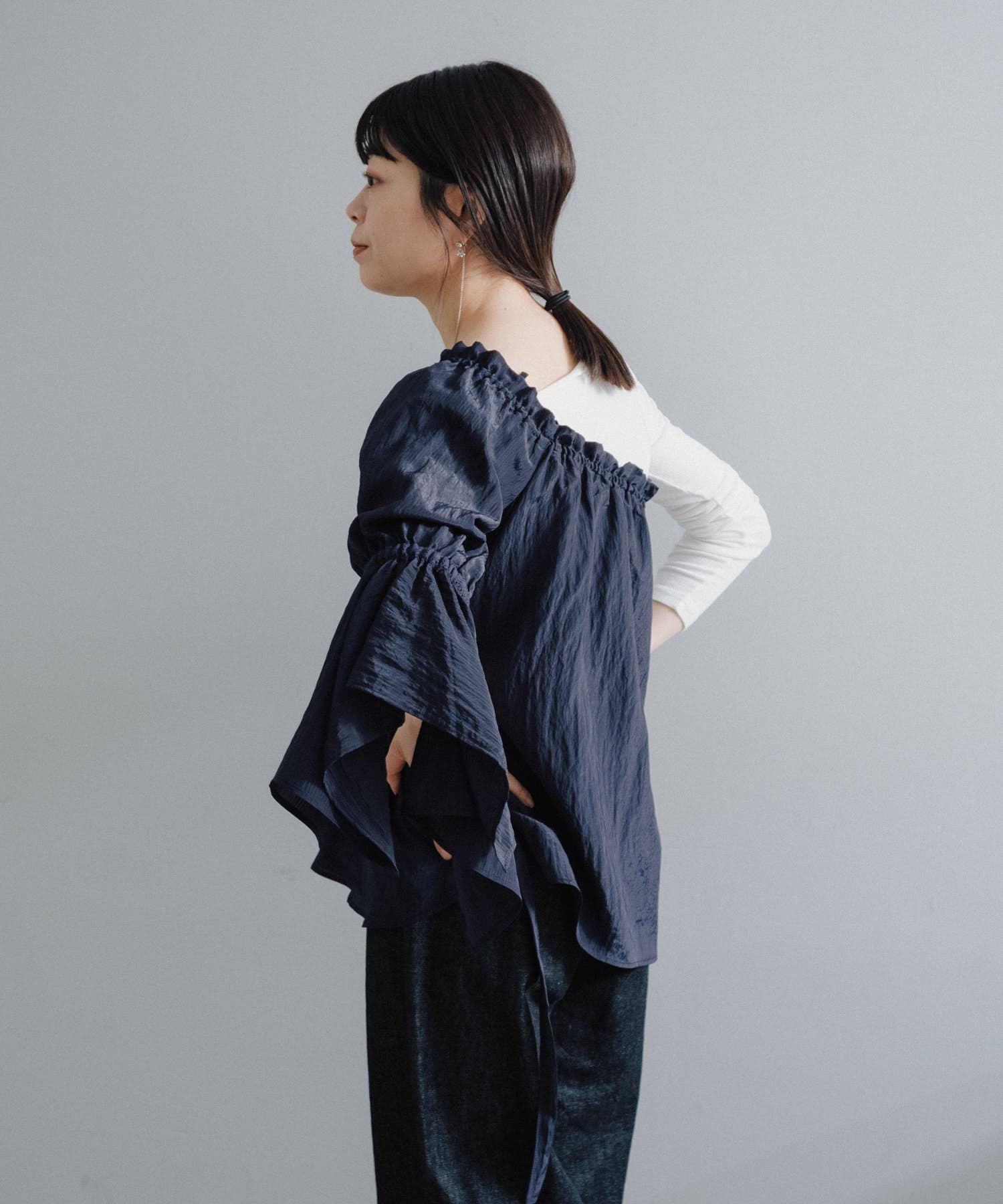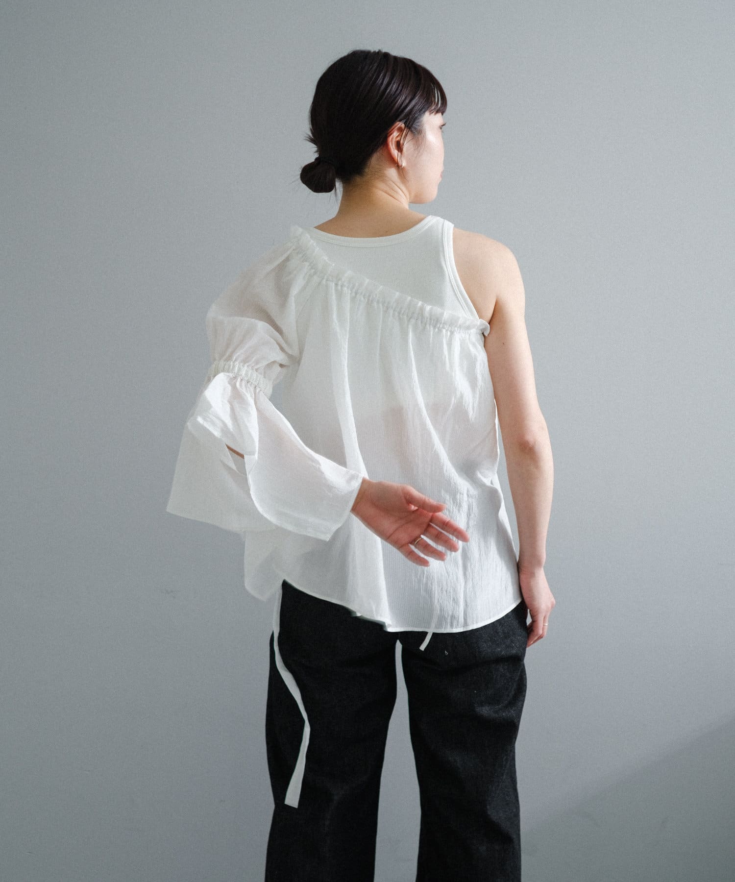 スクエアブラウスの片腕を抜いてワンショルダーに着用した時のデザインをそのまま活かし、裾が斜めに落ちるように設計しています。ウエスト部分と袖にはレーステープをたたき付けており、今年らしくロマンティックなエッセンスをプラスしました。