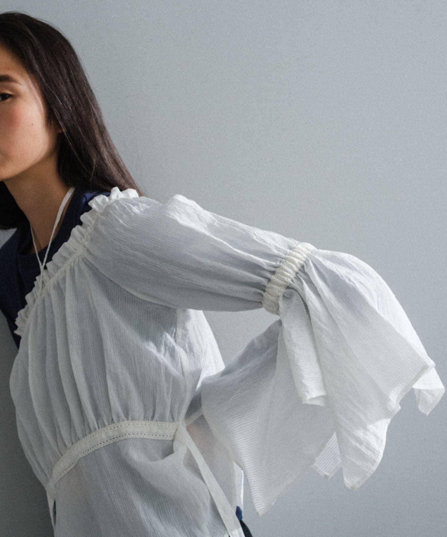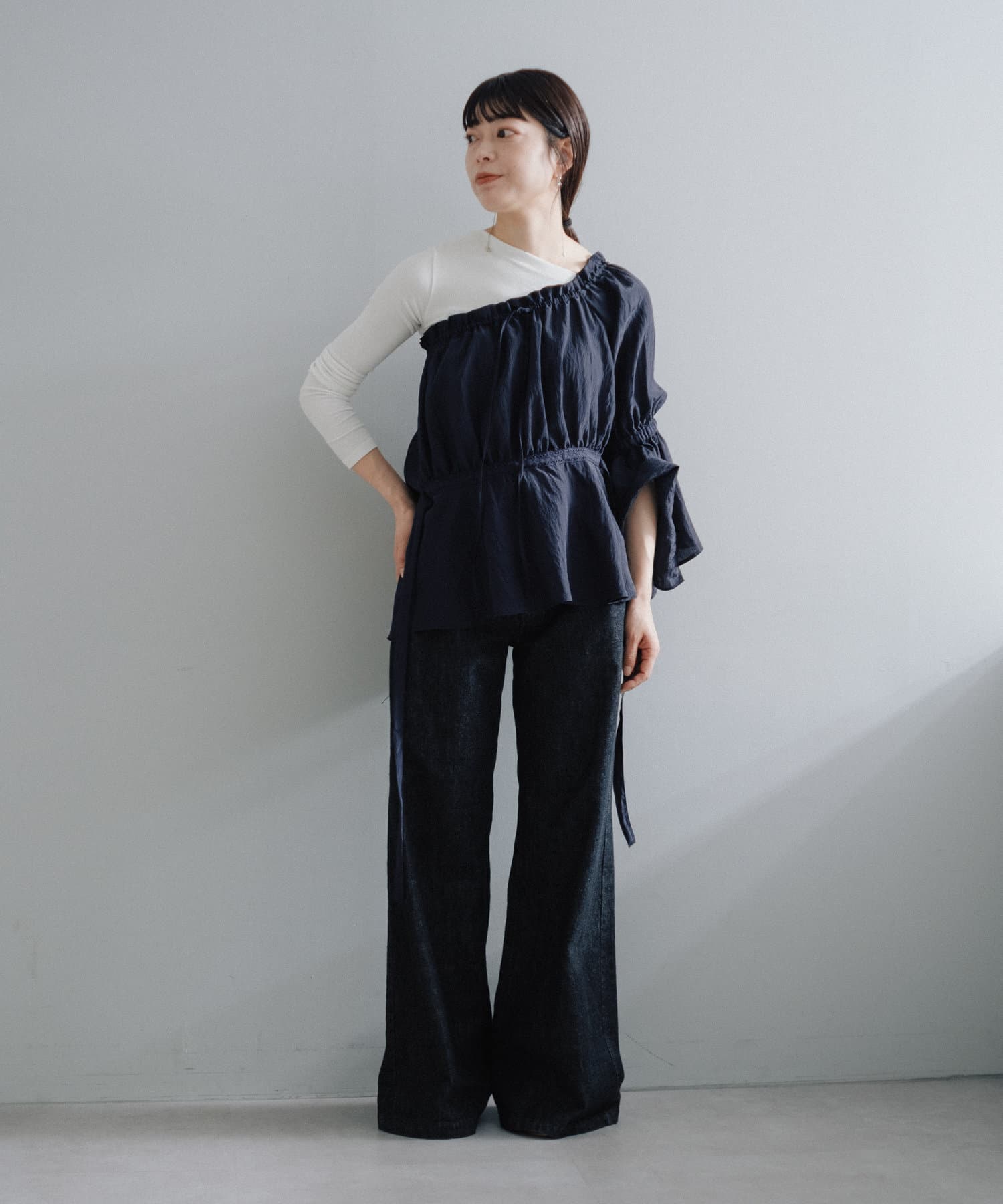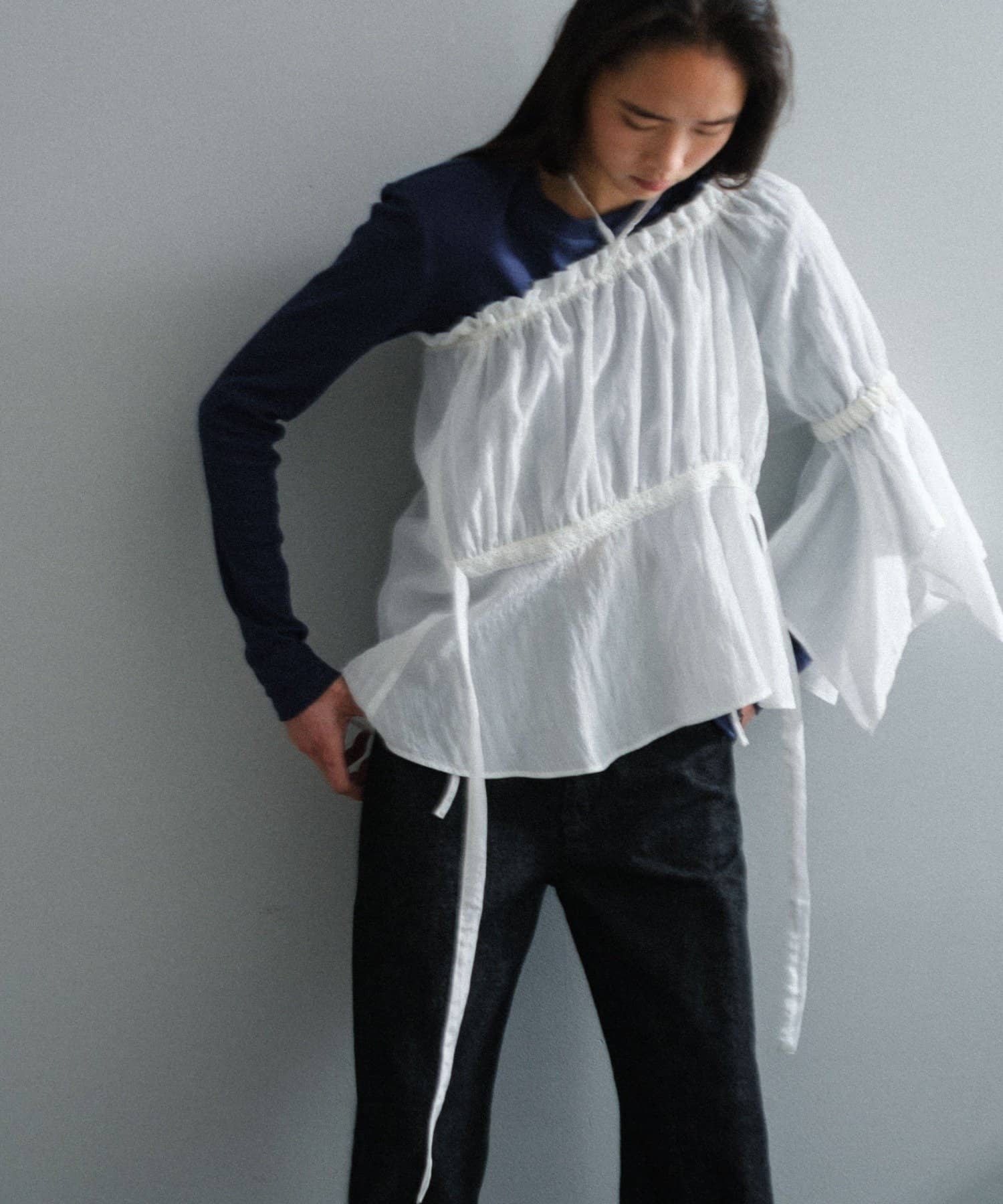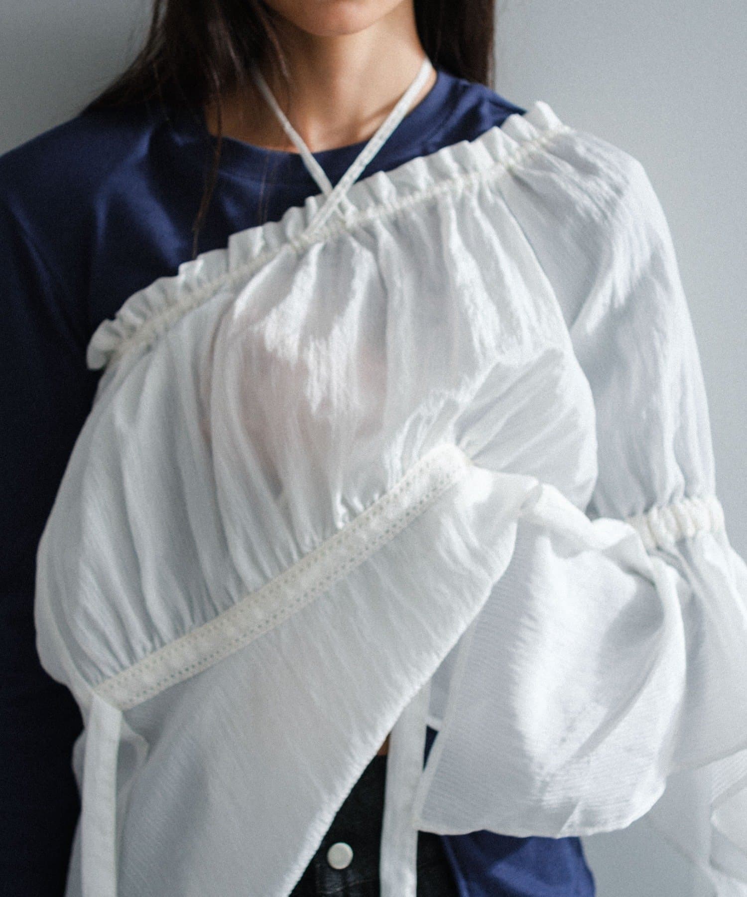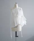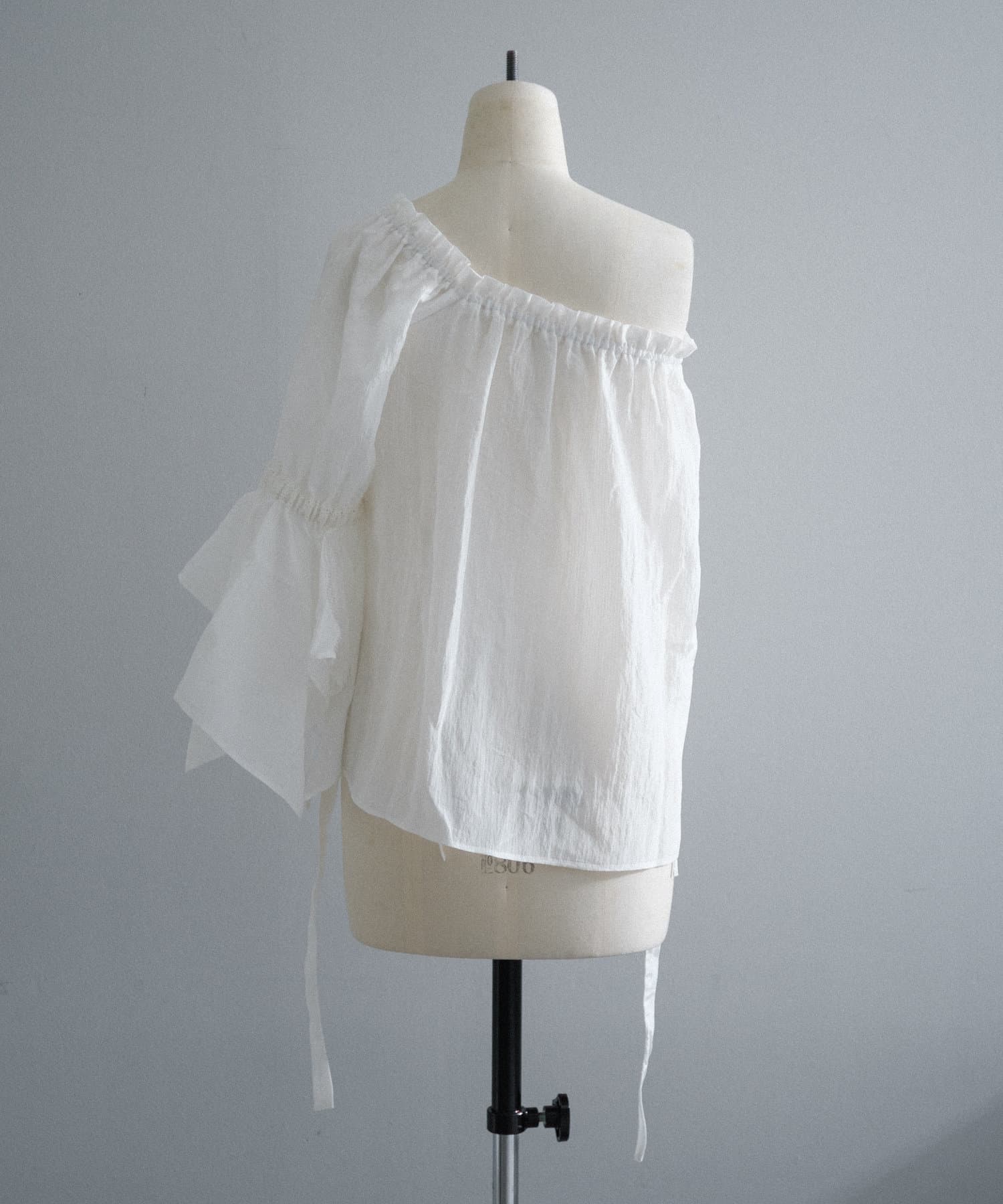 スクエアブラウスの片腕を抜いてワンショルダーに着用した時のデザインをそのまま活かし、裾が斜めに落ちるように設計しています。ウエスト部分と袖にはレーステープをたたき付けており、今年らしくロマンティックなエッセンスをプラスしました。