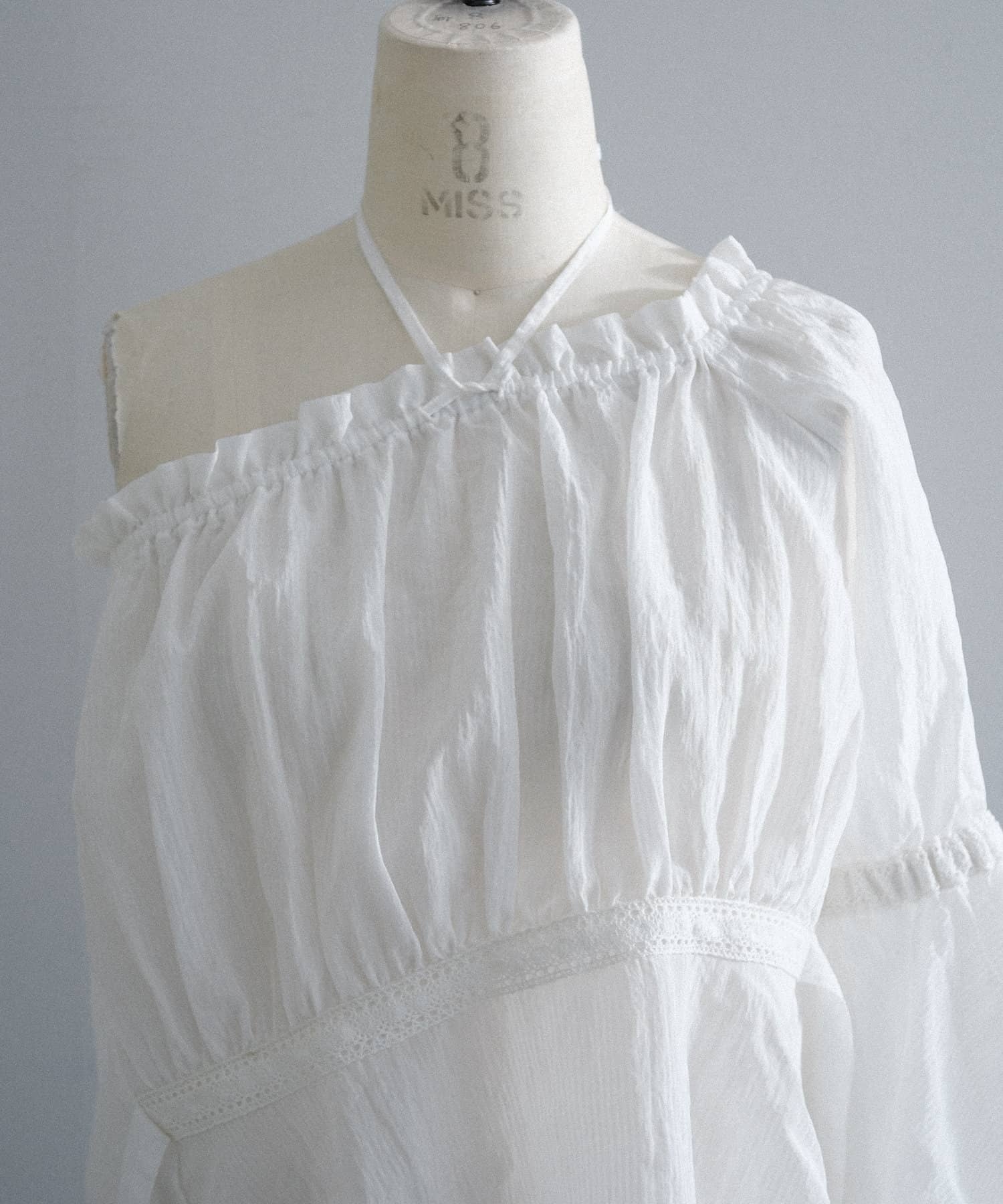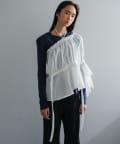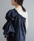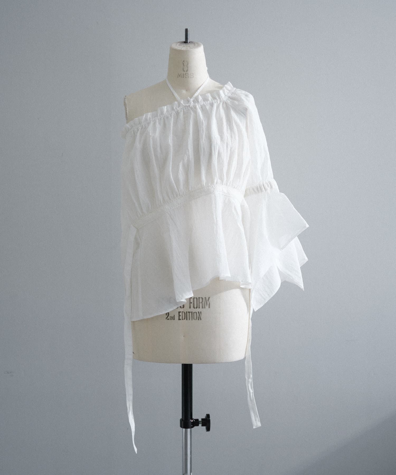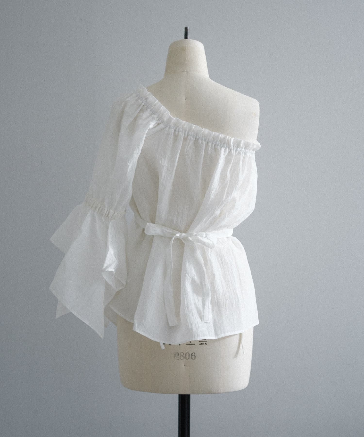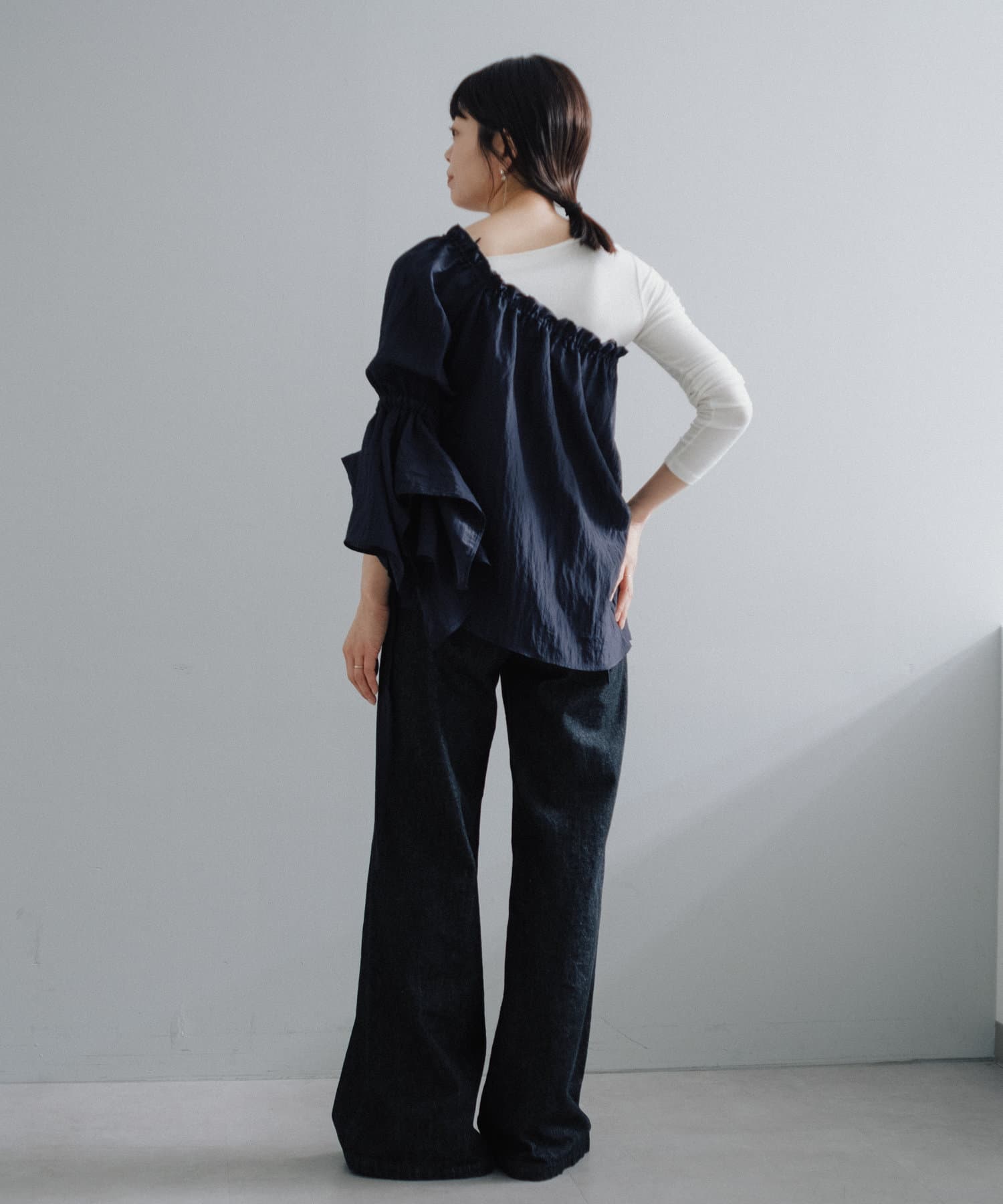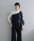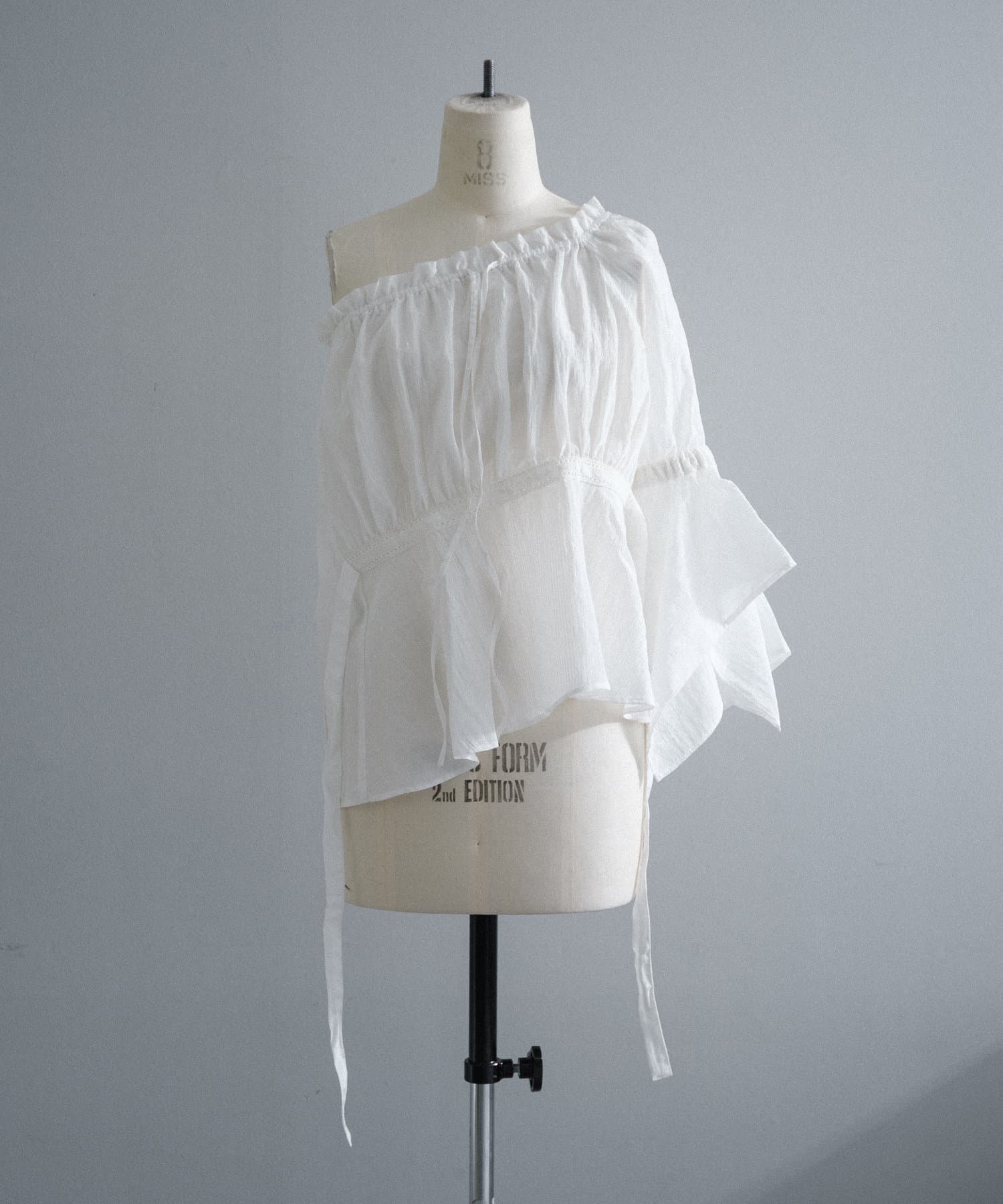スクエアブラウスの片腕を抜いてワンショルダーに着用した時のデザインをそのまま活かし、裾が斜めに落ちるように設計しています。ウエスト部分と袖にはレーステープをたたき付けており、今年らしくロマンティックなエッセンスをプラスしました。