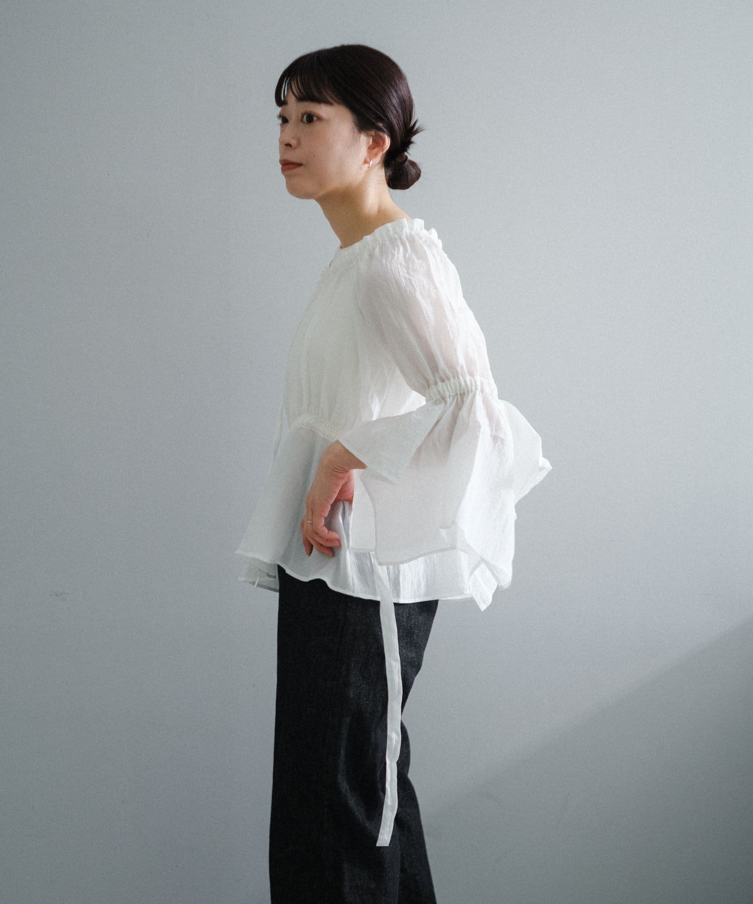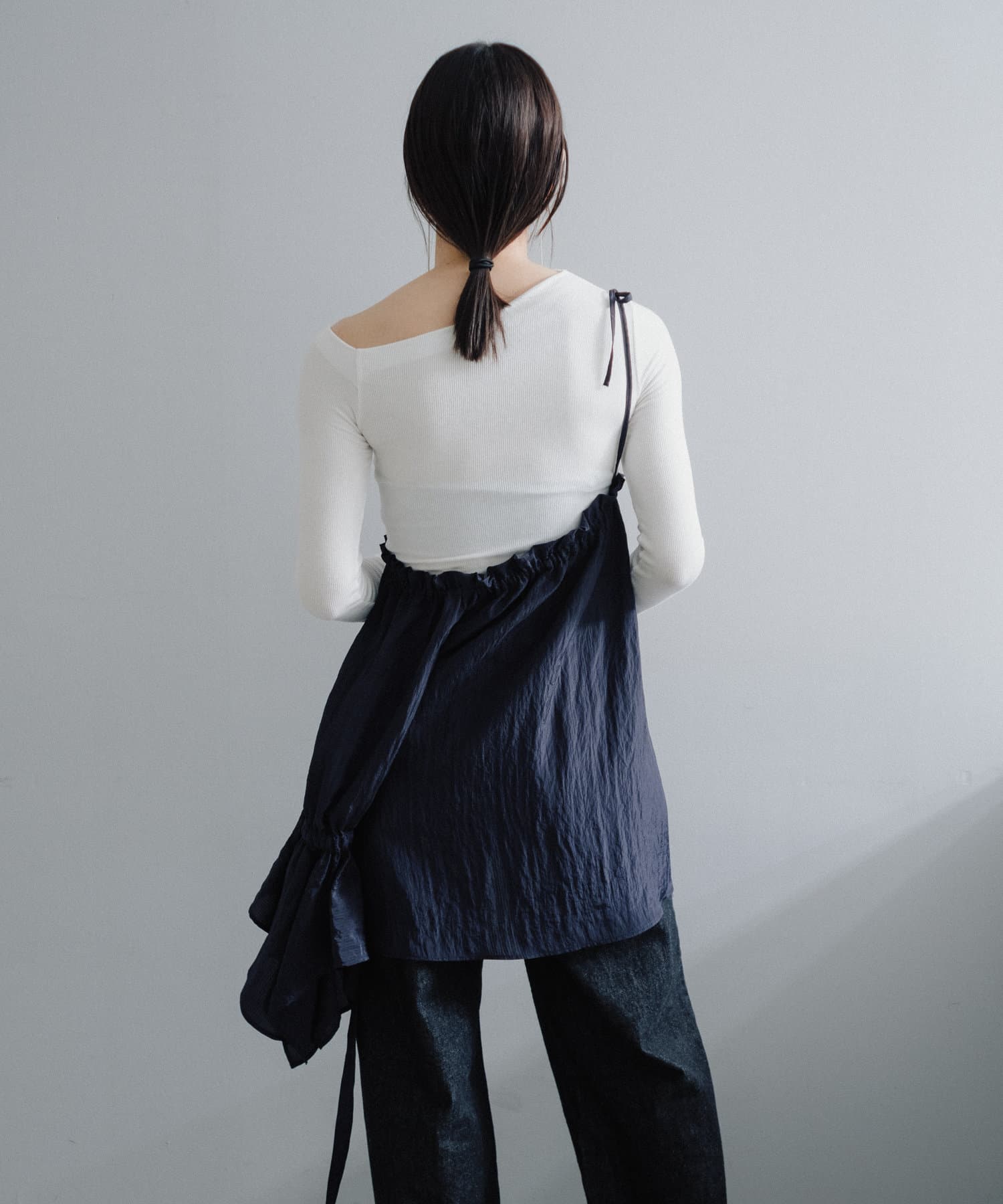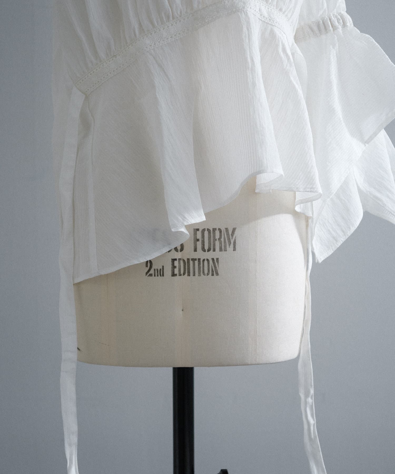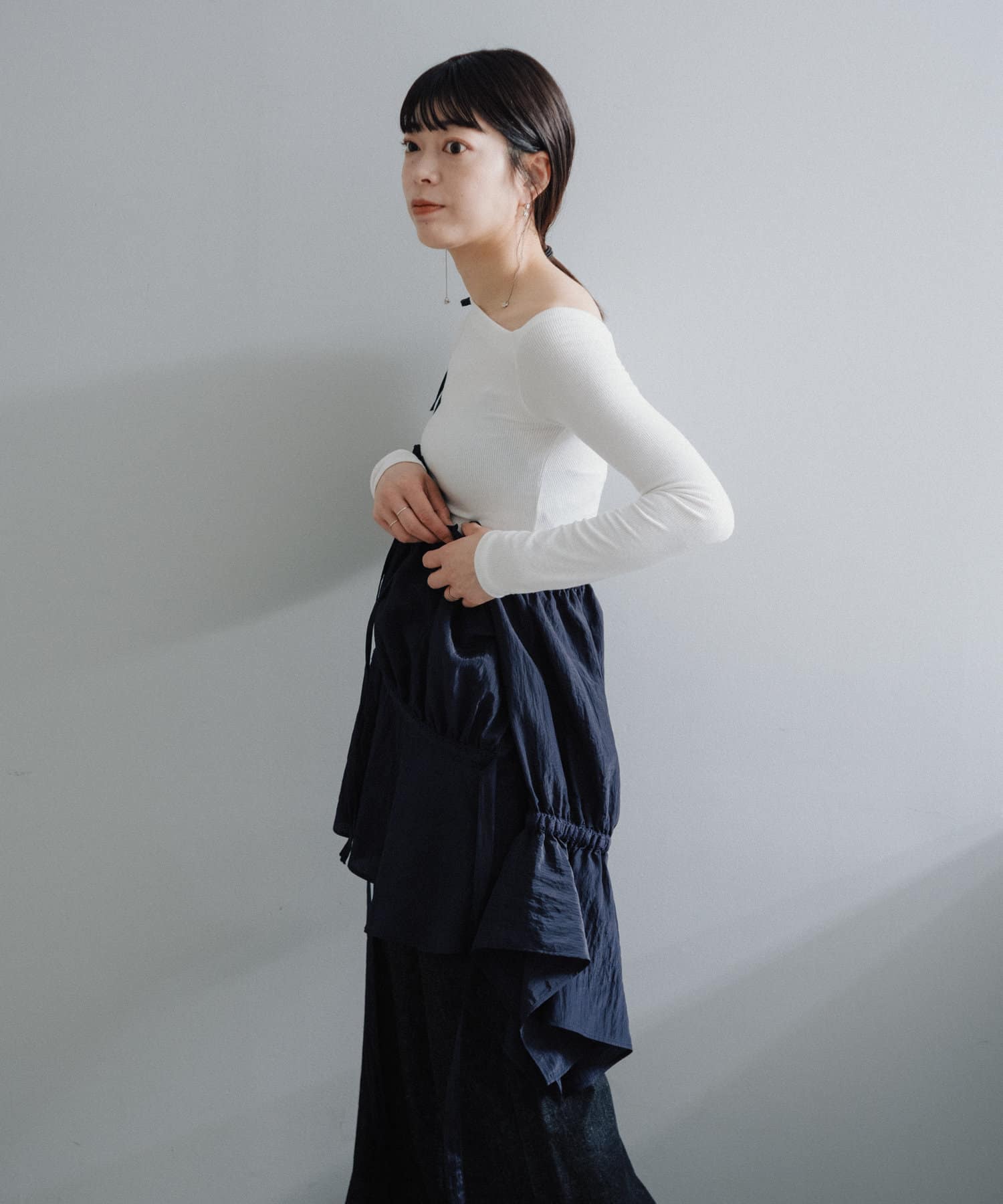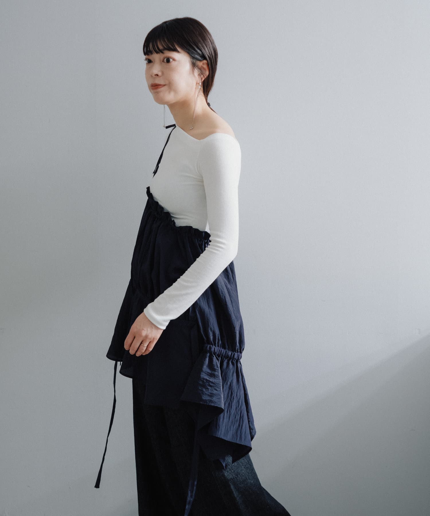 スクエアブラウスの片腕を抜いてワンショルダーに着用した時のデザインをそのまま活かし、裾が斜めに落ちるように設計しています。ウエスト部分と袖にはレーステープをたたき付けており、今年らしくロマンティックなエッセンスをプラスしました。