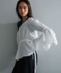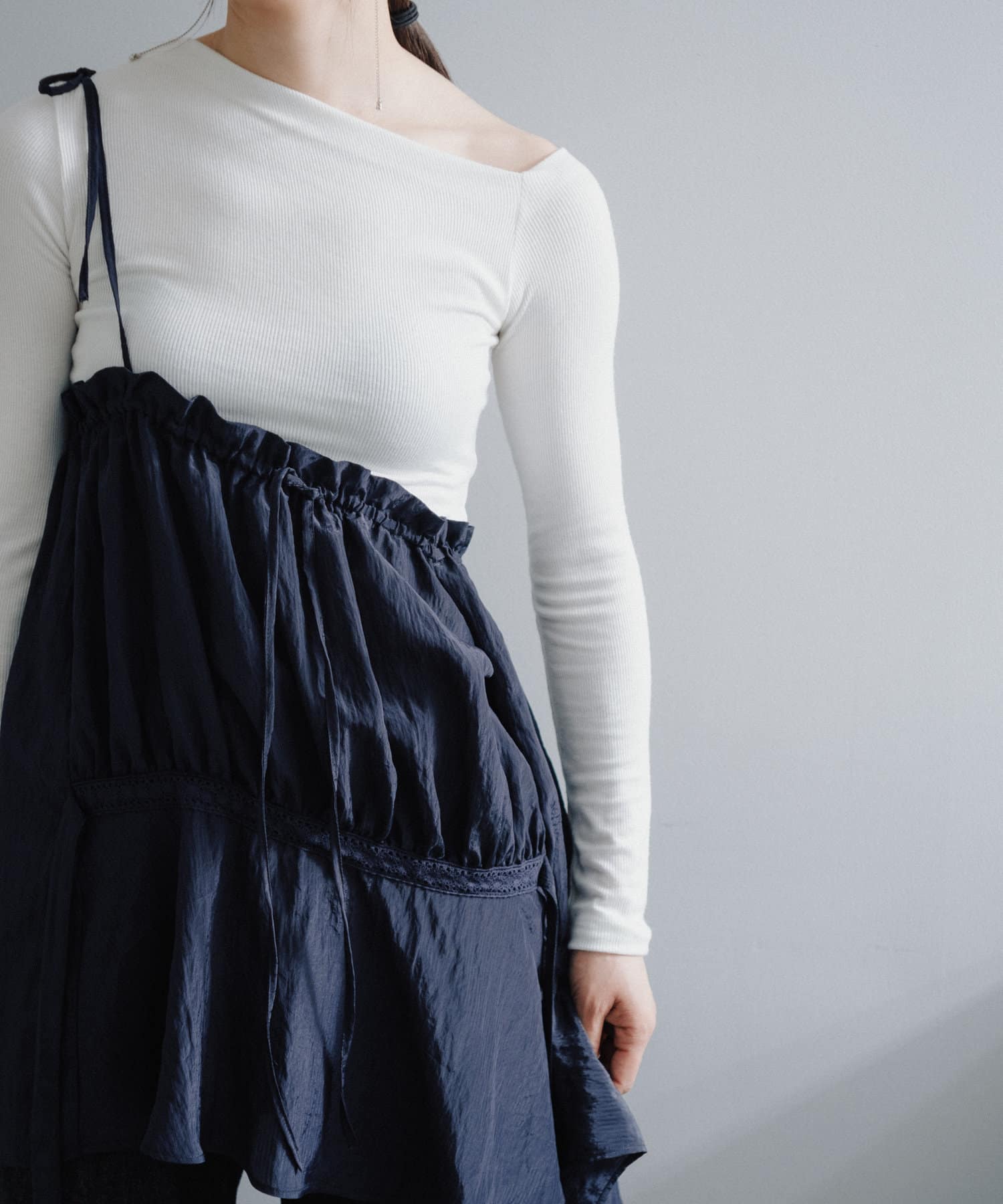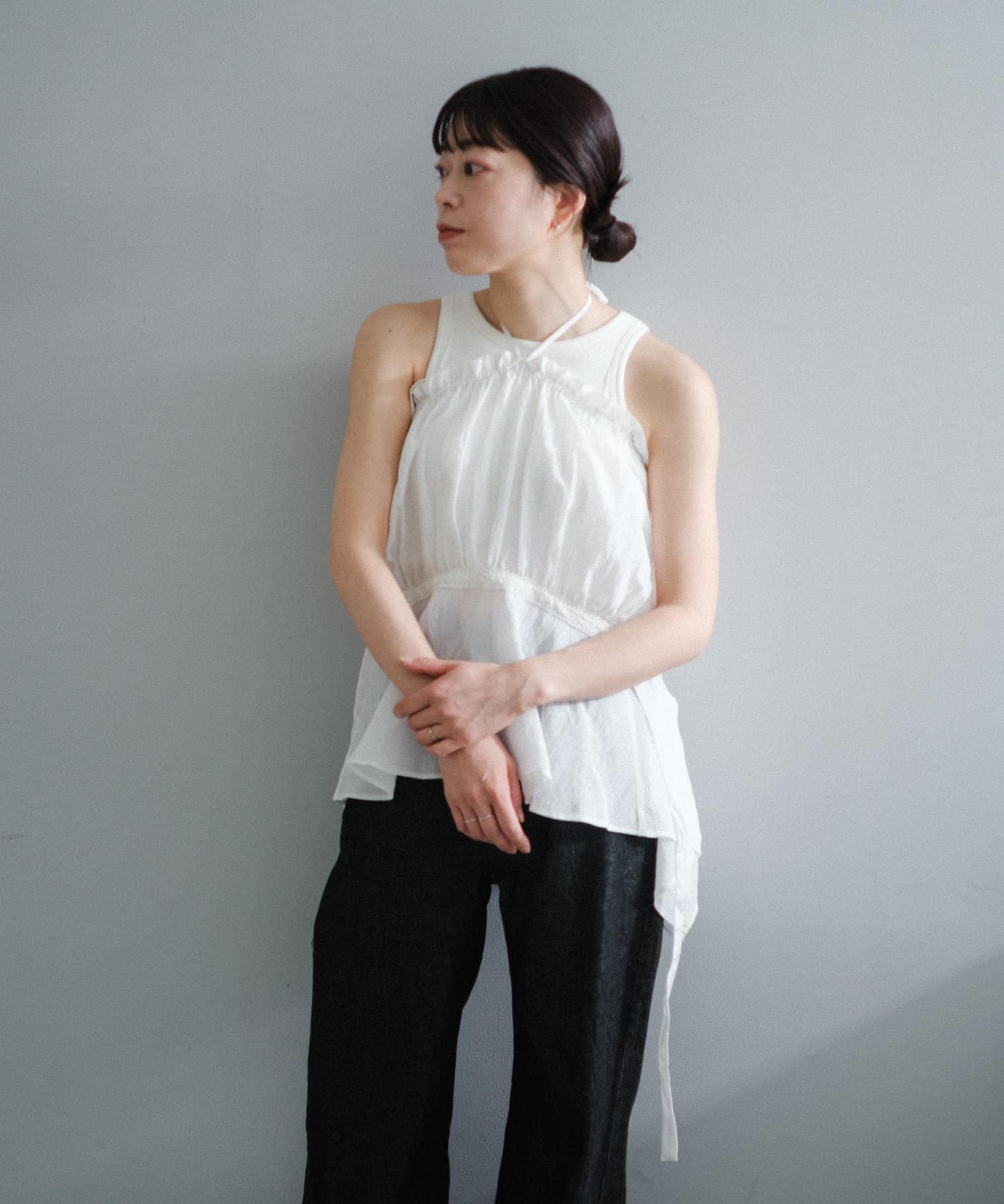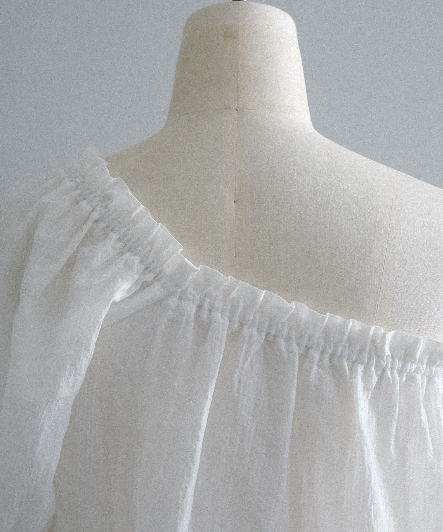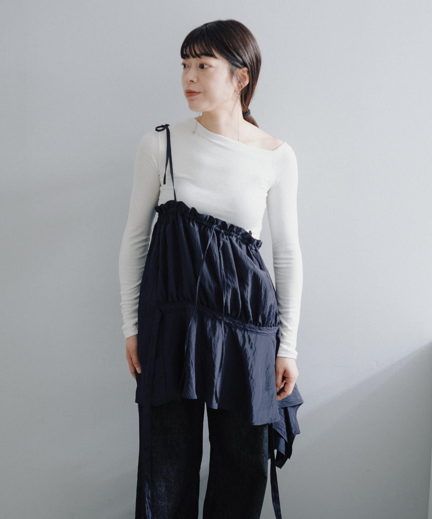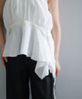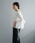 スクエアブラウスの片腕を抜いてワンショルダーに着用した時のデザインをそのまま活かし、裾が斜めに落ちるように設計しています。ウエスト部分と袖にはレーステープをたたき付けており、今年らしくロマンティックなエッセンスをプラスしました。