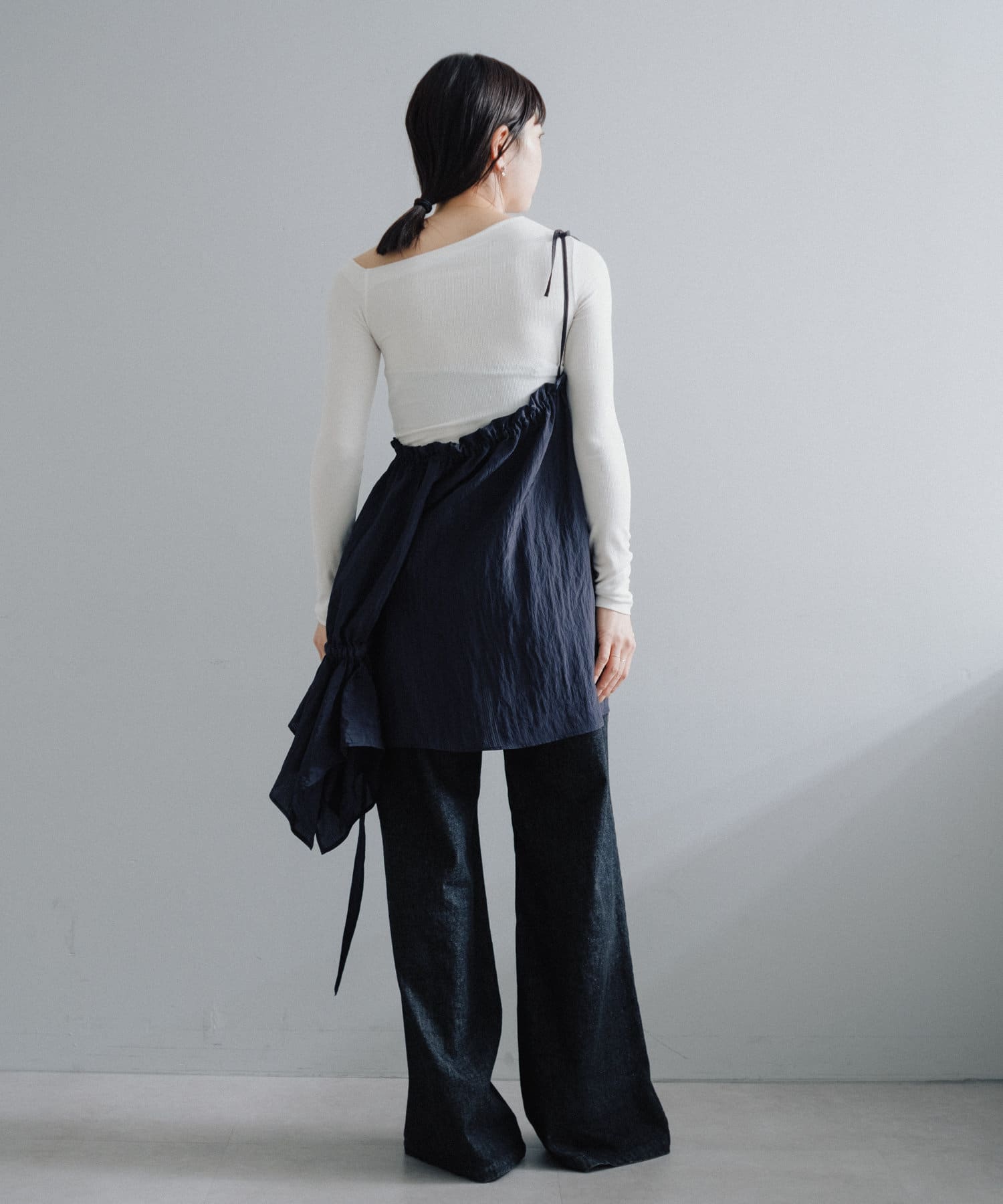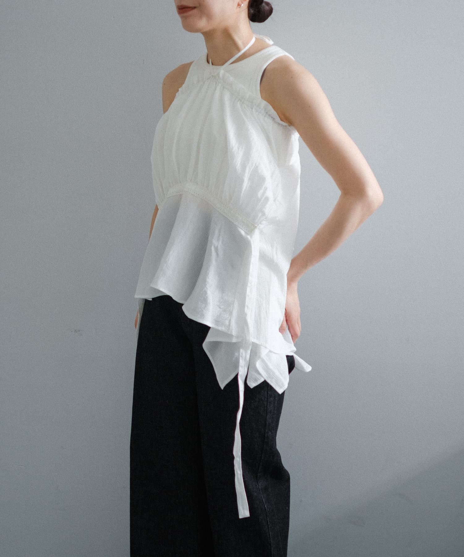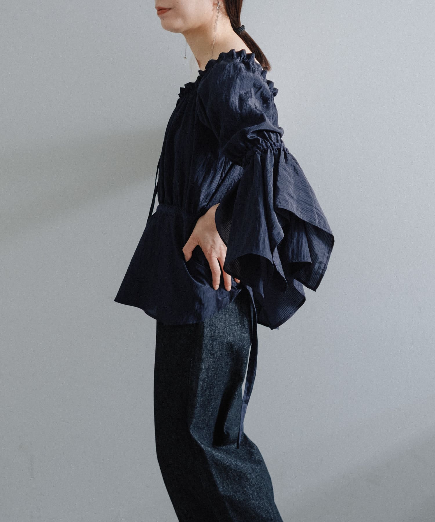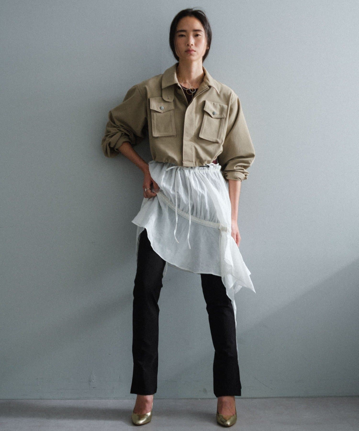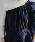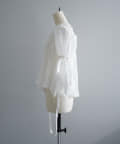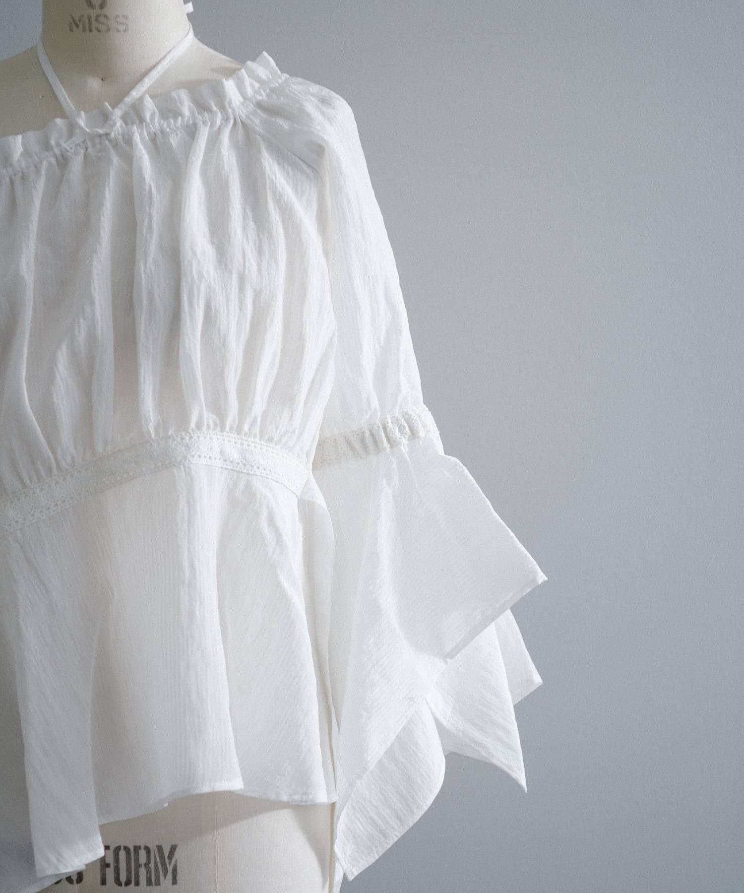 スクエアブラウスの片腕を抜いてワンショルダーに着用した時のデザインをそのまま活かし、裾が斜めに落ちるように設計しています。ウエスト部分と袖にはレーステープをたたき付けており、今年らしくロマンティックなエッセンスをプラスしました。