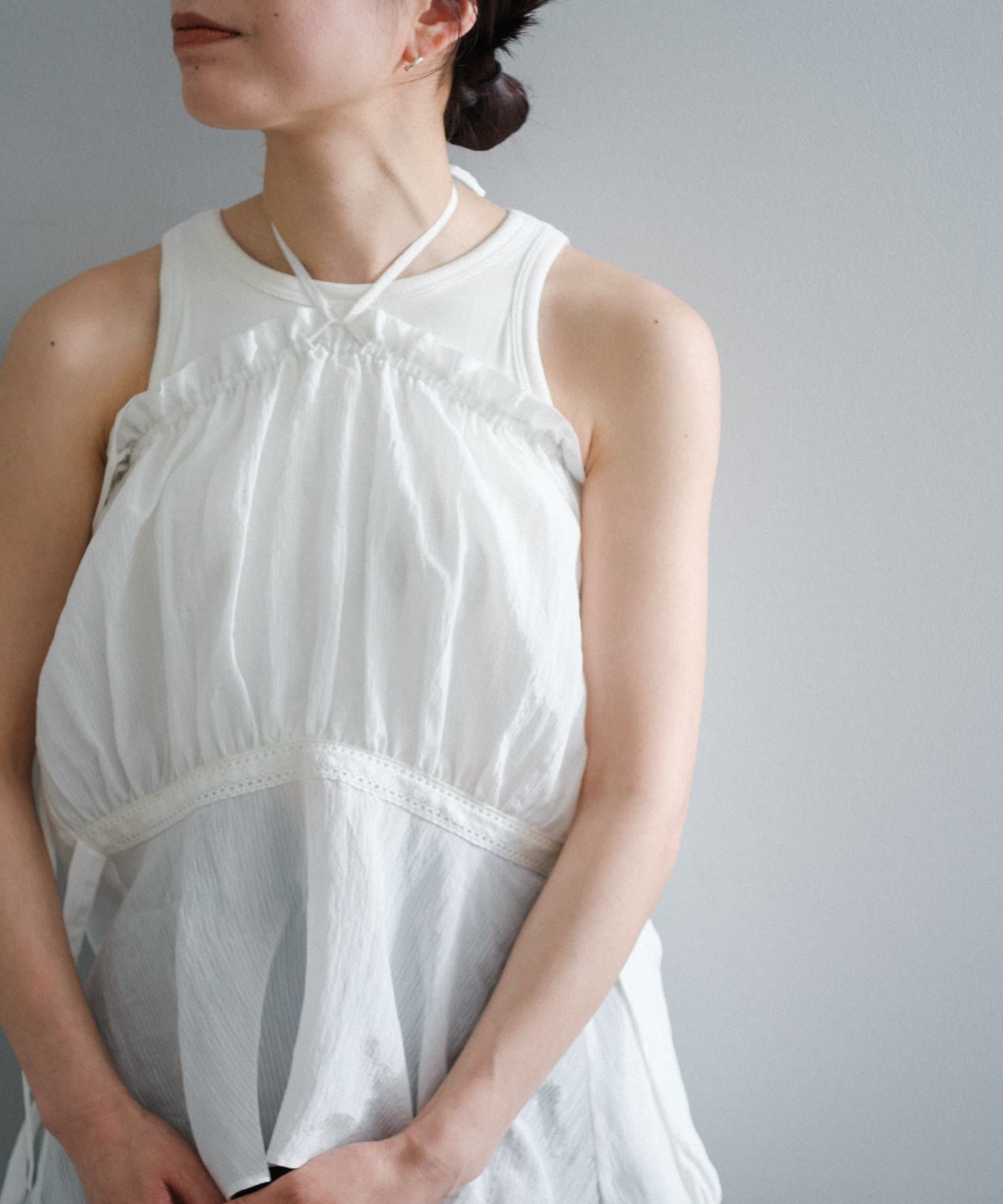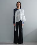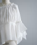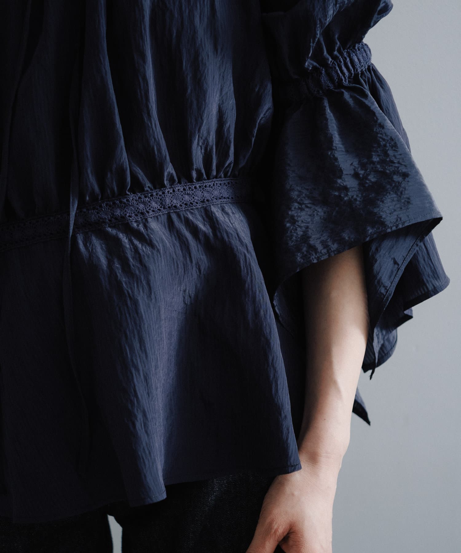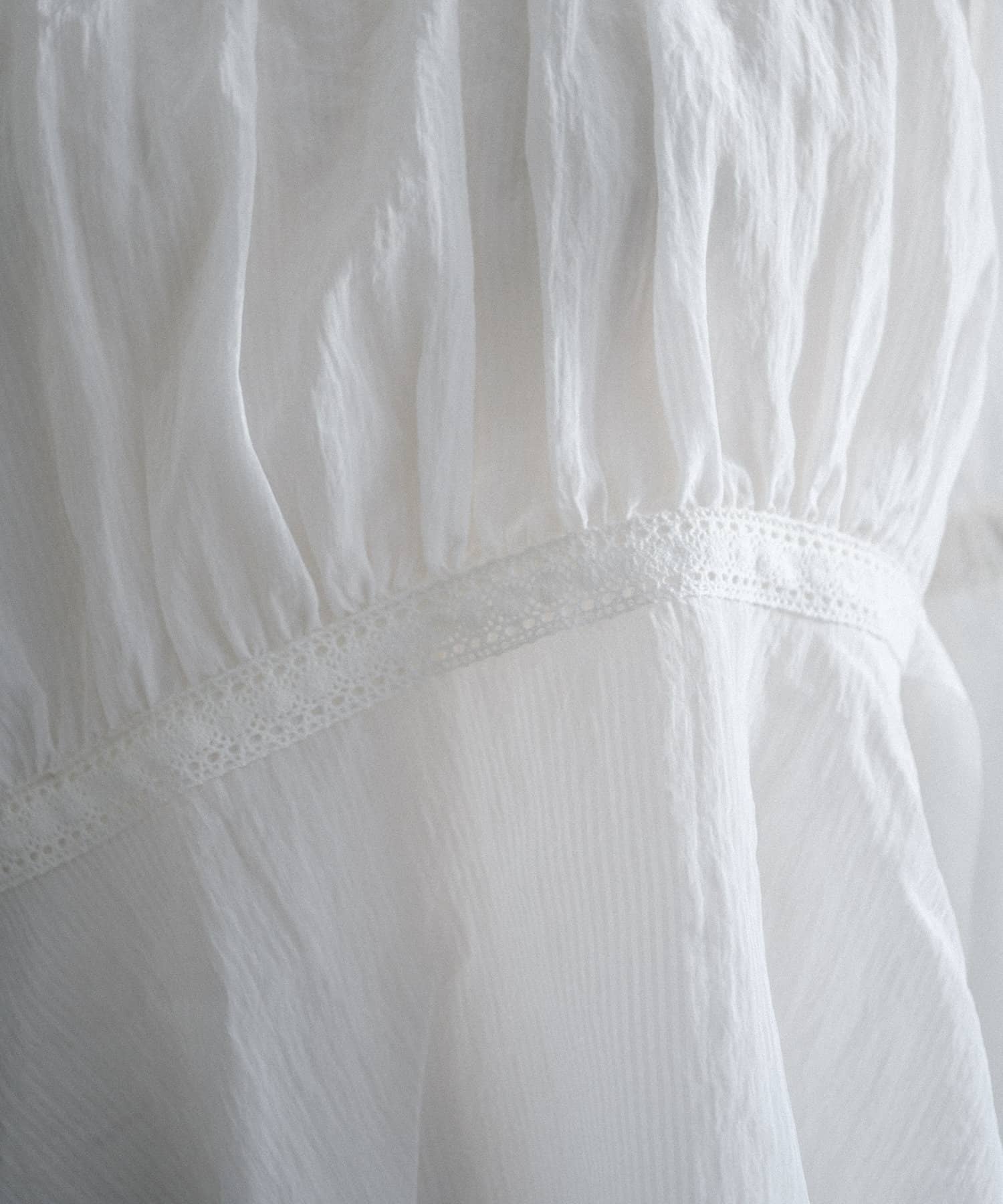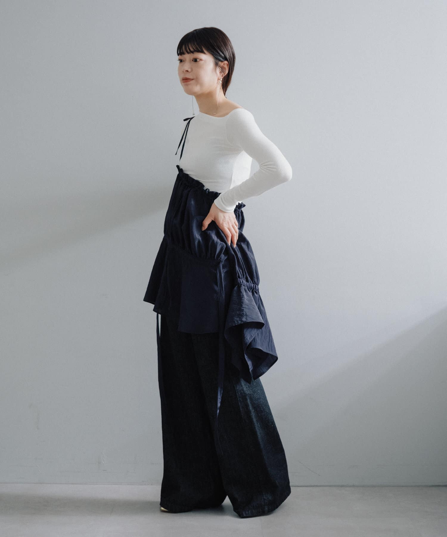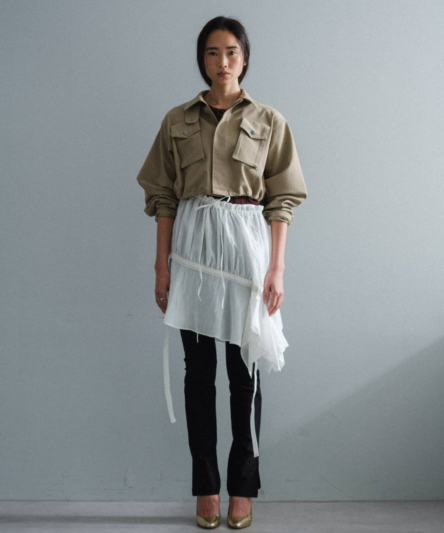 スクエアブラウスの片腕を抜いてワンショルダーに着用した時のデザインをそのまま活かし、裾が斜めに落ちるように設計しています。ウエスト部分と袖にはレーステープをたたき付けており、今年らしくロマンティックなエッセンスをプラスしました。
