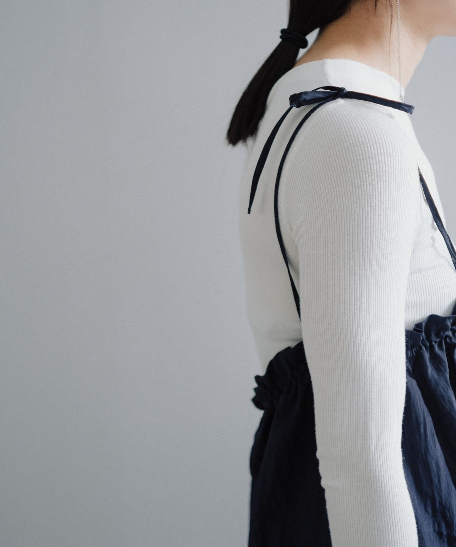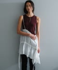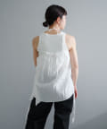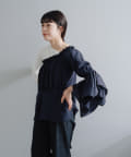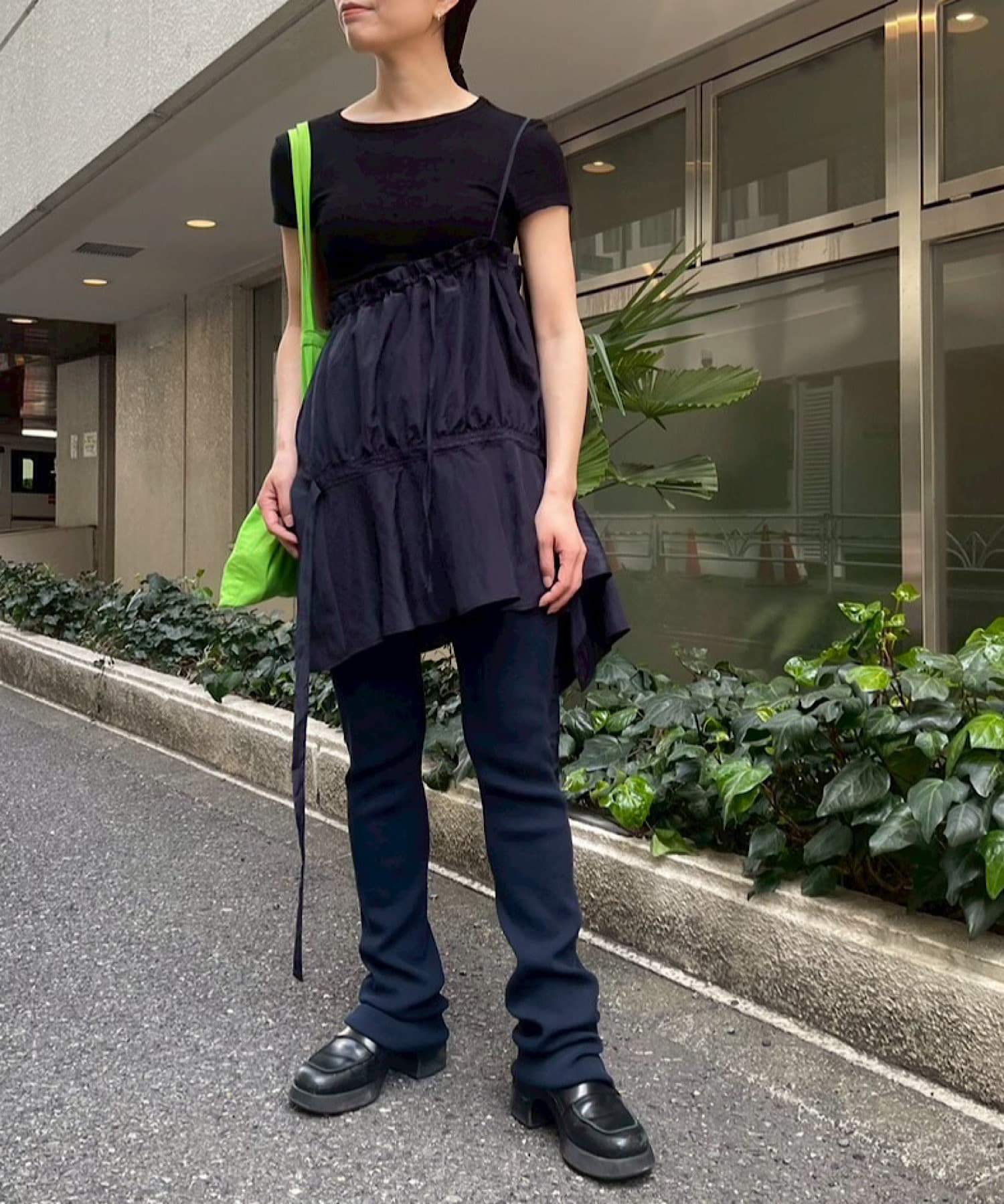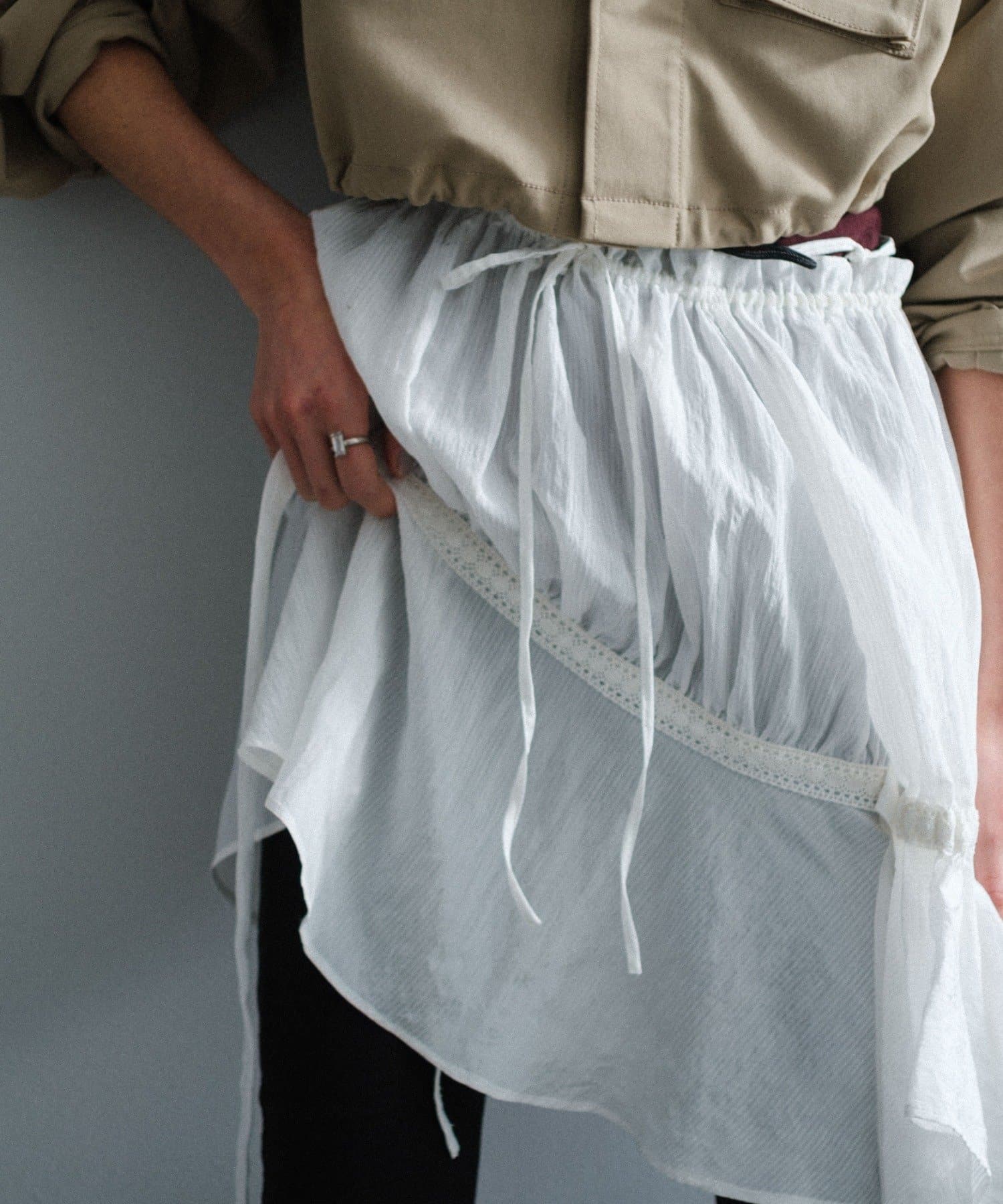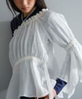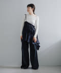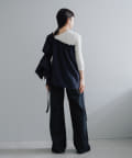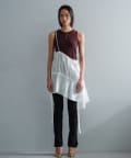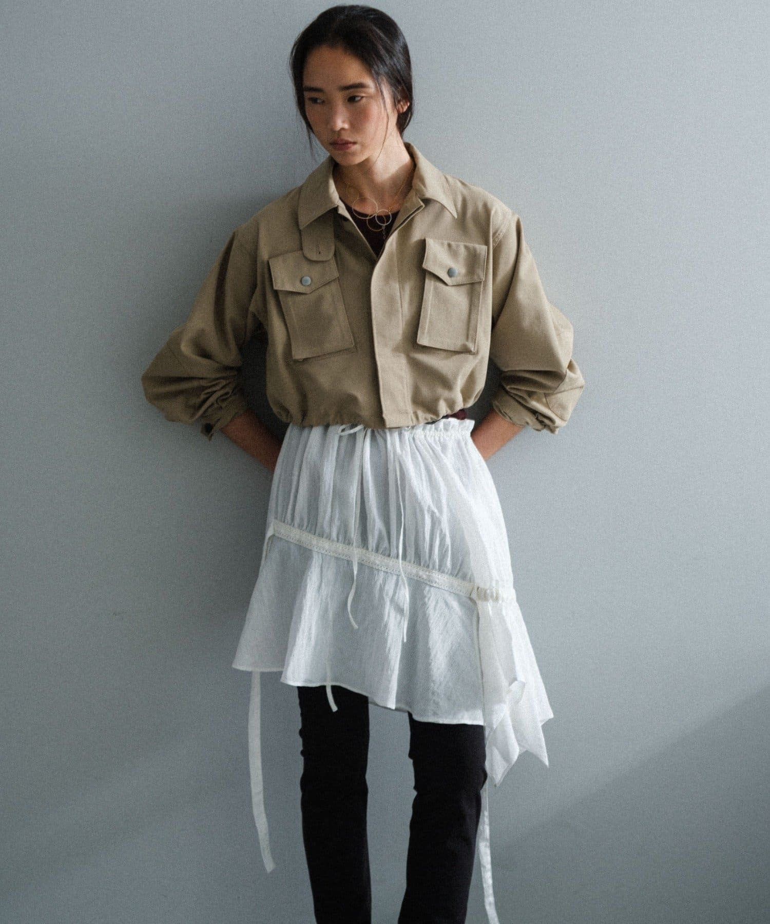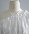 スクエアブラウスの片腕を抜いてワンショルダーに着用した時のデザインをそのまま活かし、裾が斜めに落ちるように設計しています。ウエスト部分と袖にはレーステープをたたき付けており、今年らしくロマンティックなエッセンスをプラスしました。