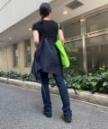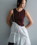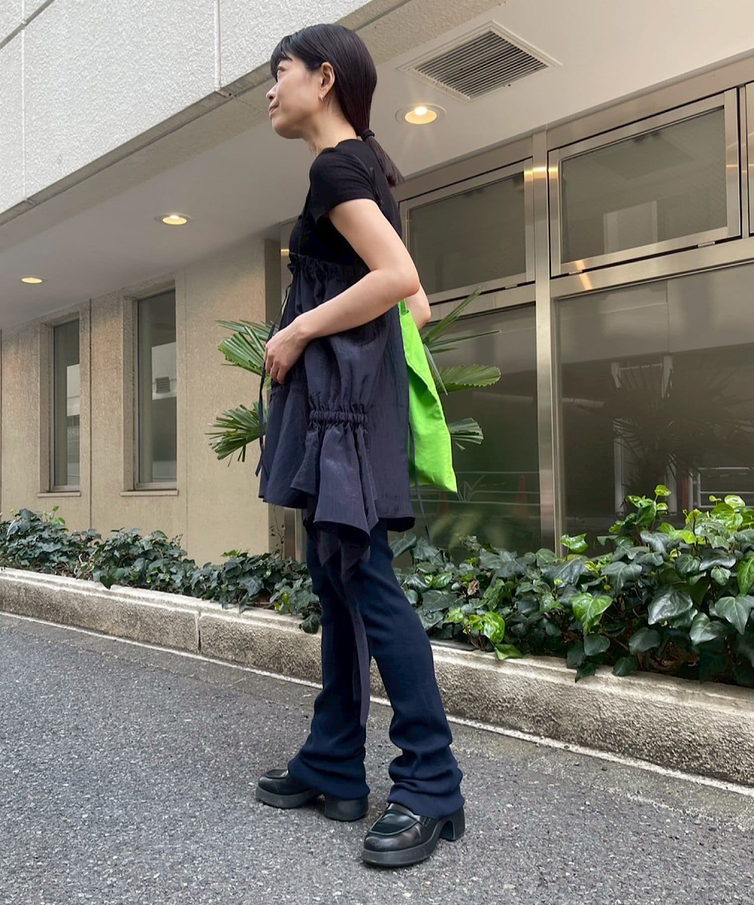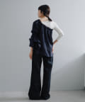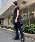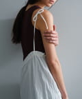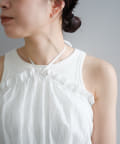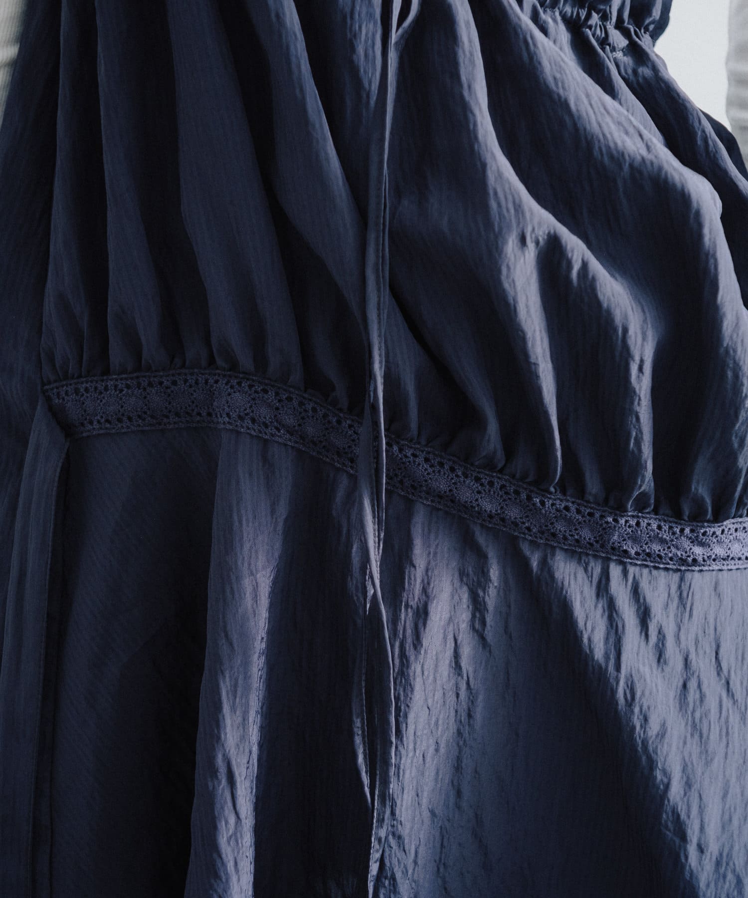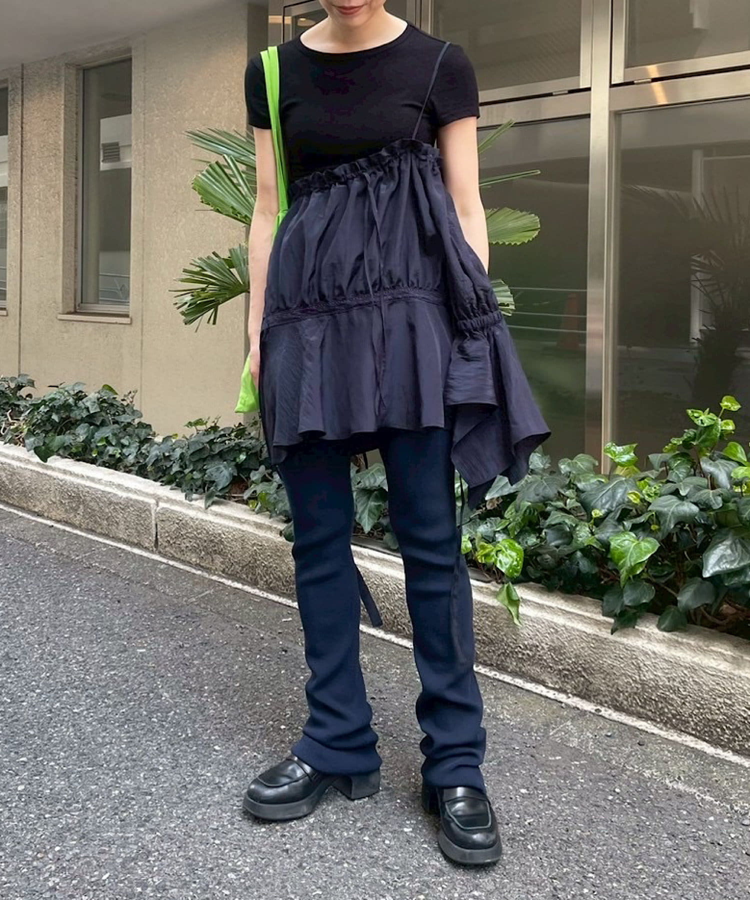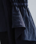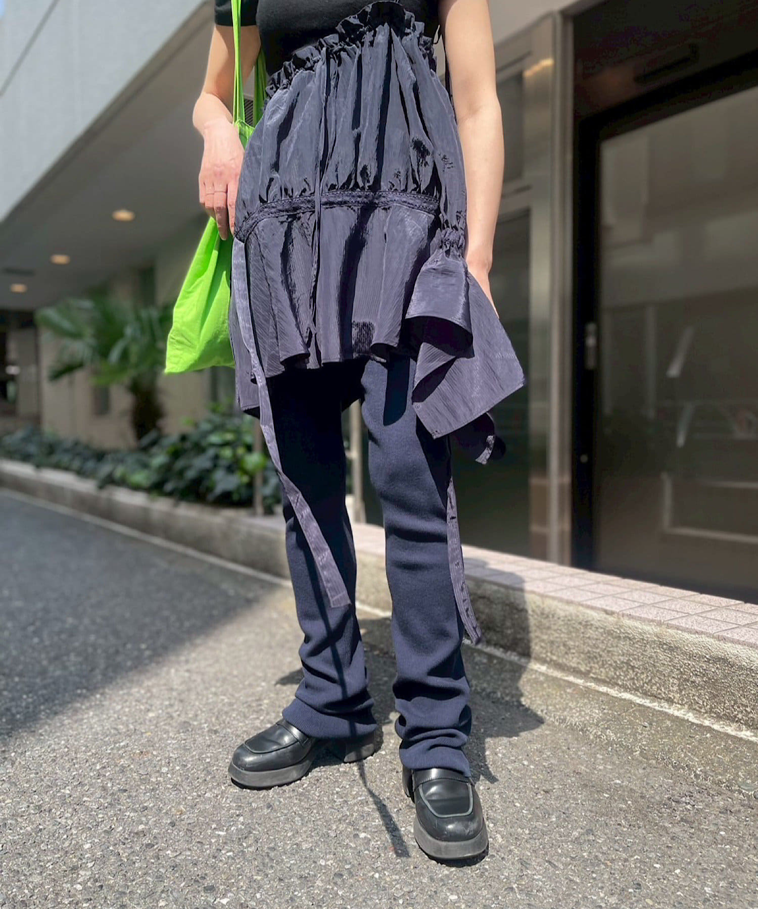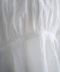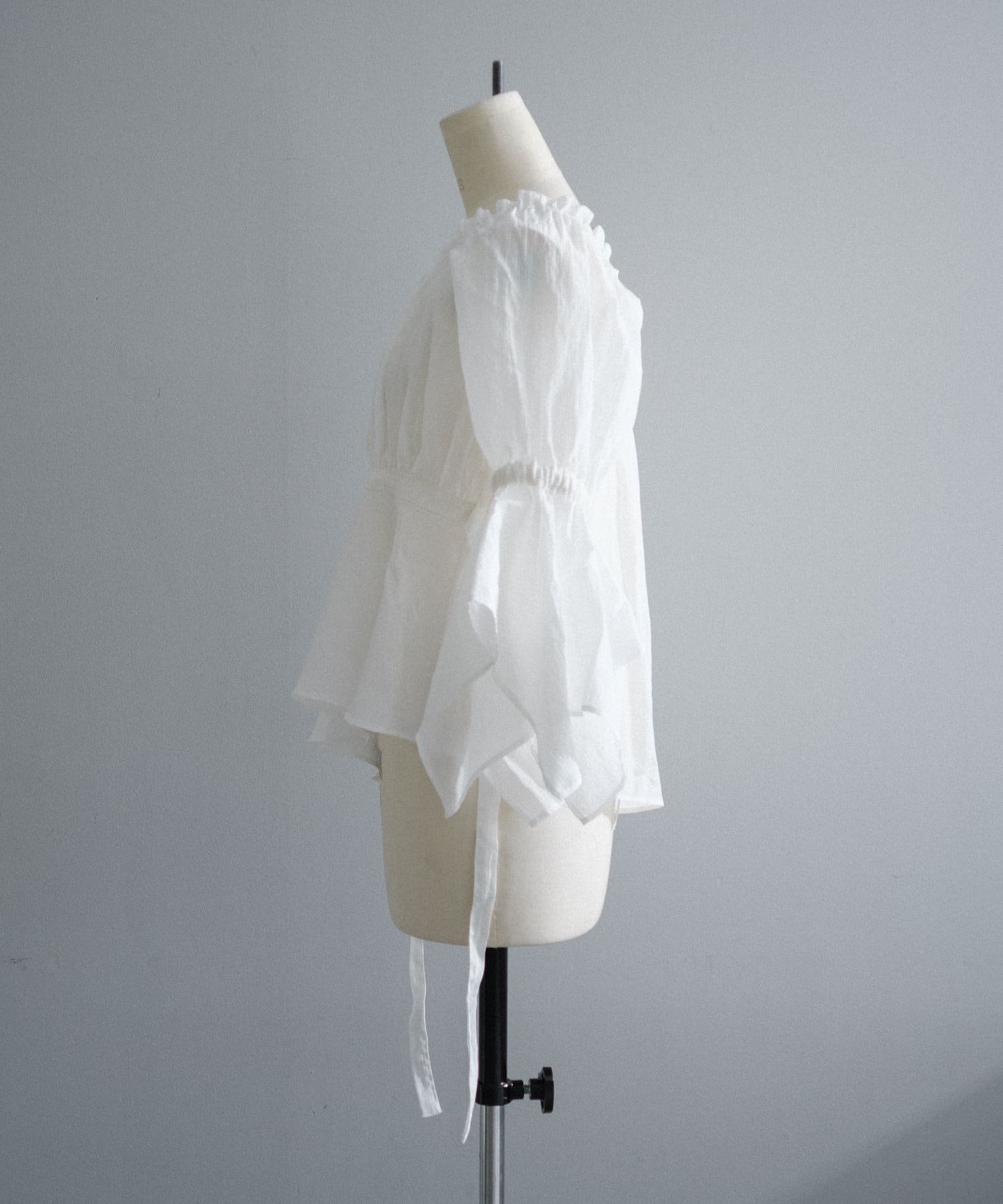 スクエアブラウスの片腕を抜いてワンショルダーに着用した時のデザインをそのまま活かし、裾が斜めに落ちるように設計しています。ウエスト部分と袖にはレーステープをたたき付けており、今年らしくロマンティックなエッセンスをプラスしました。