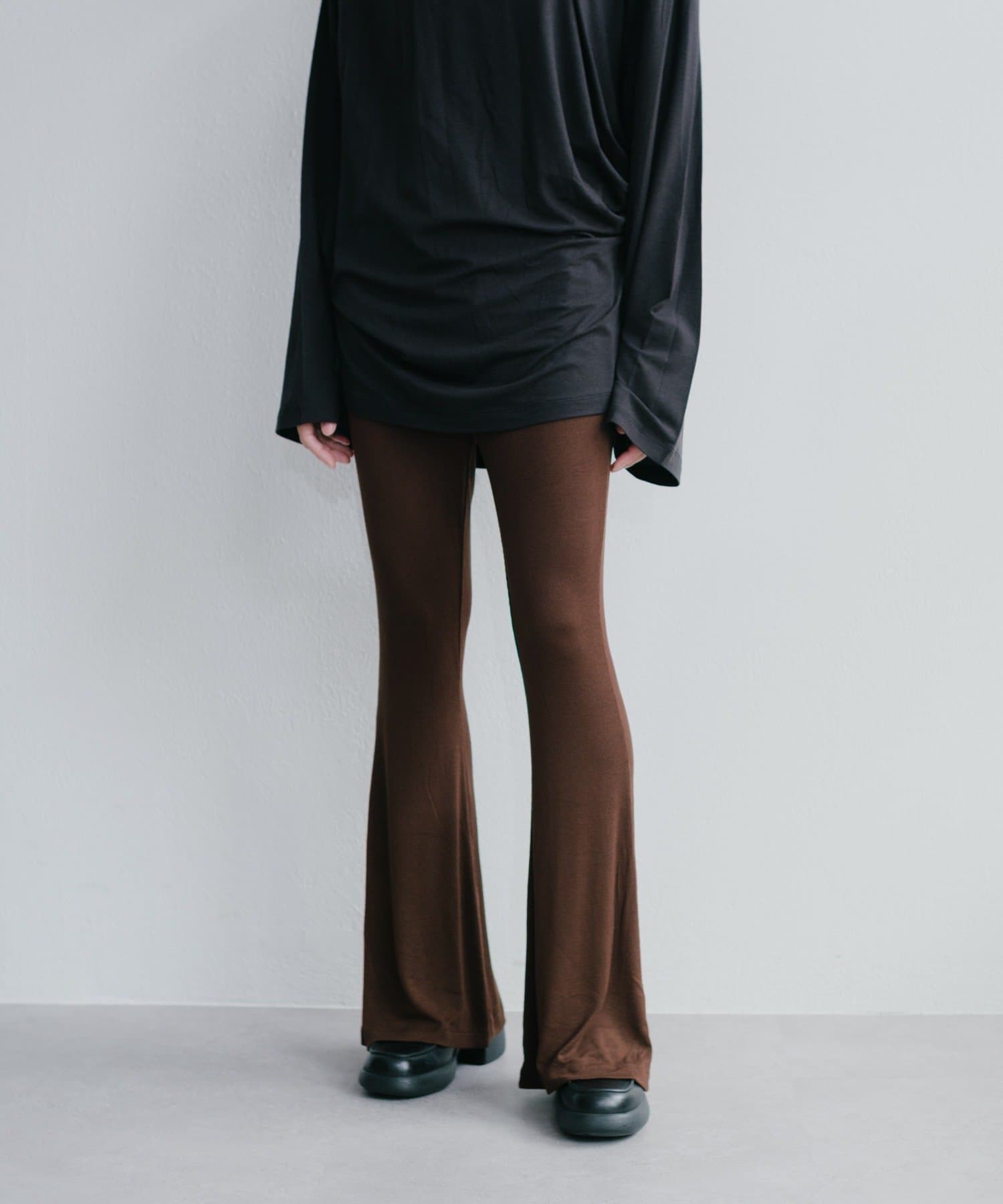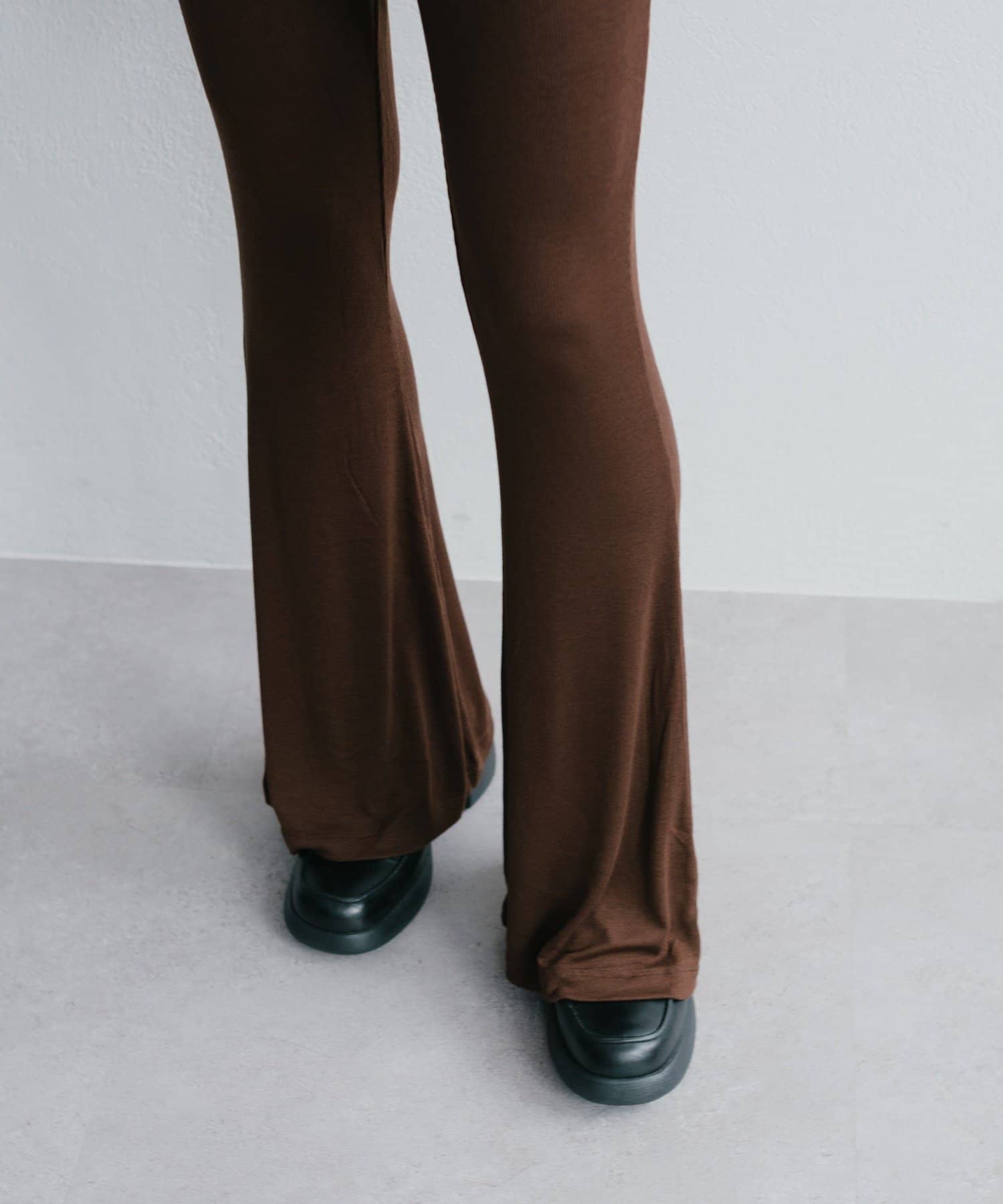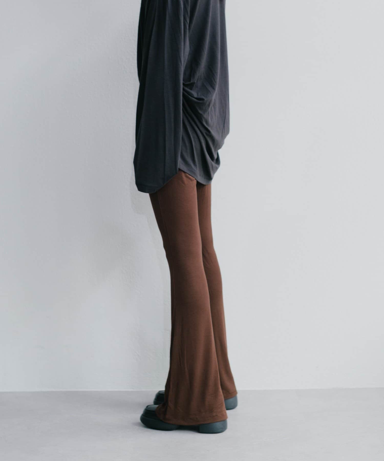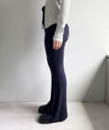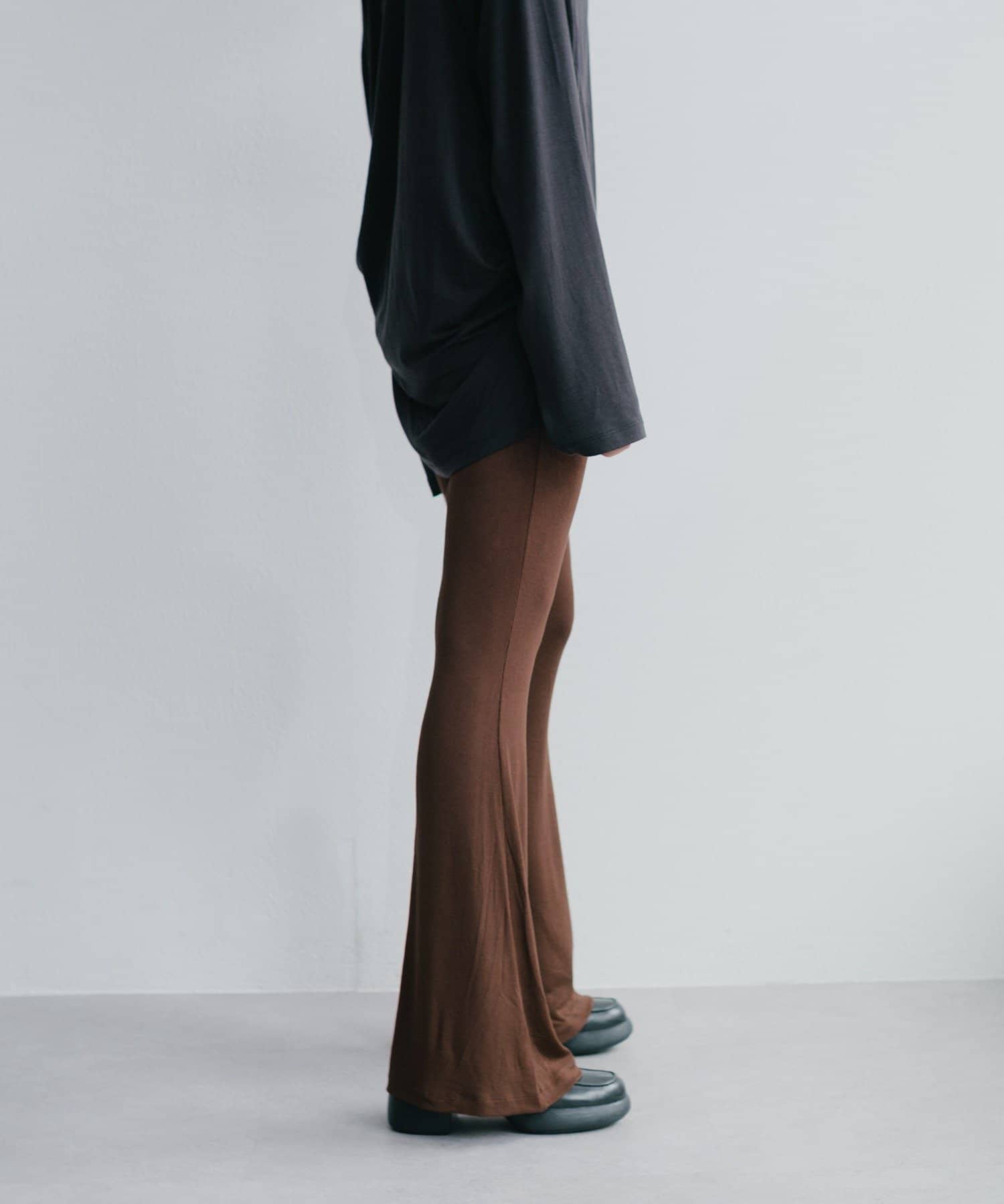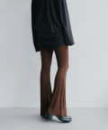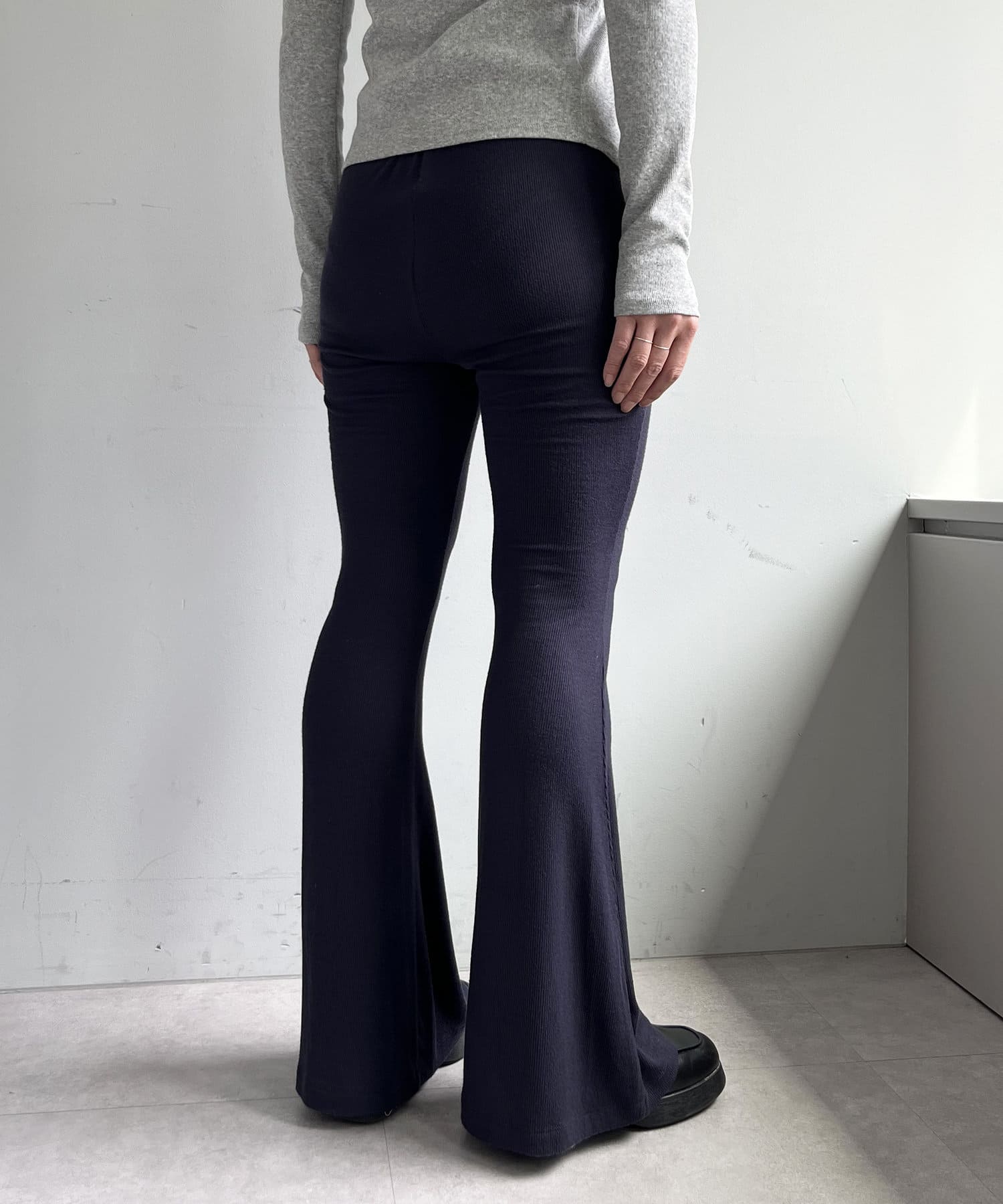 昨年からリリースしているSheer rib flared leggingsとの違いは、マチ(生地の切り替え)が入っていないこと、フレア分量が控えめなこと、アセテートと比べて光沢感が少ないので、カジュアルなスタイルにも馴染みやすく、よりデイリーユースなアイテムとして、非常に使い勝手の良い1本です。