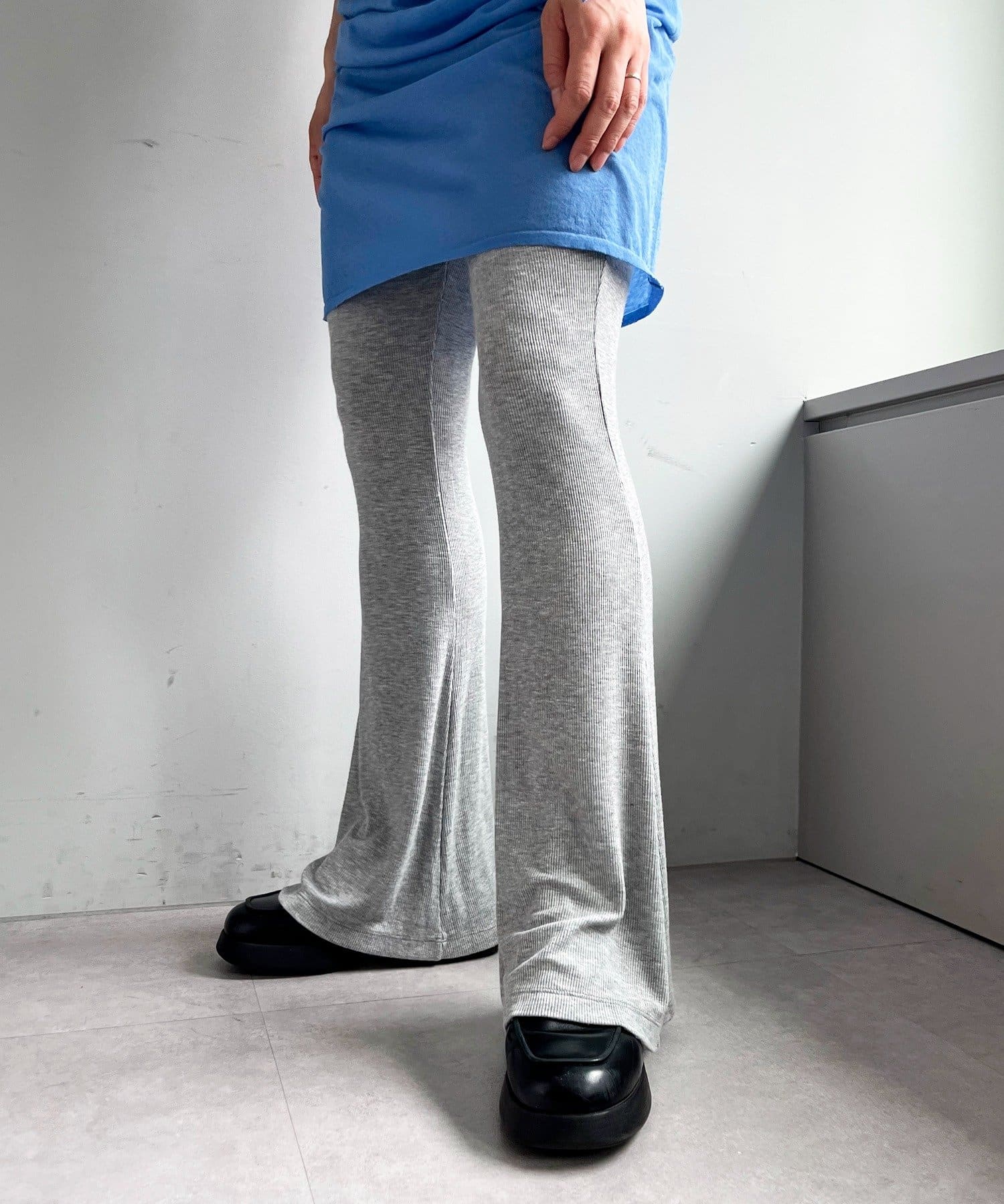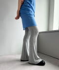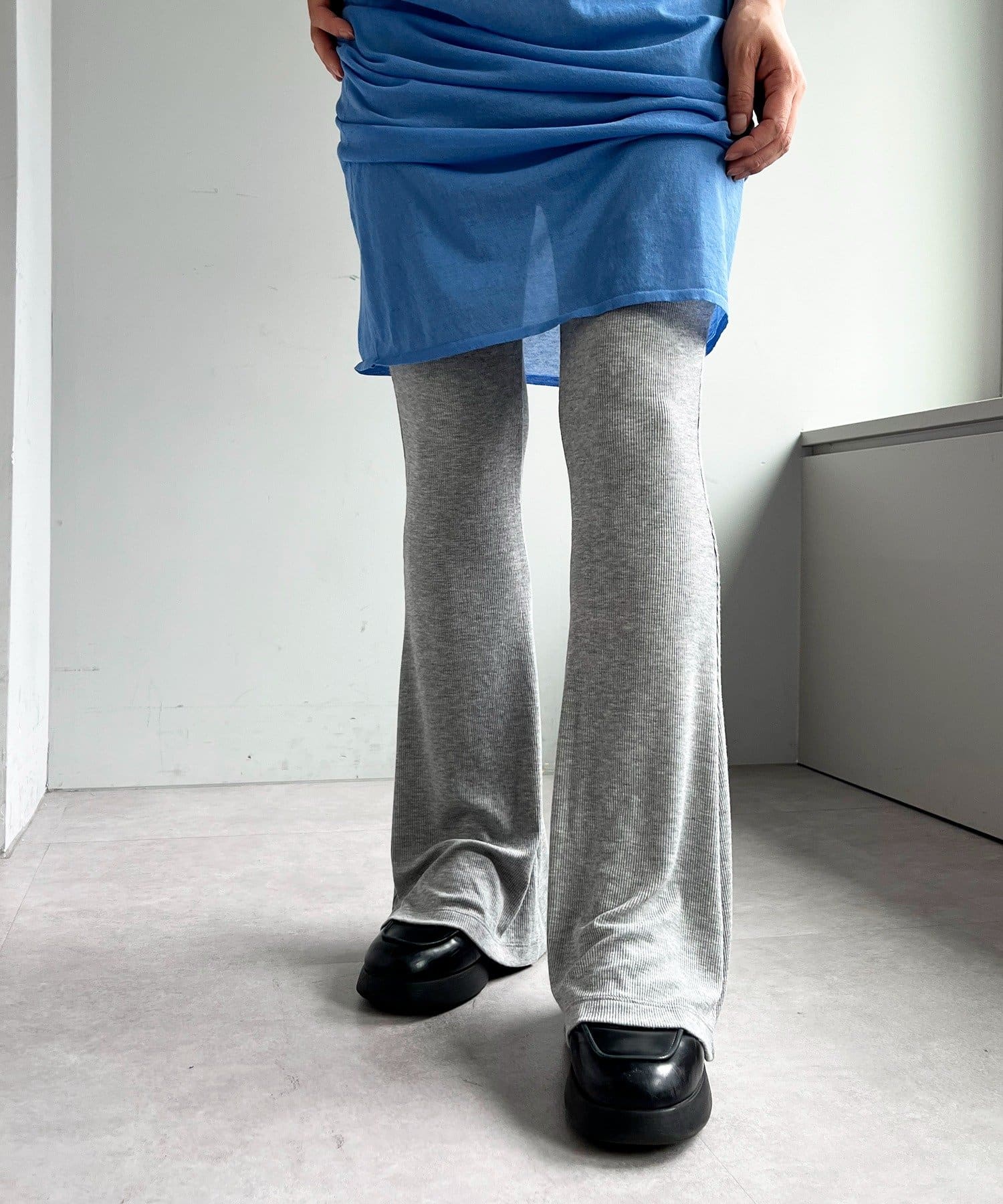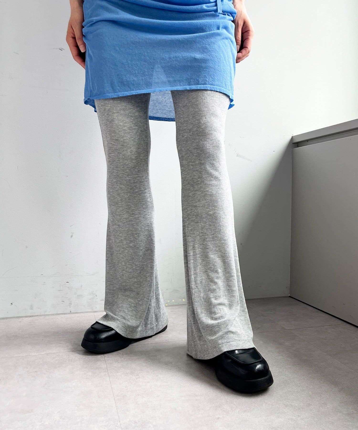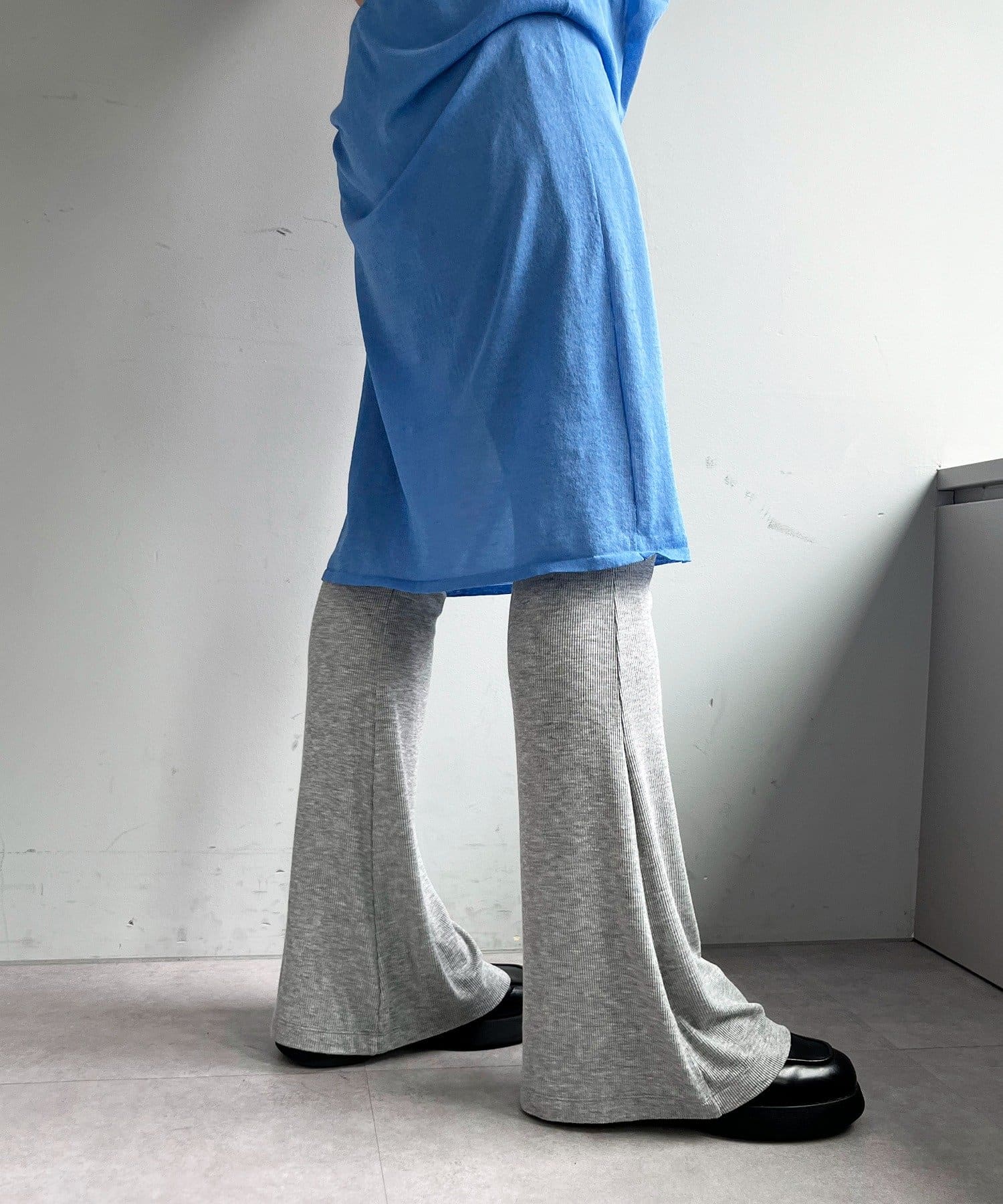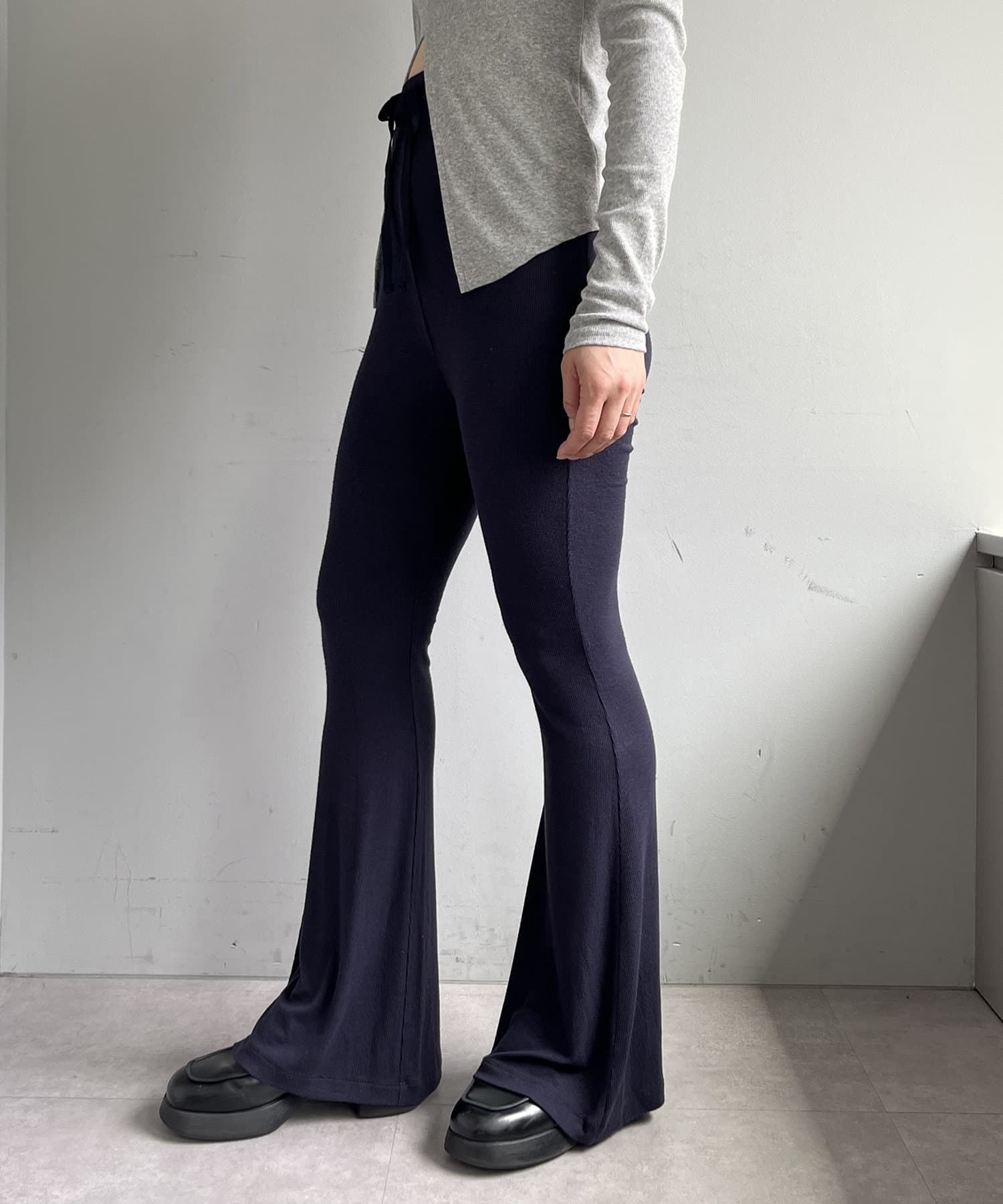 昨年からリリースしているSheer rib flared leggingsとの違いは、マチ(生地の切り替え)が入っていないこと、フレア分量が控えめなこと、アセテートと比べて光沢感が少ないので、カジュアルなスタイルにも馴染みやすく、よりデイリーユースなアイテムとして、非常に使い勝手の良い1本です。