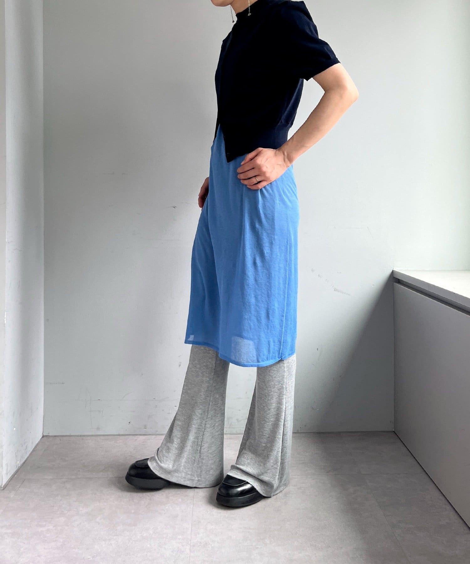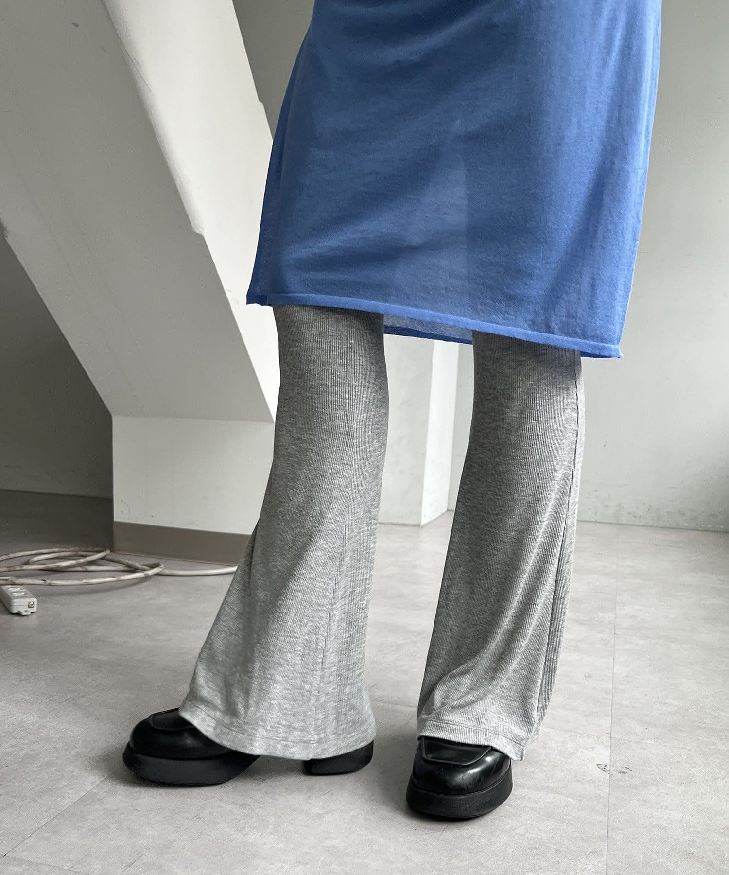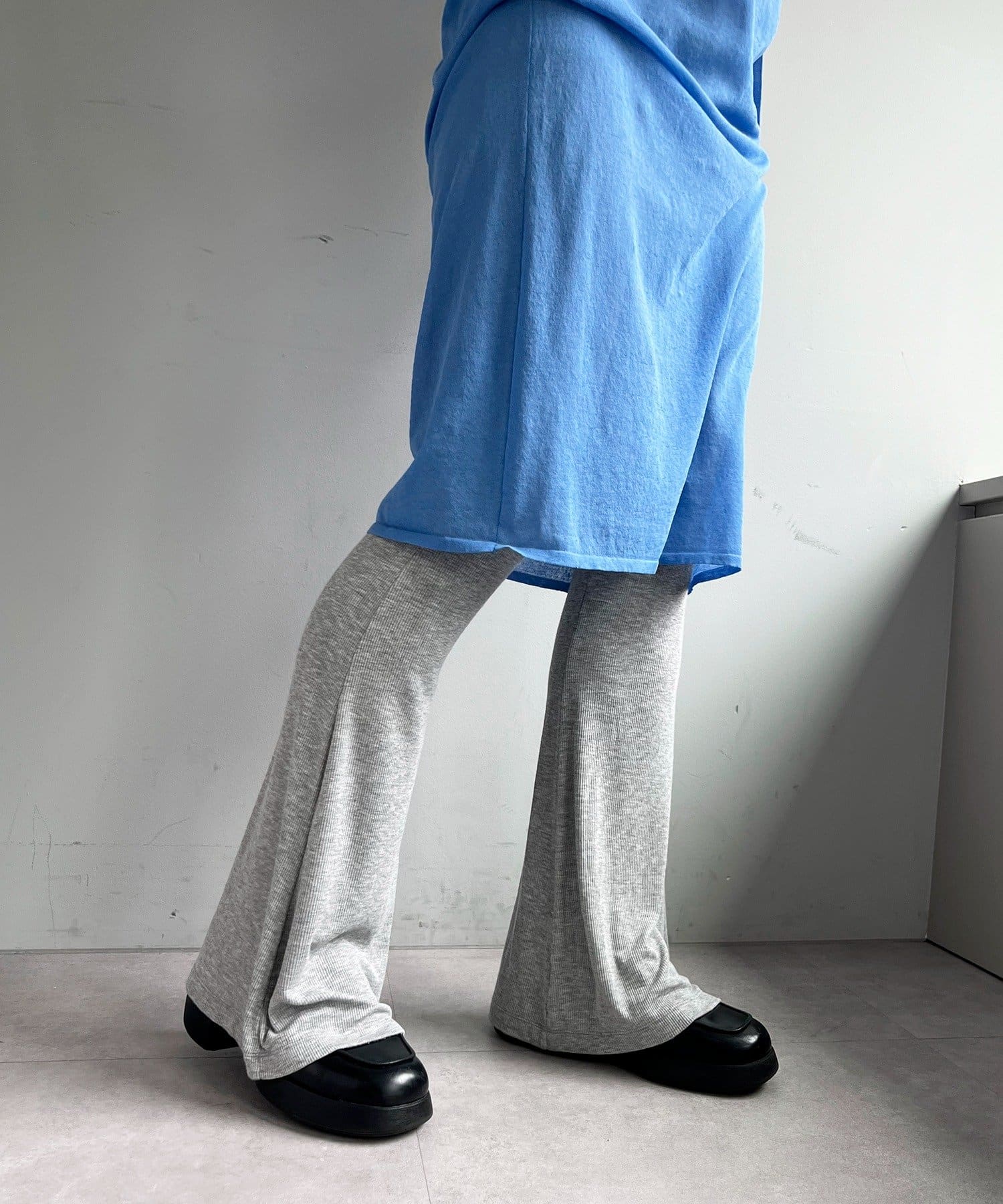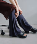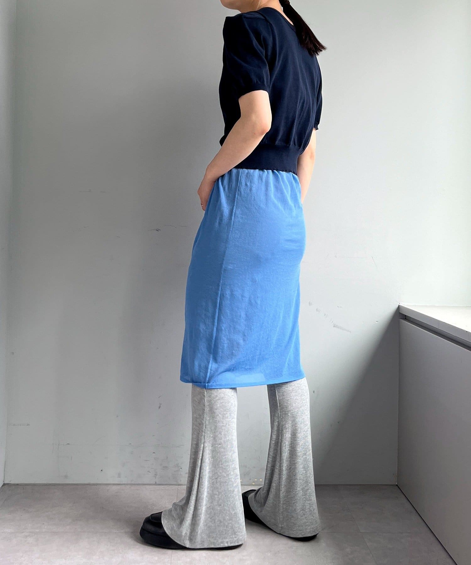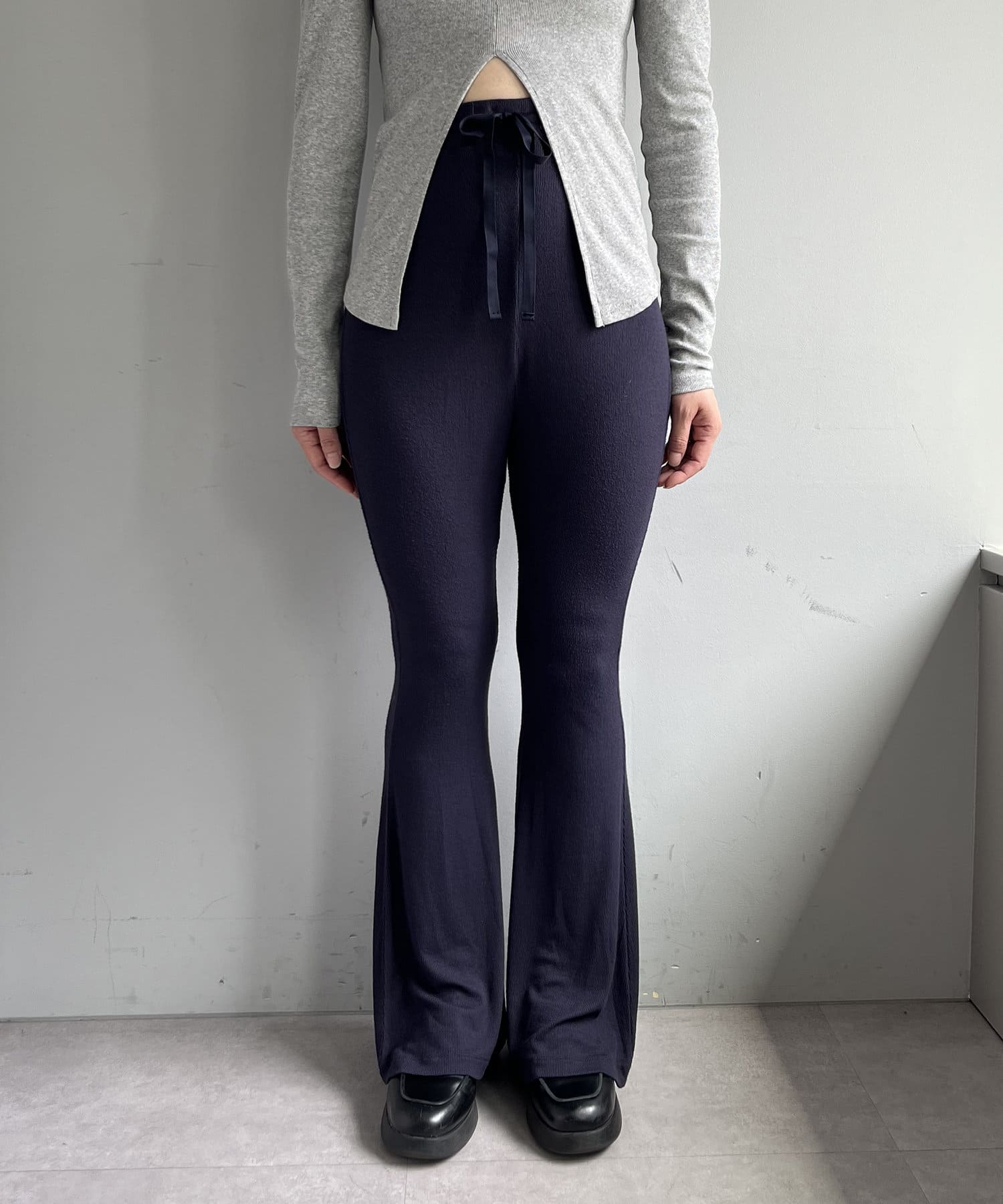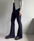 昨年からリリースしているSheer rib flared leggingsとの違いは、マチ(生地の切り替え)が入っていないこと、フレア分量が控えめなこと、アセテートと比べて光沢感が少ないので、カジュアルなスタイルにも馴染みやすく、よりデイリーユースなアイテムとして、非常に使い勝手の良い1本です。