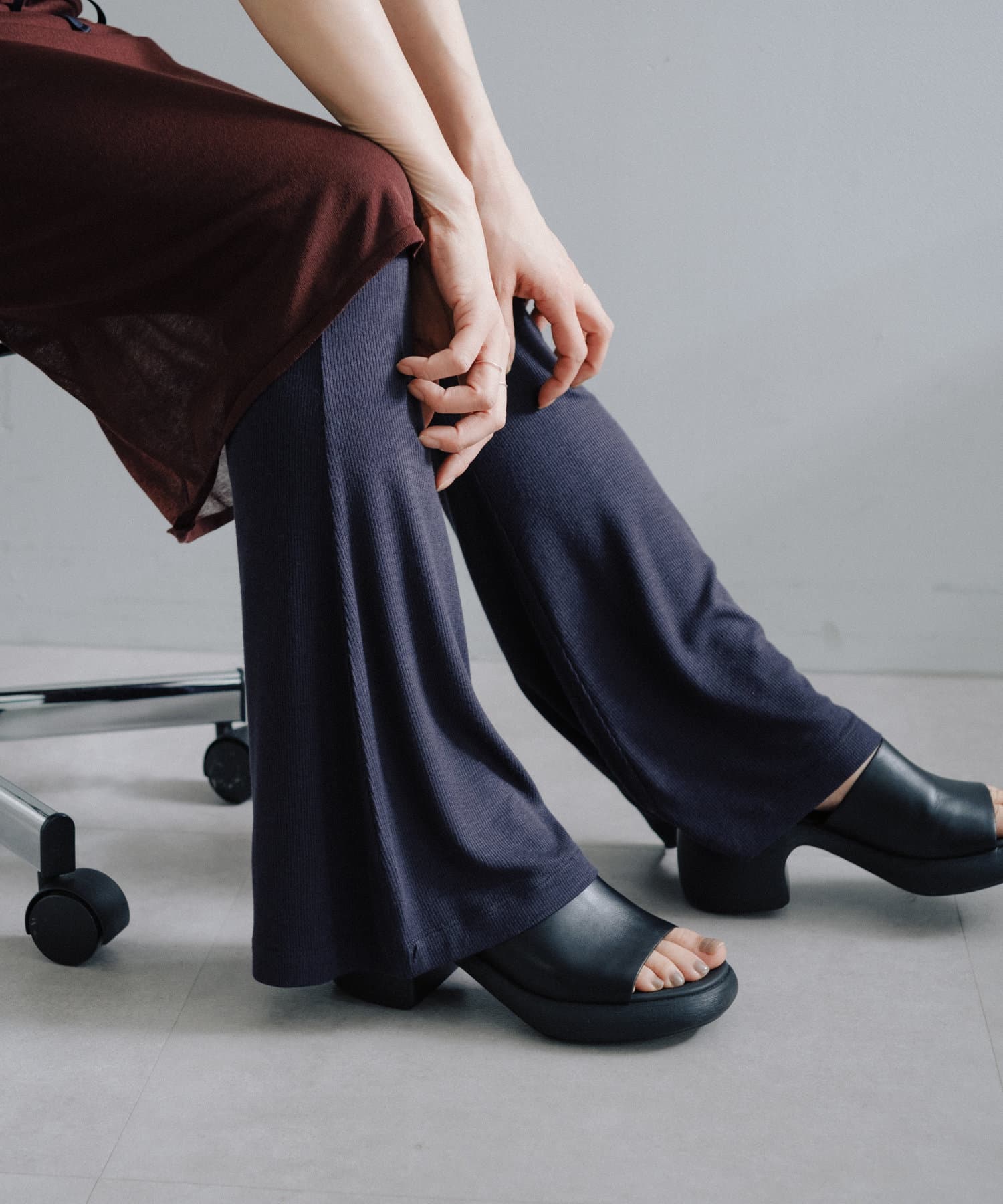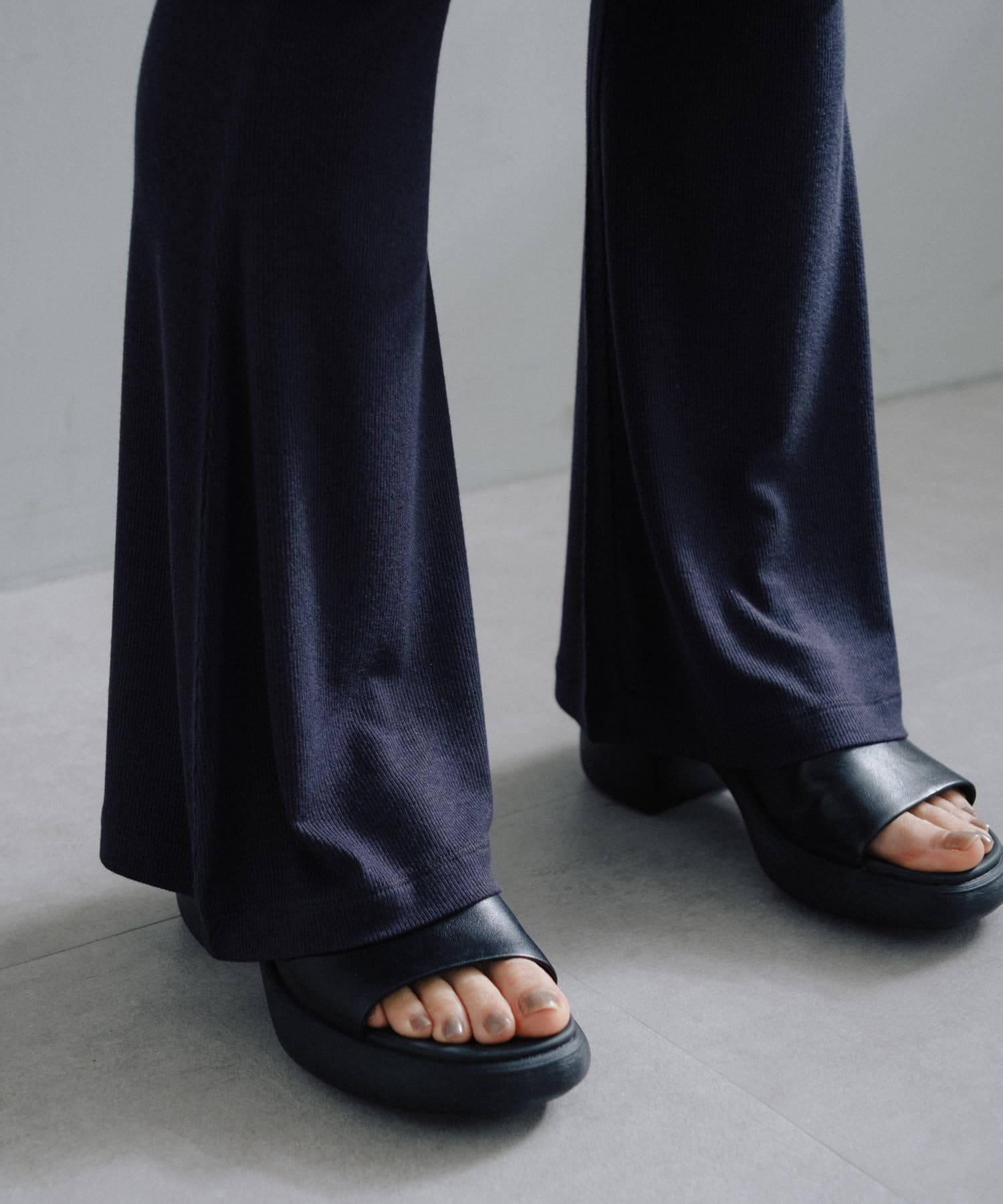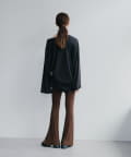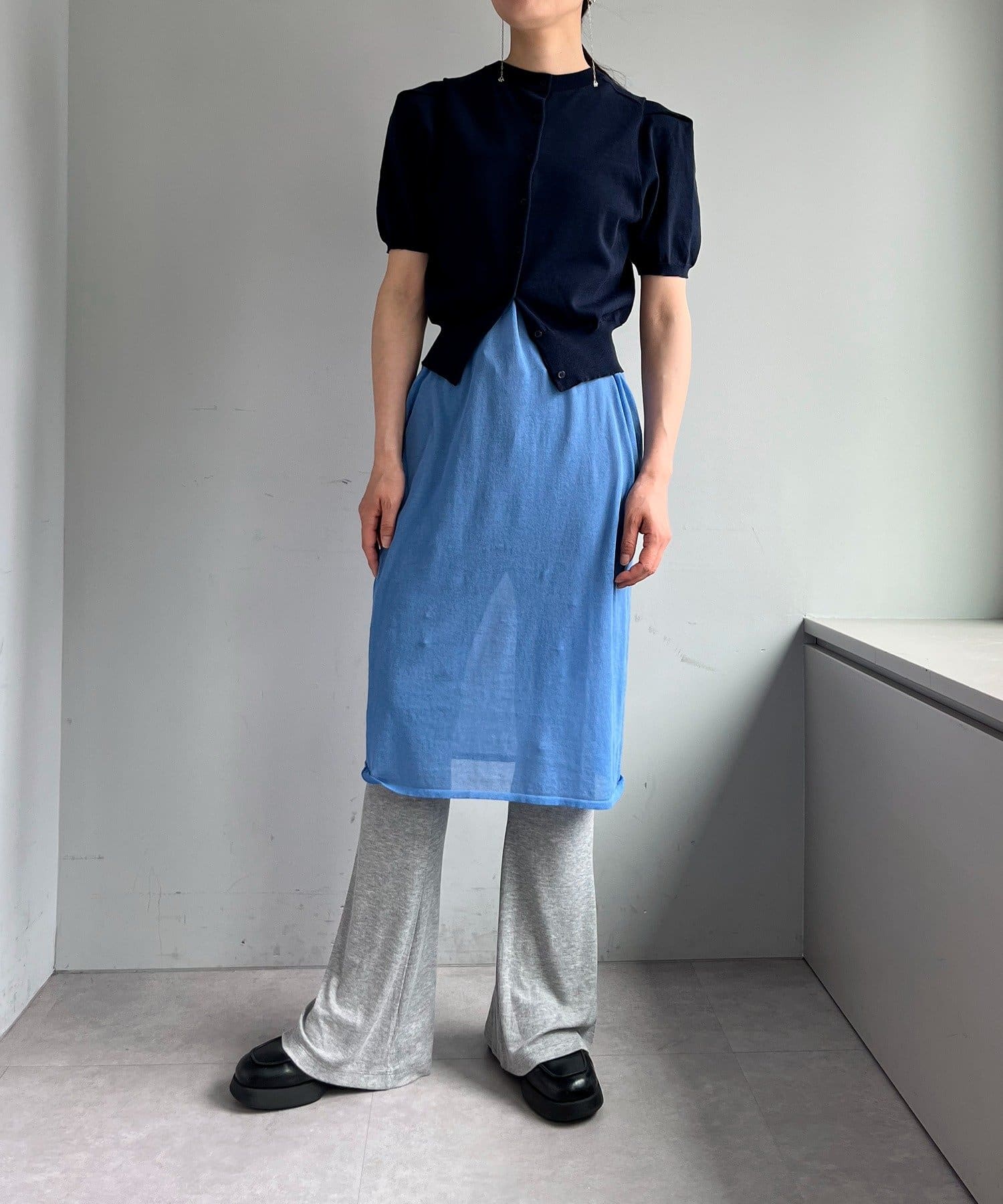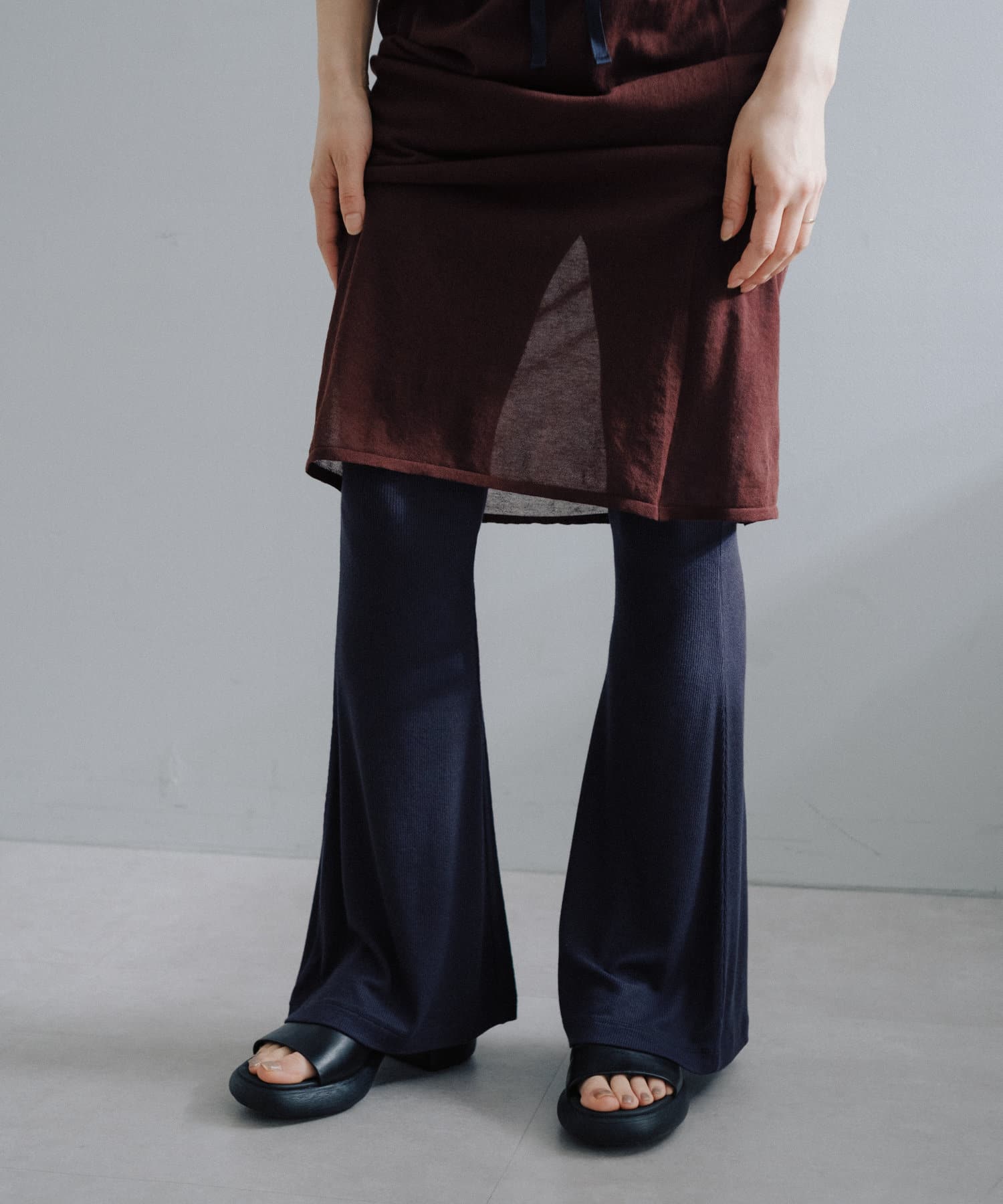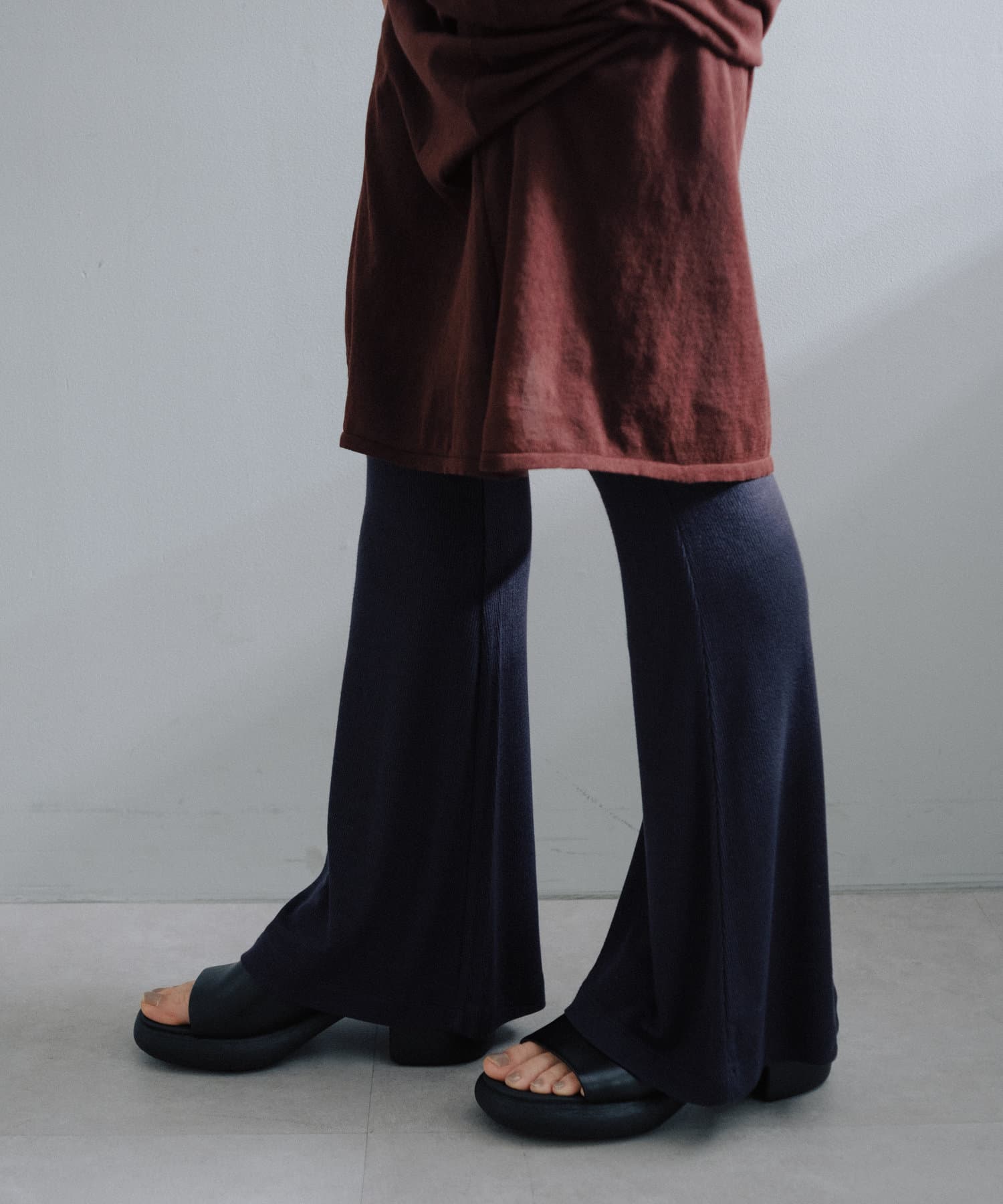 昨年からリリースしているSheer rib flared leggingsとの違いは、マチ(生地の切り替え)が入っていないこと、フレア分量が控えめなこと、アセテートと比べて光沢感が少ないので、カジュアルなスタイルにも馴染みやすく、よりデイリーユースなアイテムとして、非常に使い勝手の良い1本です。