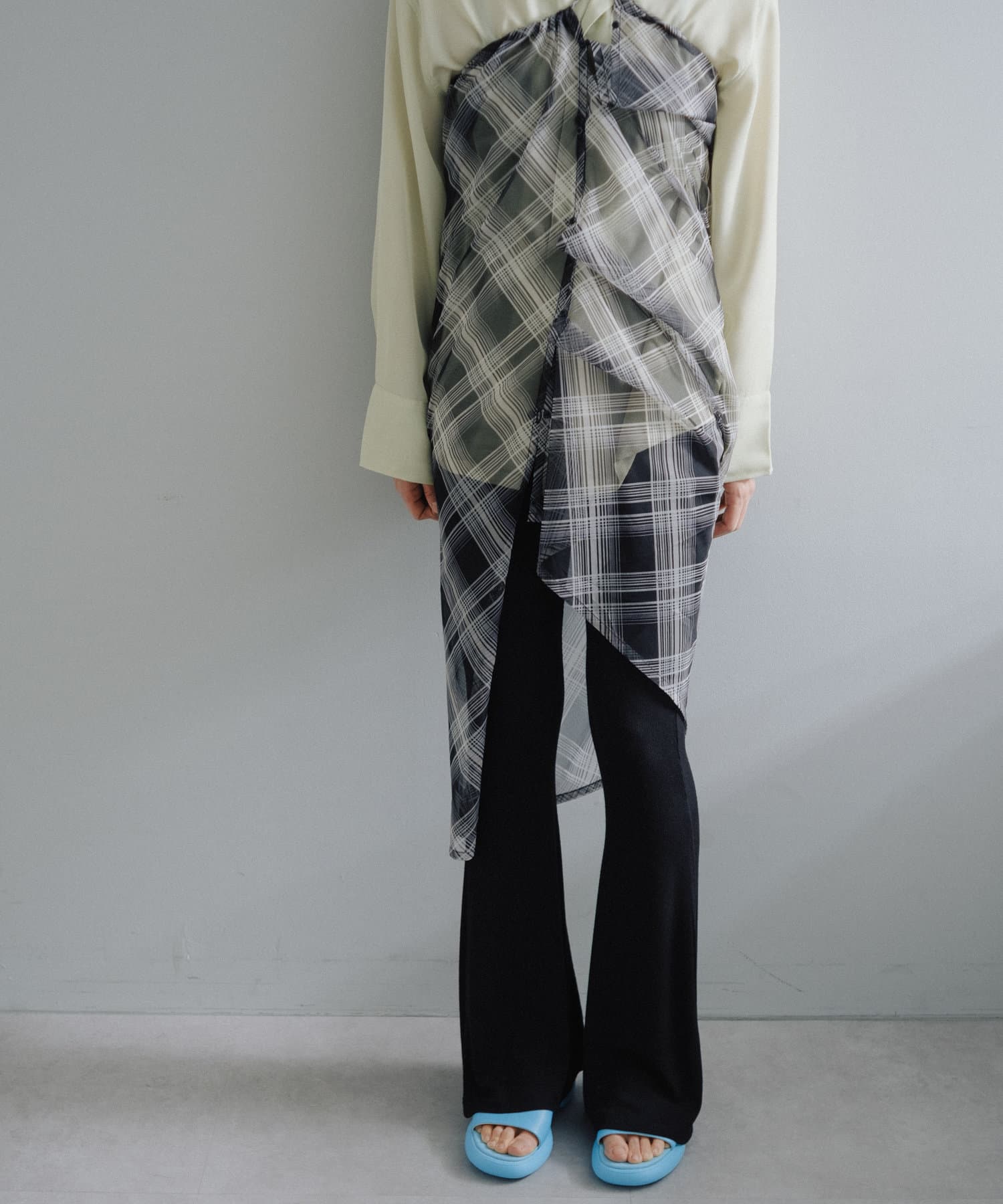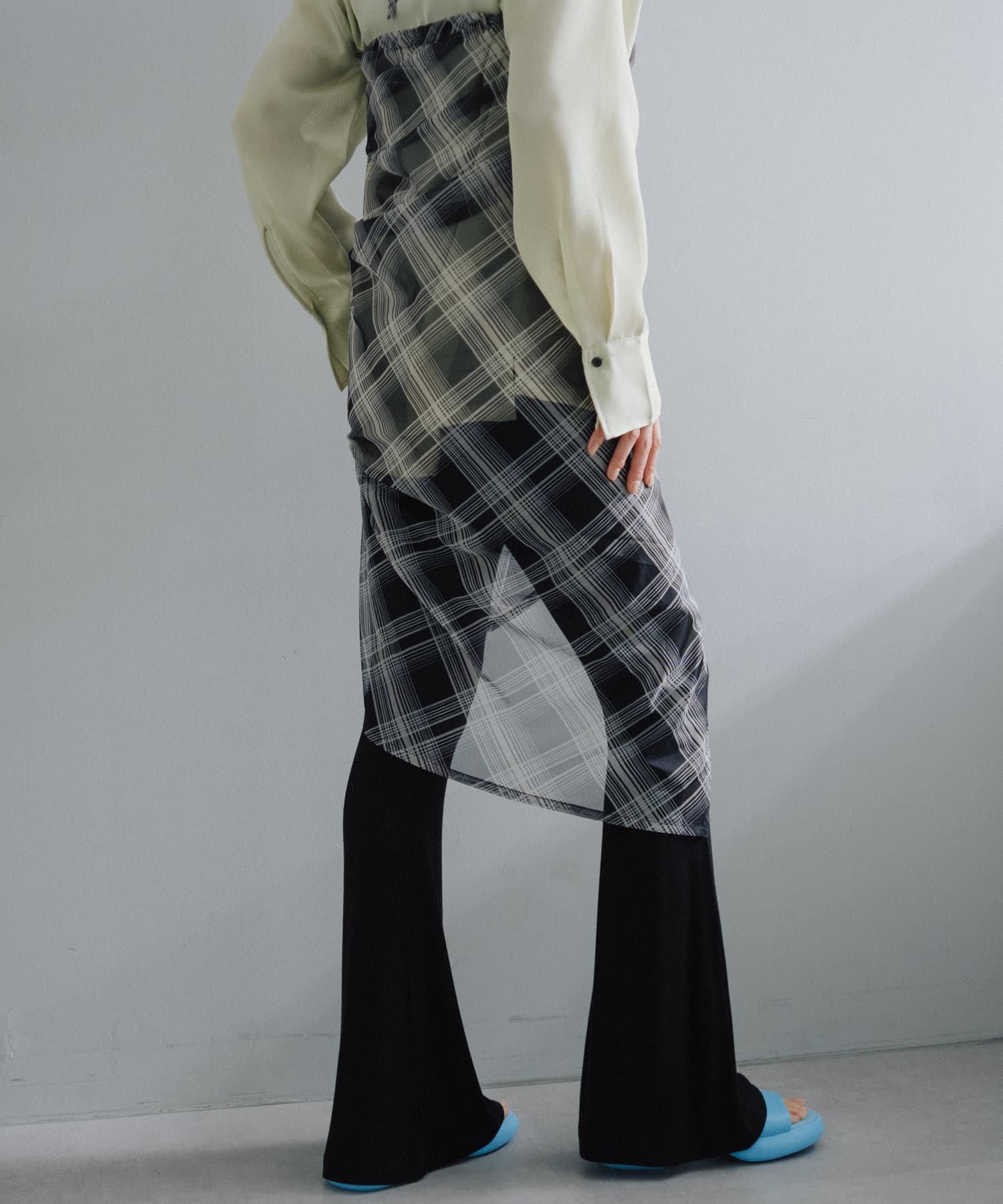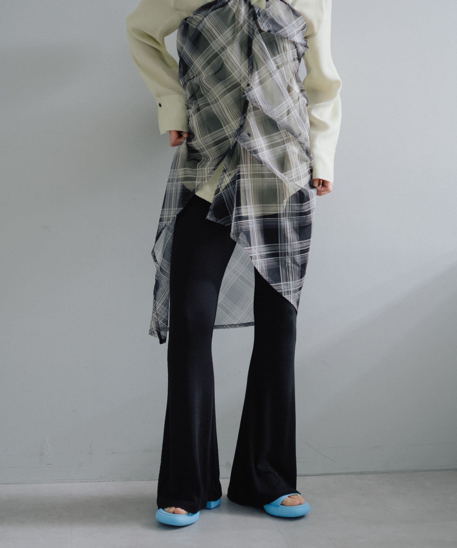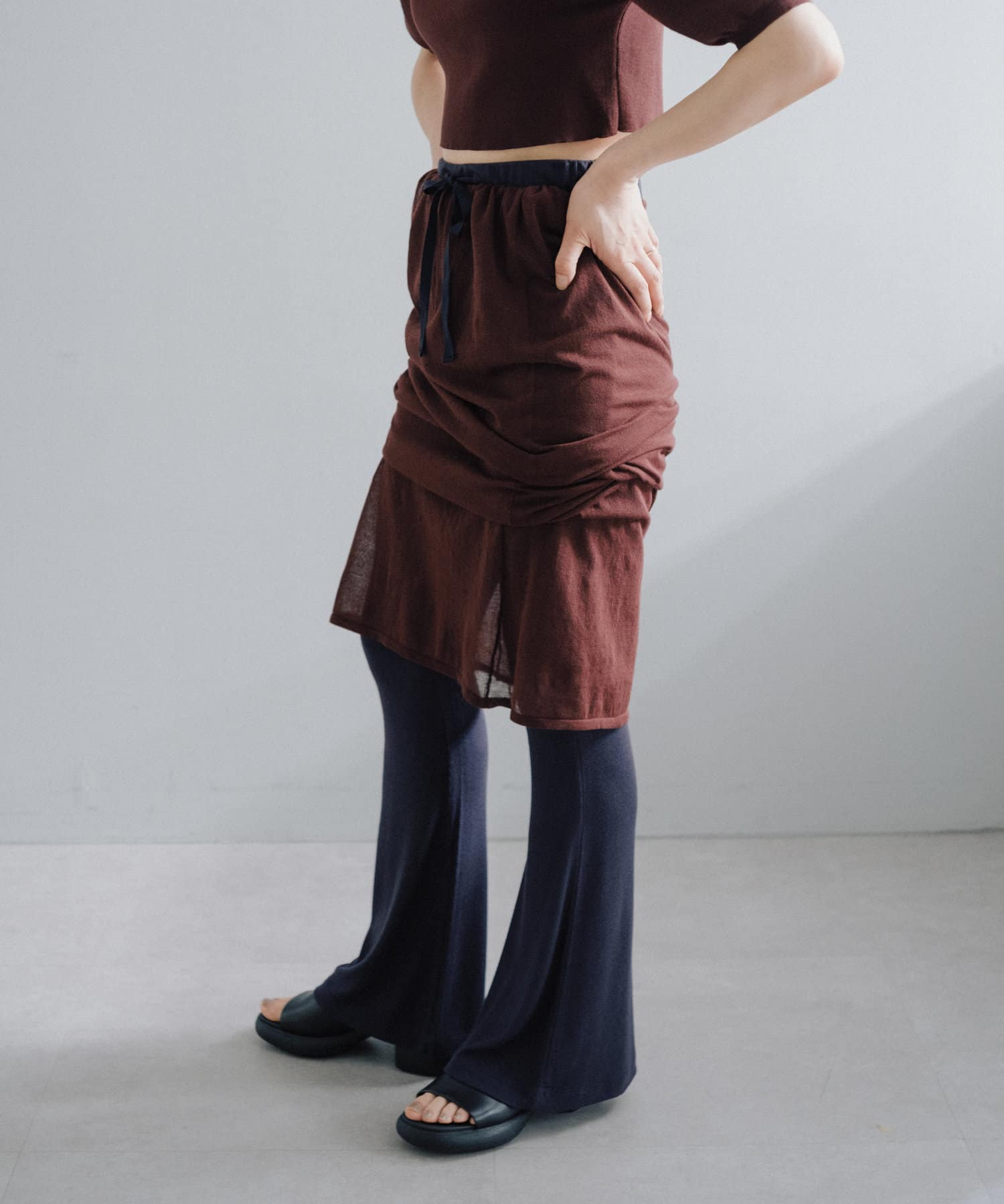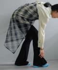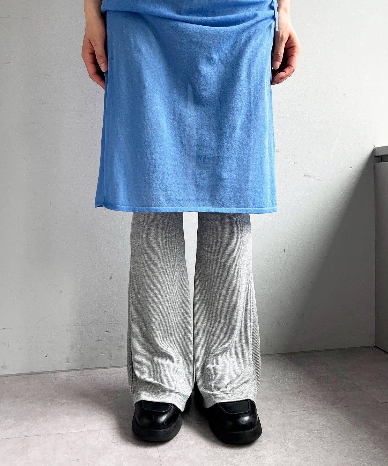 昨年からリリースしているSheer rib flared leggingsとの違いは、マチ(生地の切り替え)が入っていないこと、フレア分量が控えめなこと、アセテートと比べて光沢感が少ないので、カジュアルなスタイルにも馴染みやすく、よりデイリーユースなアイテムとして、非常に使い勝手の良い1本です。