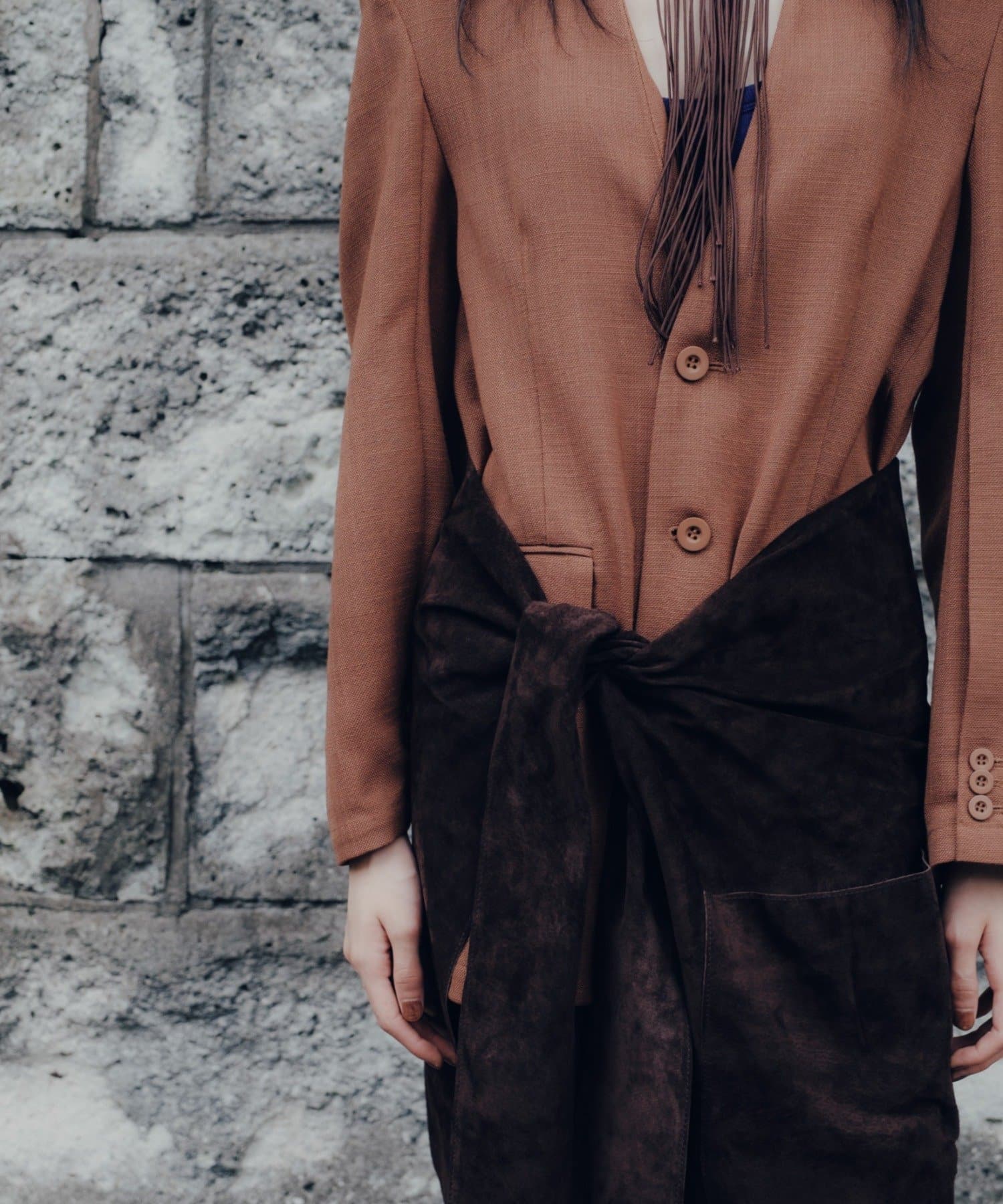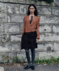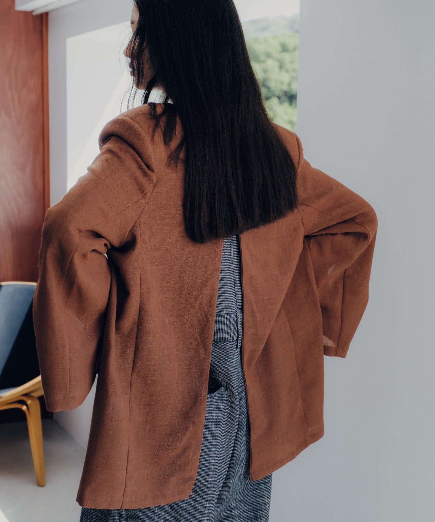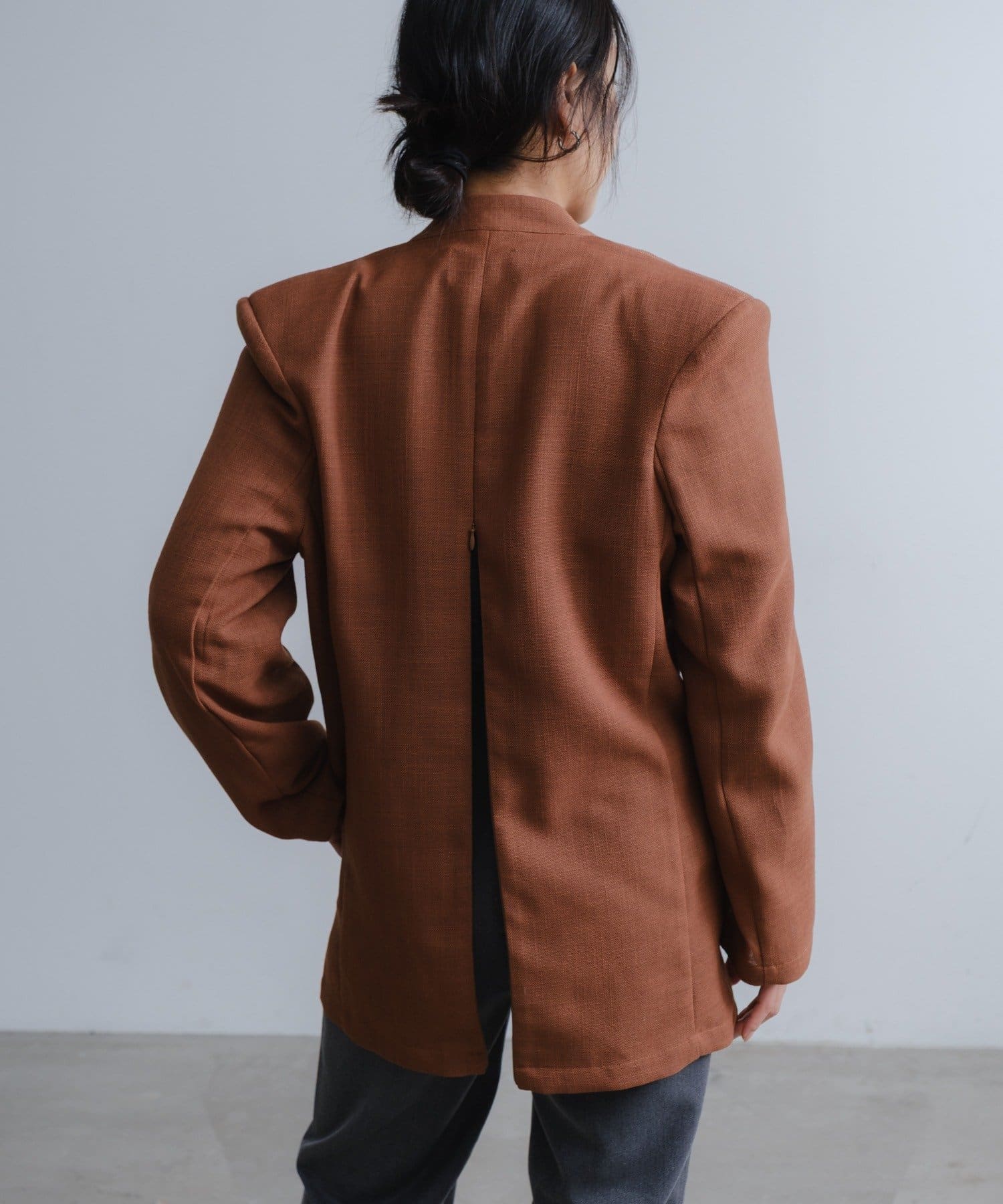 裏地を無くして1枚仕立てにしたので、風通しが格段に良くなりました。背面は背中心のファスナーで裾がスリット開きになる仕組み。インナー選びが楽しい1着です。