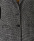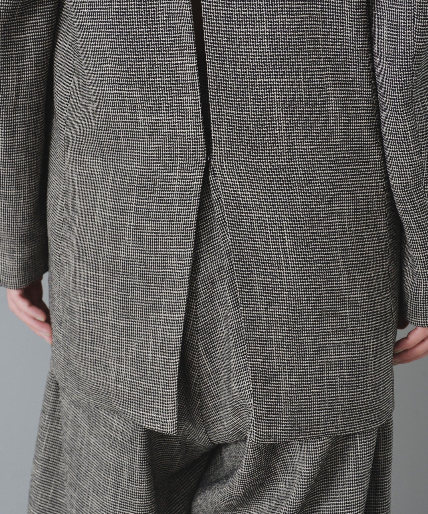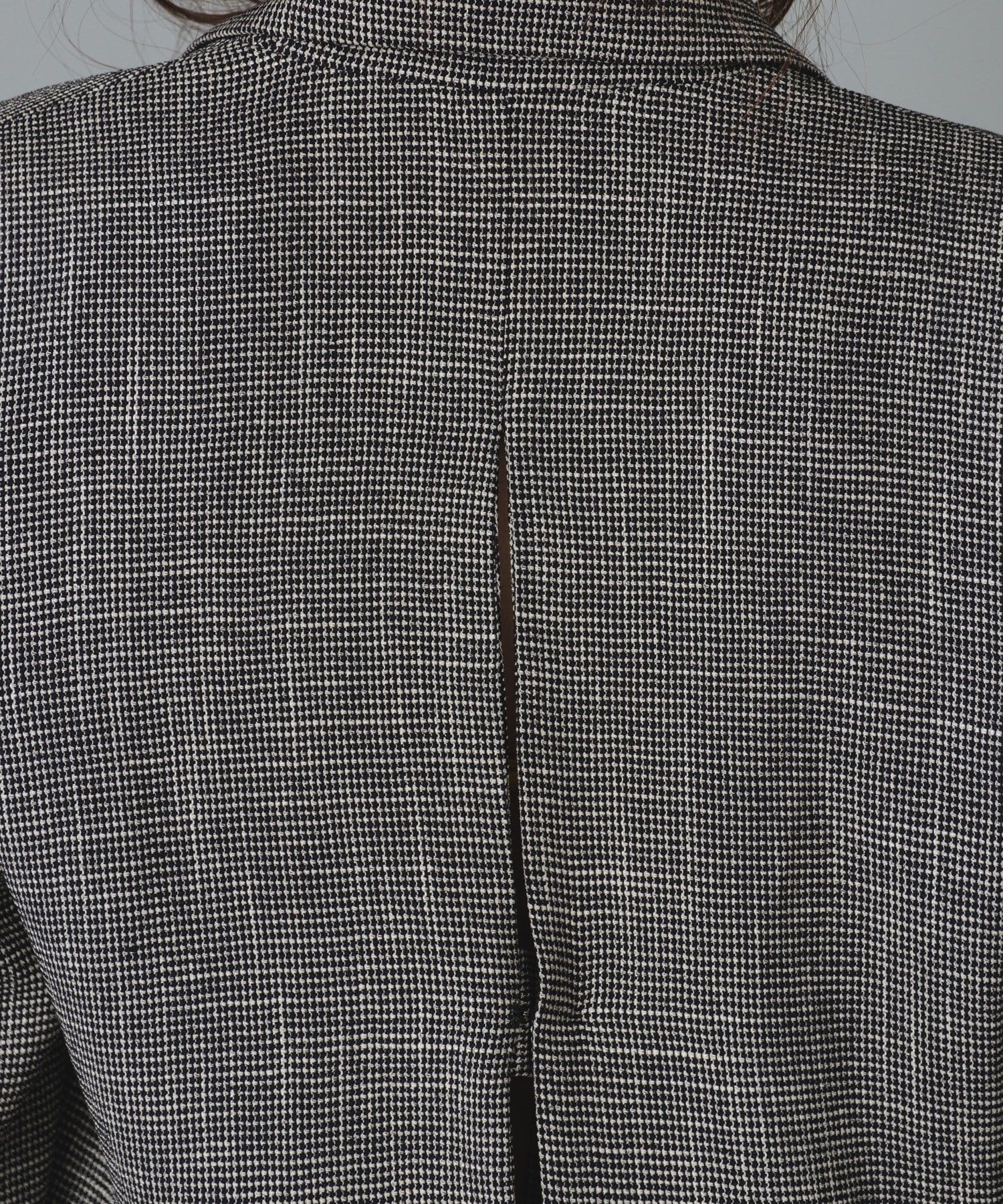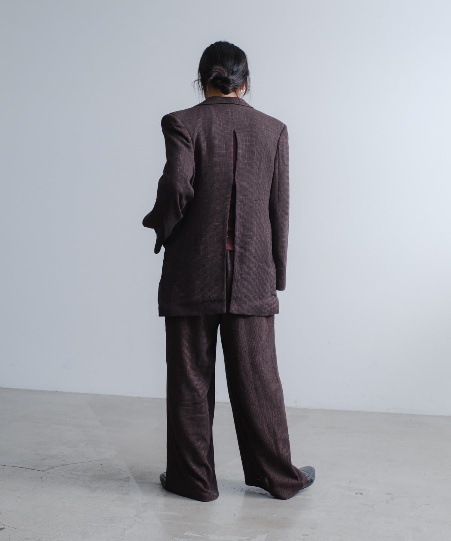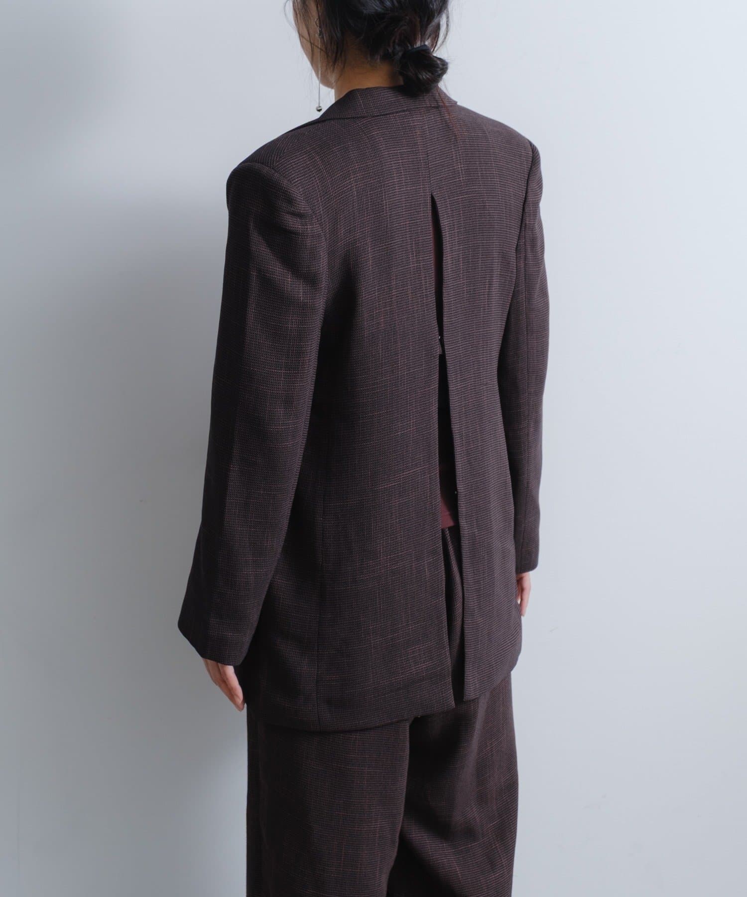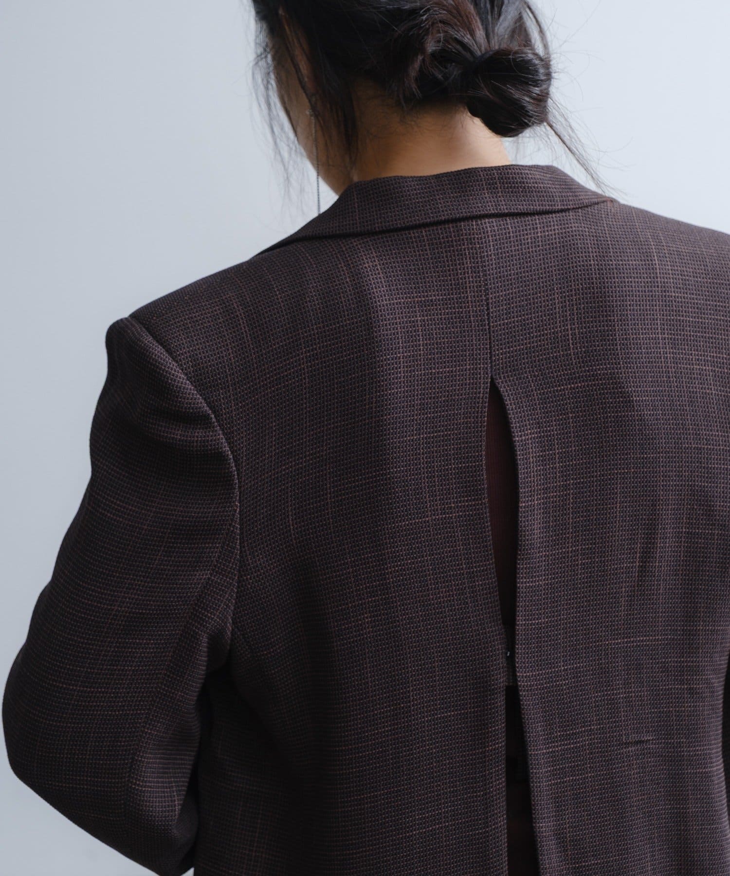背中にはデザインポイントとして大きなスリットあきを入れており、ホックとタブで開け閉めしてサイズ感を調整していただけるので、窮屈感が苦手な方にも安心して着用いただけます。スリットあきからちらっと見えるインナー選びも楽しめます。