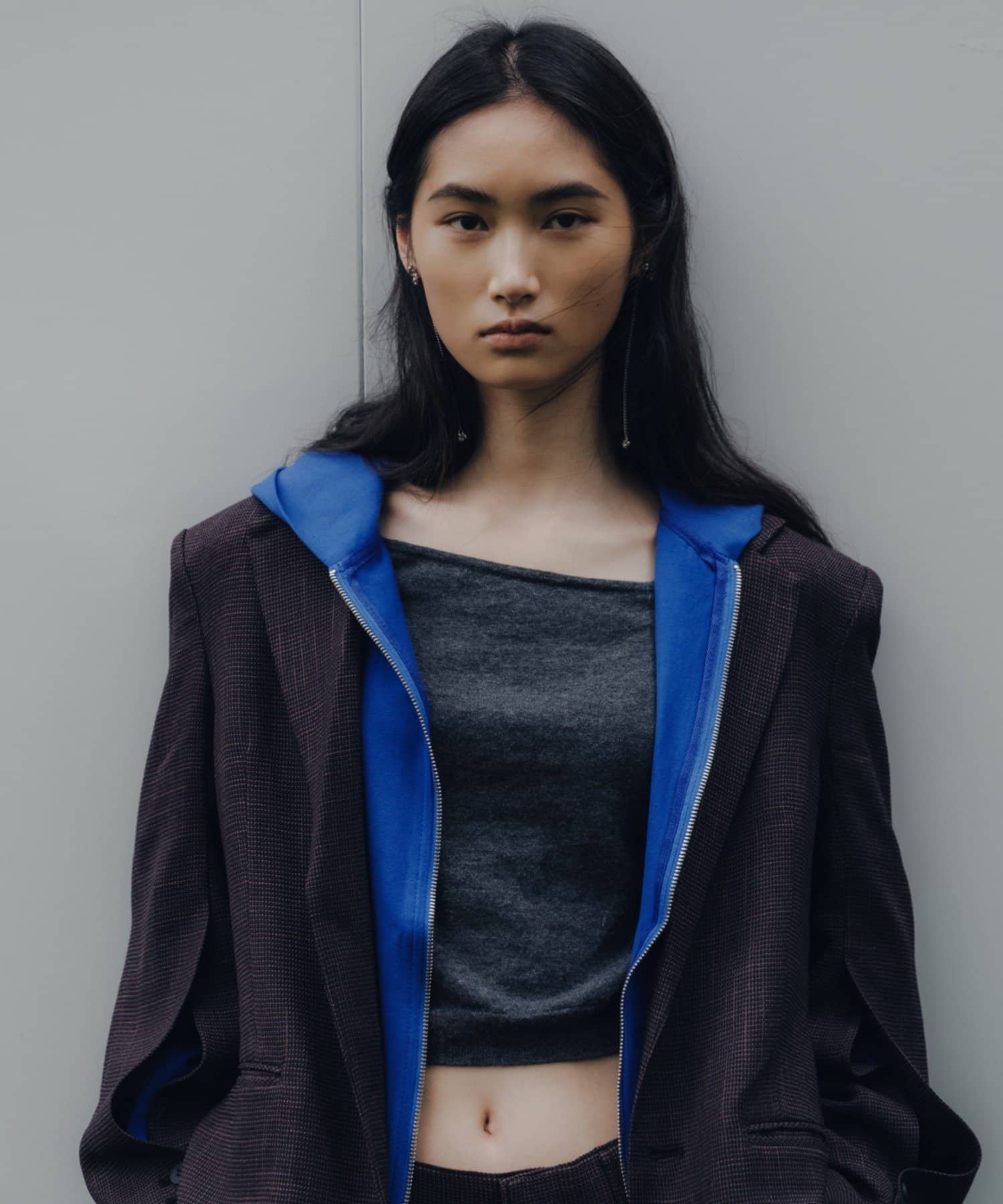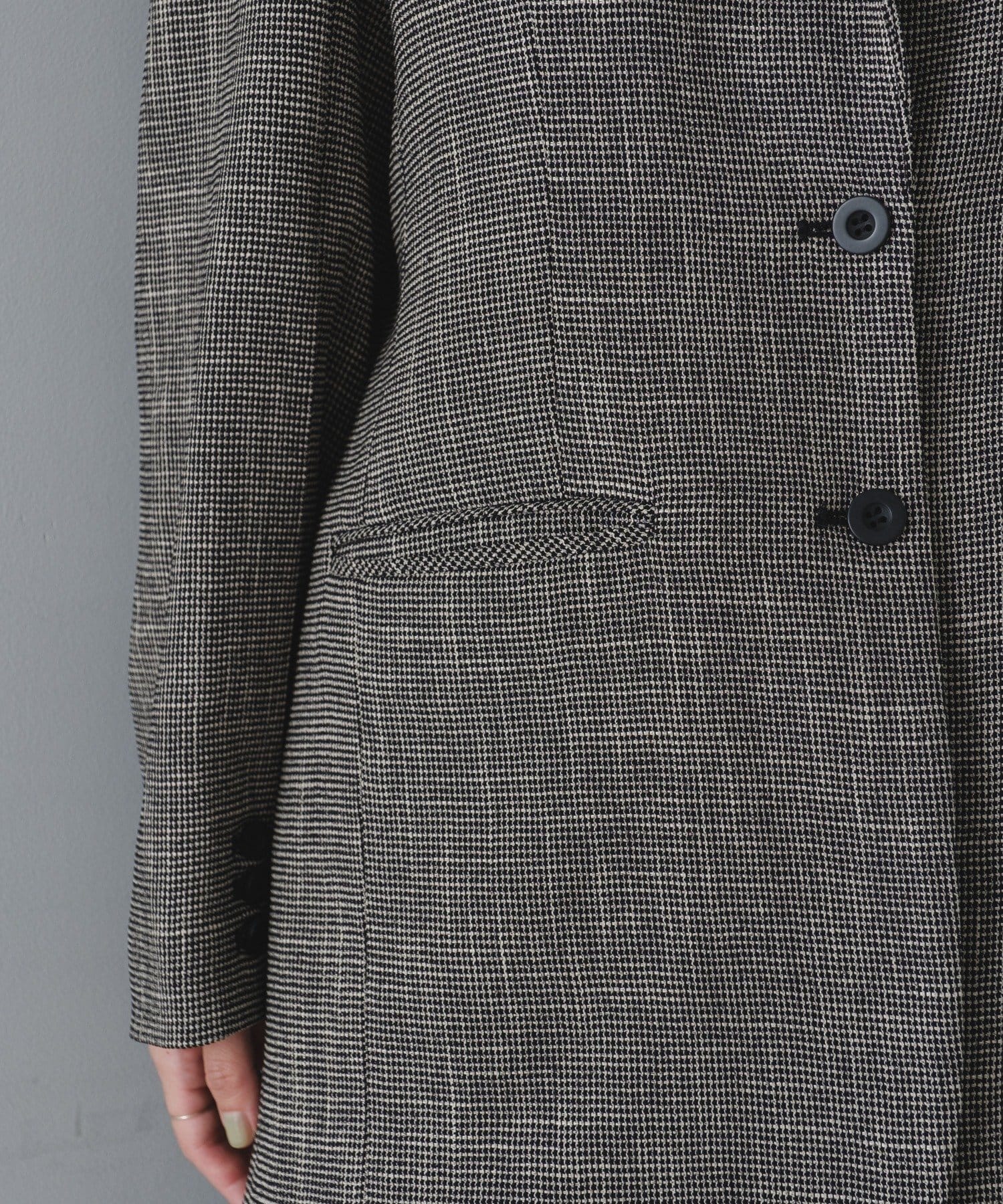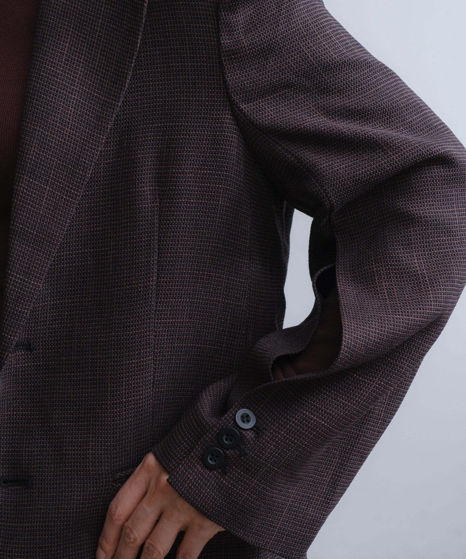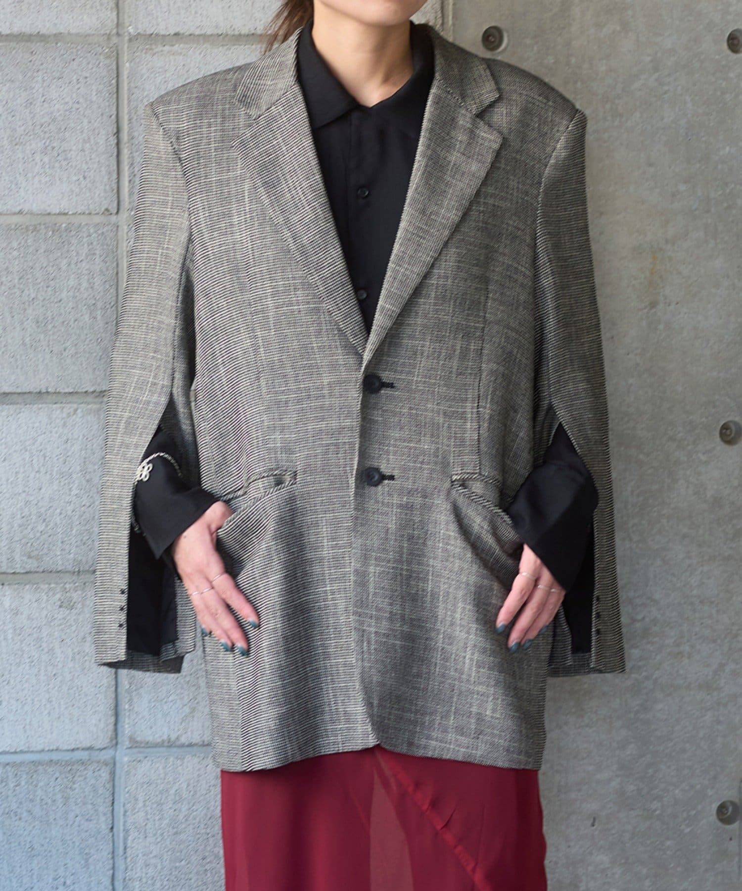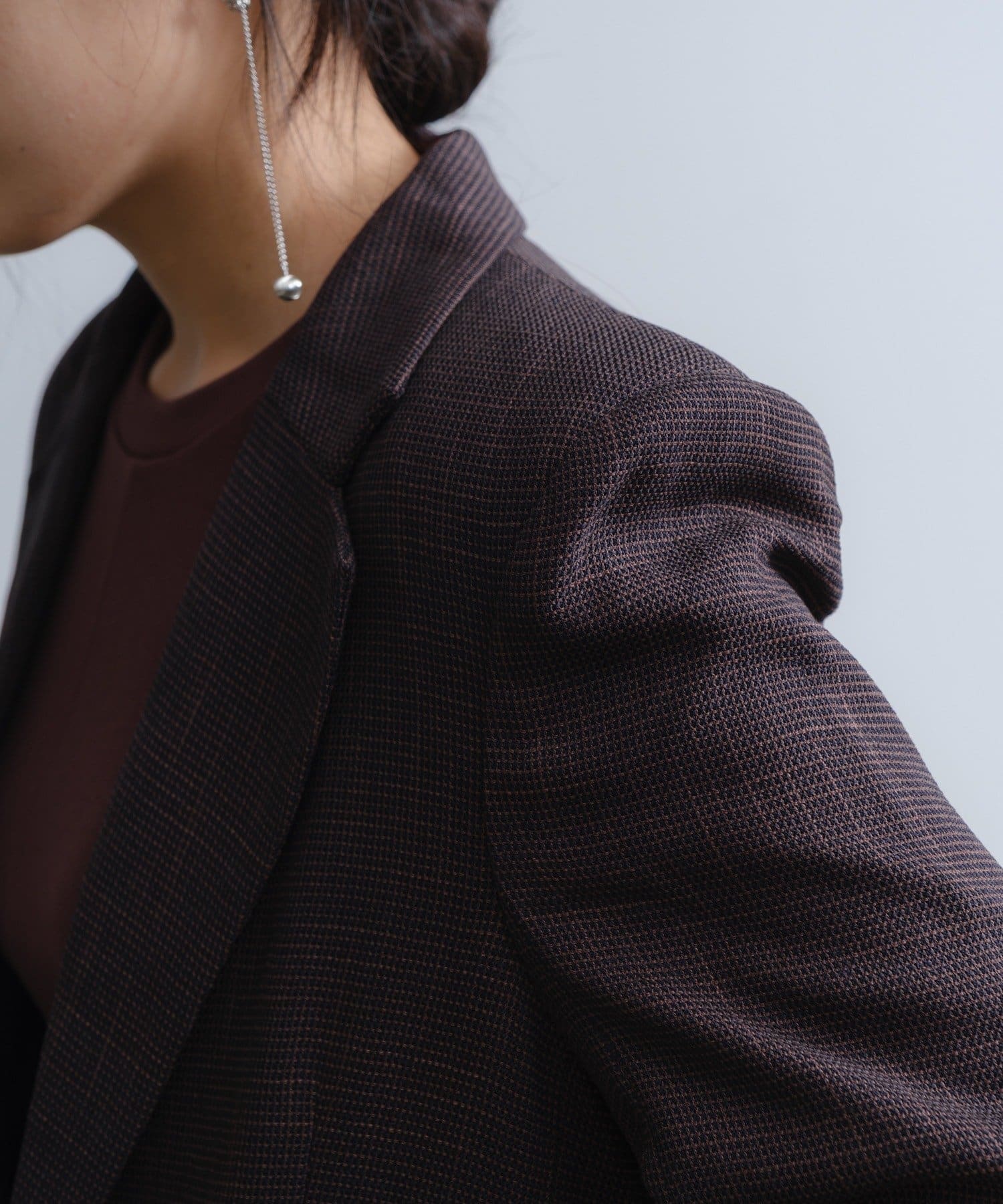 肩パッドの形、袖付きの角度、アームの刳りの深さを調整して、ボディラインをよりシャープに見せられるシルエットづくりに1番拘りました。