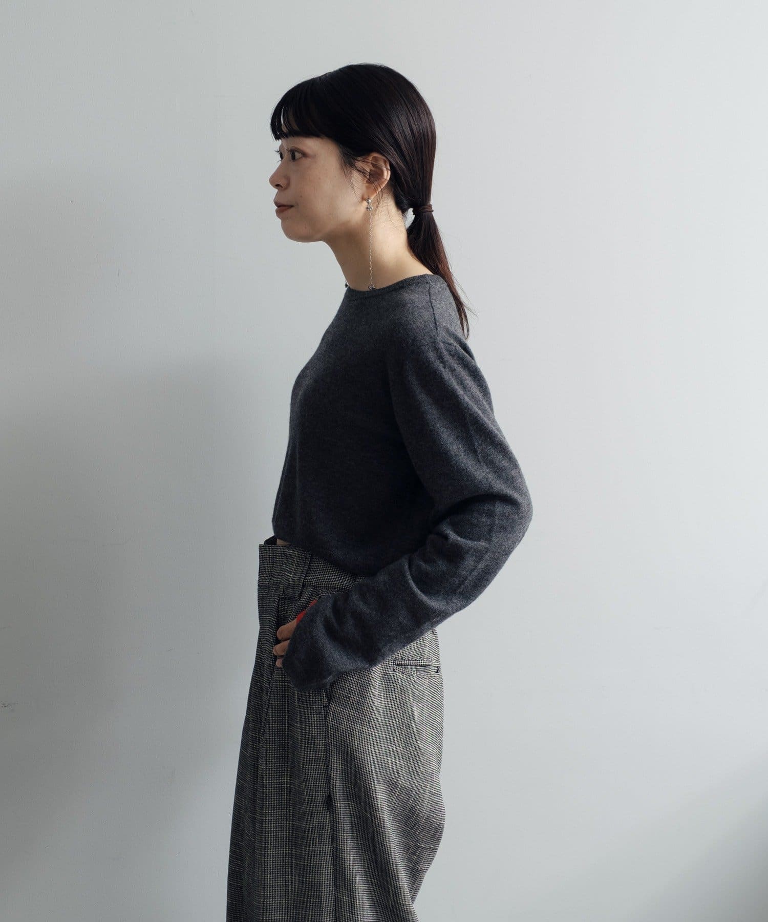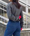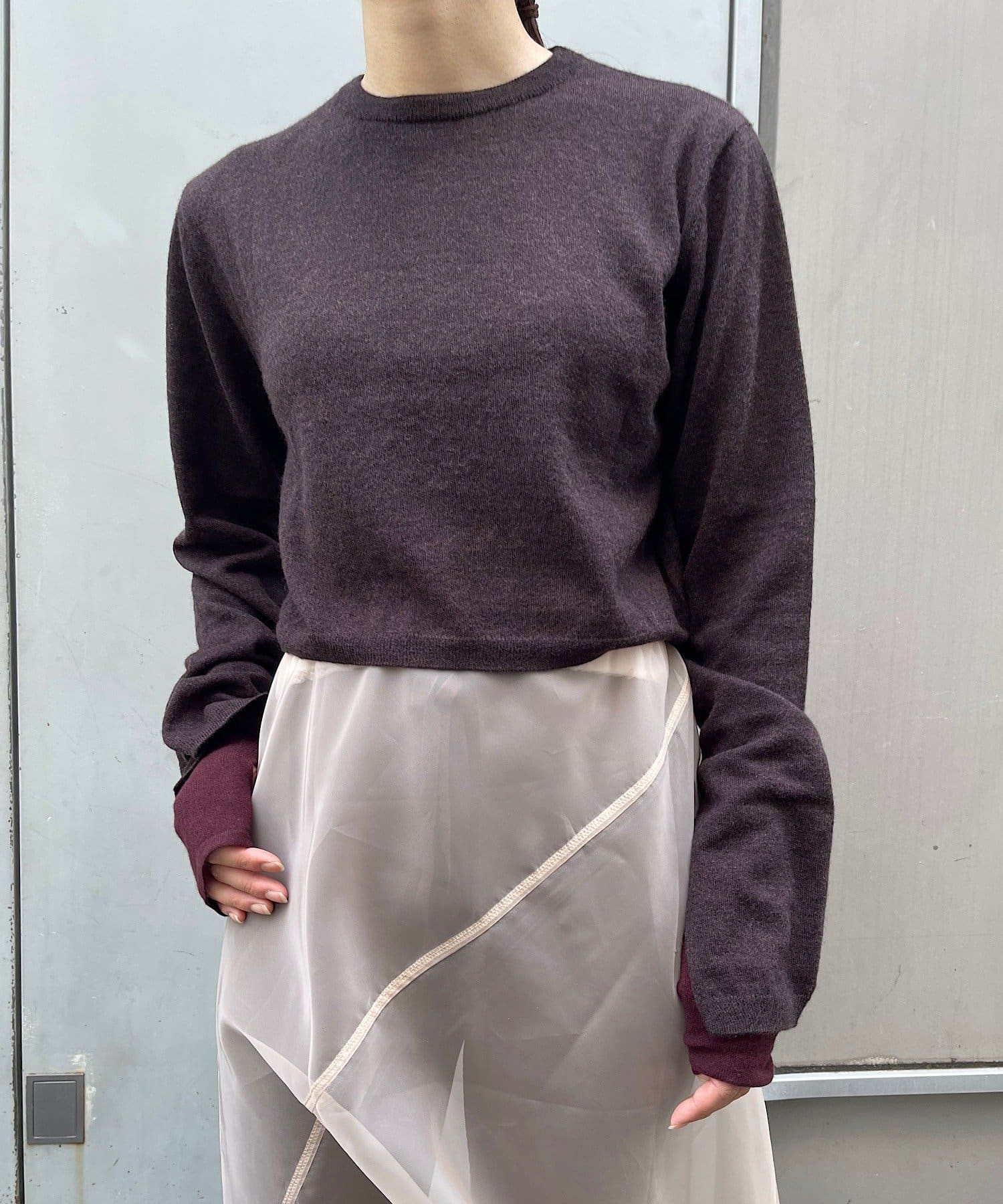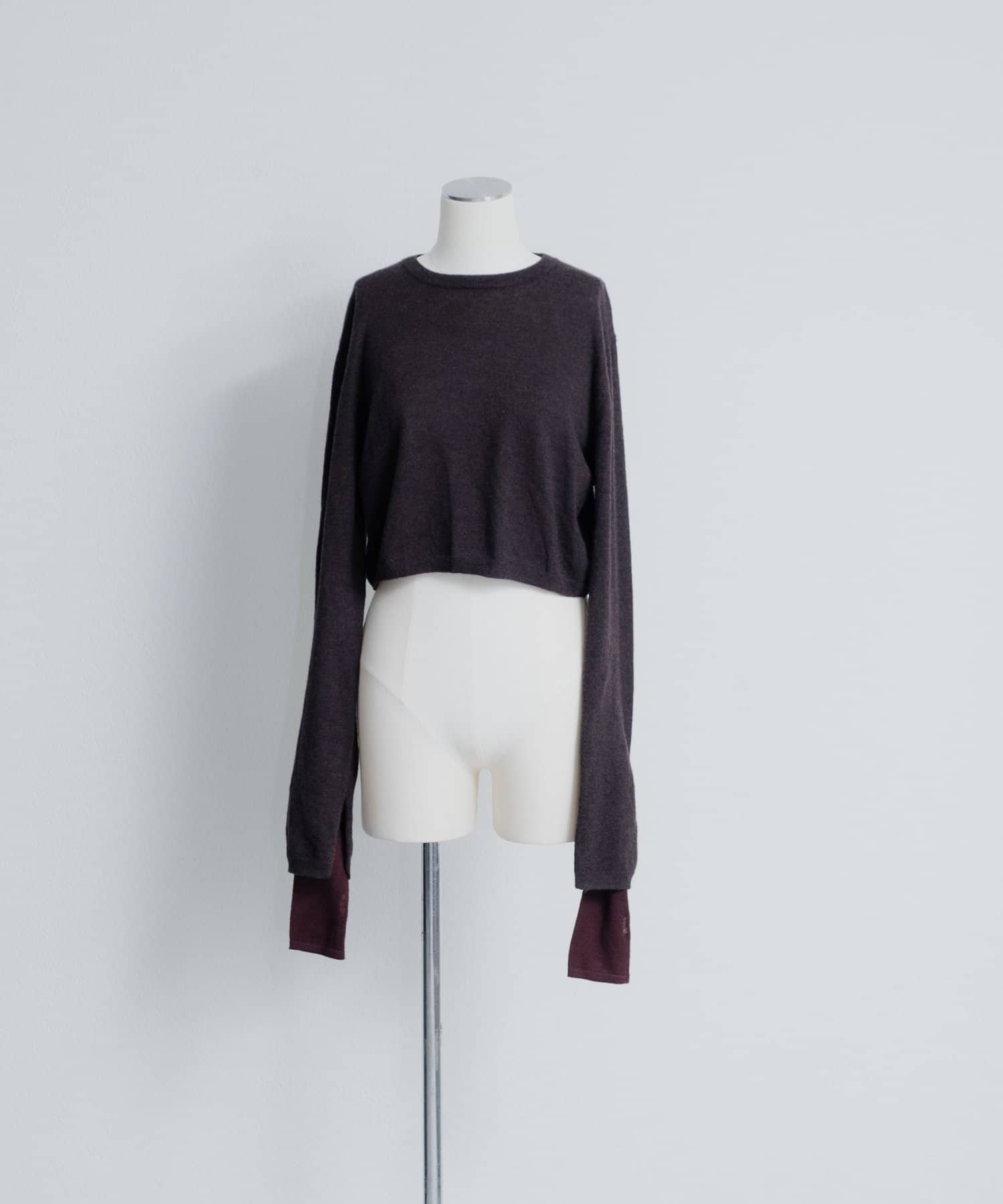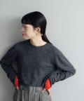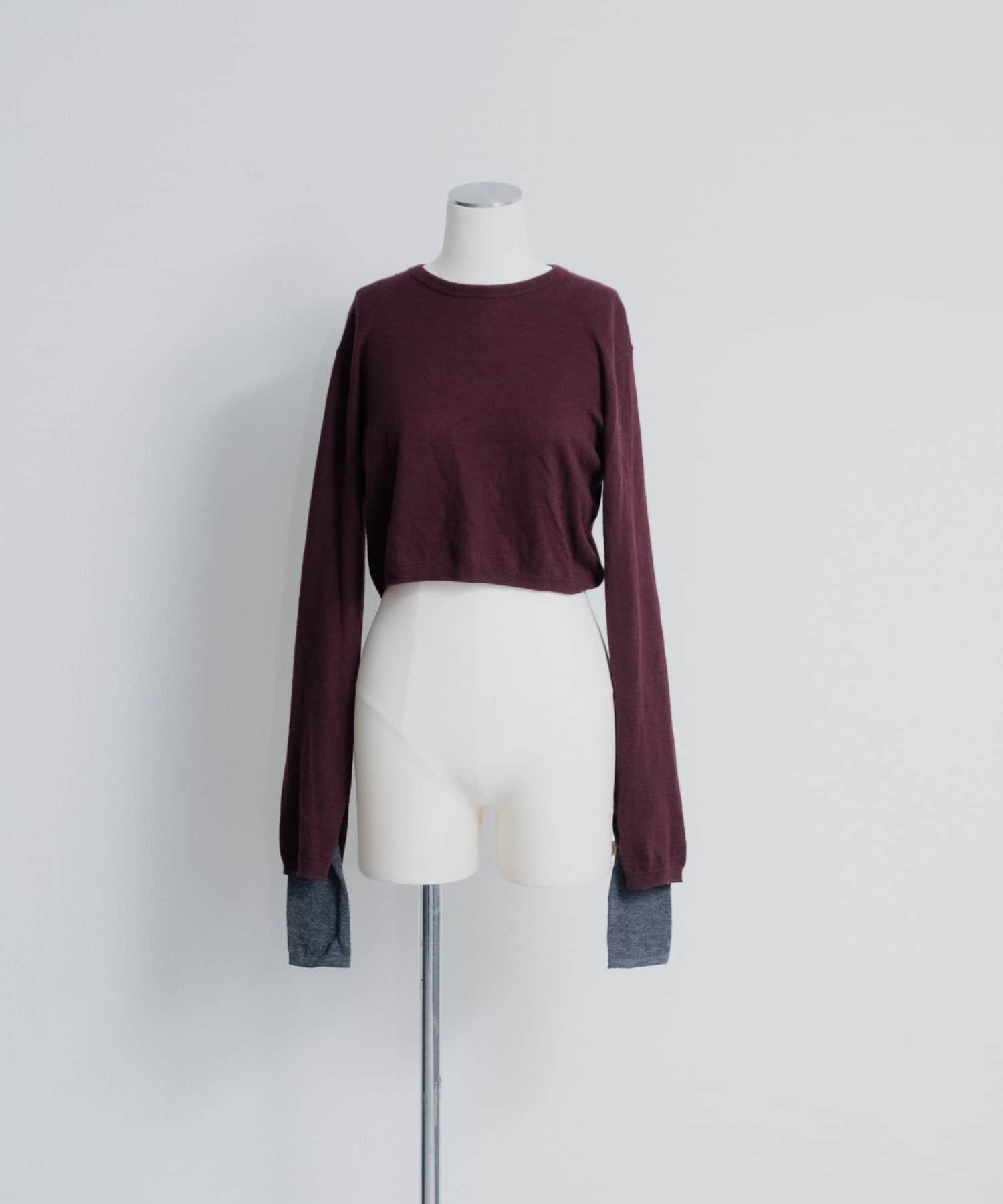 素肌に当ててもチクチクしにくく、気持ちの良いソフトな肌触りのウール100%の糸を使用した、ハイゲージの天竺編みのクロップドニット。重ねて使える配色の付け袖ニットをSETにしました。