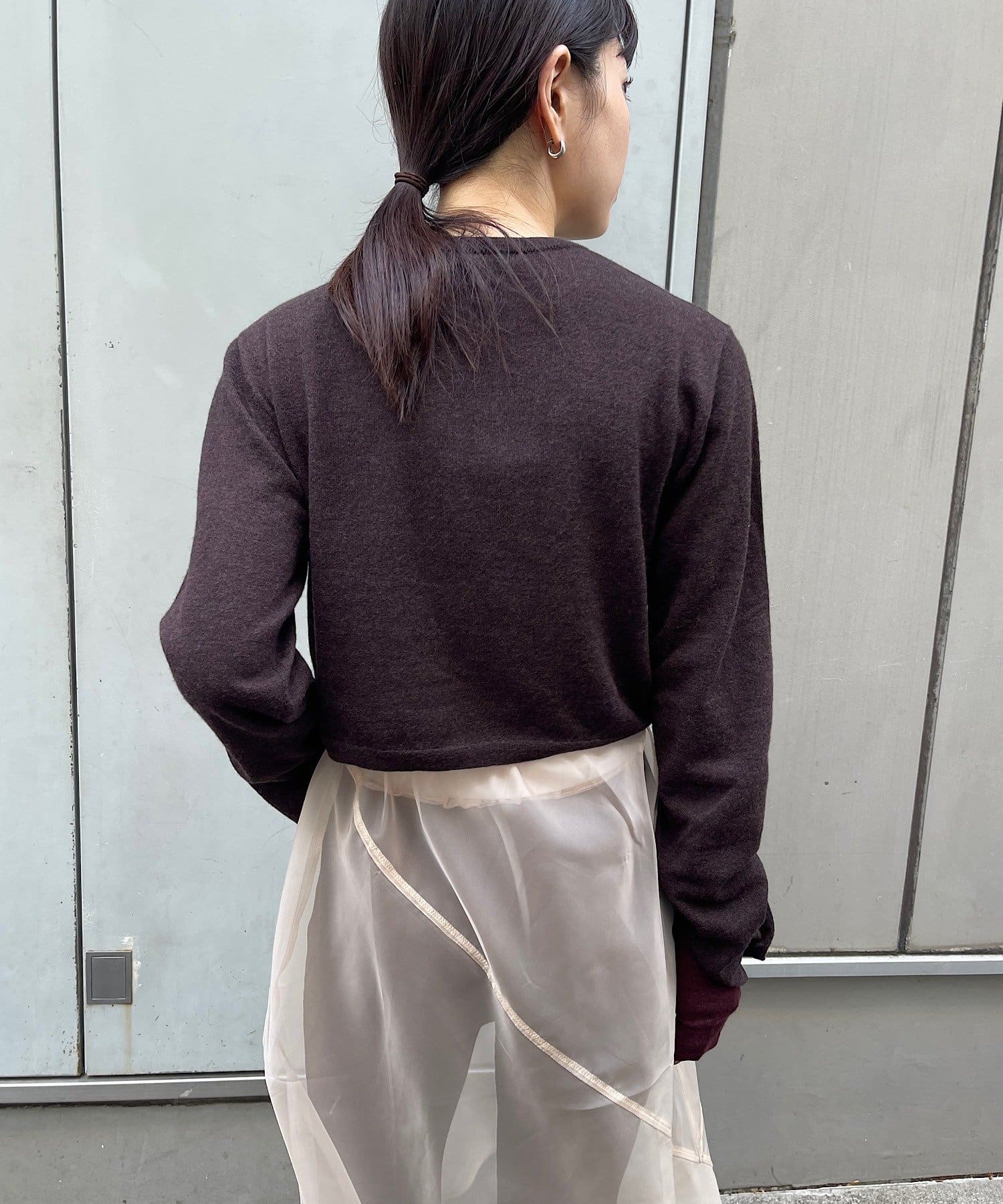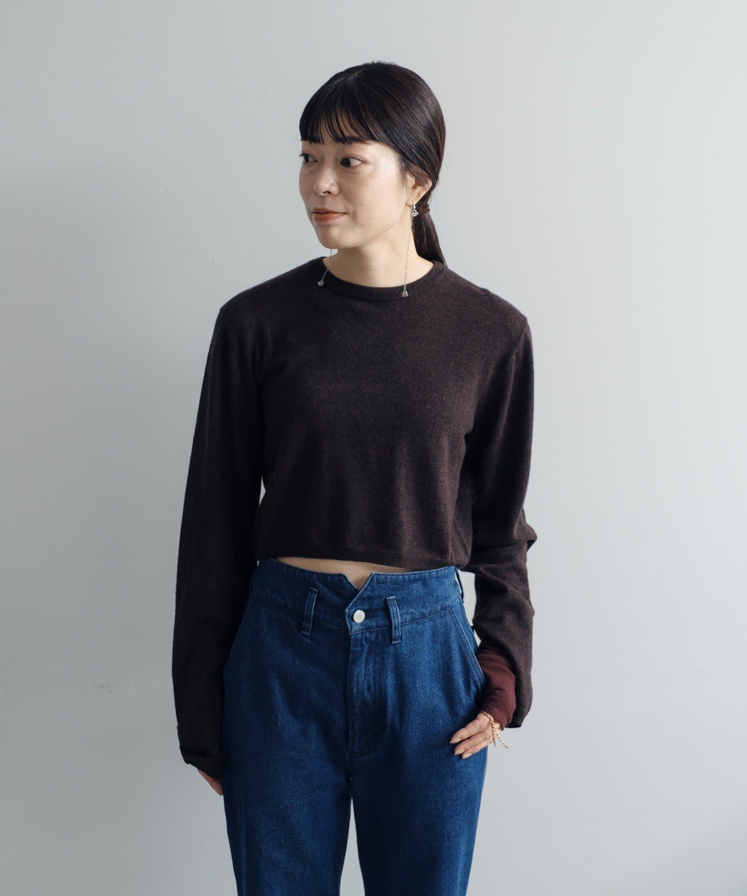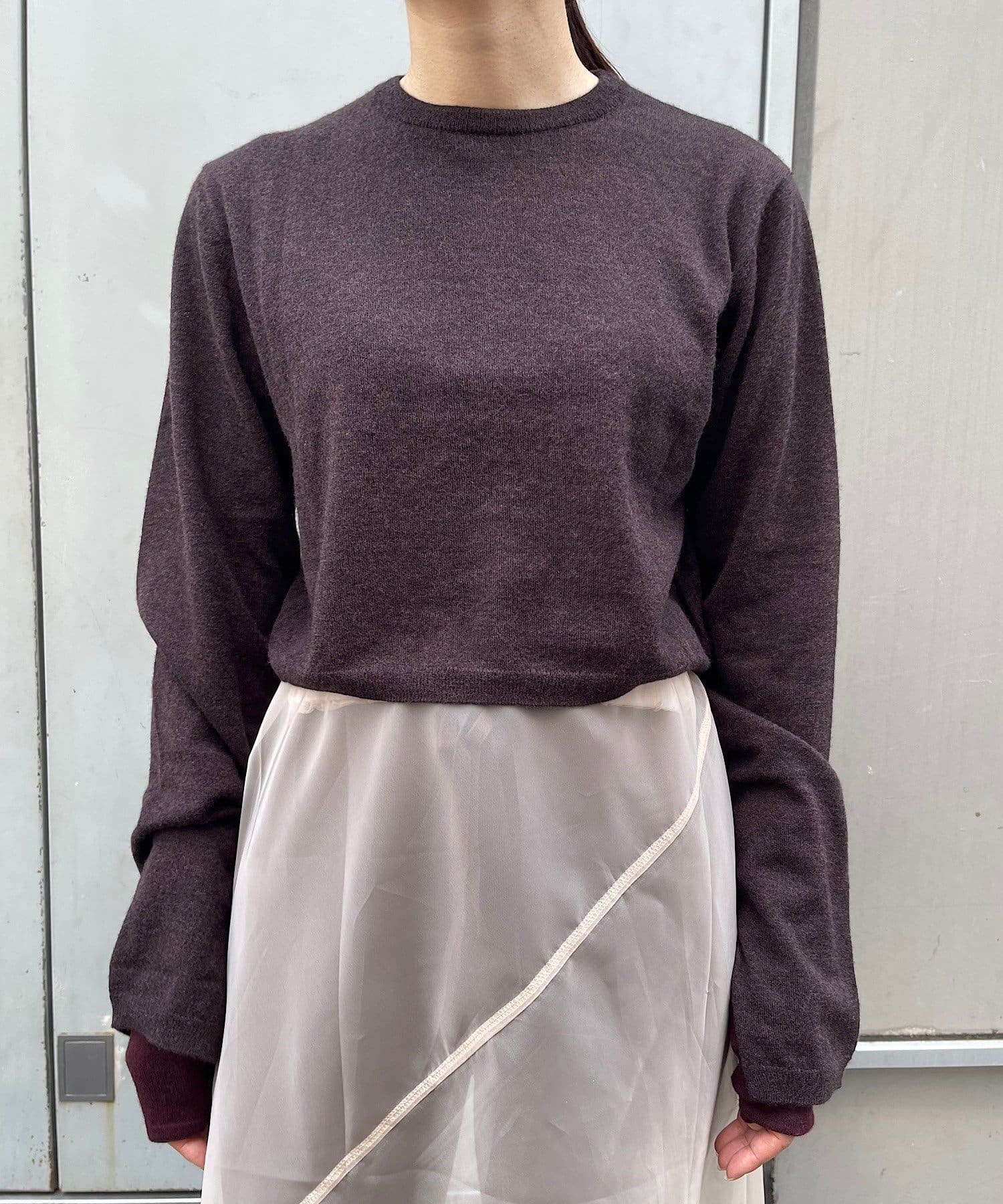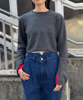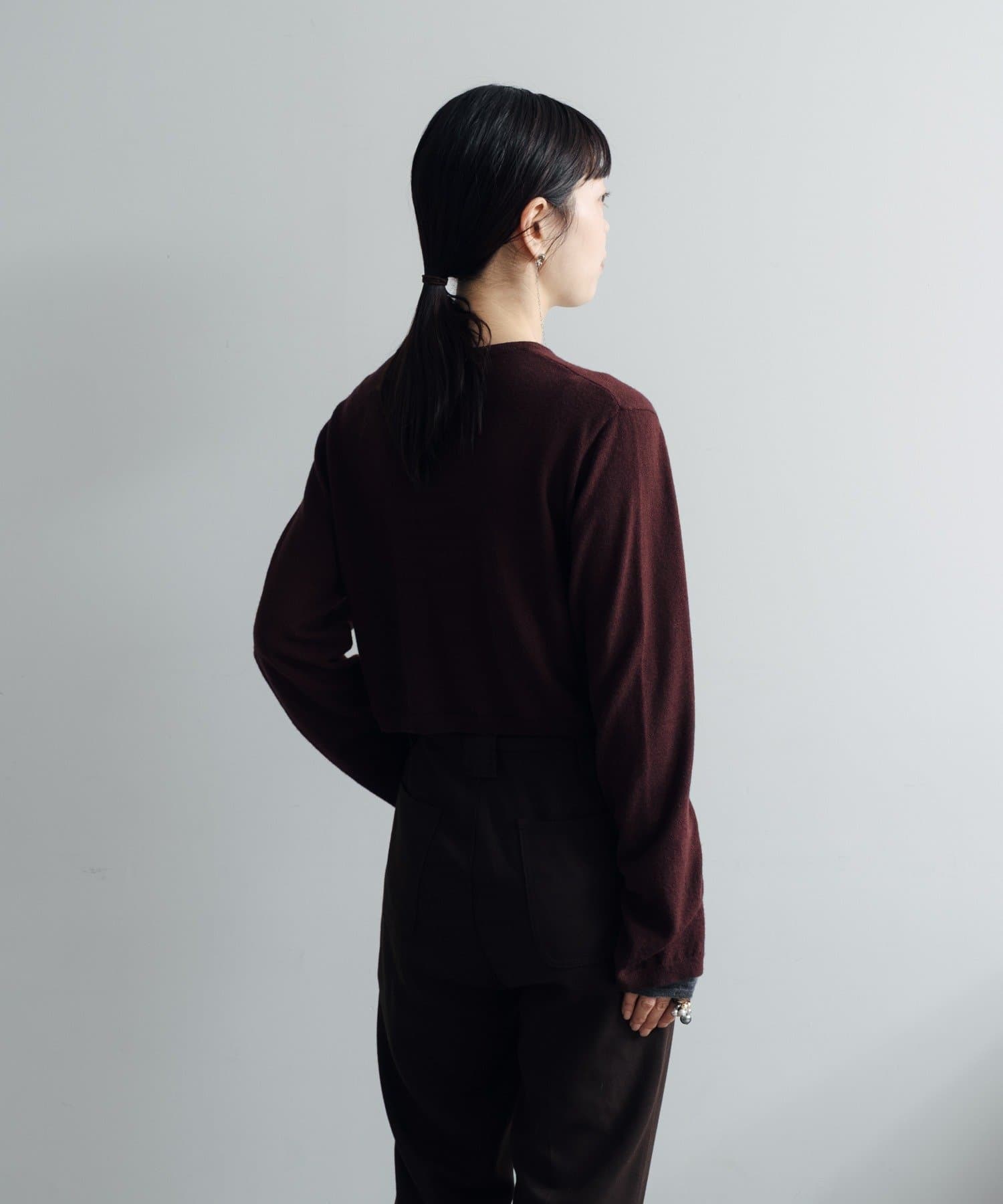 素肌に当ててもチクチクしにくく、気持ちの良いソフトな肌触りのウール100%の糸を使用した、ハイゲージの天竺編みのクロップドニット。重ねて使える配色の付け袖ニットをSETにしました。
