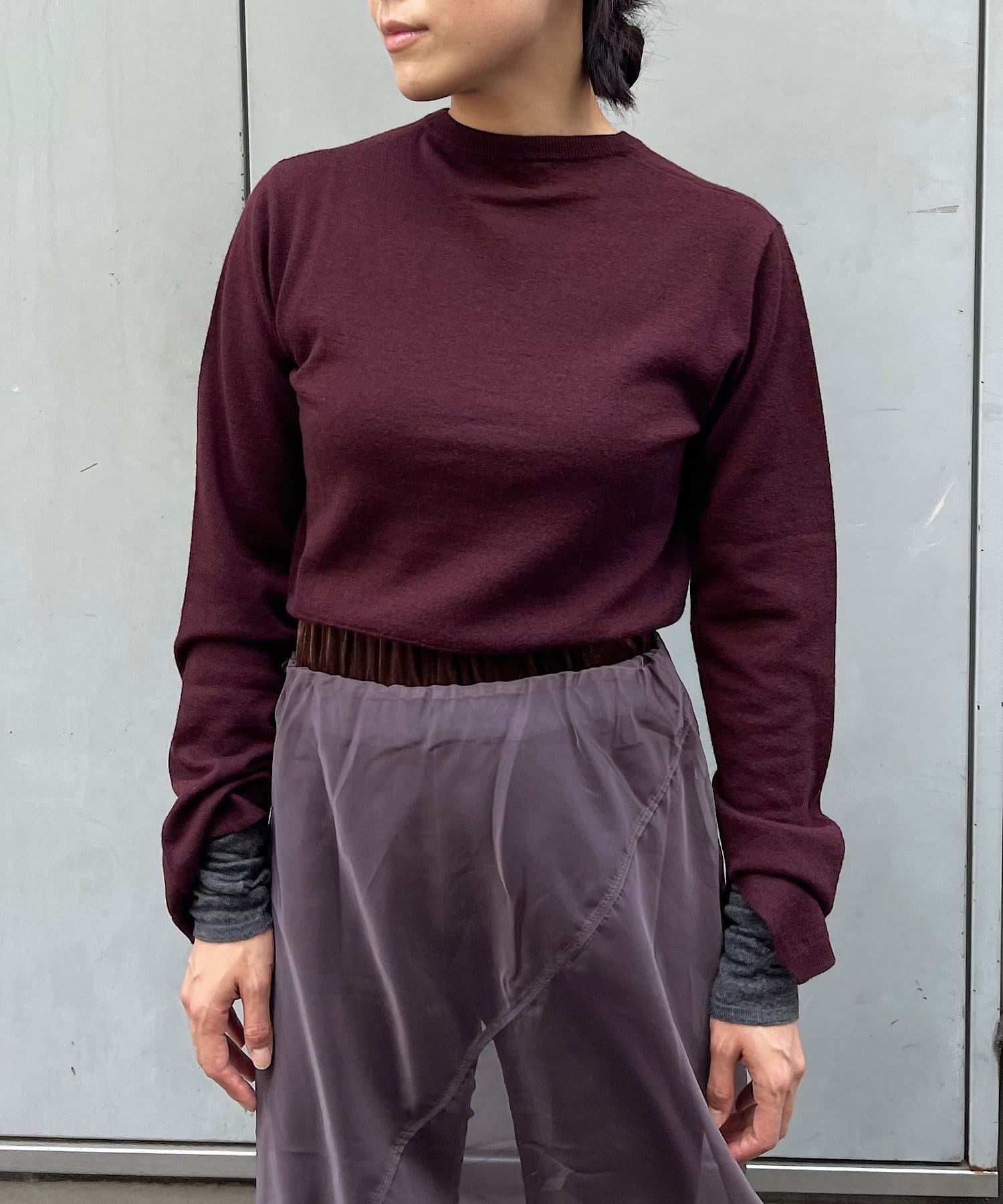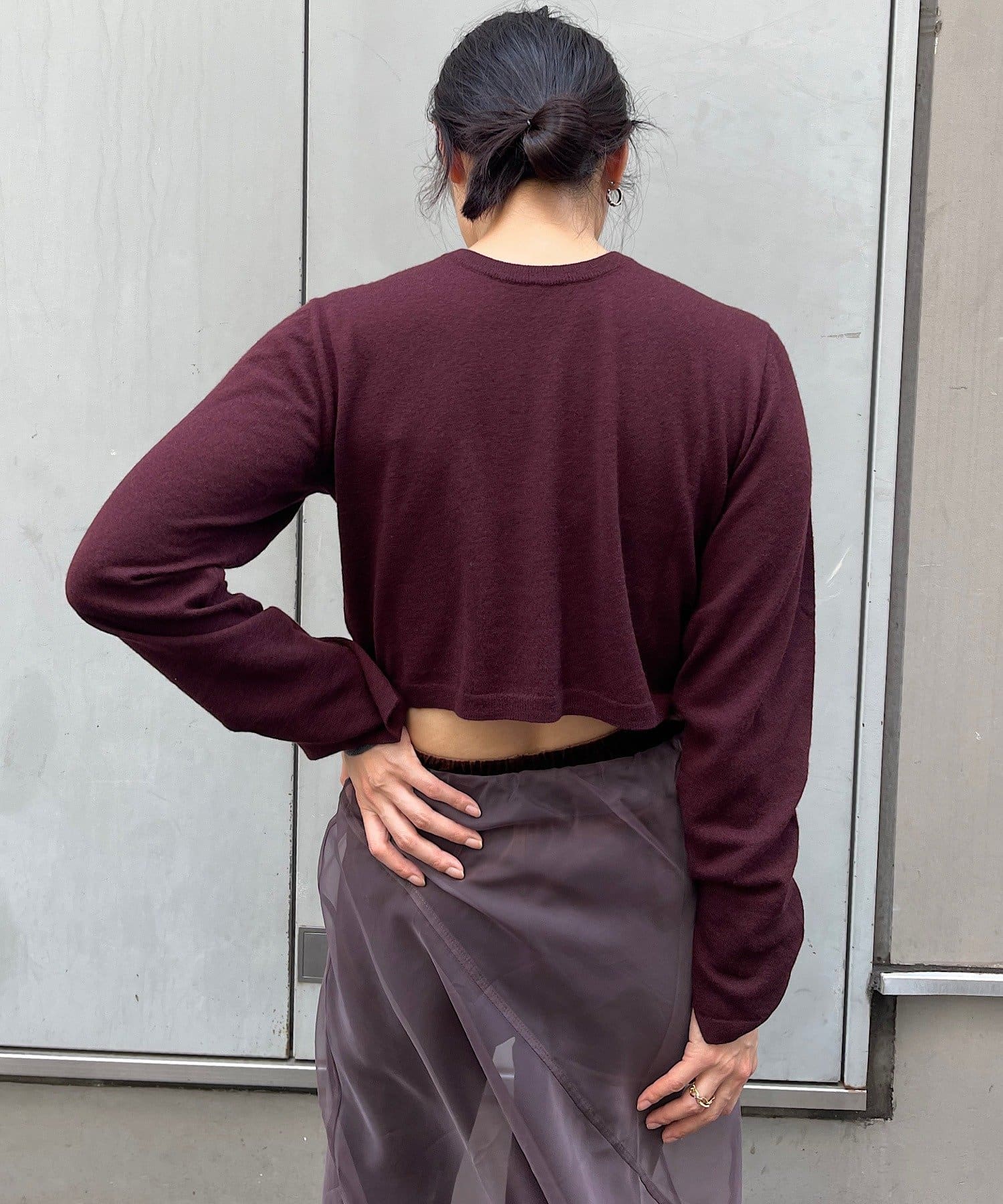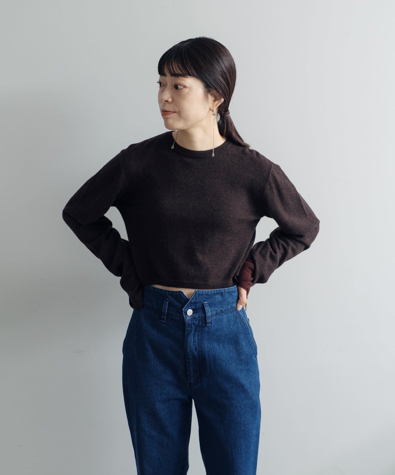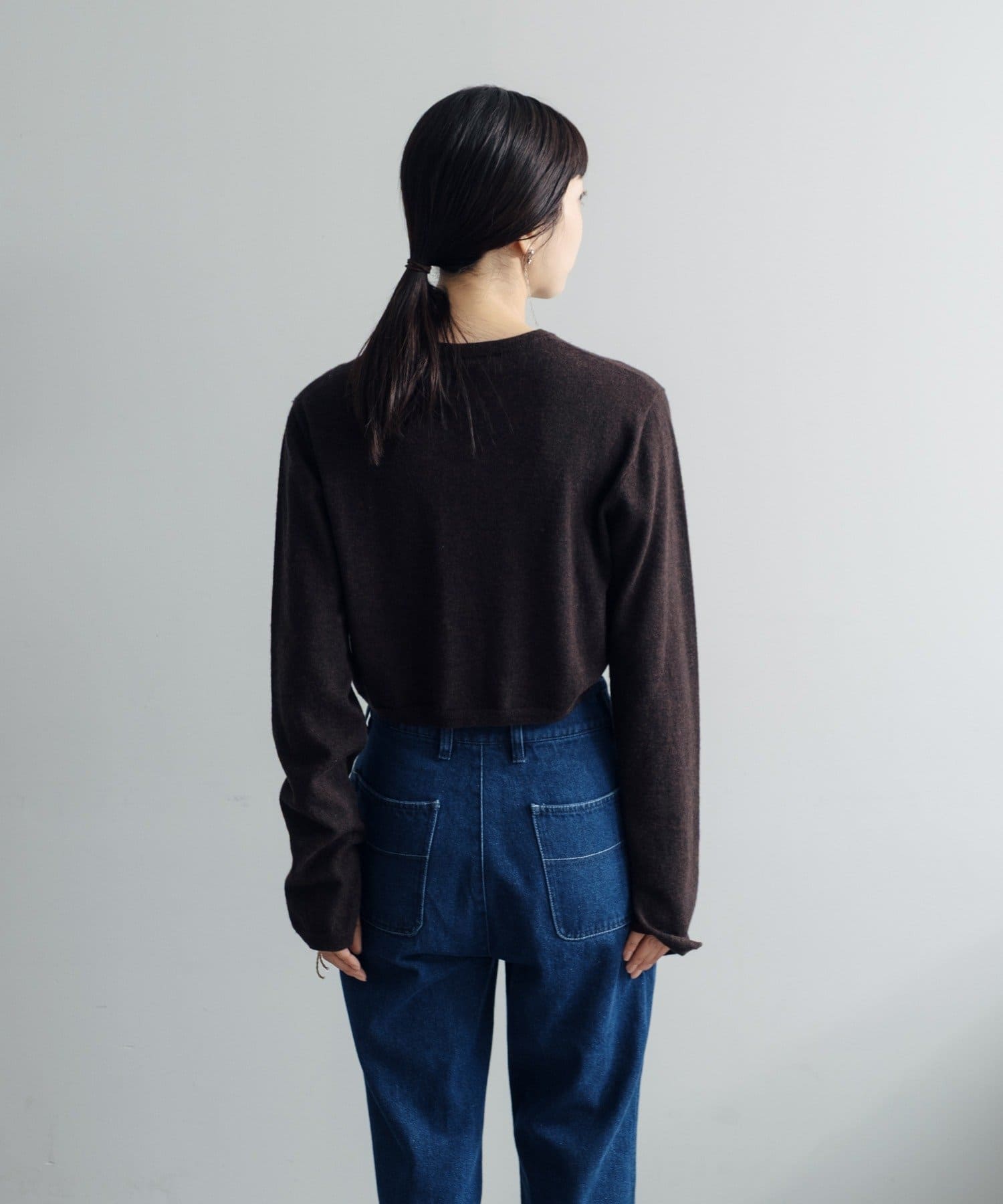 素肌に当ててもチクチクしにくく、気持ちの良いソフトな肌触りのウール100%の糸を使用した、ハイゲージの天竺編みのクロップドニット。重ねて使える配色の付け袖ニットをSETにしました。