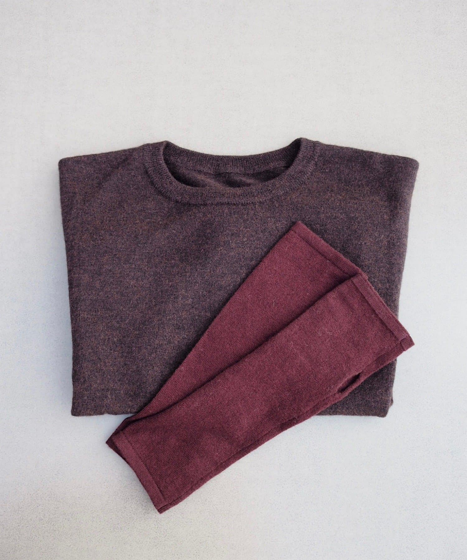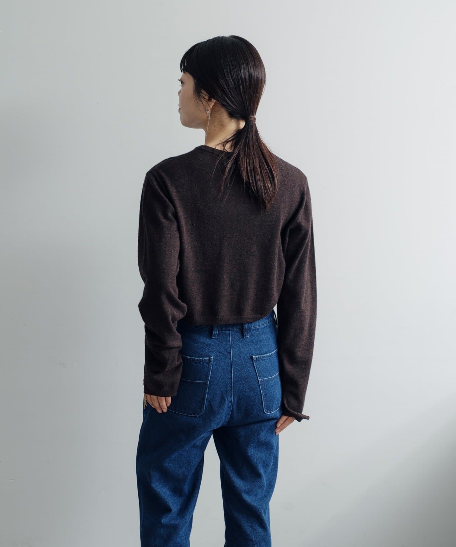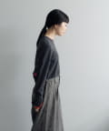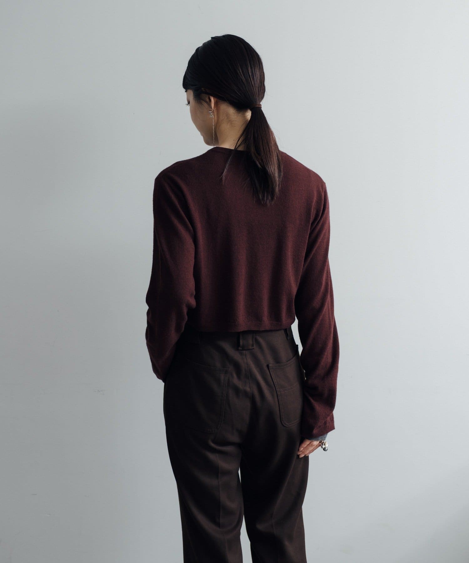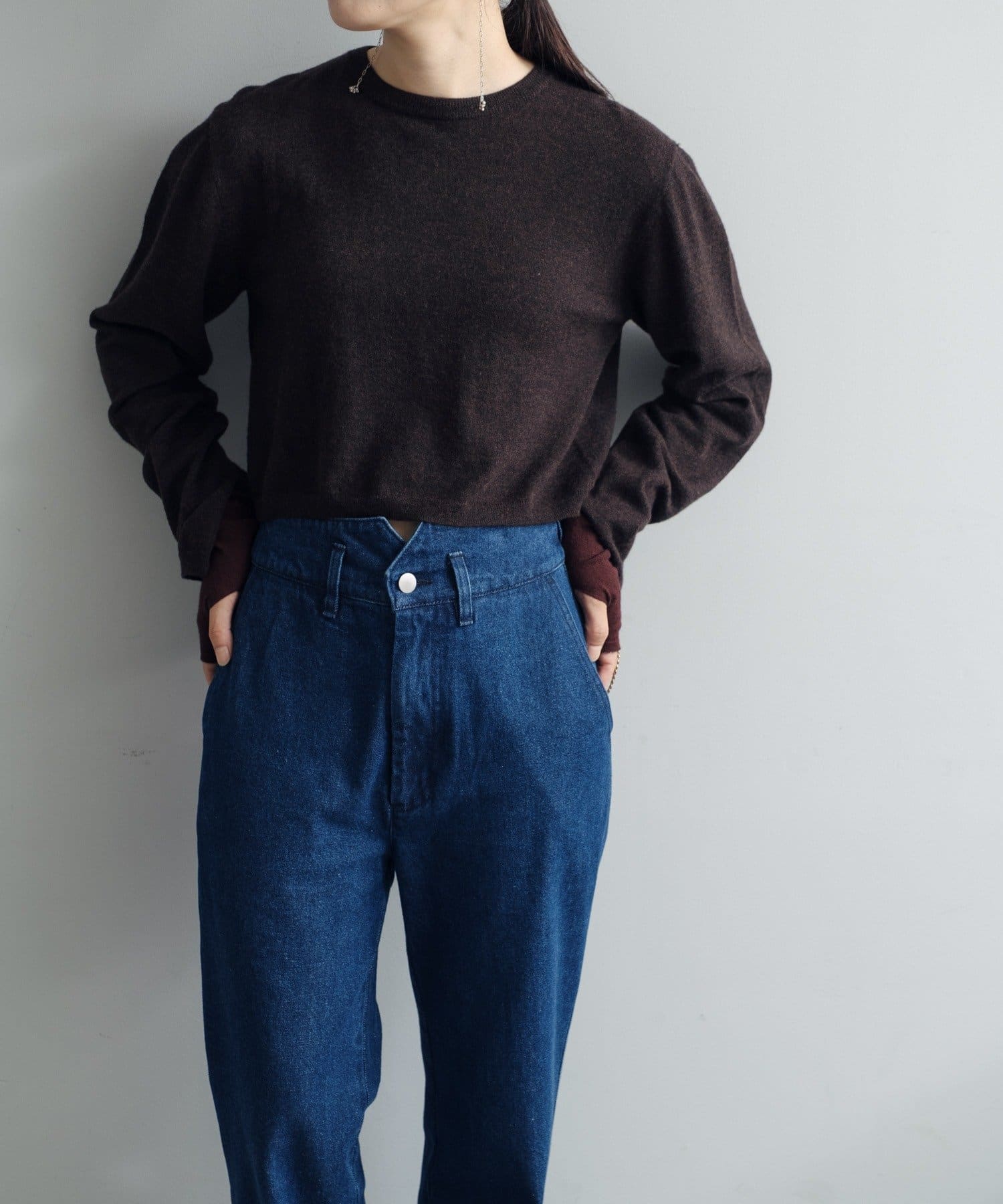 素肌に当ててもチクチクしにくく、気持ちの良いソフトな肌触りのウール100%の糸を使用した、ハイゲージの天竺編みのクロップドニット。重ねて使える配色の付け袖ニットをSETにしました。