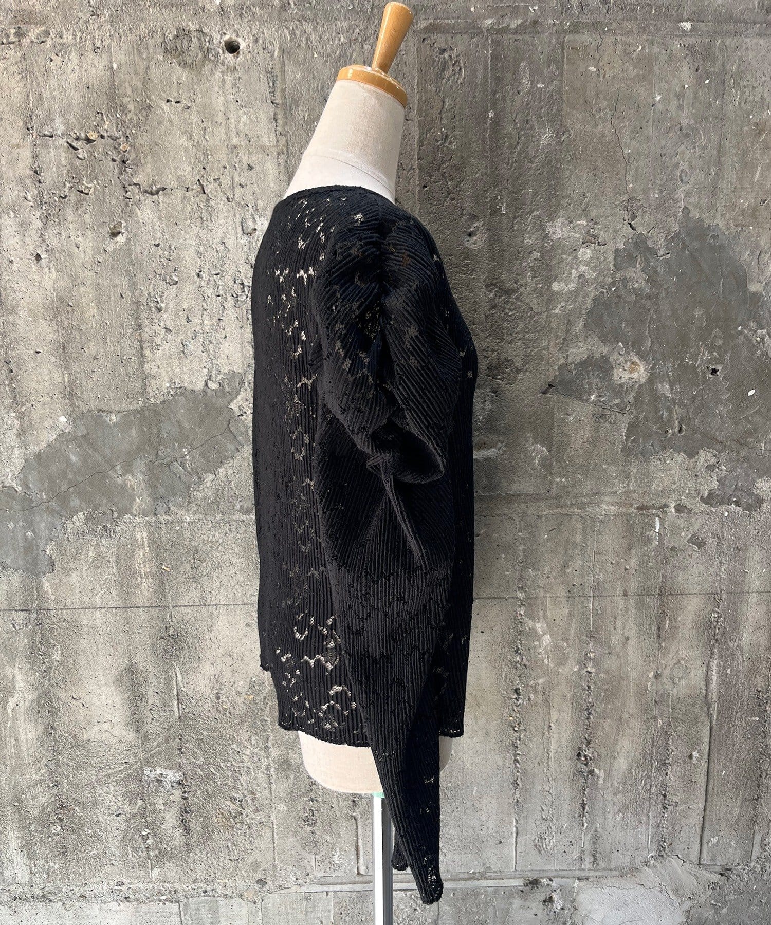 花柄のレースにプリーツ加工をかけた立体感のある生地で仕立てており、1枚でも華やかで透けすぎないのが魅力です。
