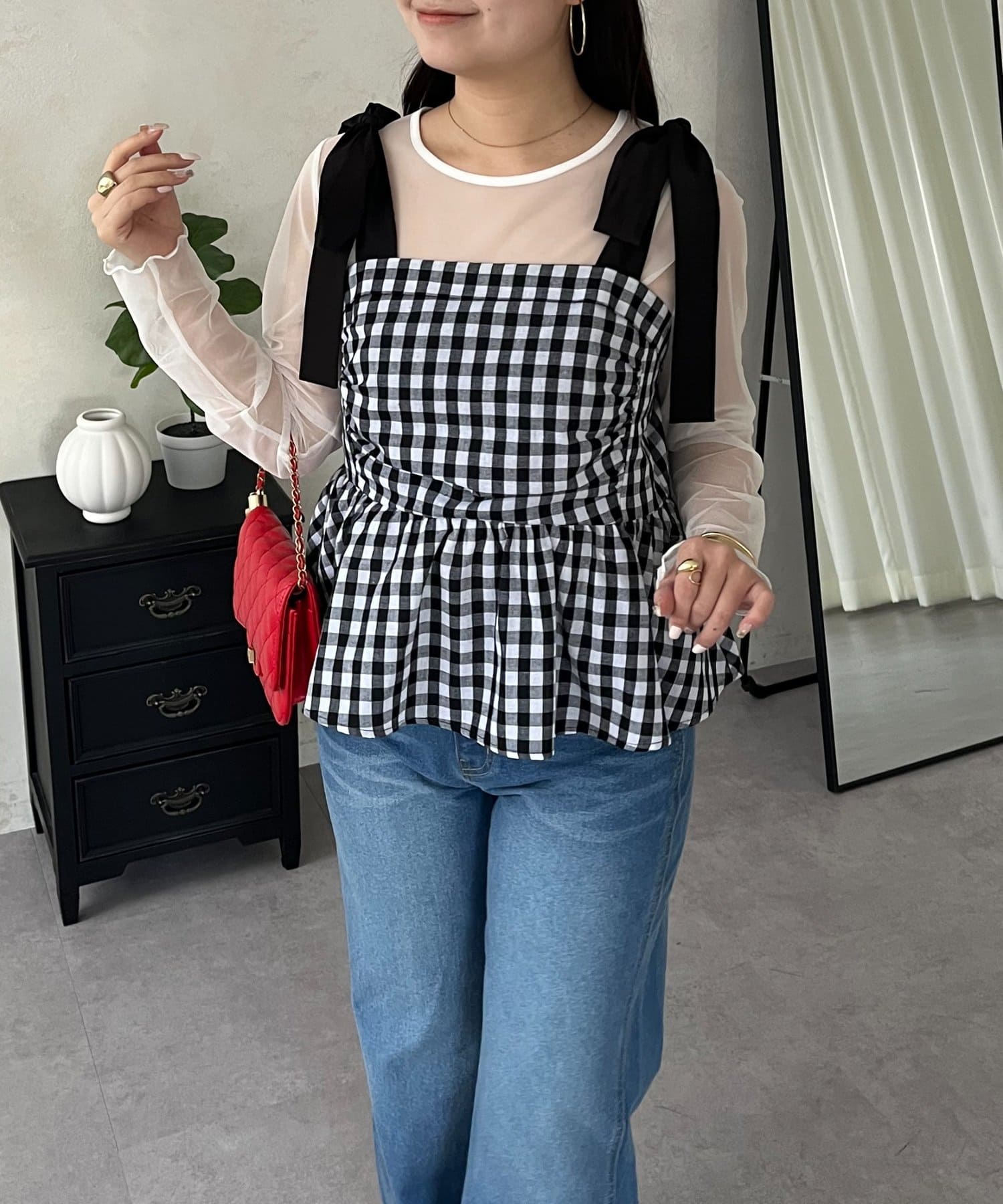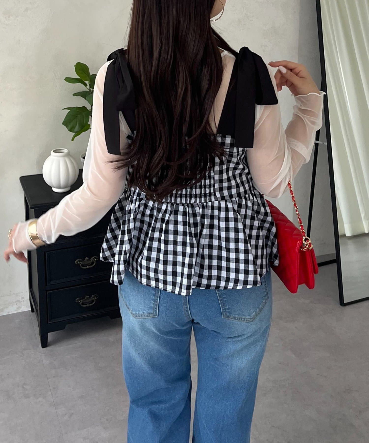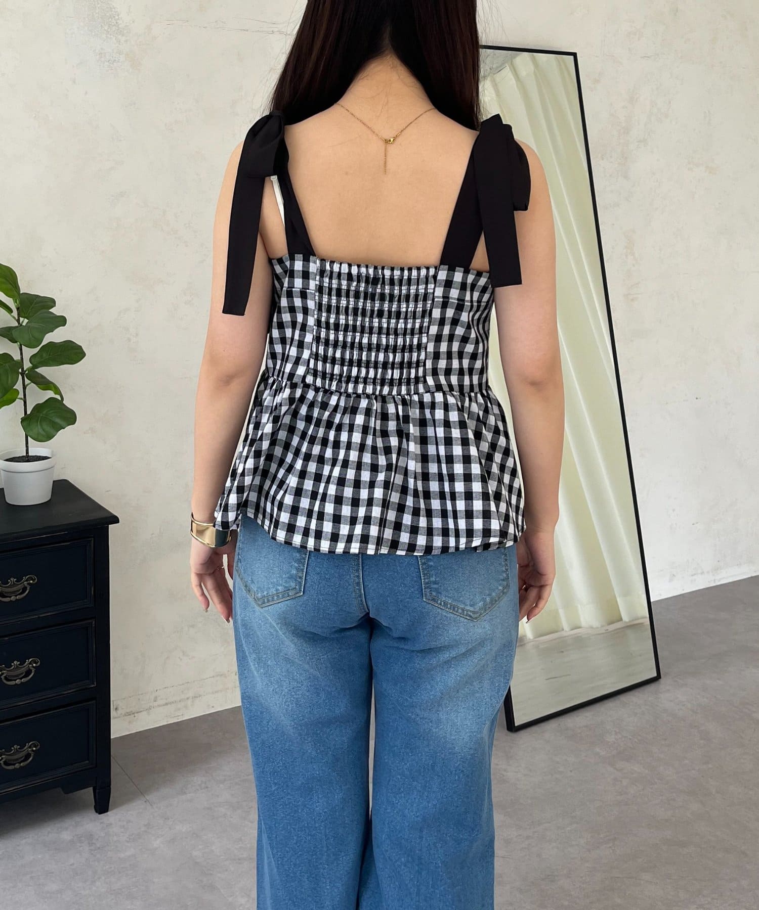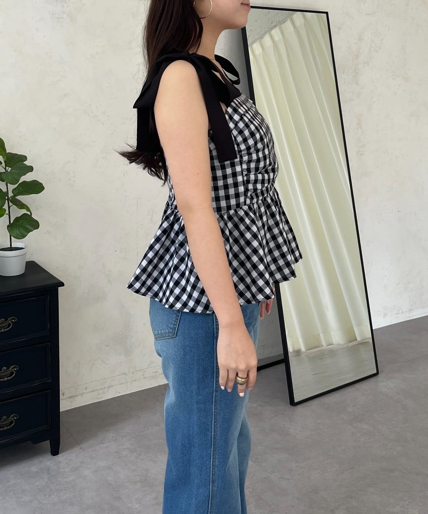 コーデの主役に。肩リボンがアクセントのギンガムチェックビスチェ