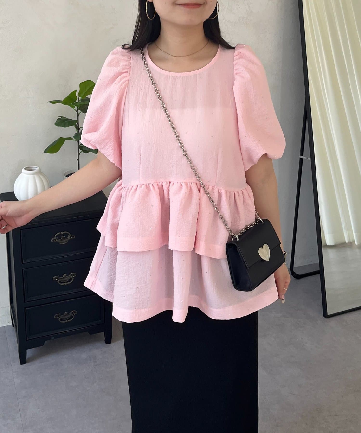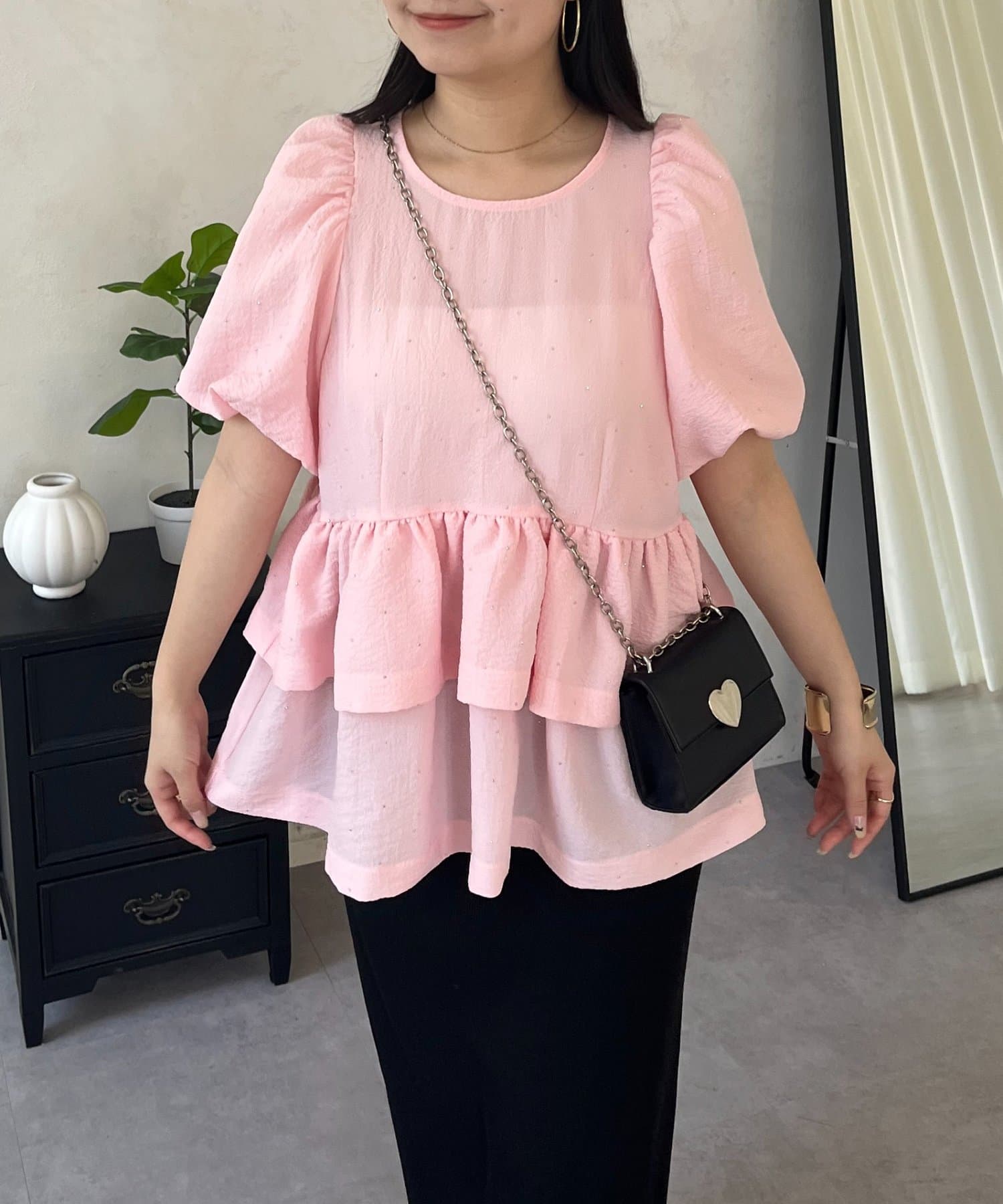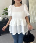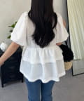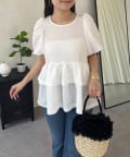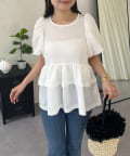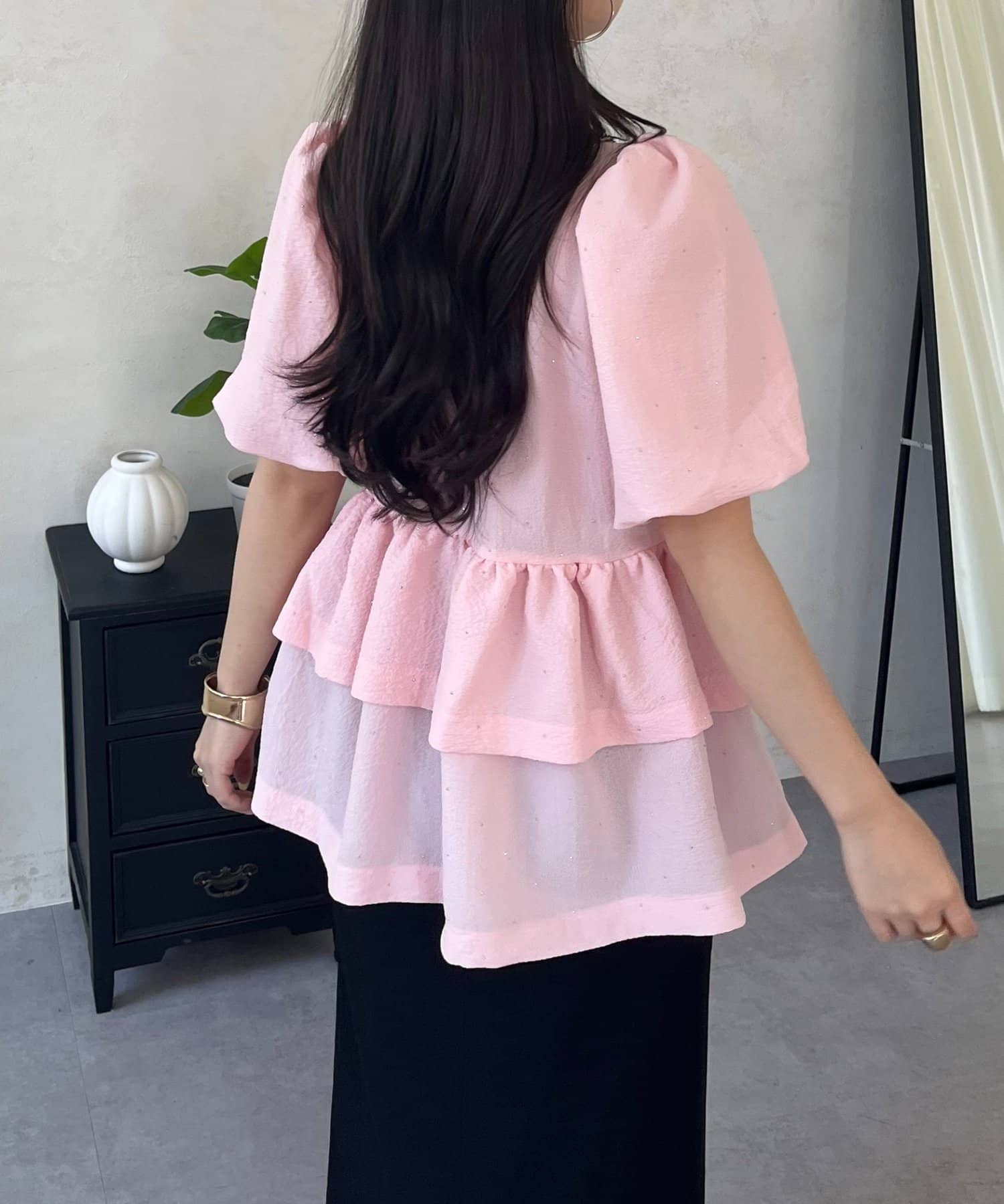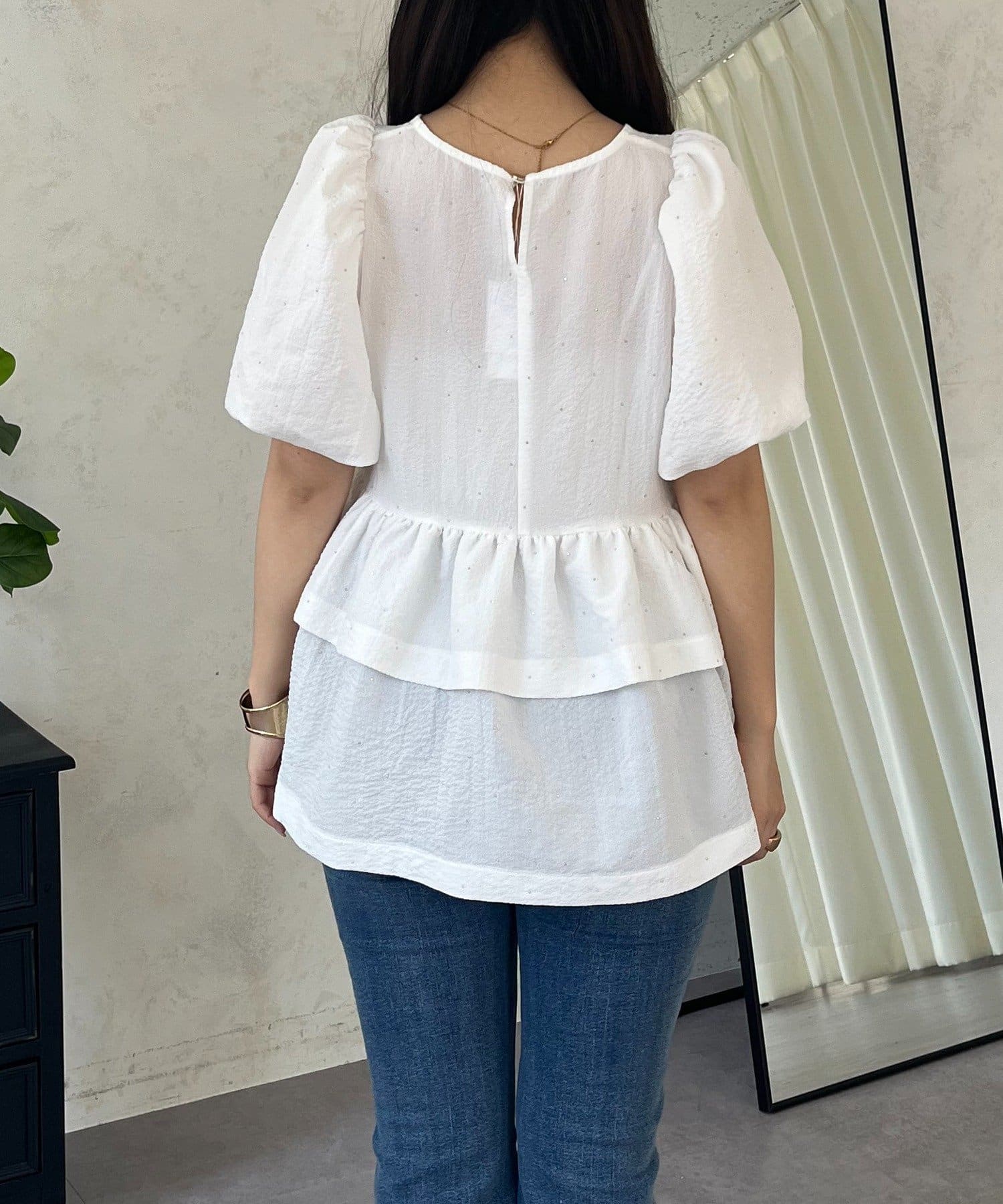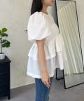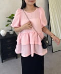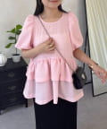 Wフリルキラキラペプラムパフスリーブブラウス