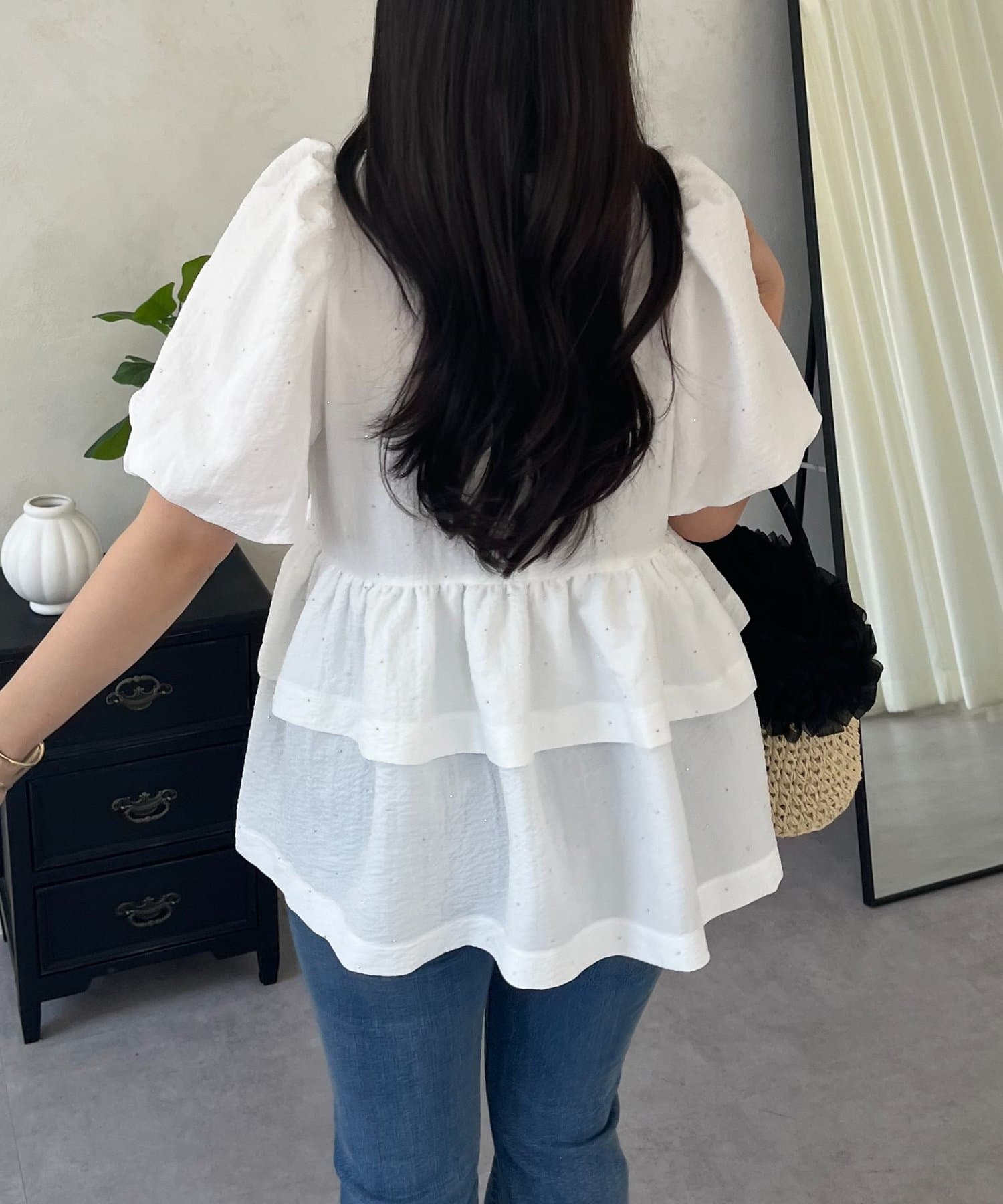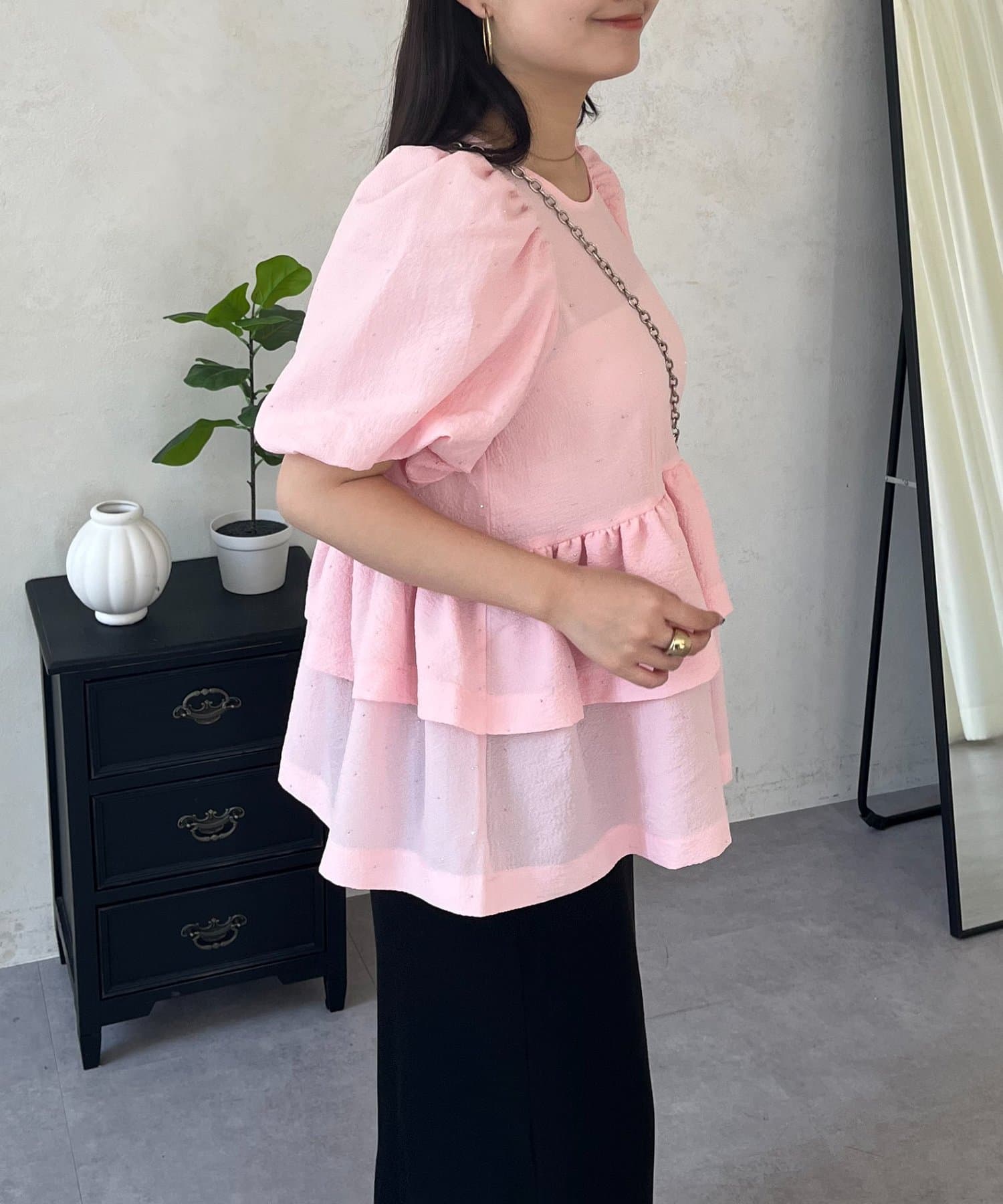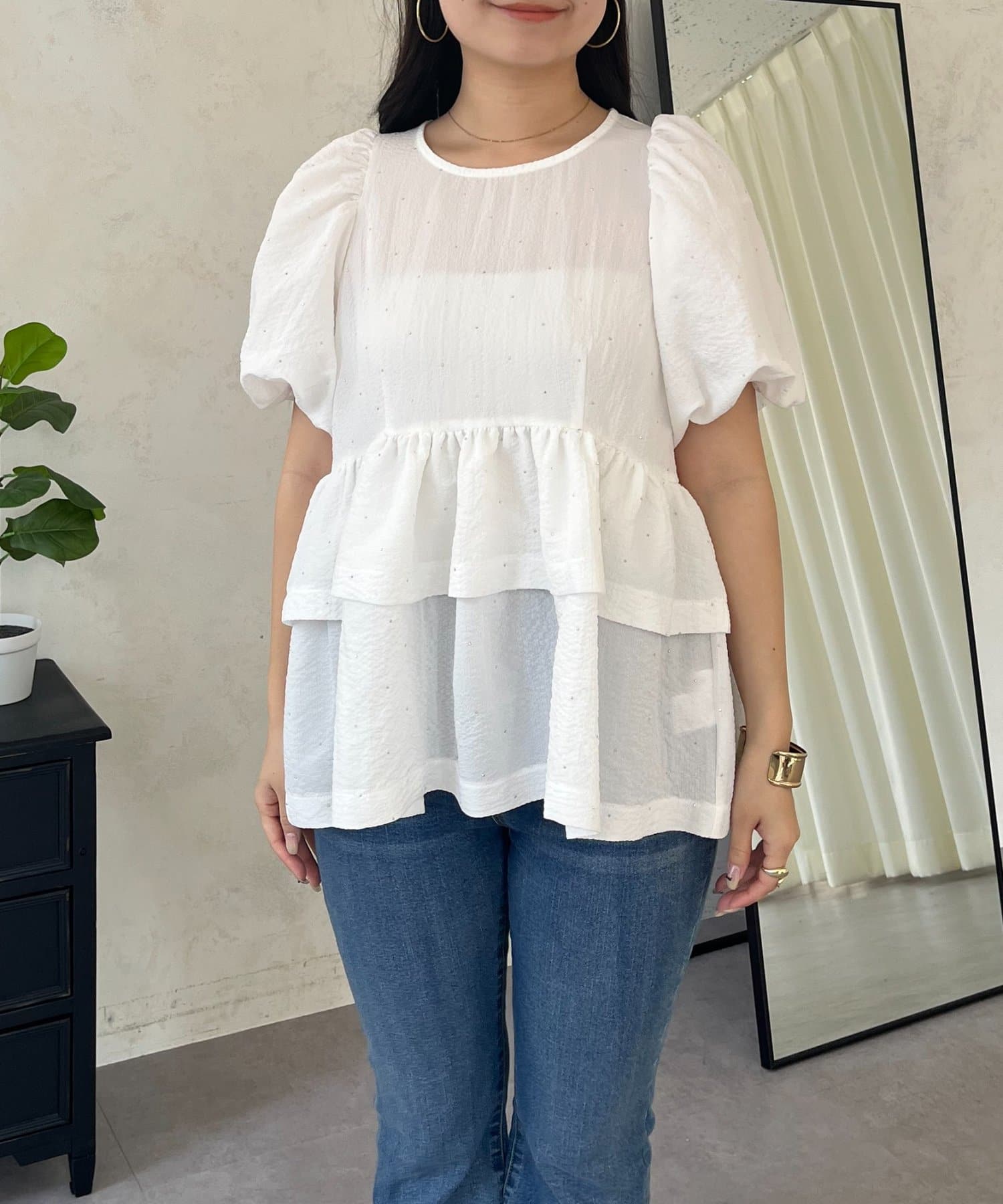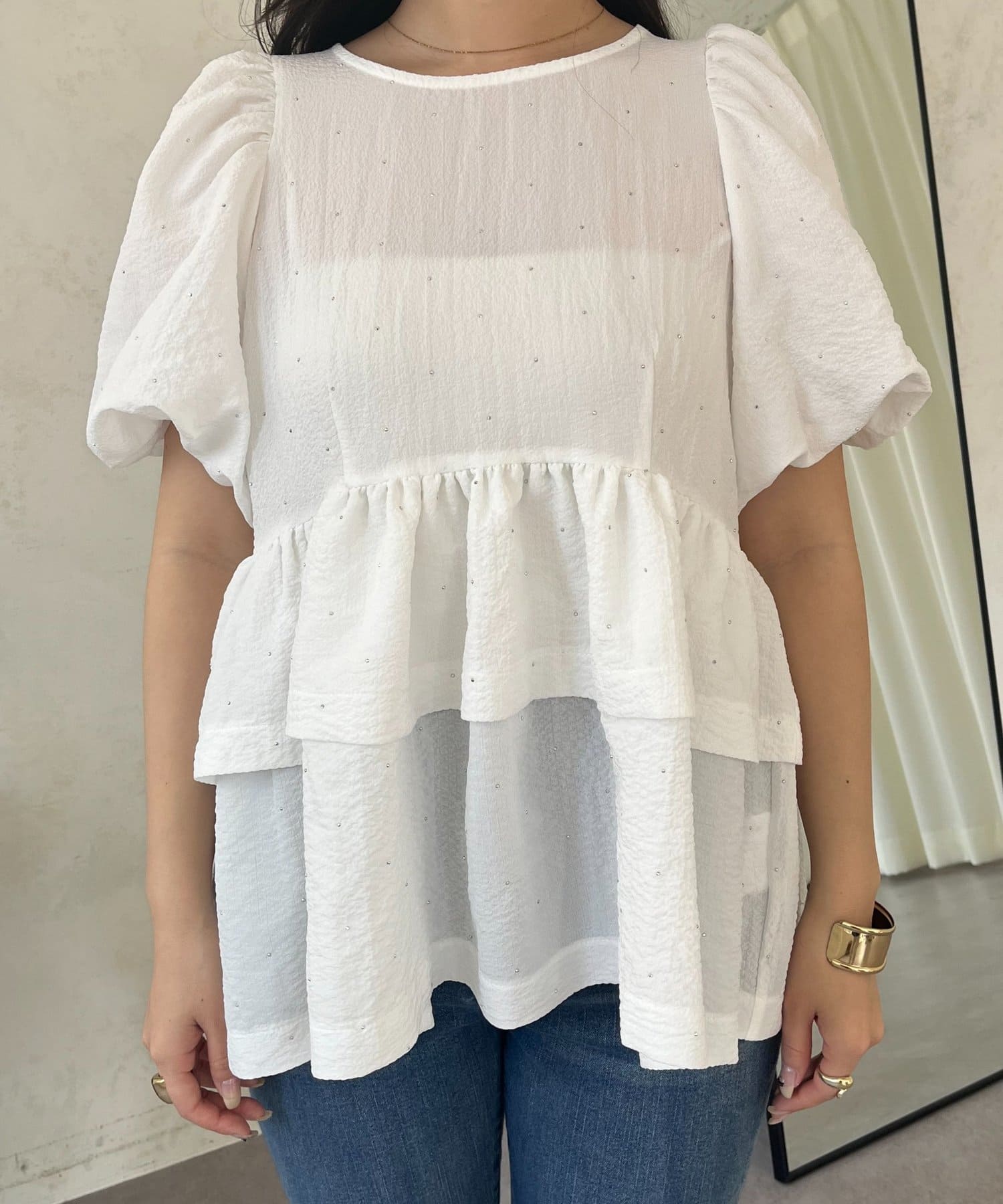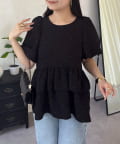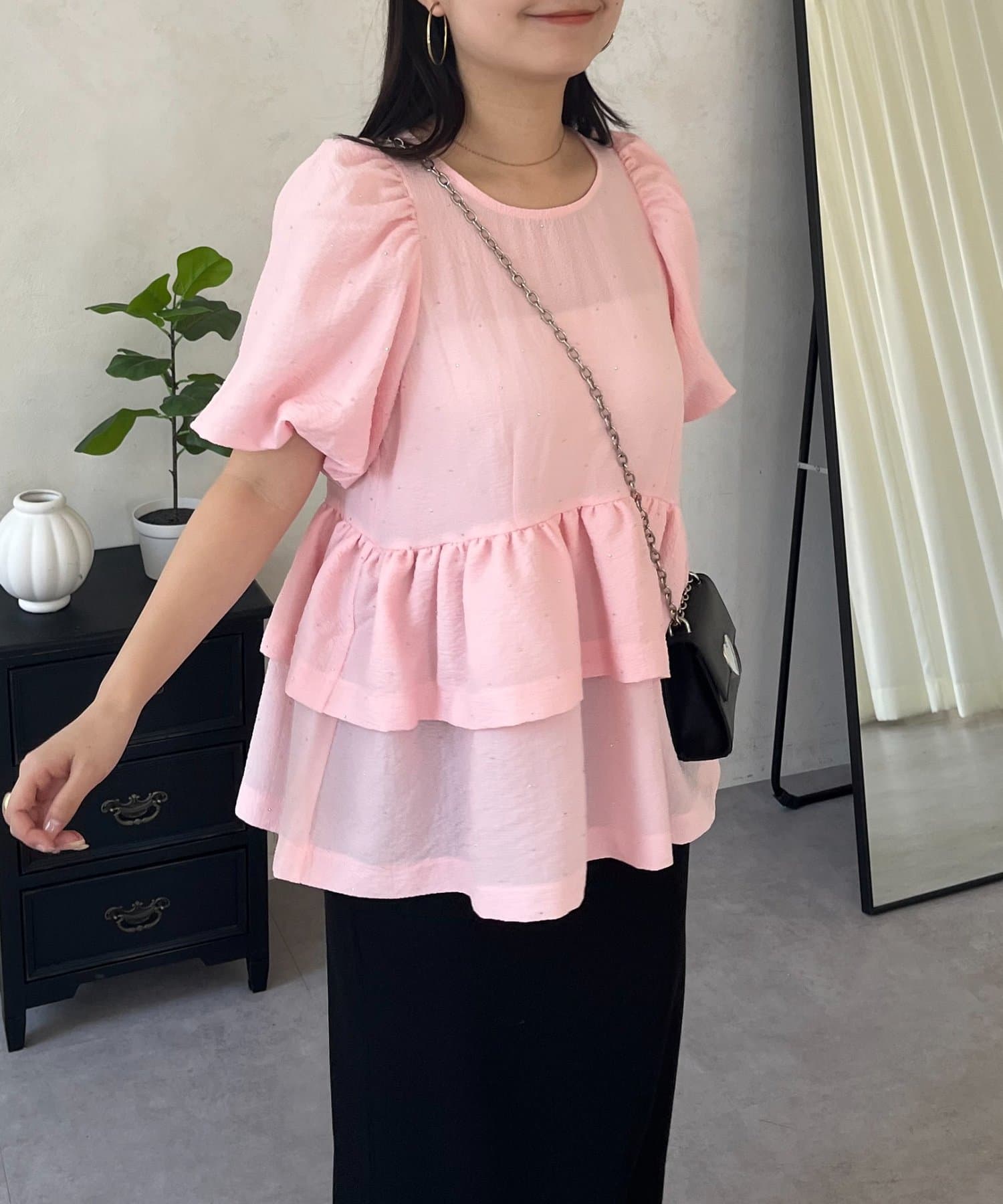 Wフリルキラキラペプラムパフスリーブブラウス