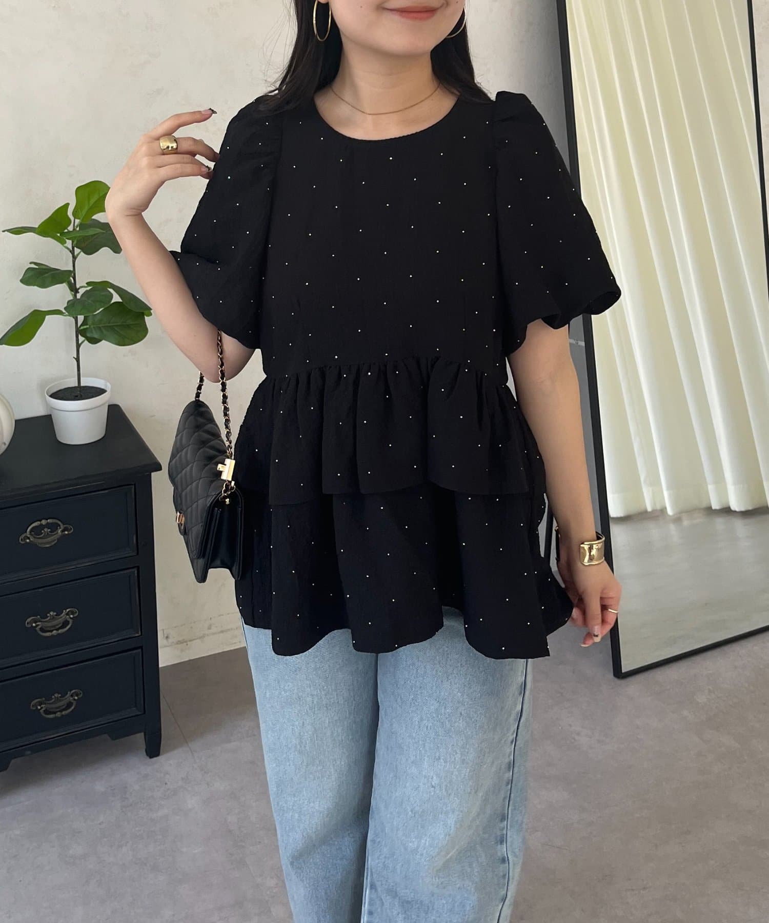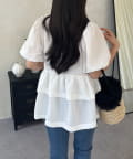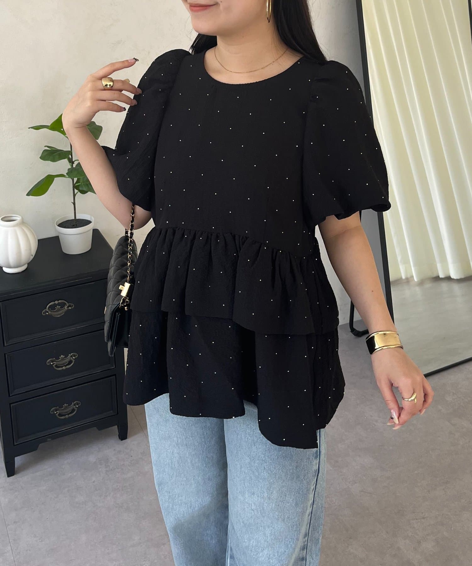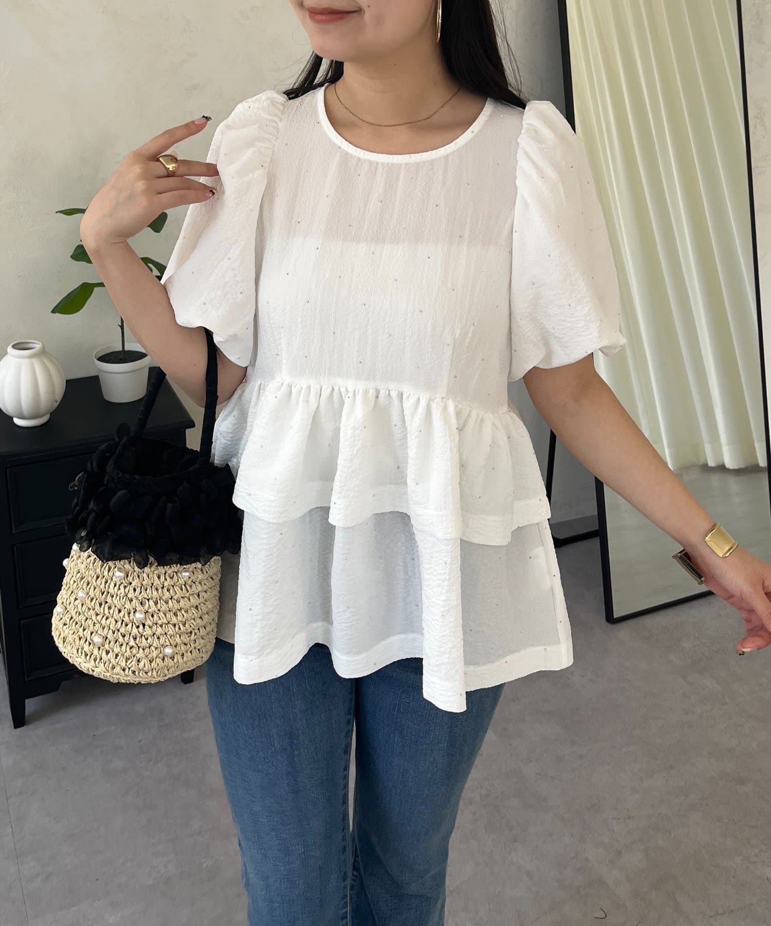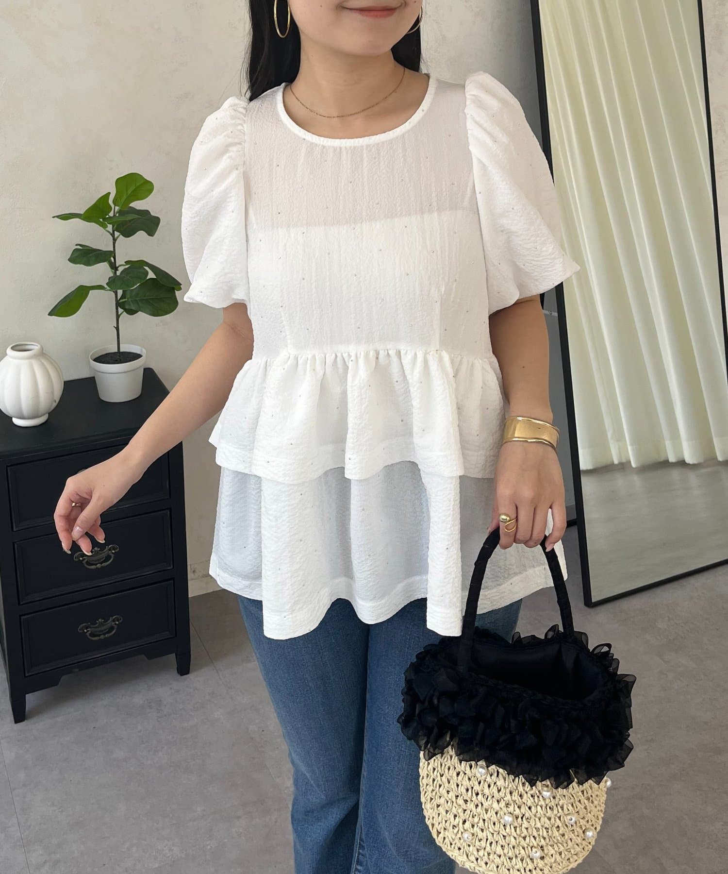 Wフリルキラキラペプラムパフスリーブブラウス