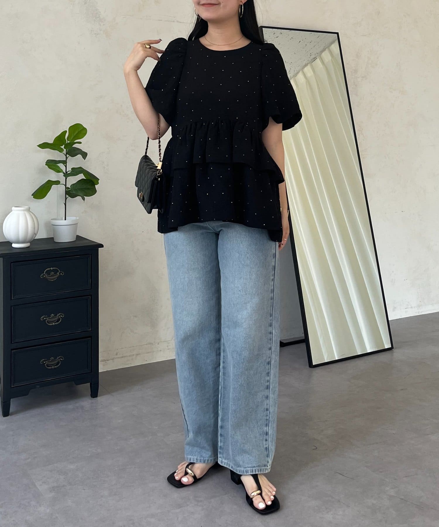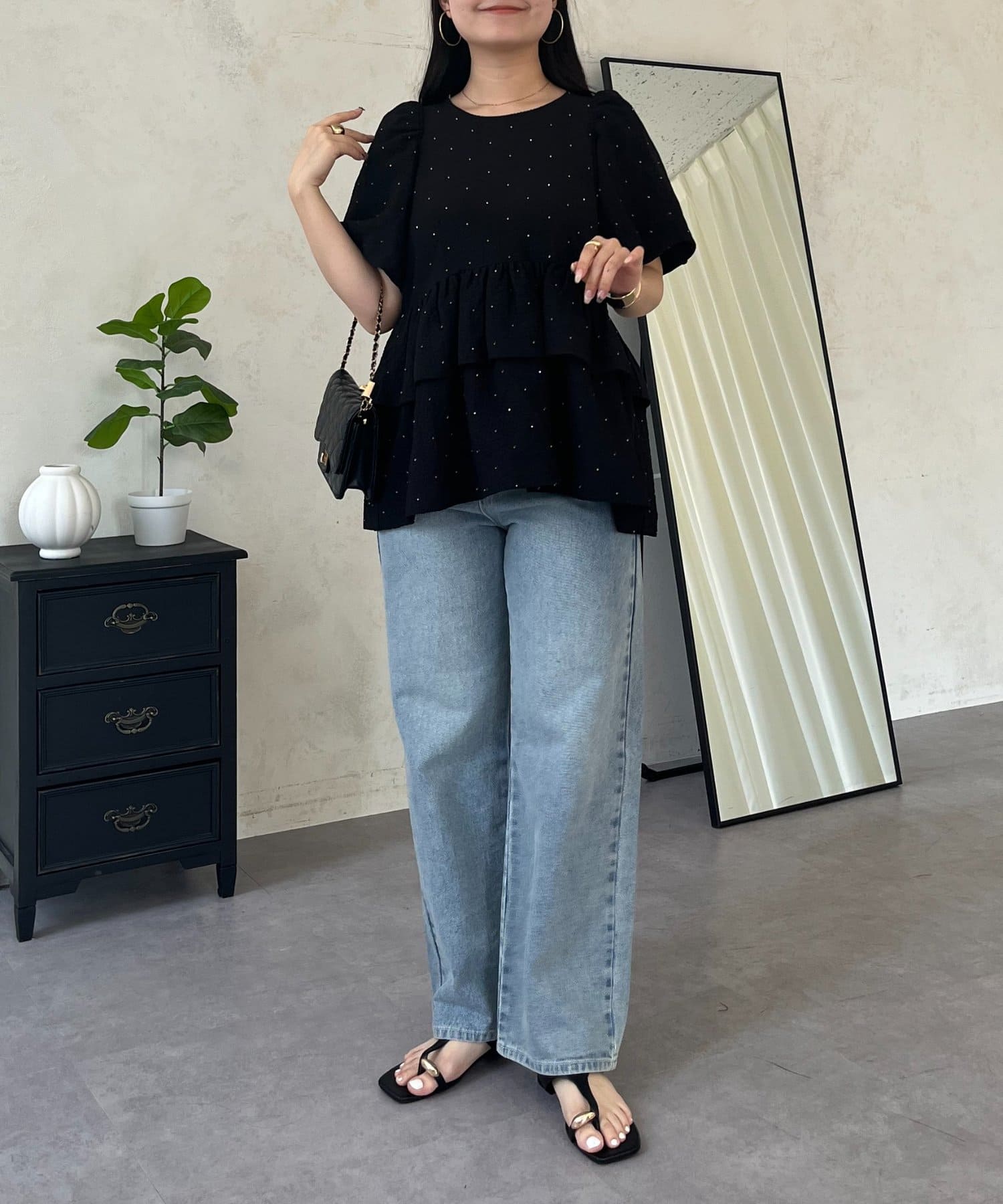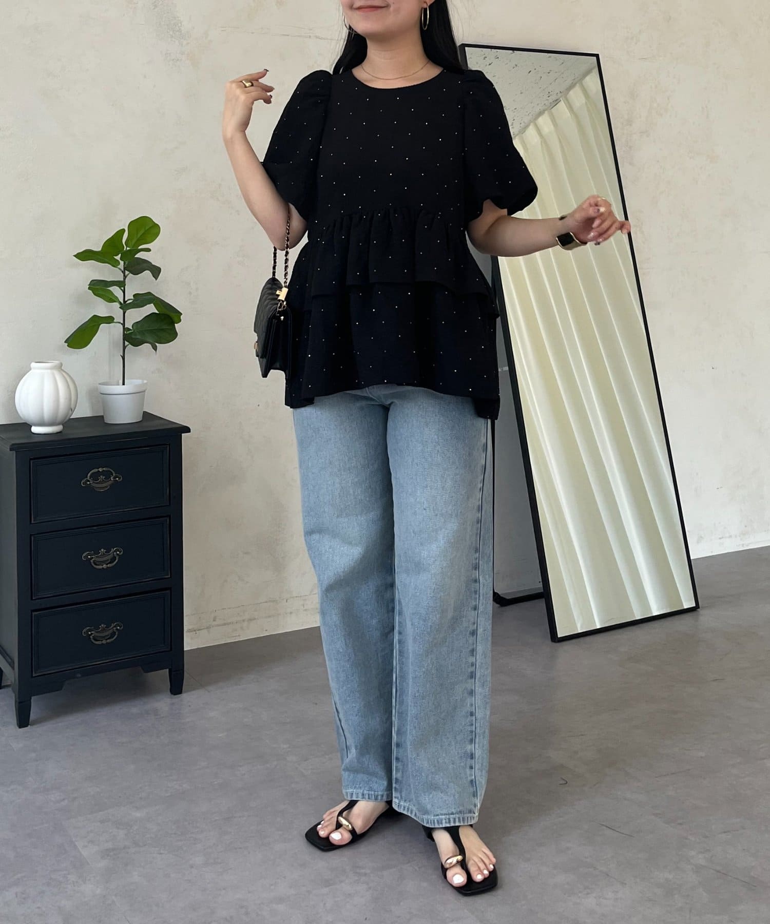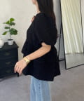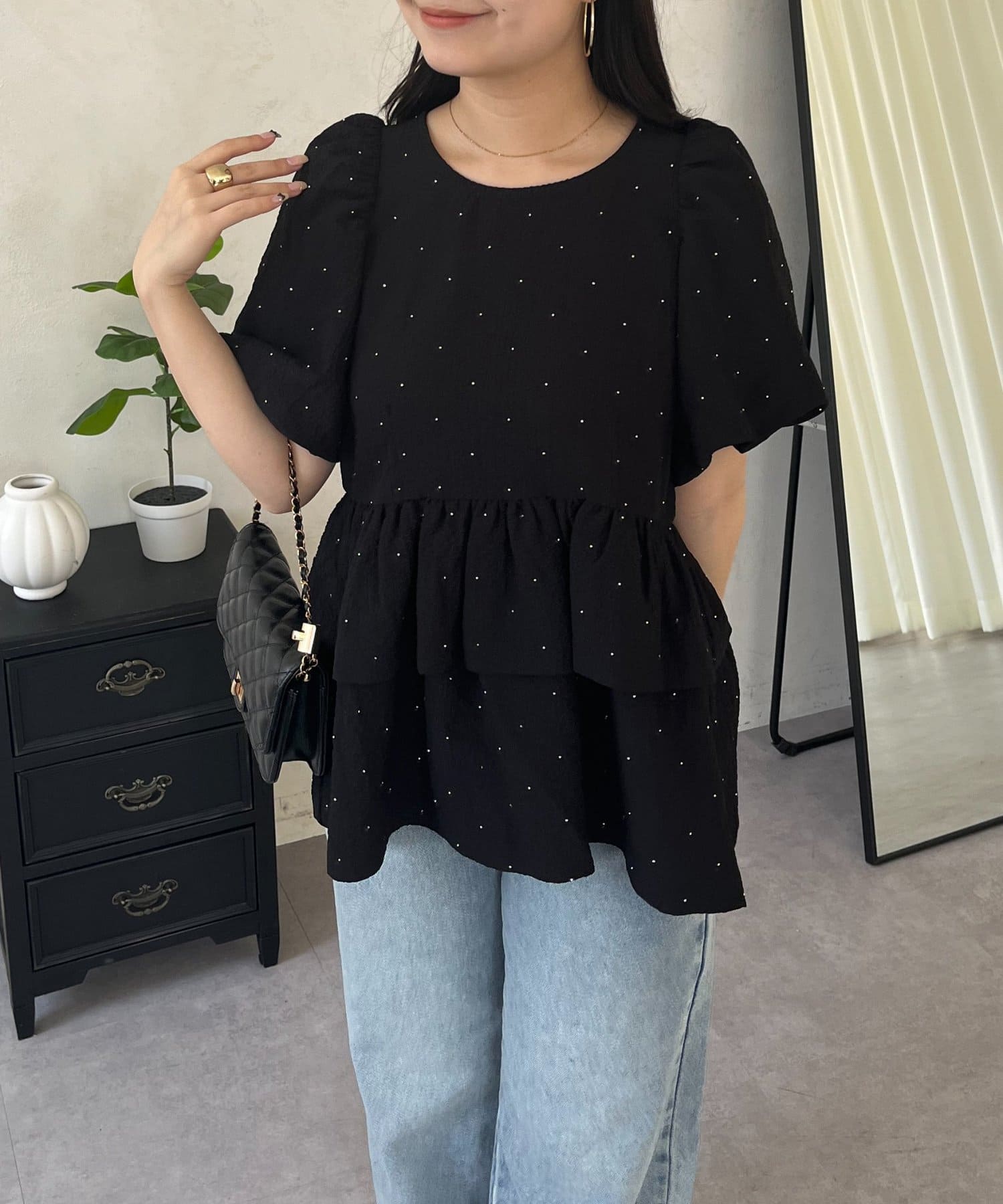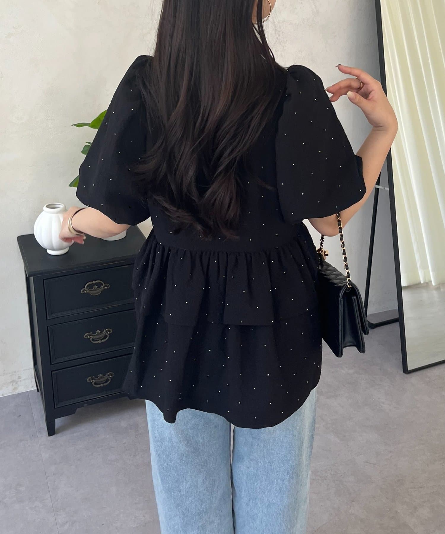 Wフリルキラキラペプラムパフスリーブブラウス