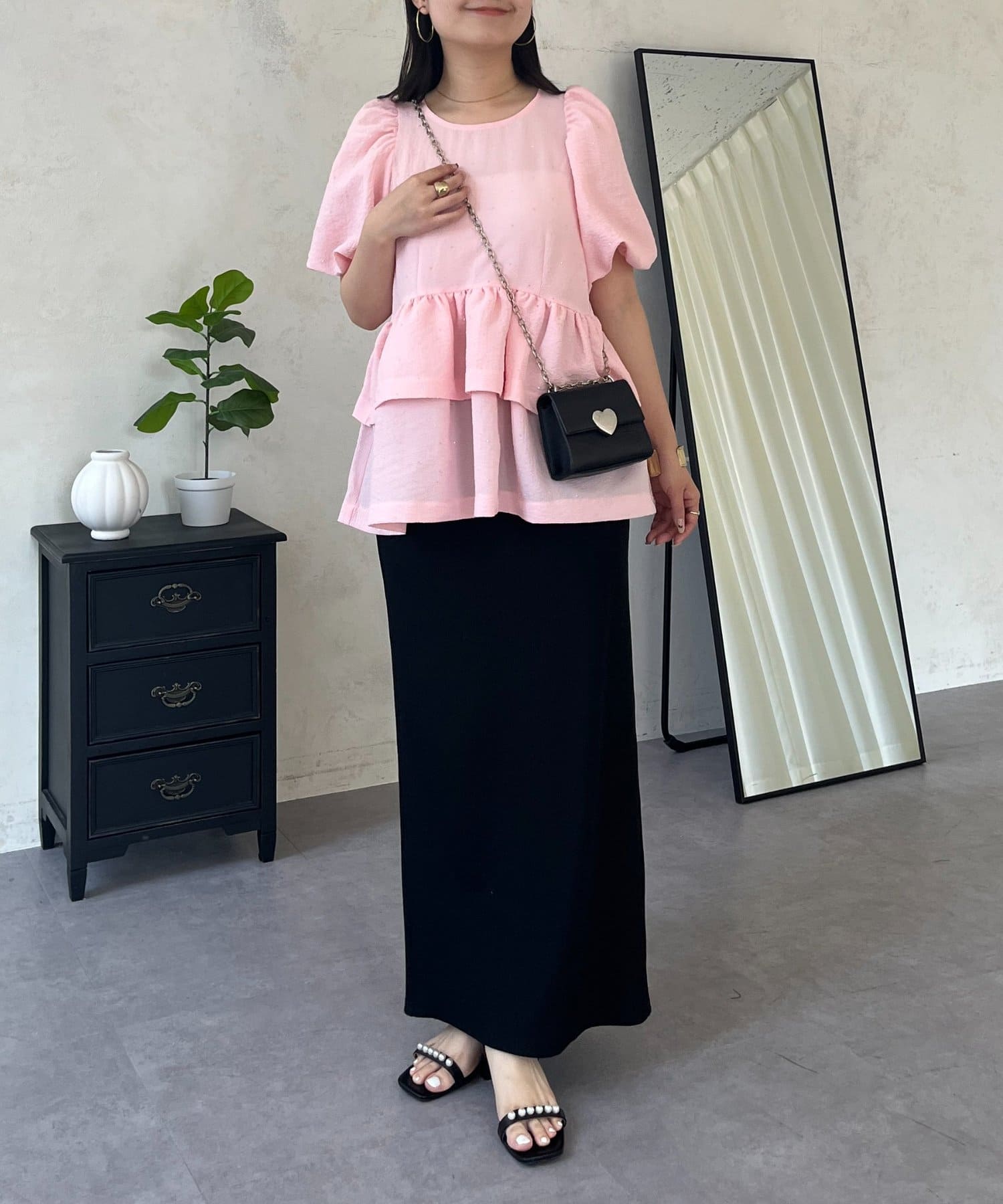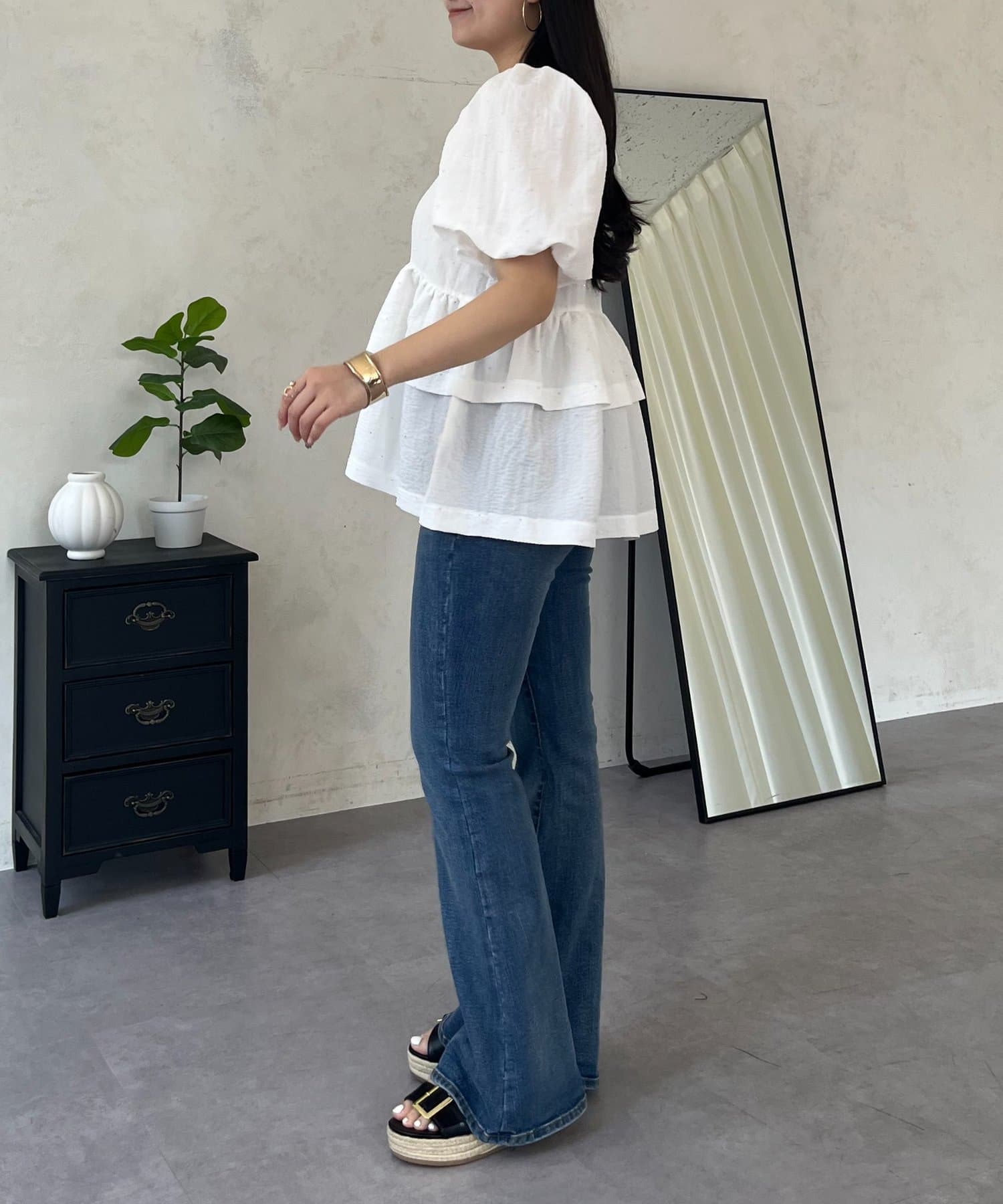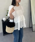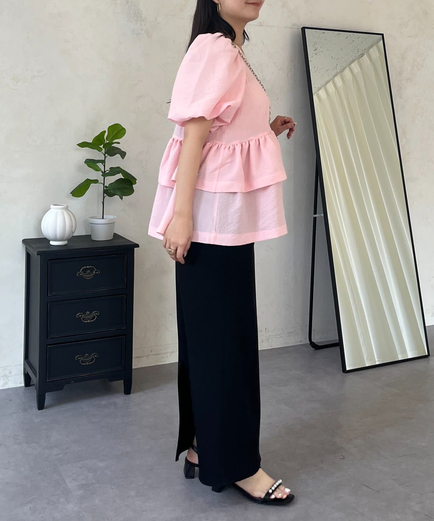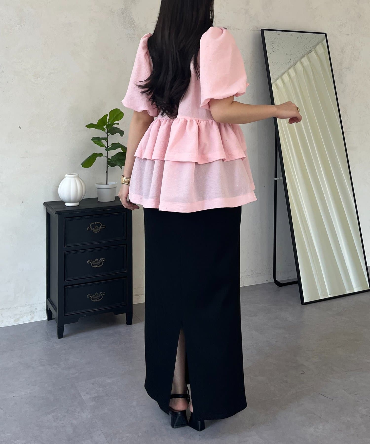●ウエスト位置を高く見せるペプラムデザインは、二段フリルで甘さと体型カバーを両立