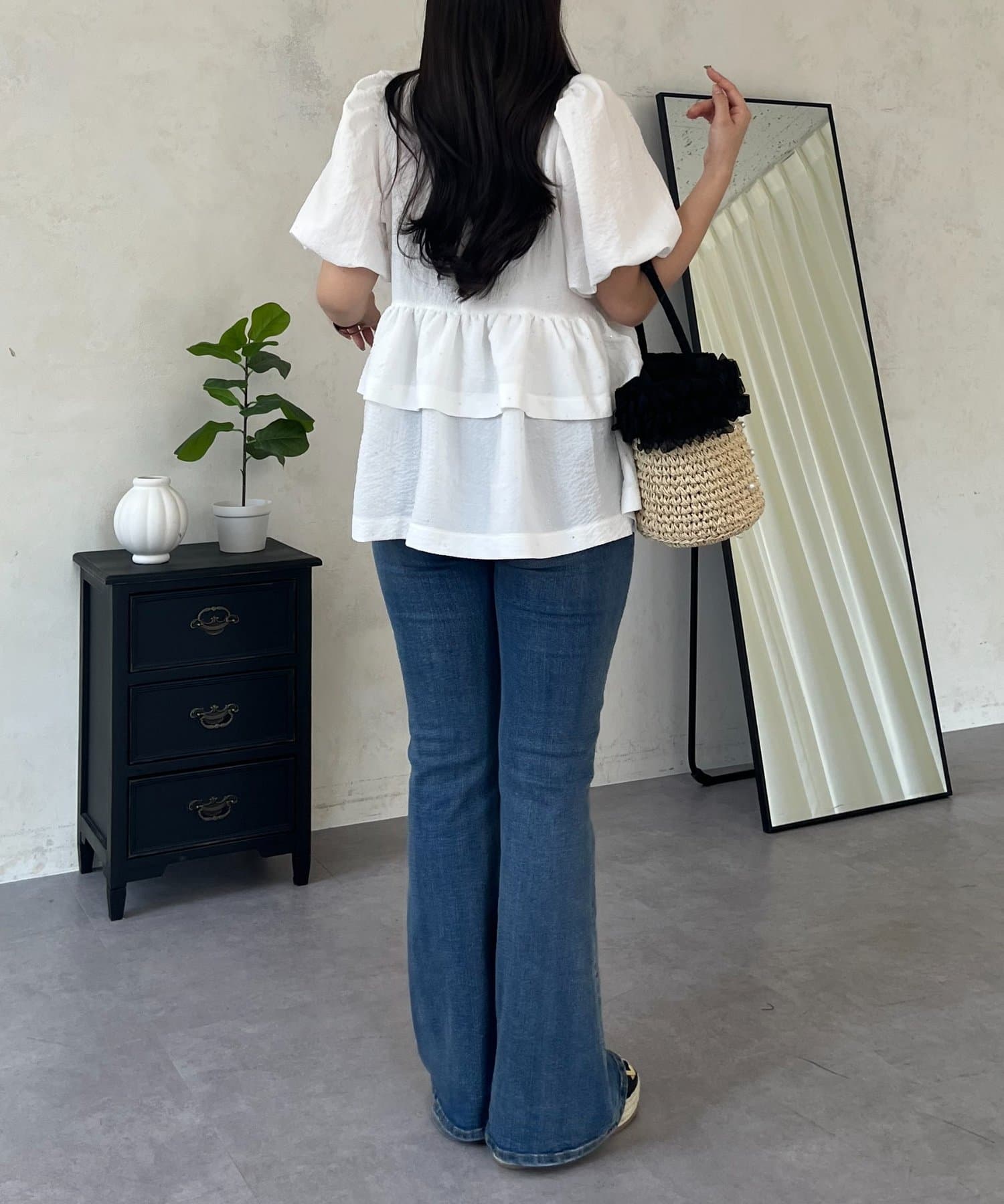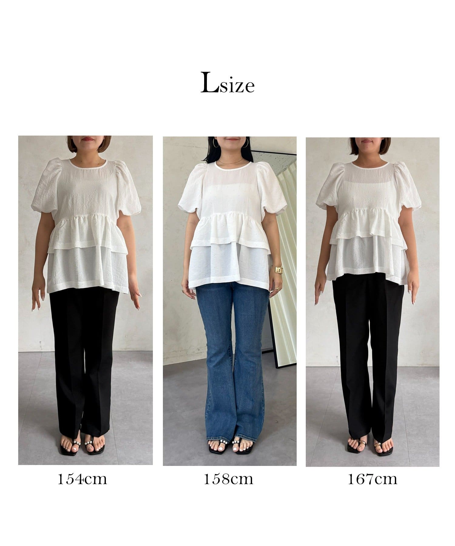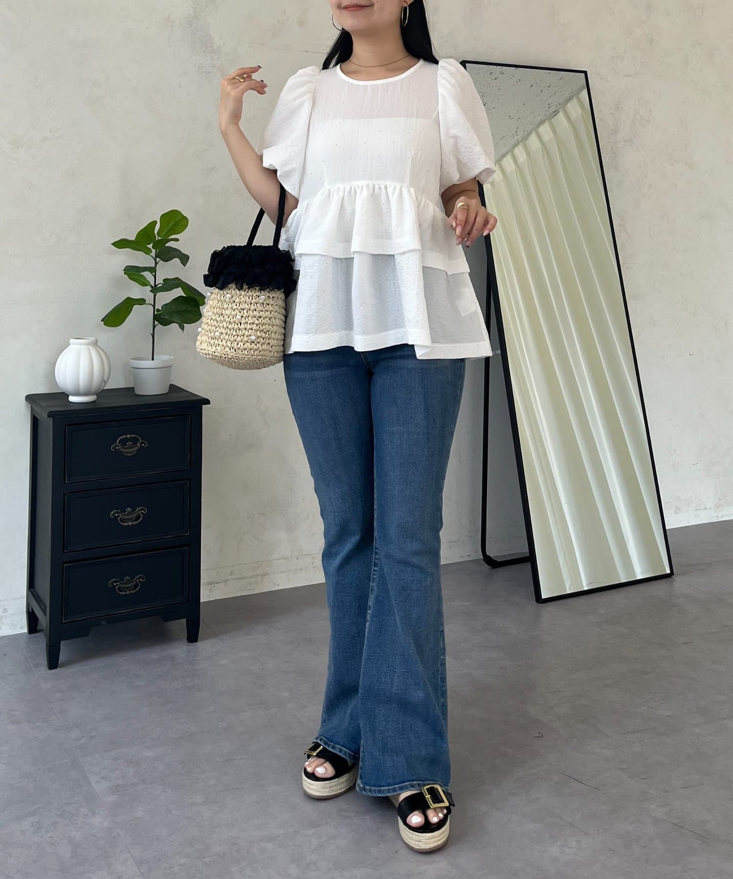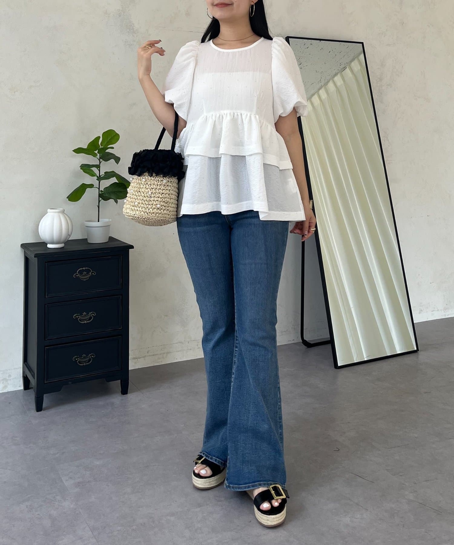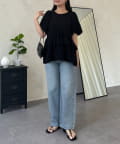 ●ウエスト位置を高く見せるペプラムデザインは、二段フリルで甘さと体型カバーを両立