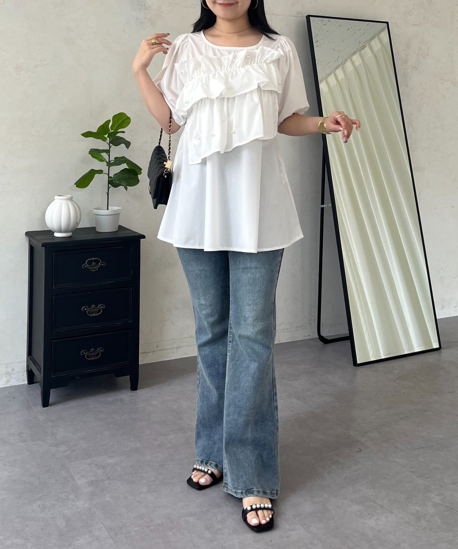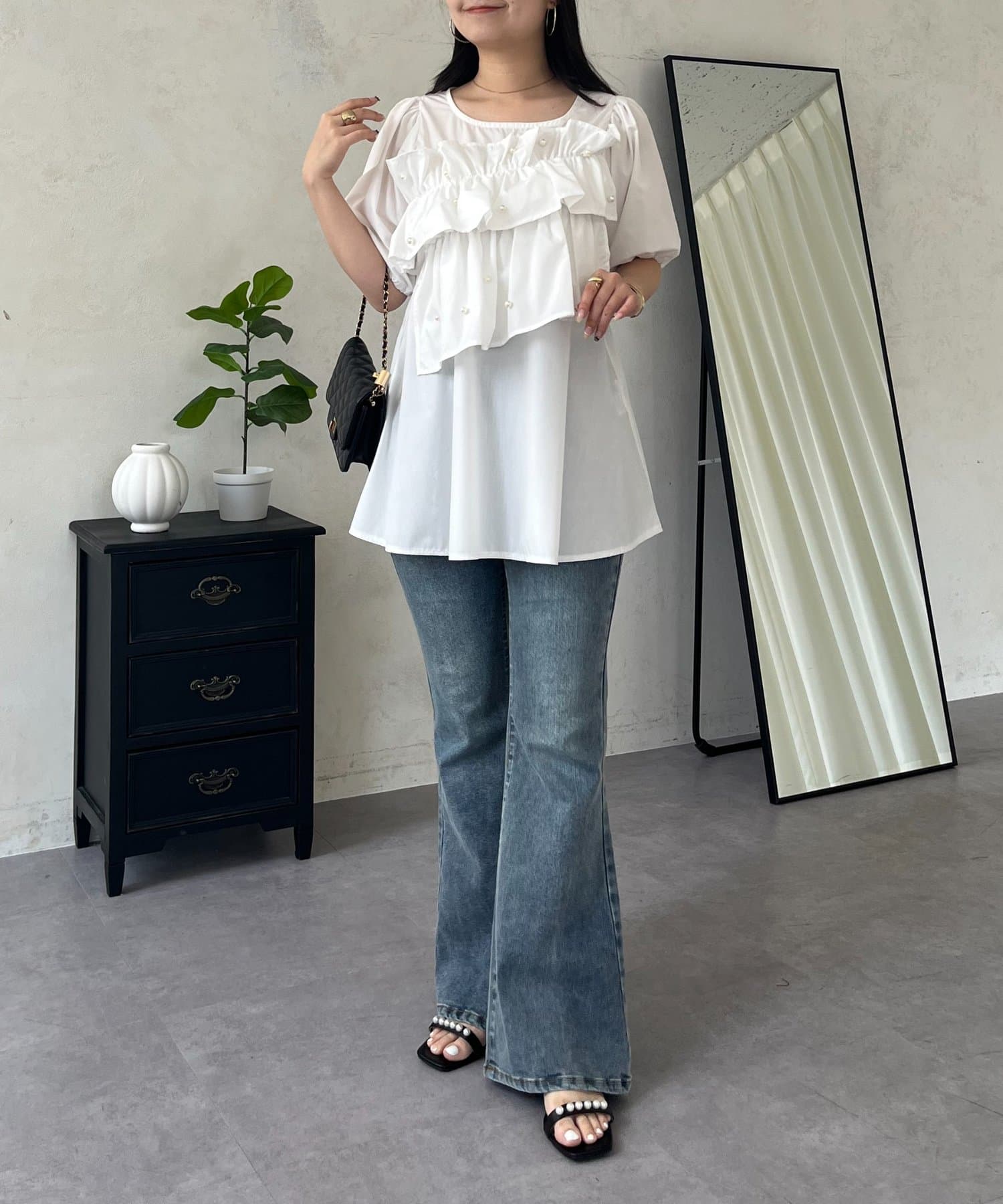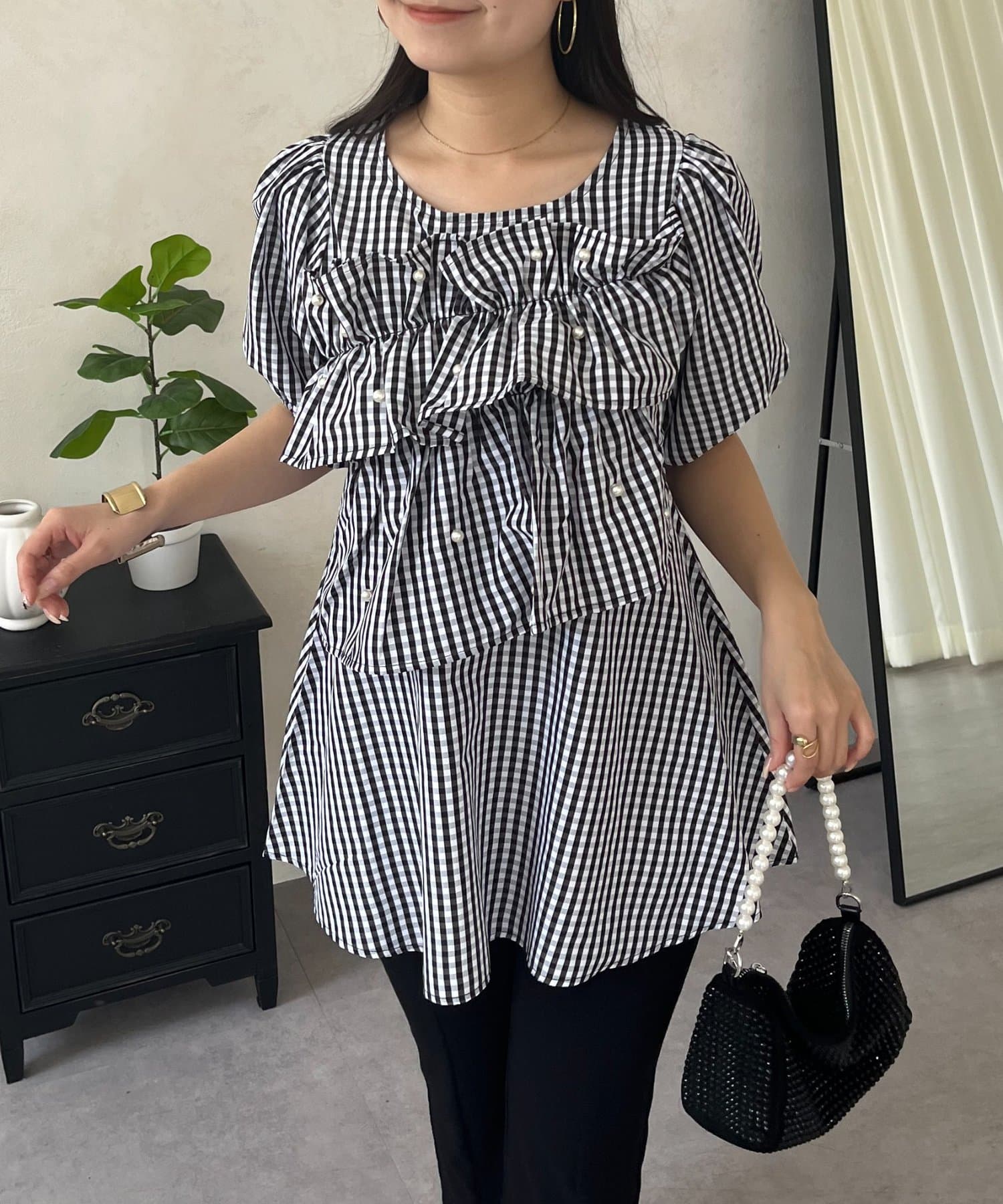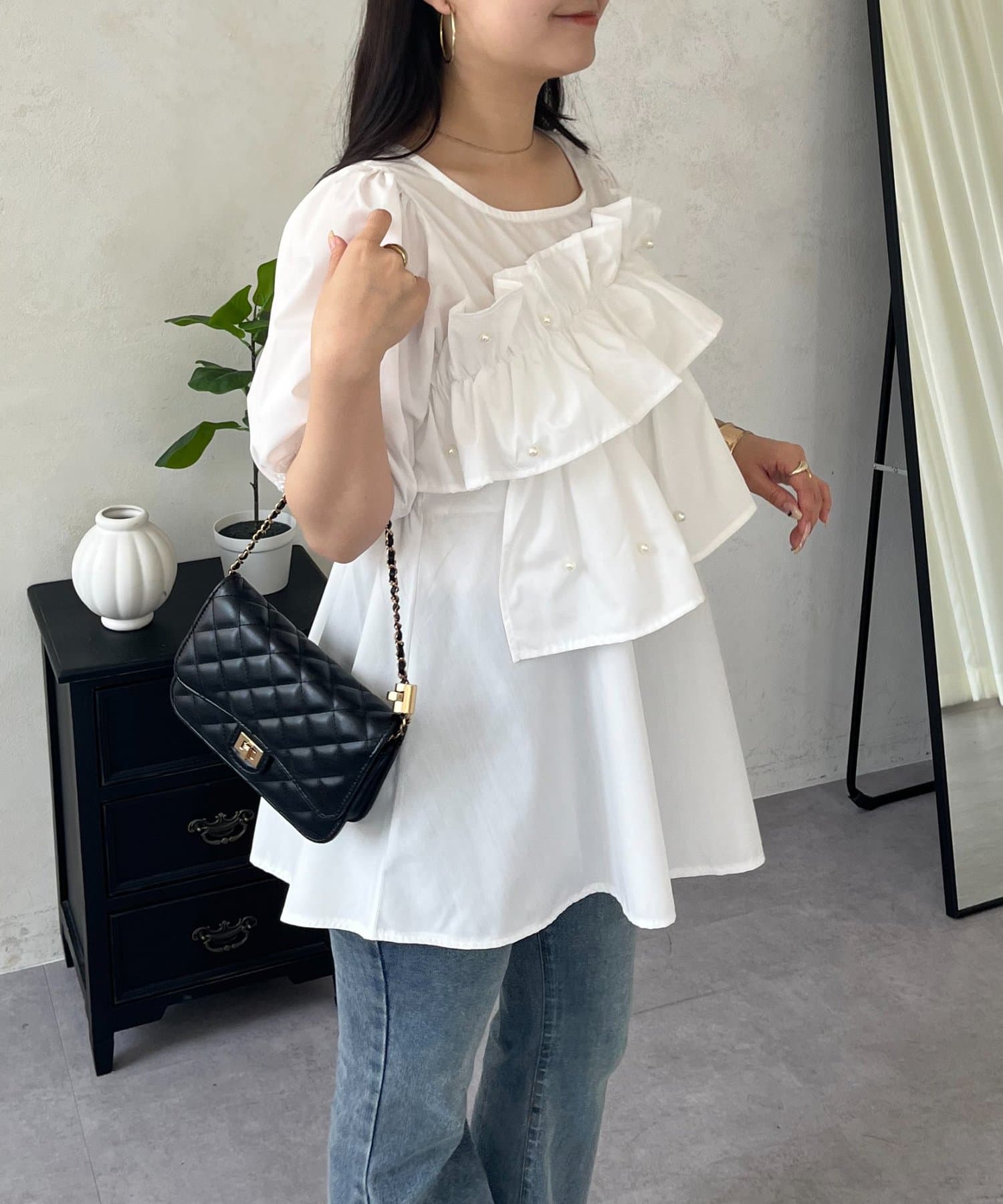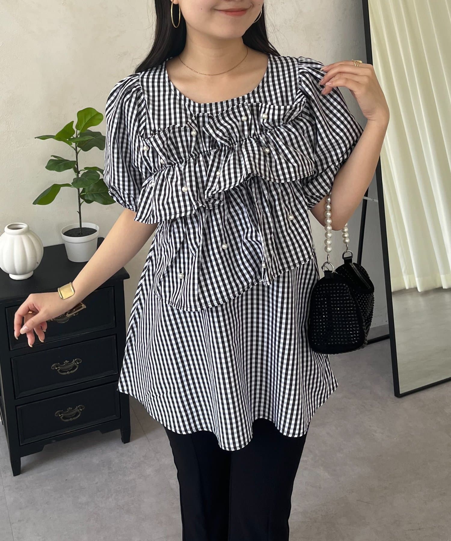 フロントフリルパールペプラムブラウス