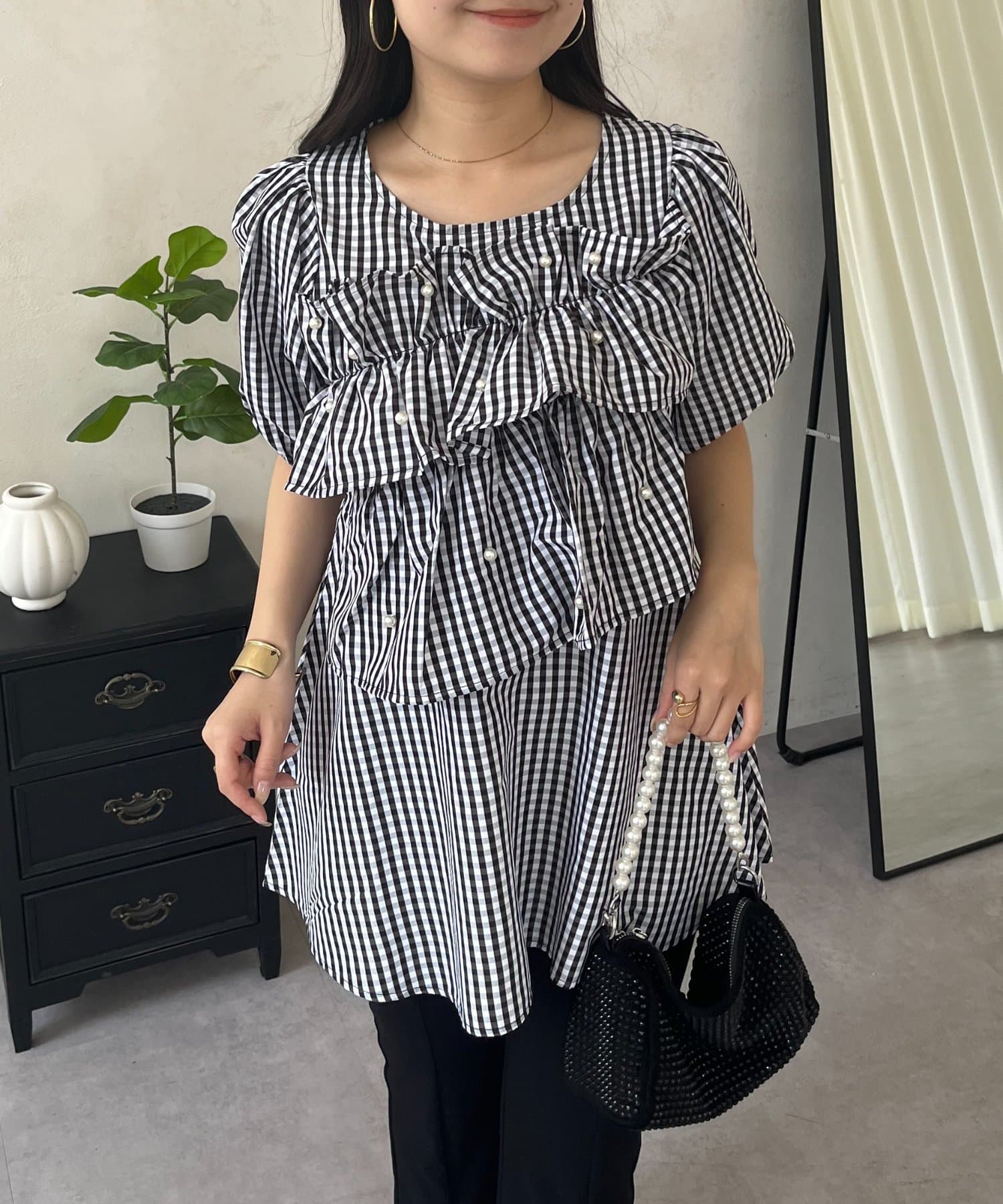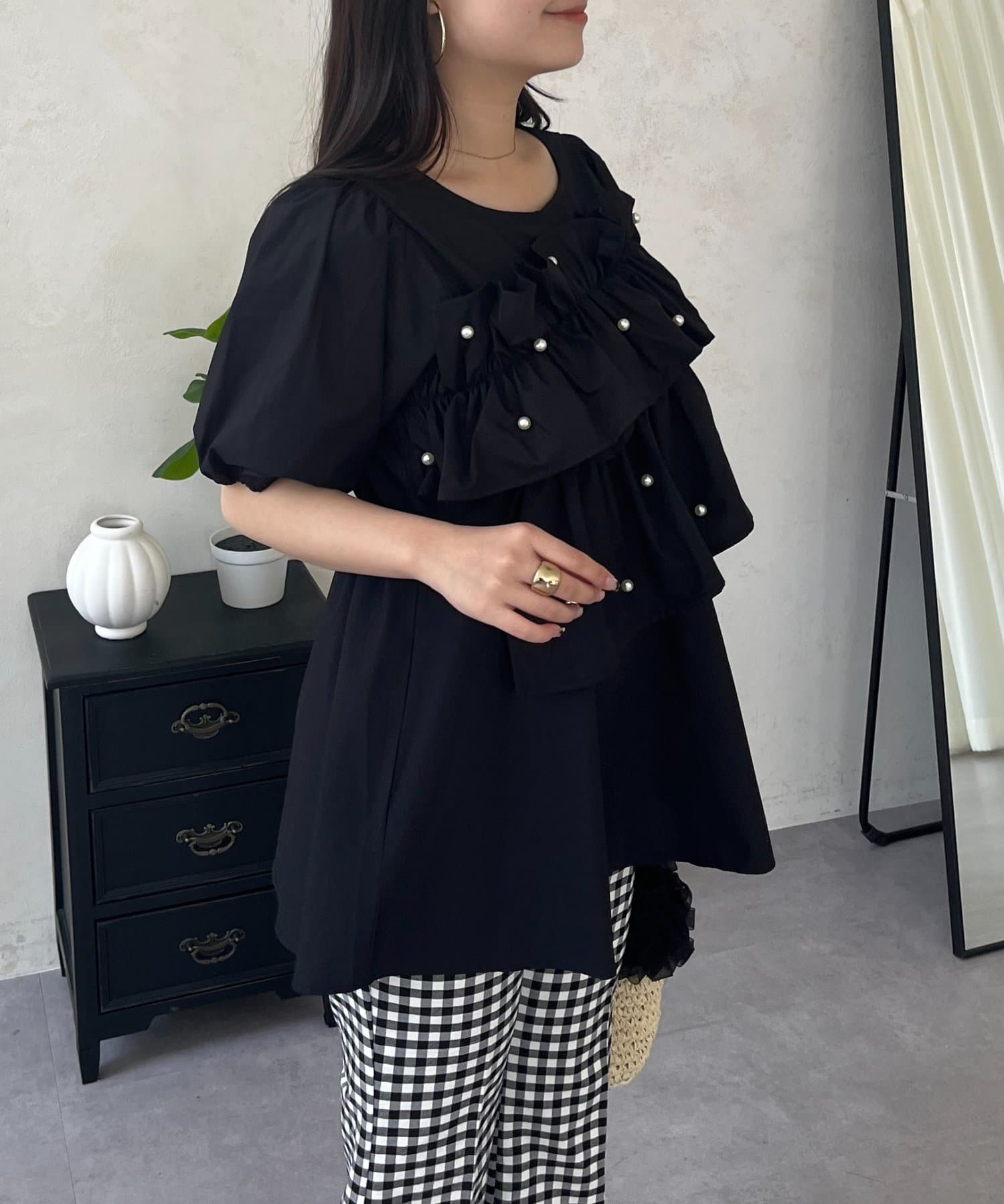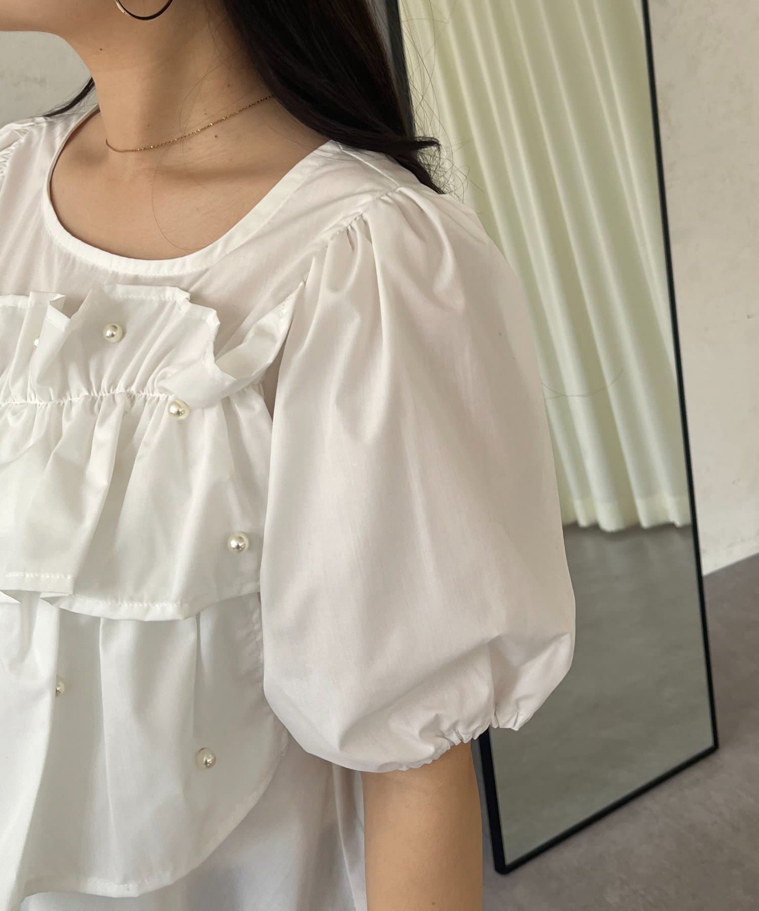 ●胸元を飾るたっぷりのフリルと上品なパールが、顔周りをパッと華やかに見せてくれます
