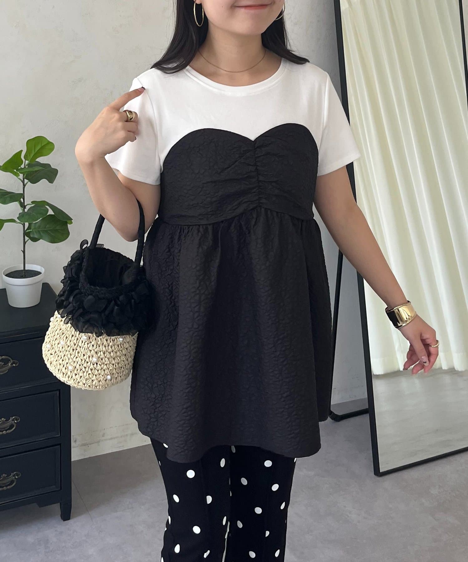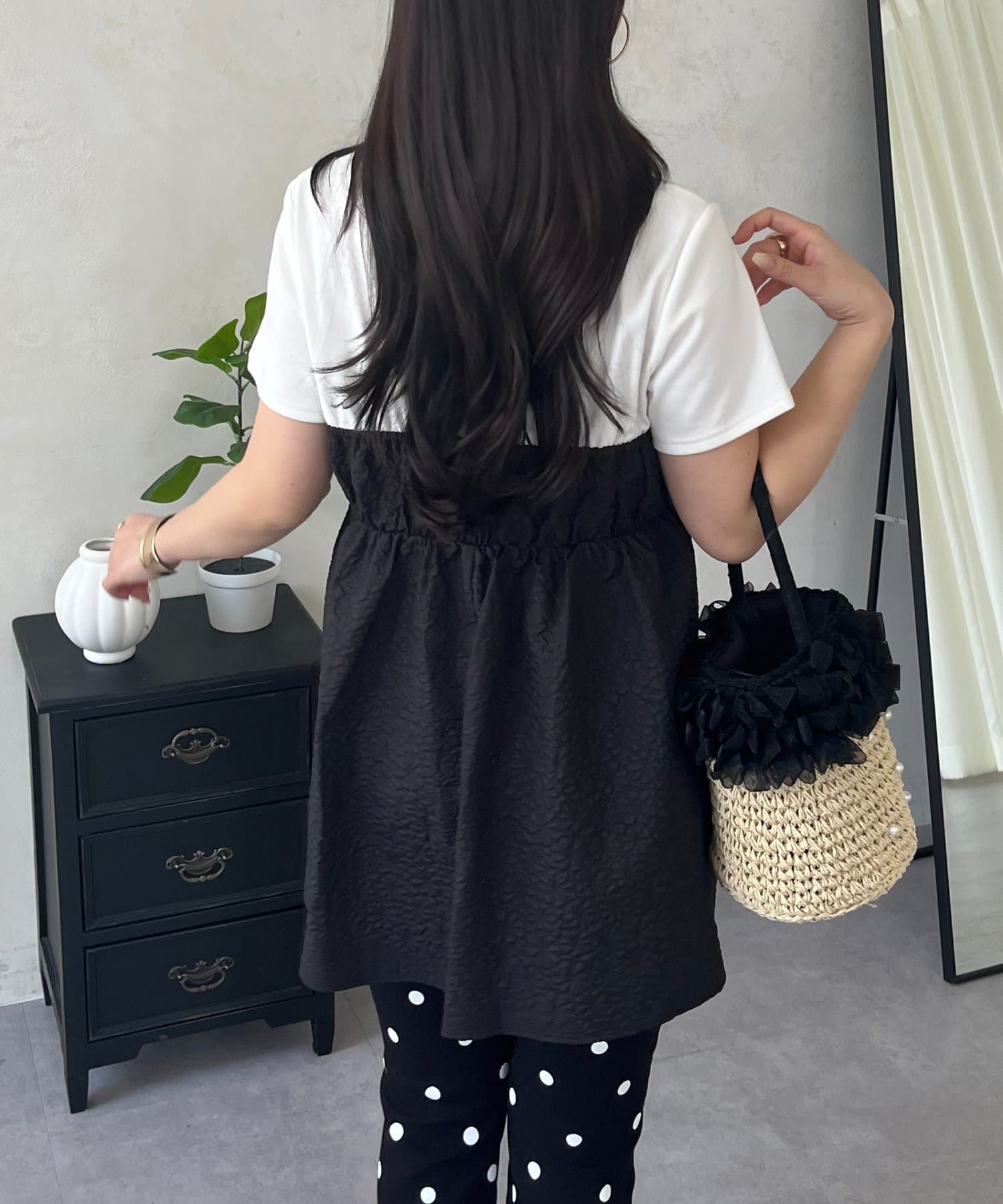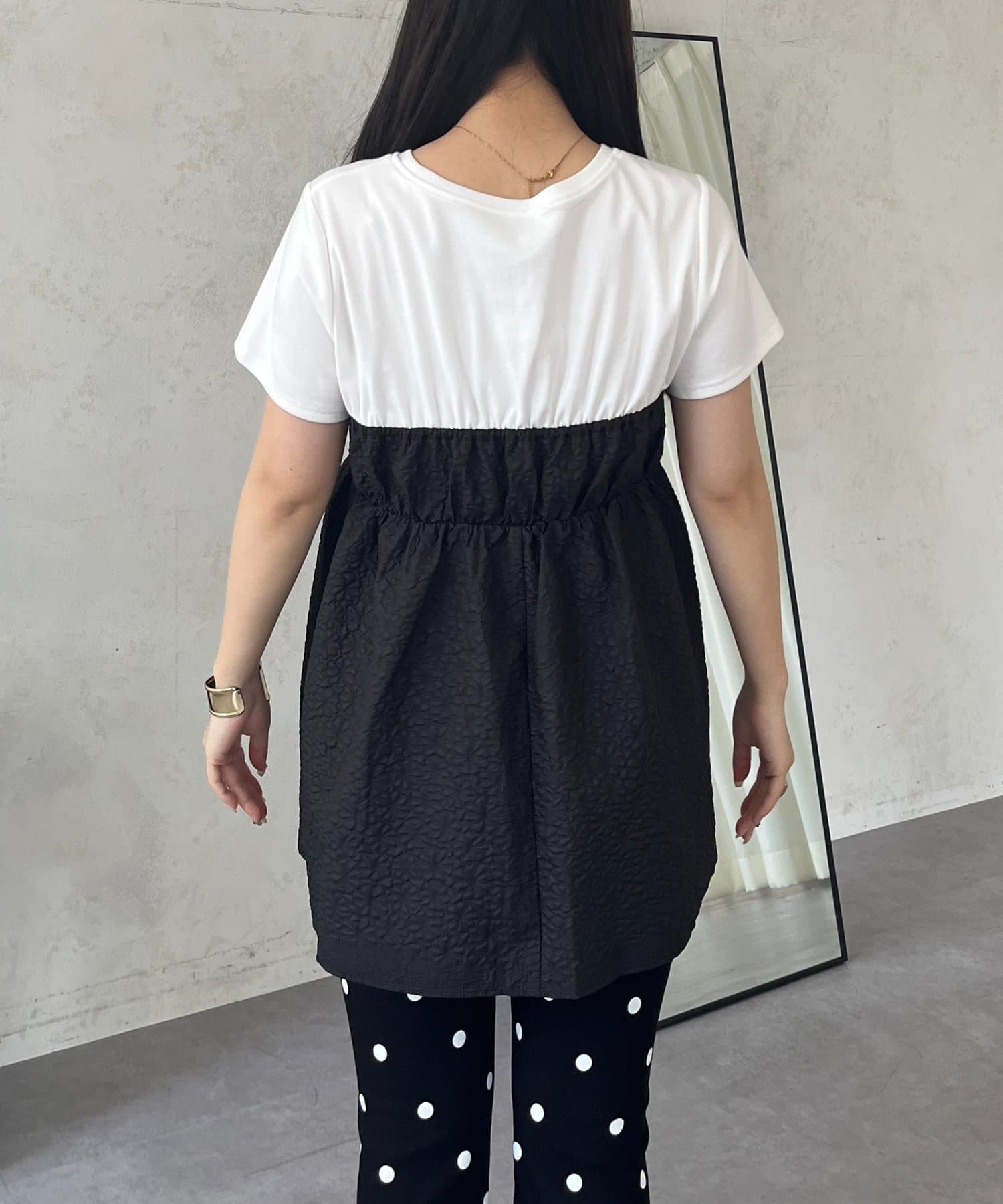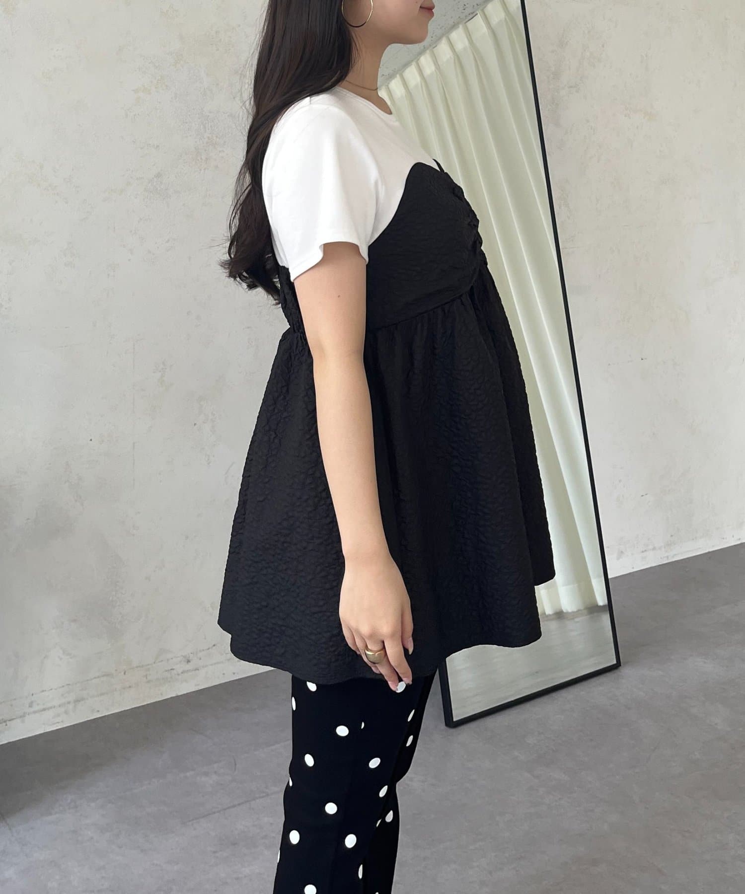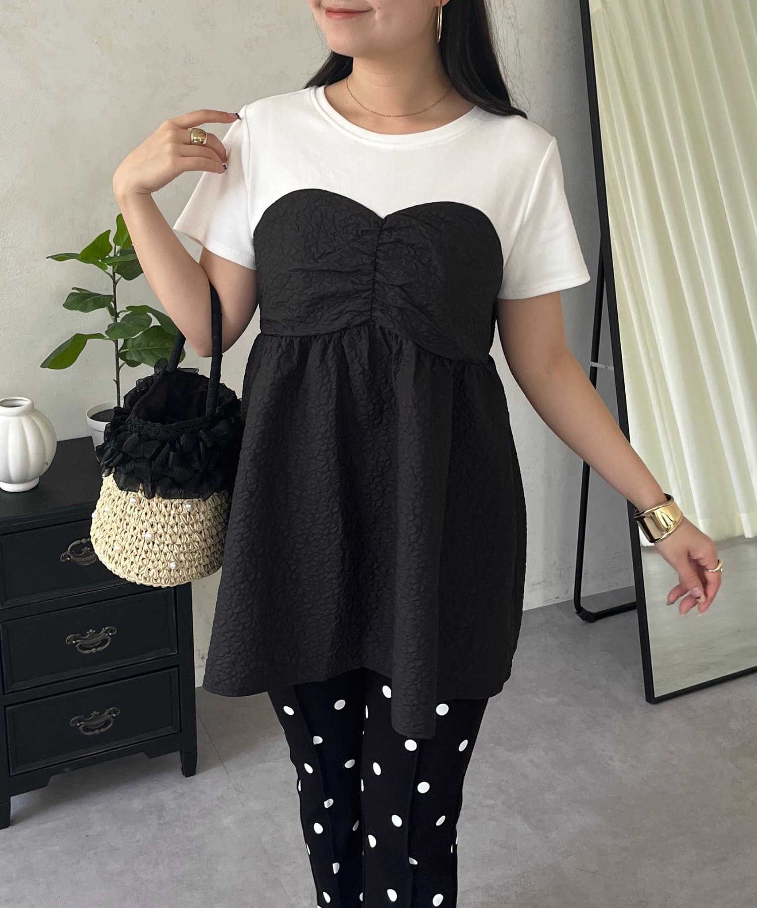 ●Tシャツに立体感のあるジャガードビスチェを重ねたようなドッキングデザインで、コーデに悩まずお洒落が完成