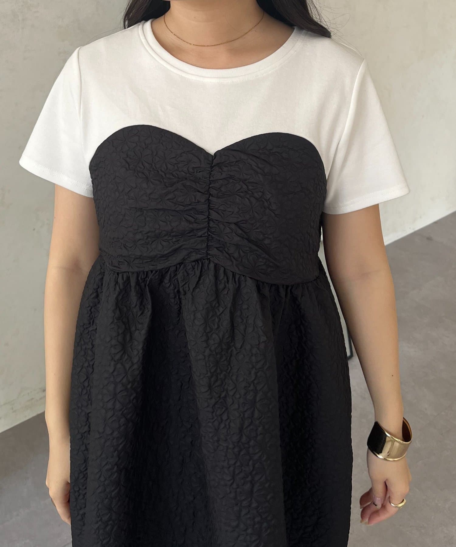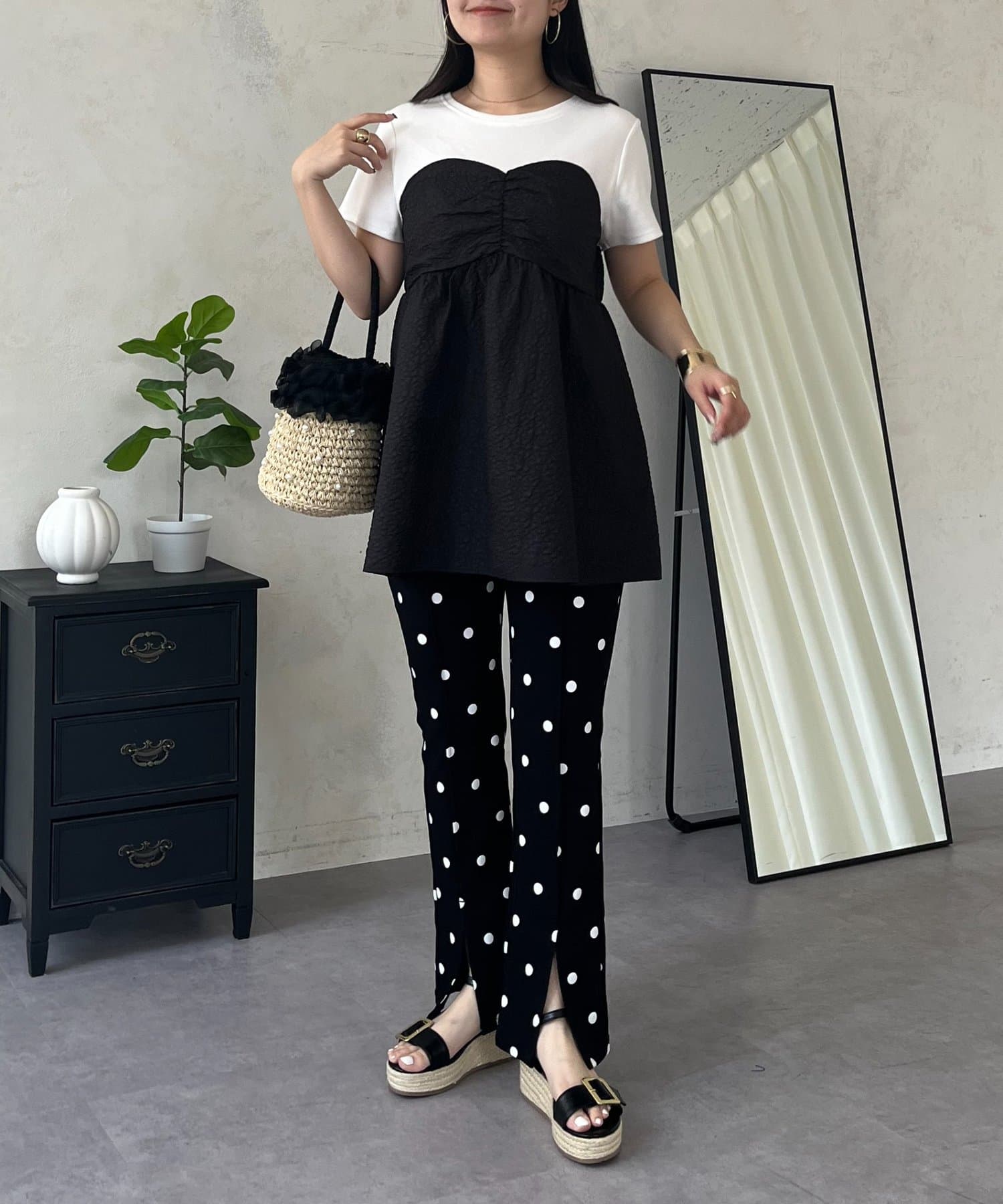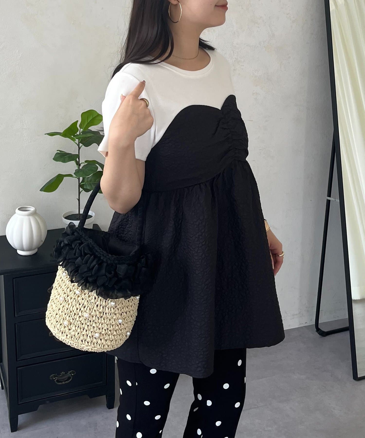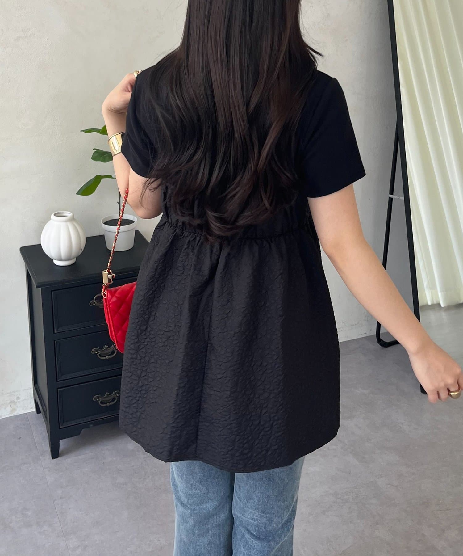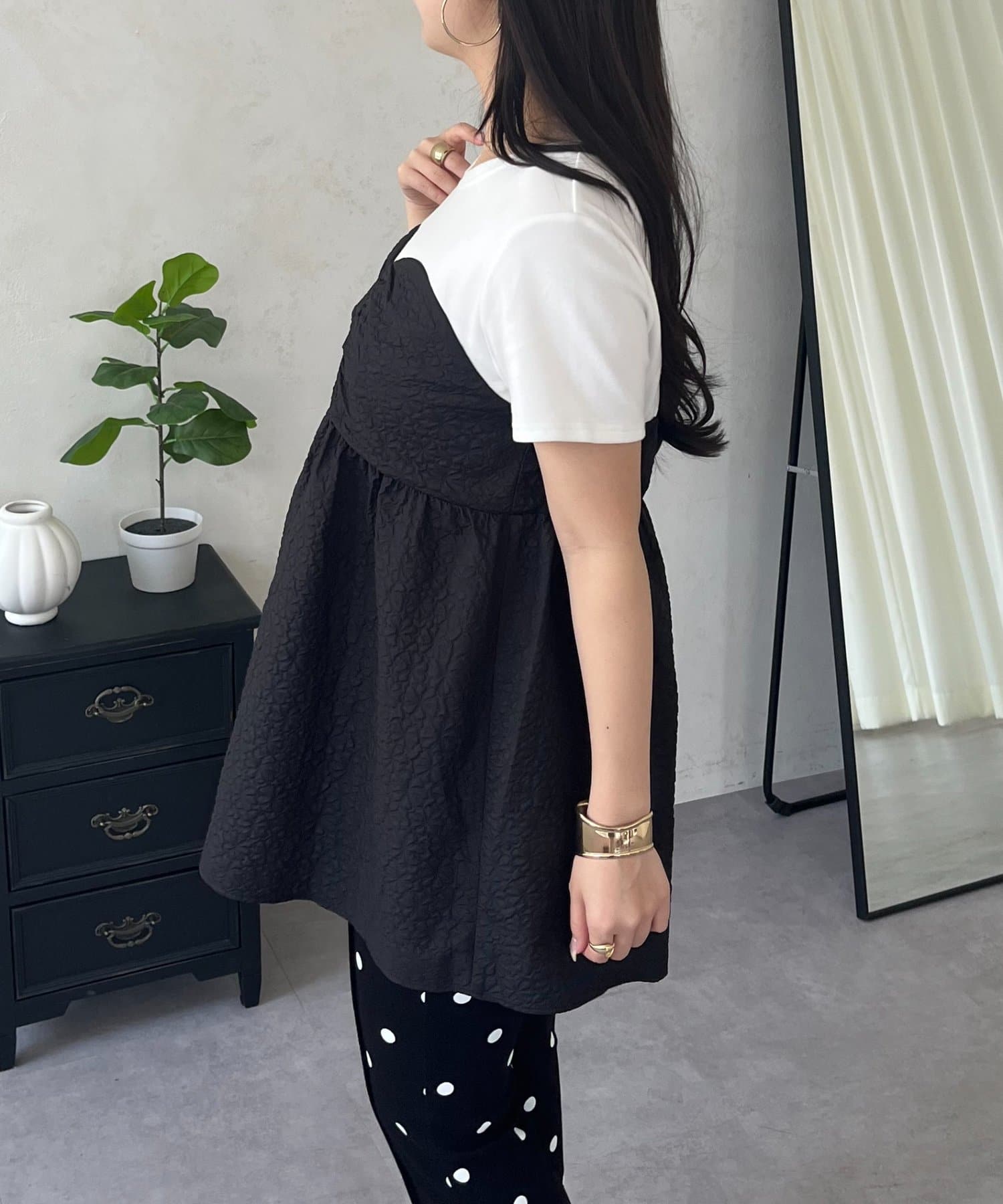 ●Tシャツに立体感のあるジャガードビスチェを重ねたようなドッキングデザインで、コーデに悩まずお洒落が完成